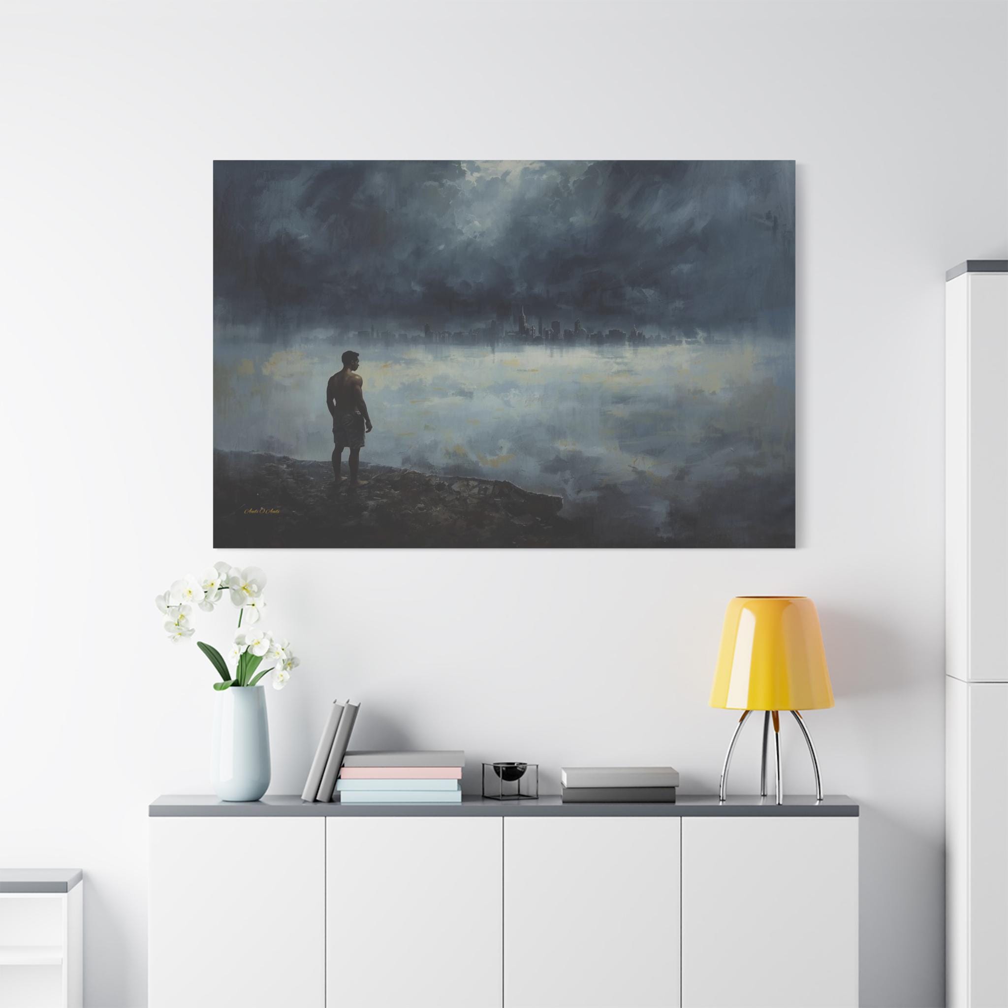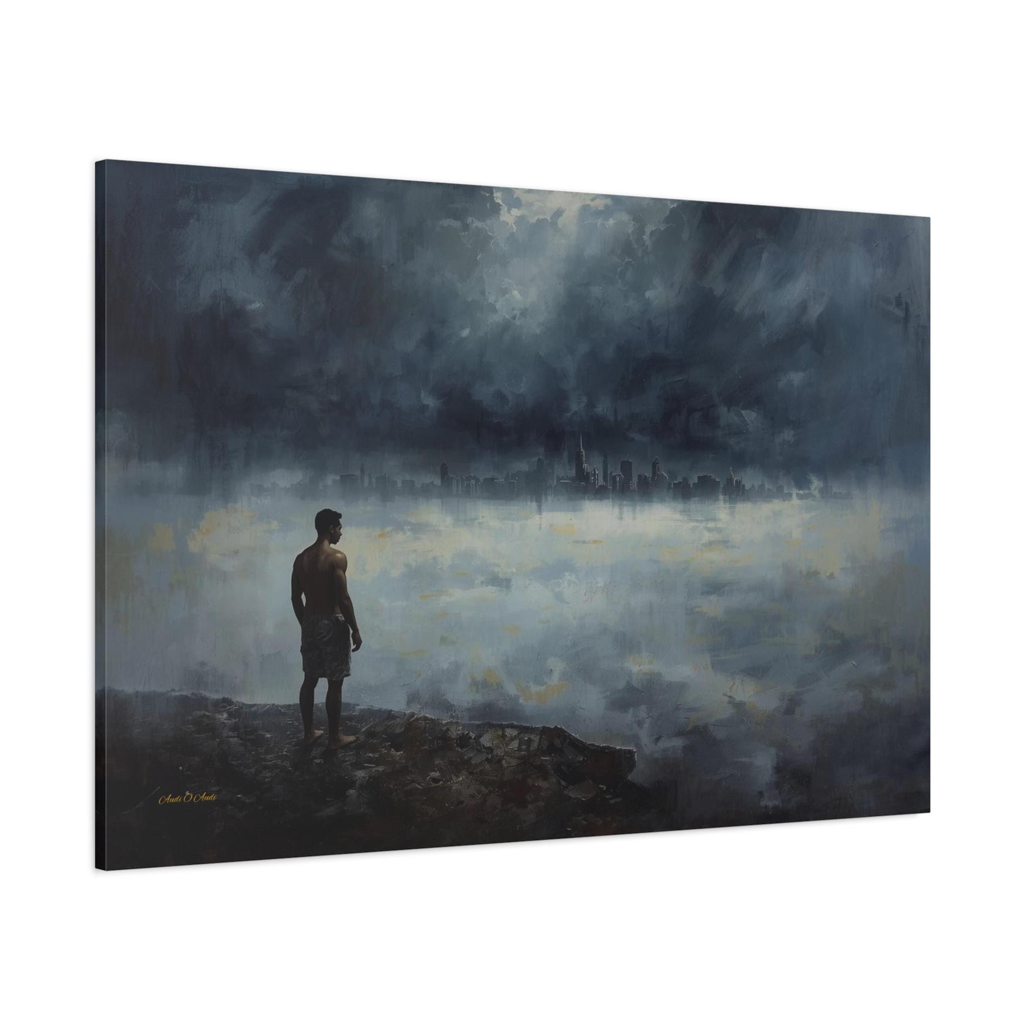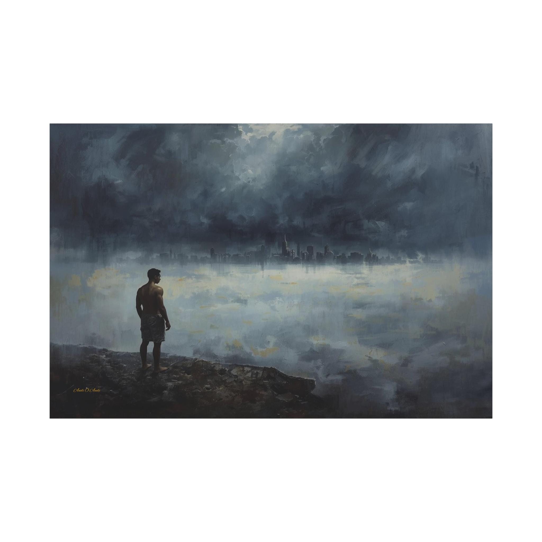 This powerful, atmospheric artwork captures a moment of deep contemplation. A lone figure stands on a rocky precipice, gazing out over a vast, foggy body of water toward a distant, fading city skyline. Above, tumultuous storm clouds gather in shades of slate grey and deep indigo, rendered with expressive, painterly brushstrokes that add raw texture and emotion to the scene.
