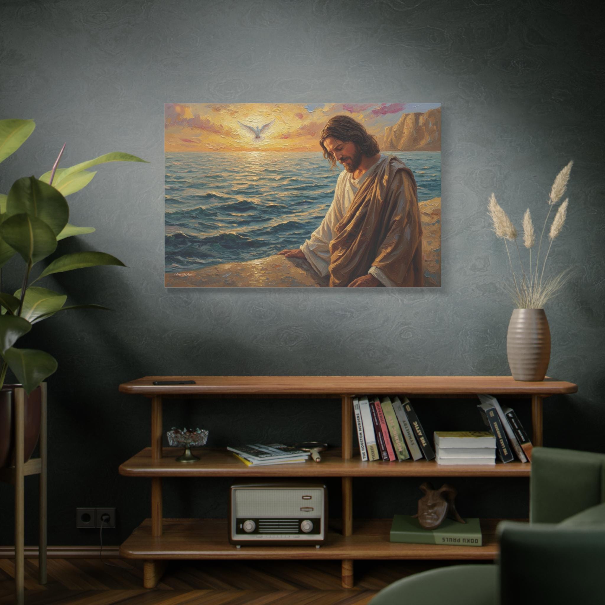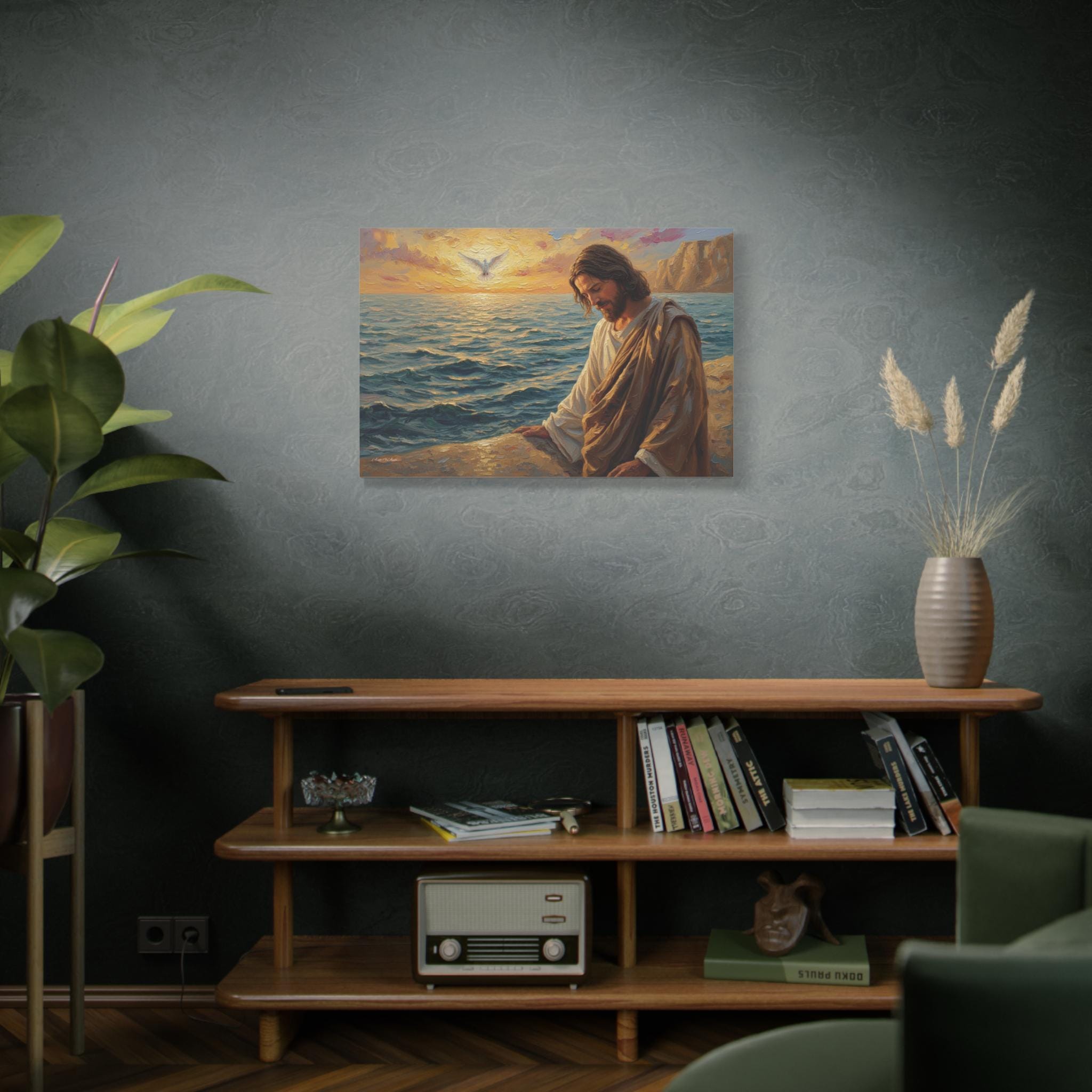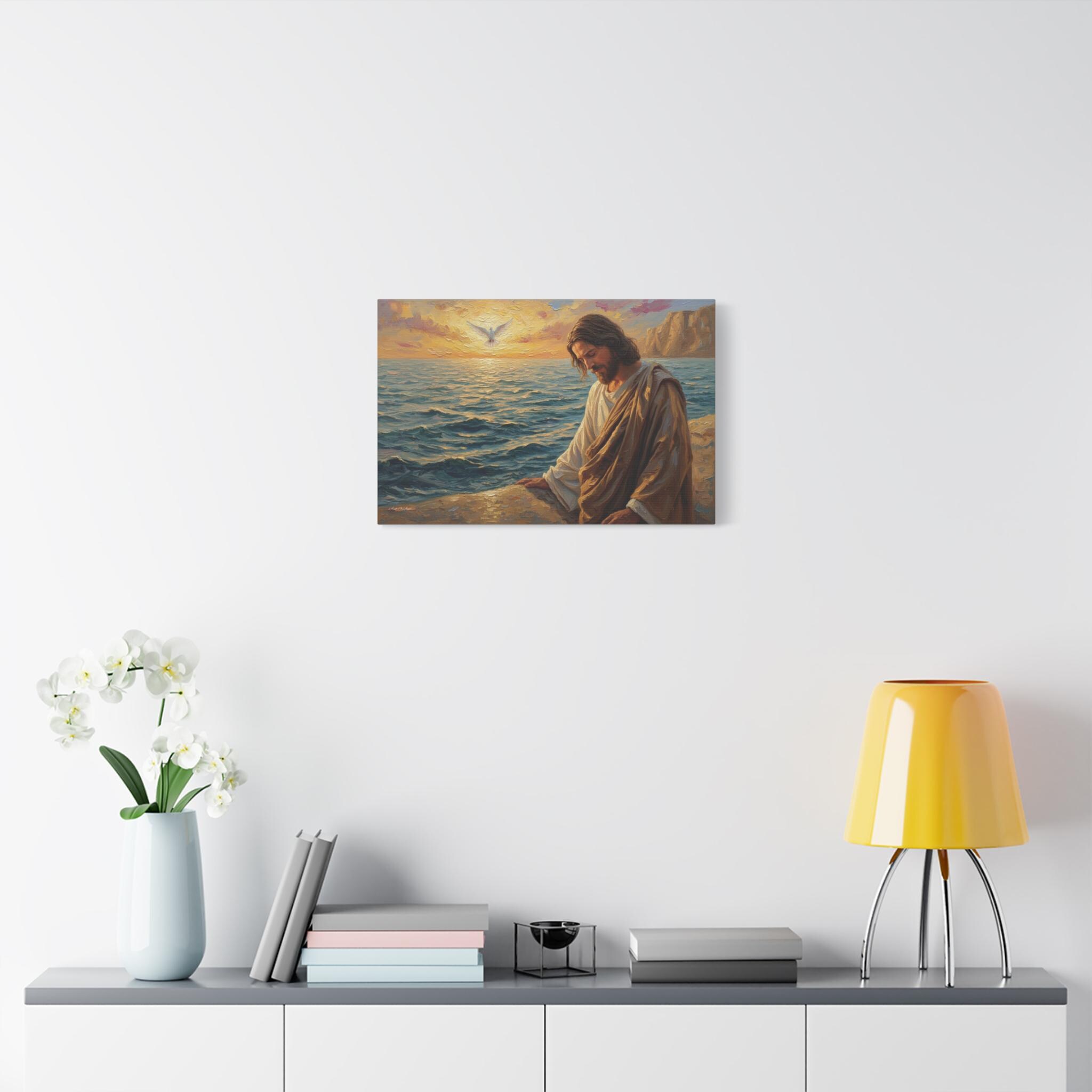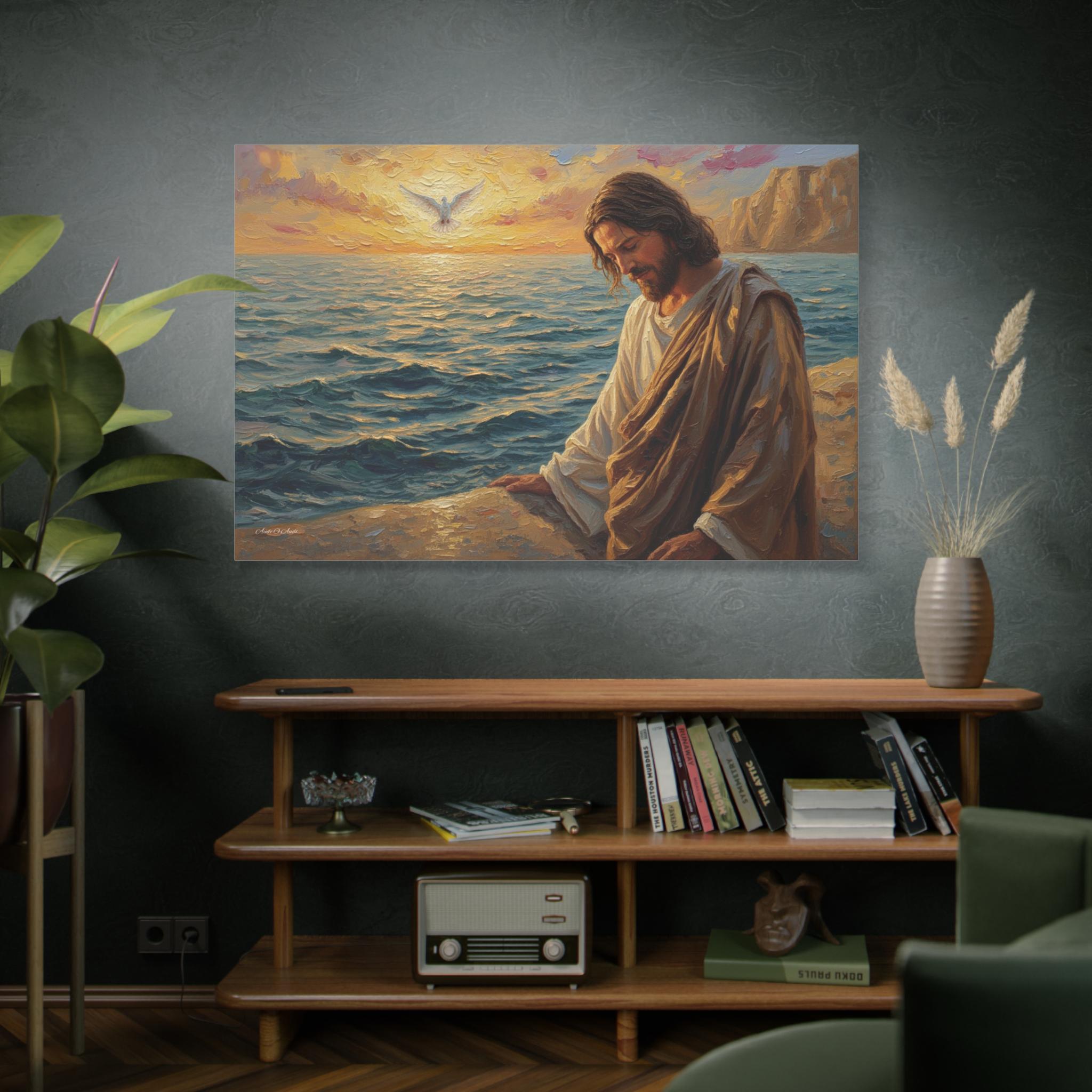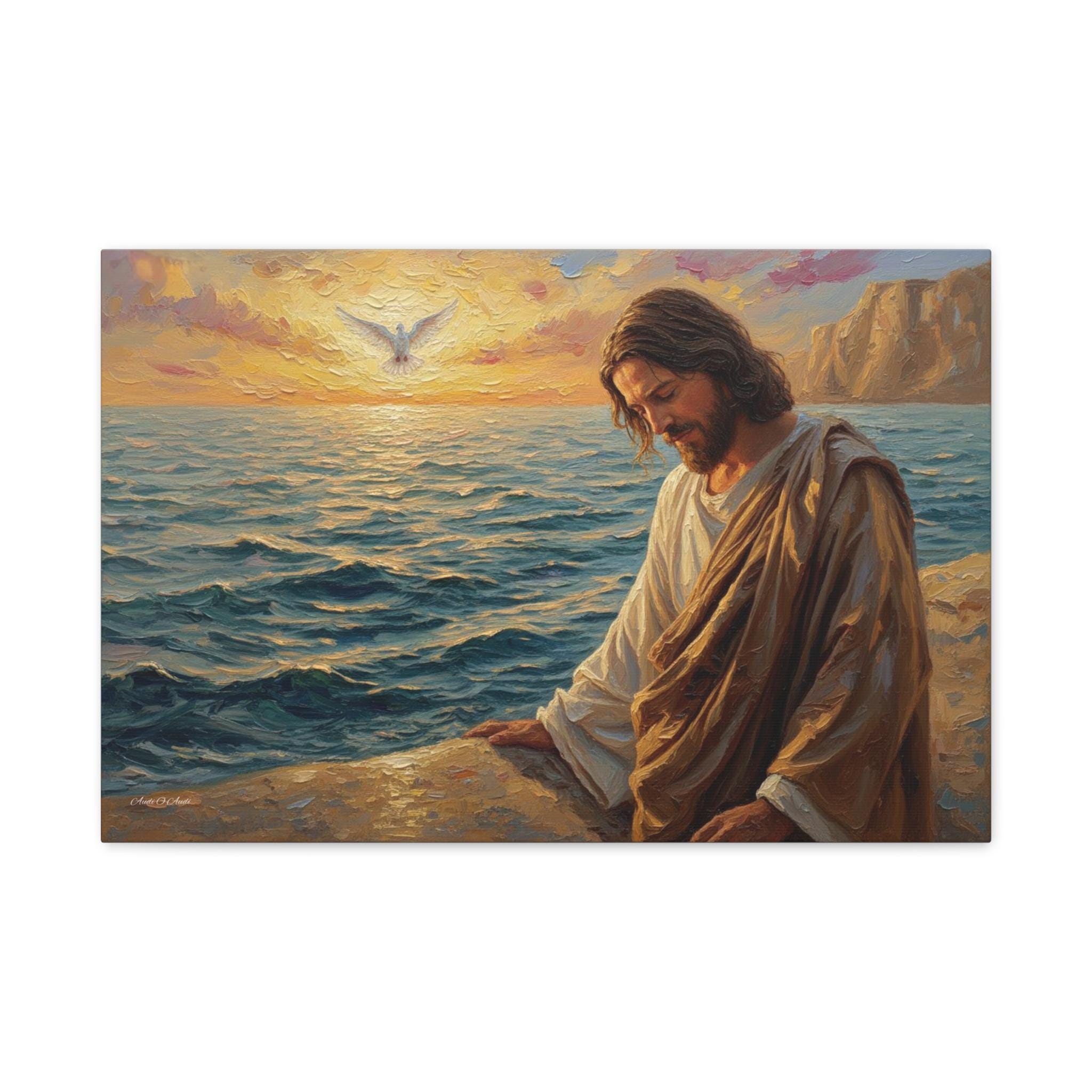 Bring a profound sense of peace and spiritual grounding to your home with "The Calming Presence." This beautiful canvas print depicts Jesus seated by a tranquil sea at sunrise, bathed in warm, golden light. A white dove soars in the distance, symbolizing hope, peace, and the Holy Spirit.