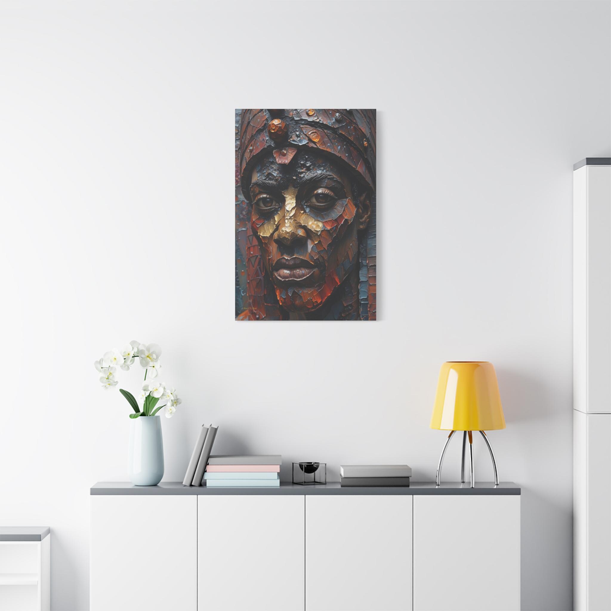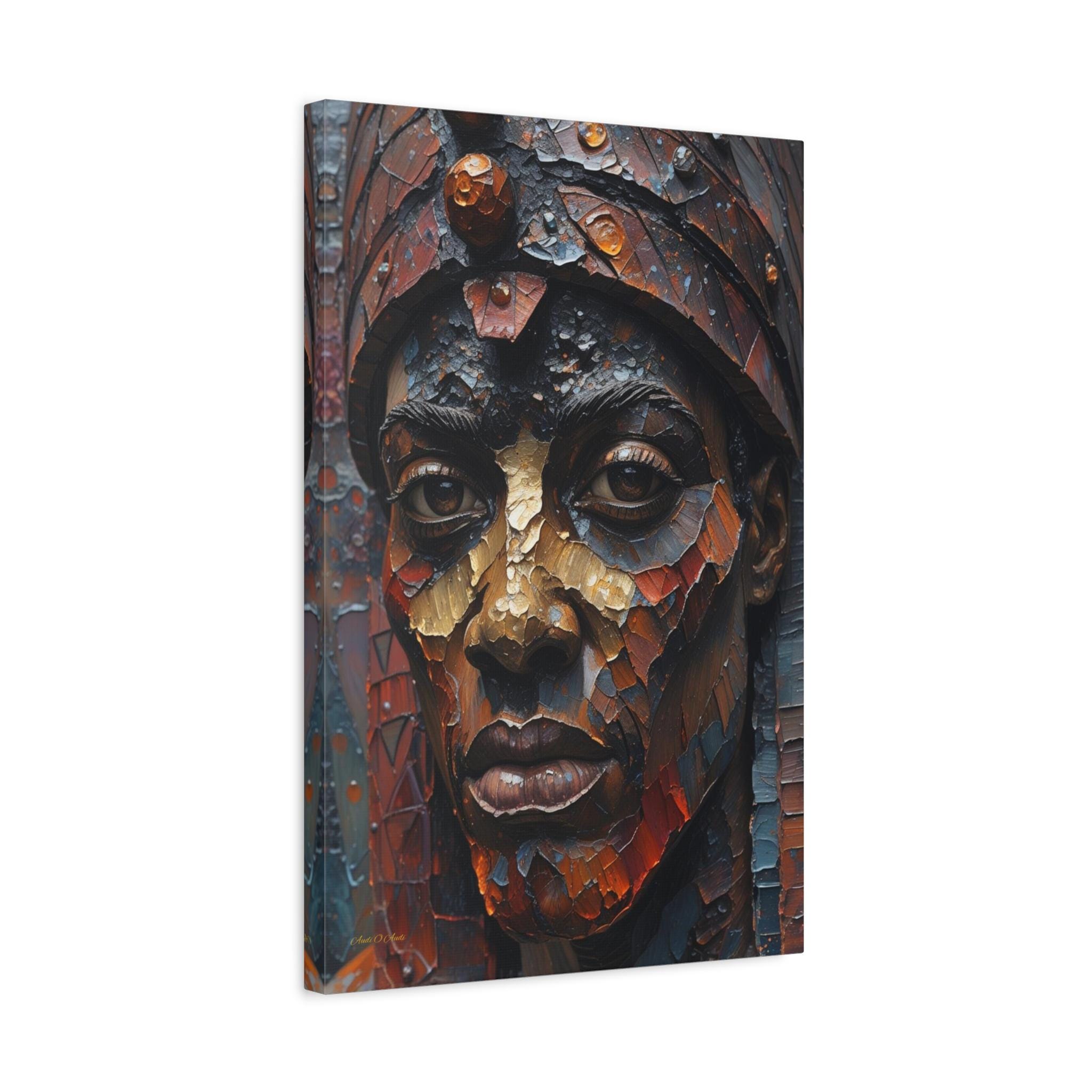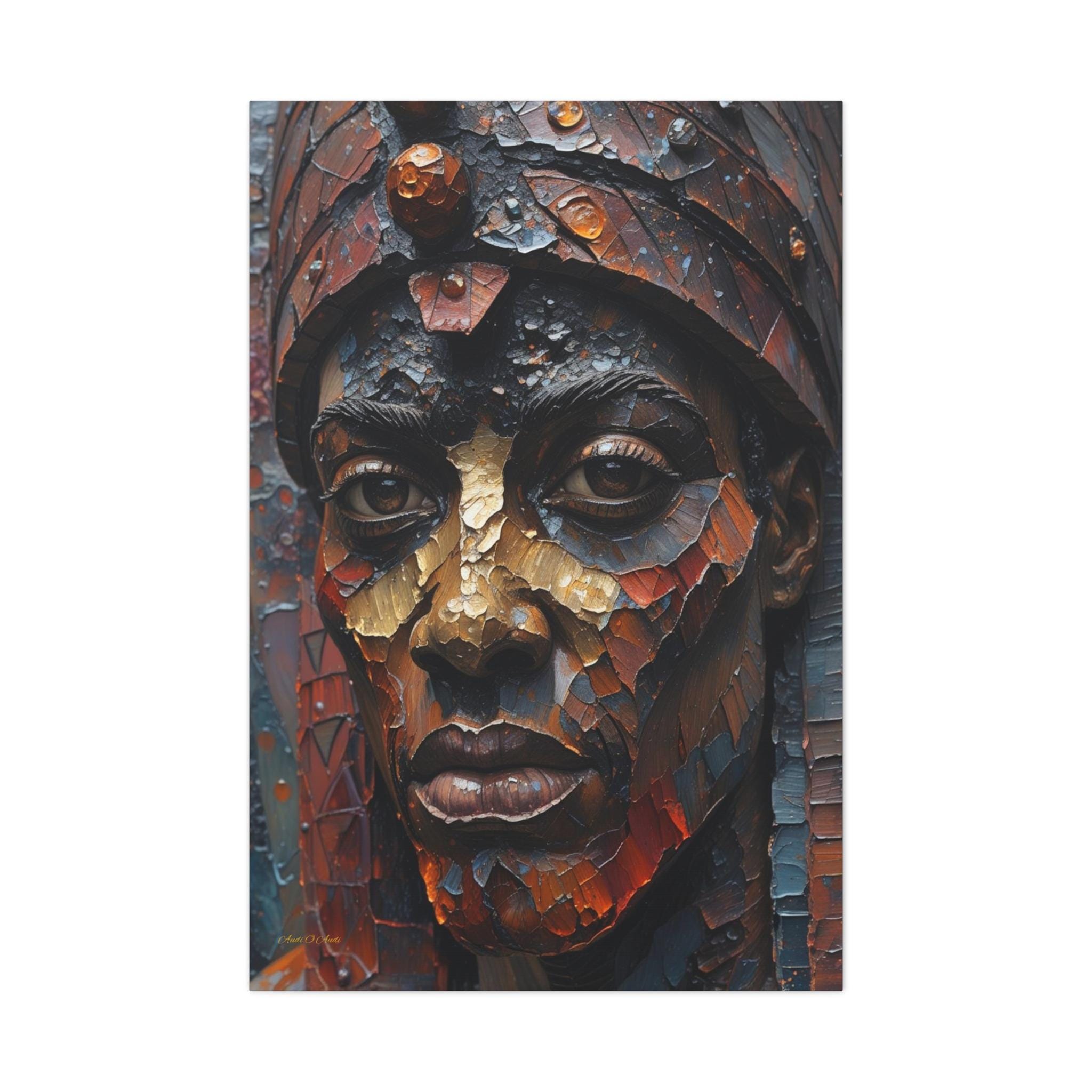 This artwork is a visual masterpiece of texture simulation. The high-definition print captures the look of thick, layered oil paint, weathered bronze, and mosaic tiles. Deep earthy reds and oxidized blues are illuminated by strokes of burnished gold, giving the subject’s face a metallic, statue-like presence that demands attention.