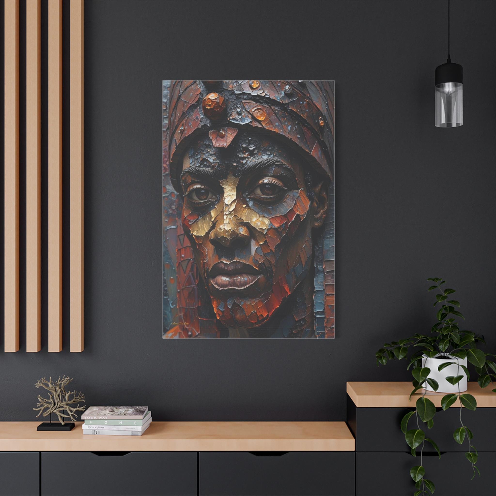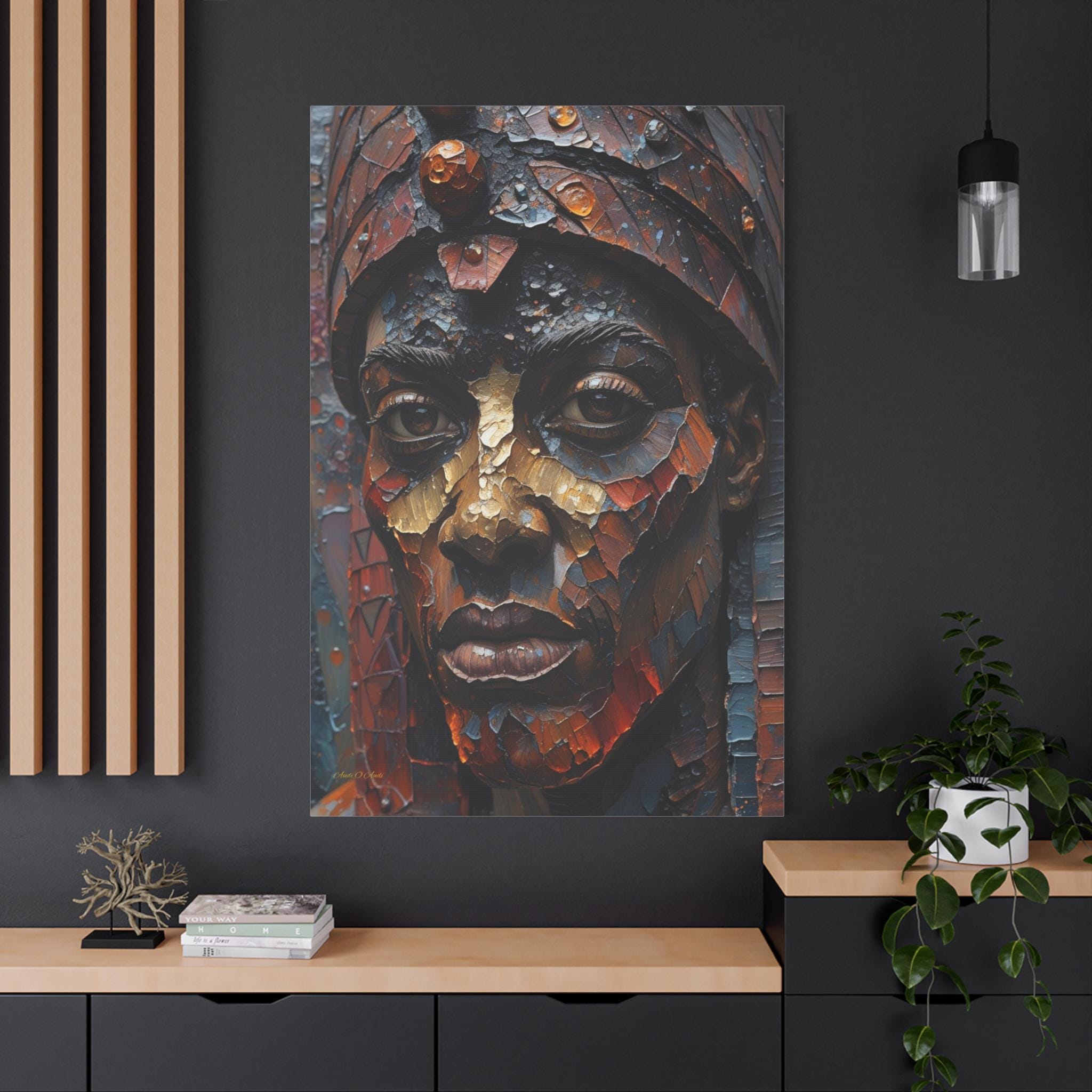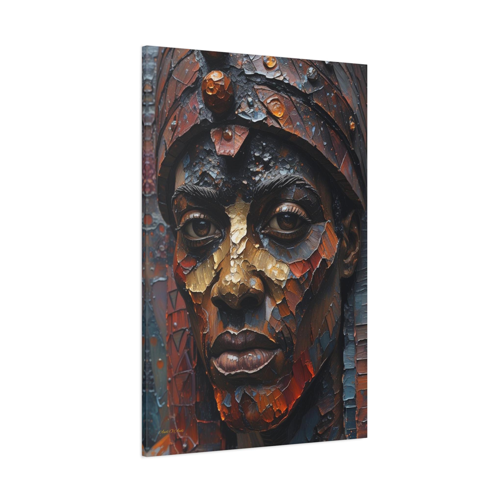 This artwork is a visual masterpiece of texture simulation. The high-definition print captures the look of thick, layered oil paint, weathered bronze, and mosaic tiles. Deep earthy reds and oxidized blues are illuminated by strokes of burnished gold, giving the subject’s face a metallic, statue-like presence that demands attention.