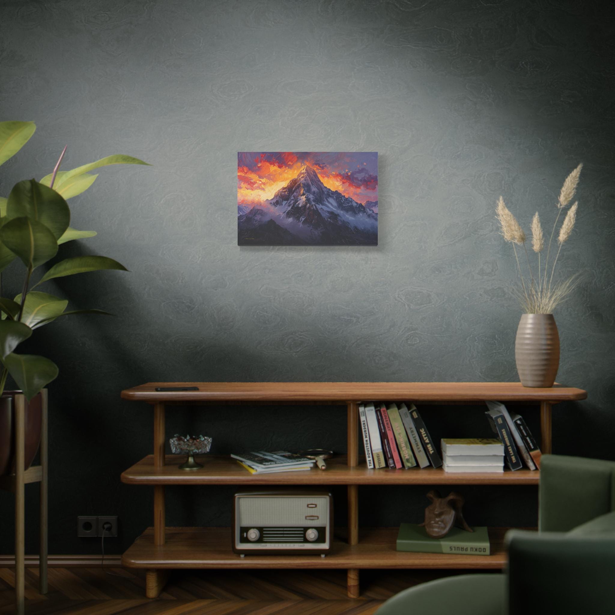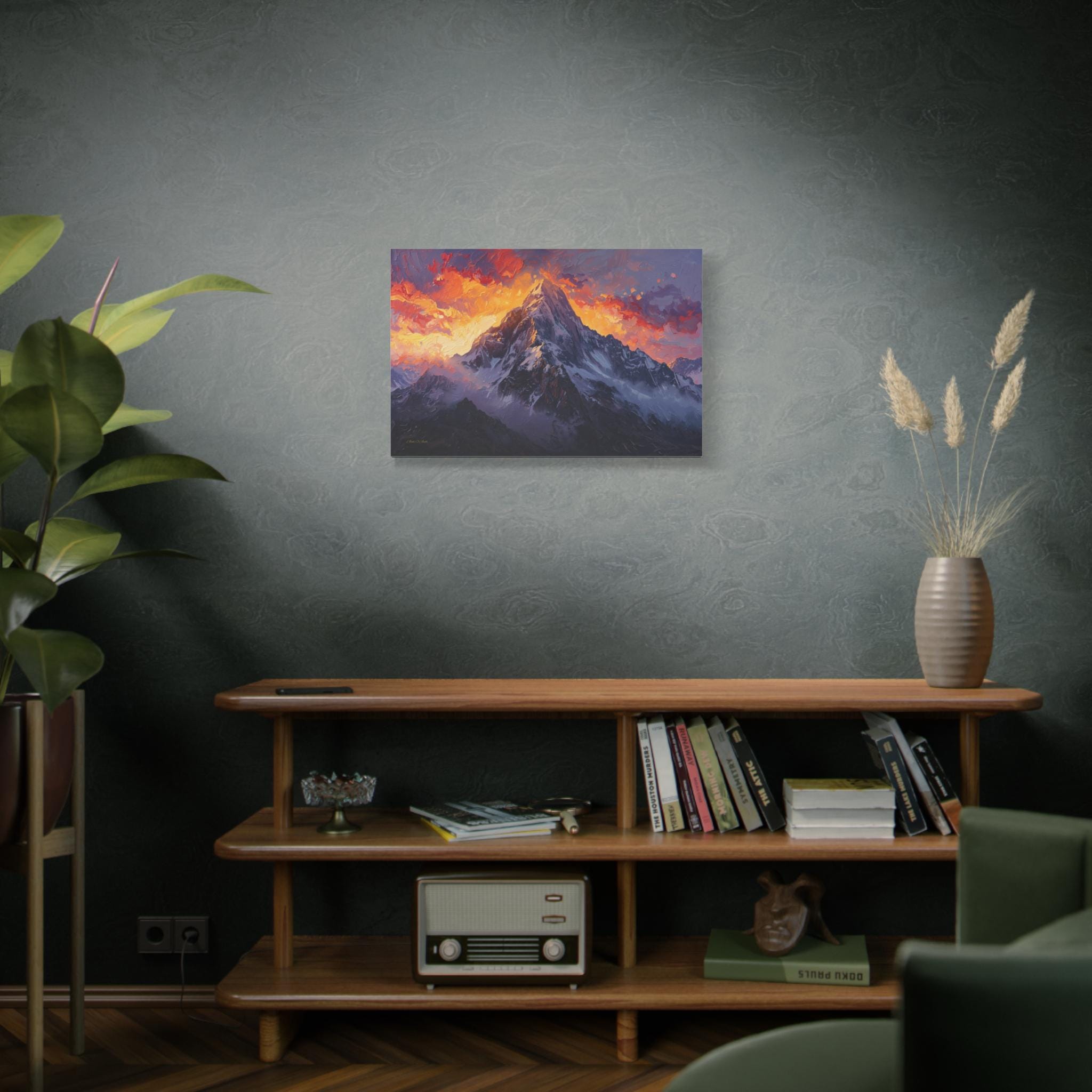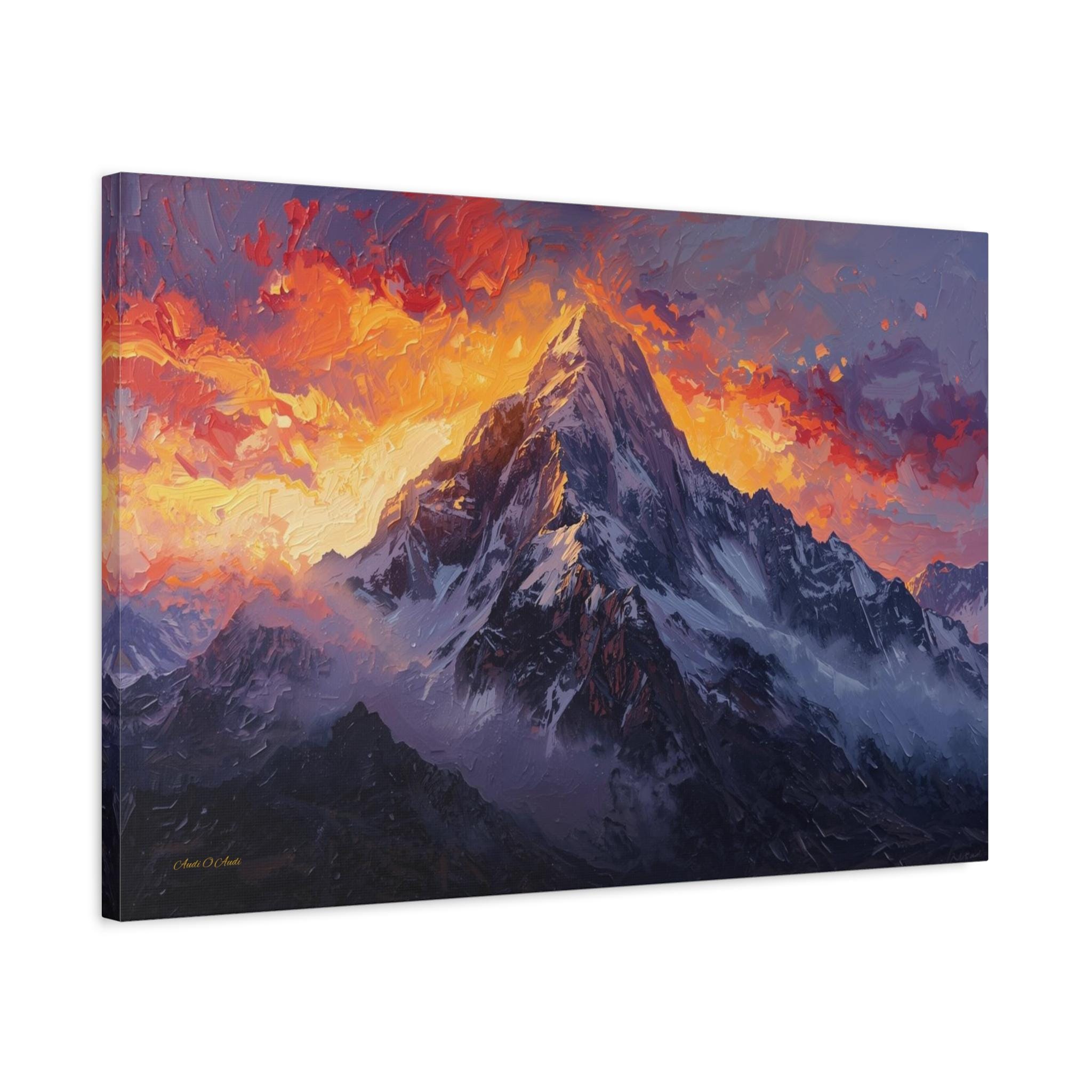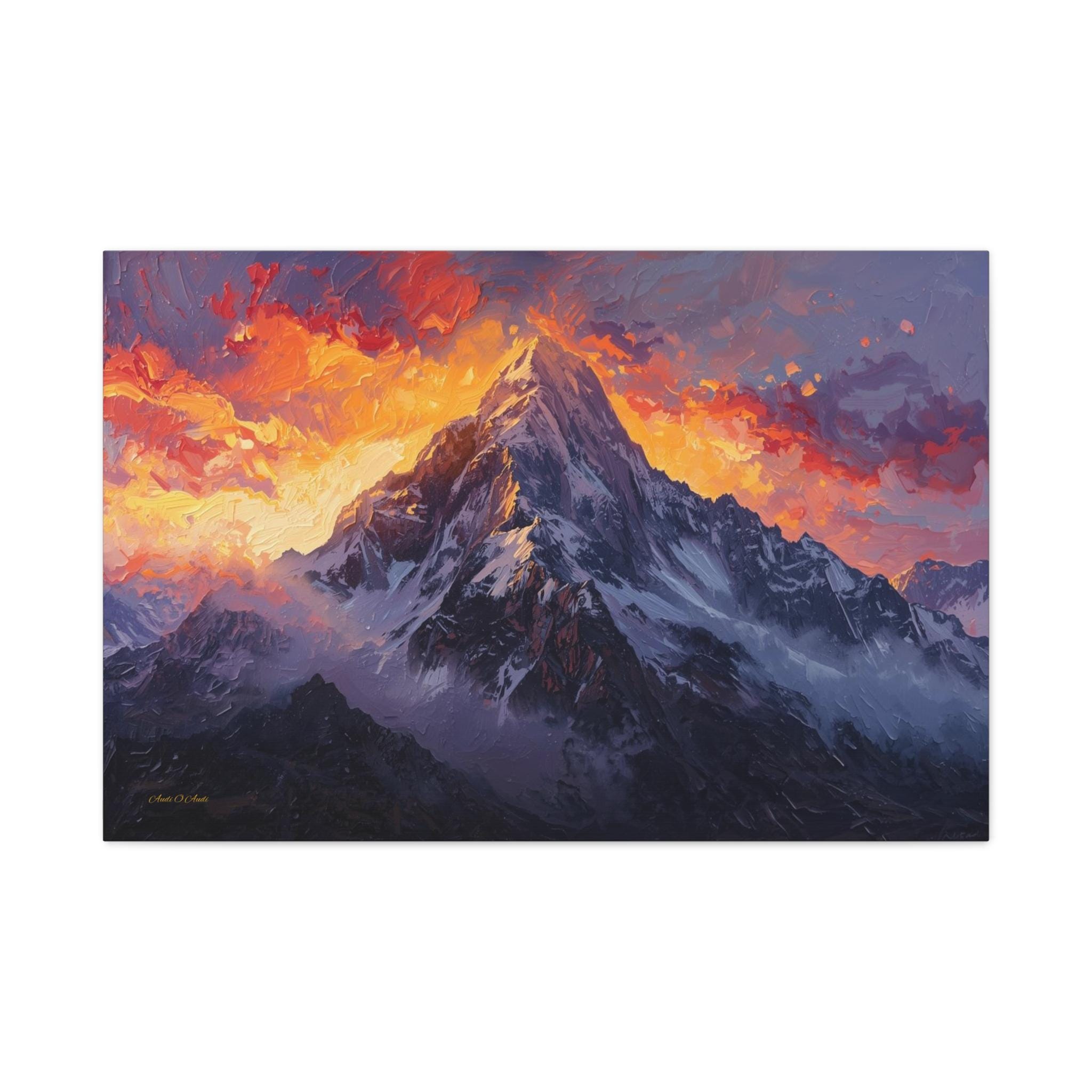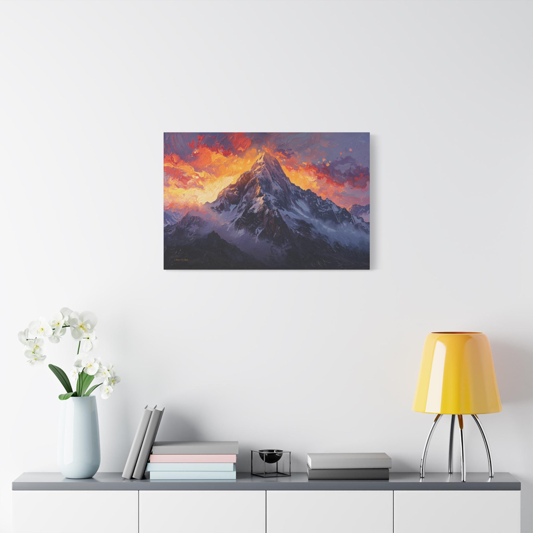 Bring the breathtaking power of the alpine wilderness into your home with "The Burning Summit." This majestic canvas print captures the exact moment the morning sun sets the sky ablaze, casting a fiery glow of crimson and gold over a towering, snow-capped peak.
