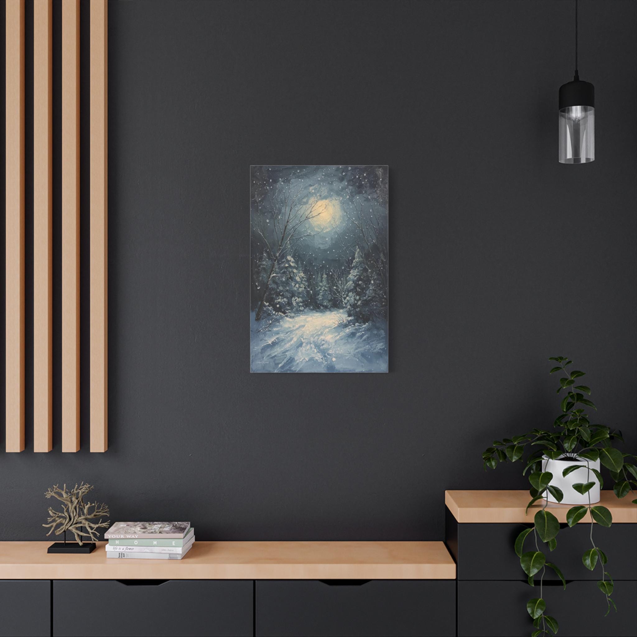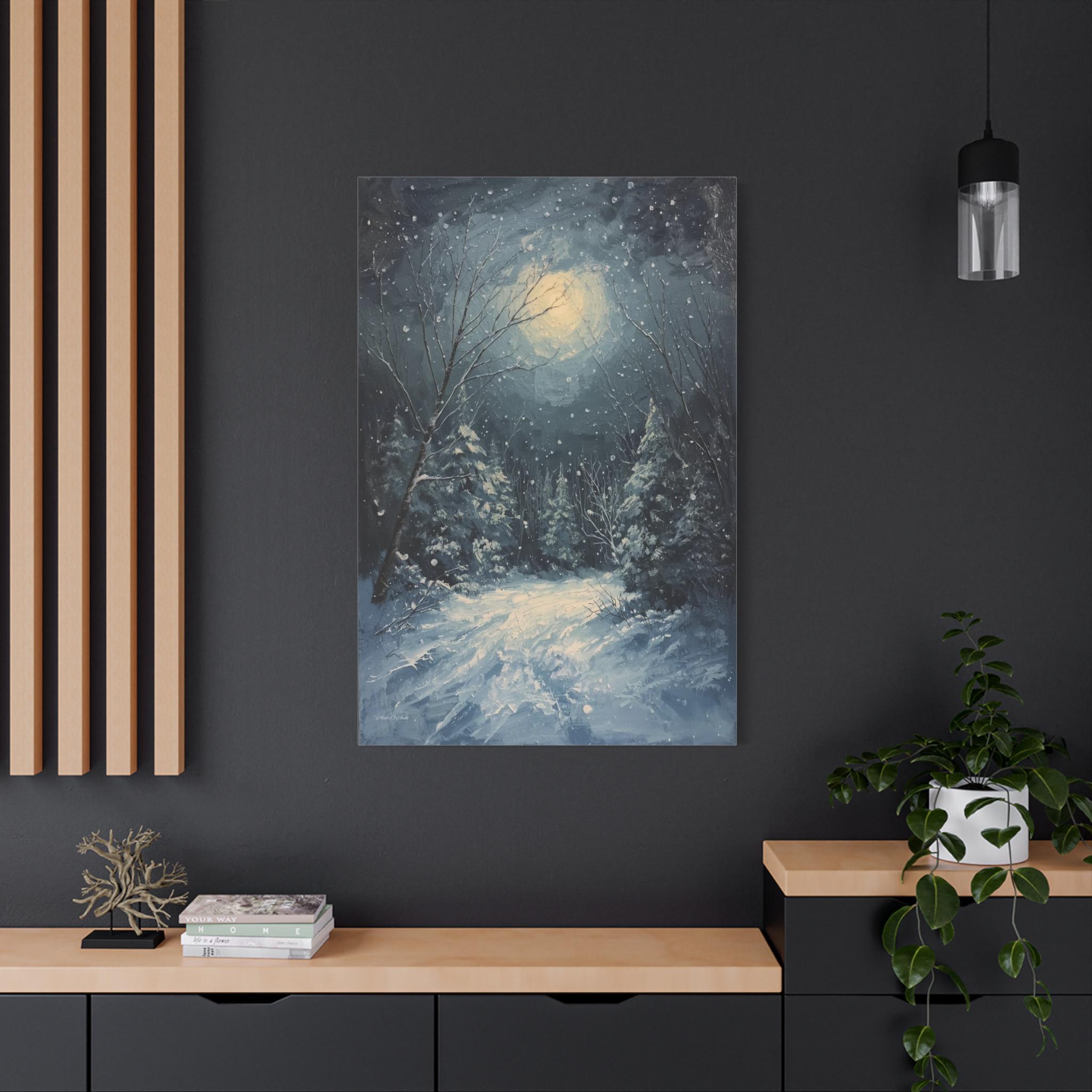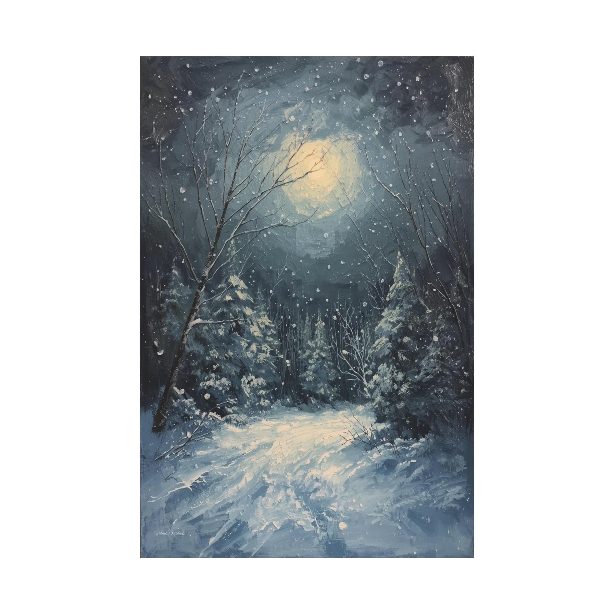 Bring the serene magic of a quiet winter night into your home with "Silent Winter Glow." This captivating canvas print features a luminous full moon casting a warm, ethereal light over a snow-covered forest.