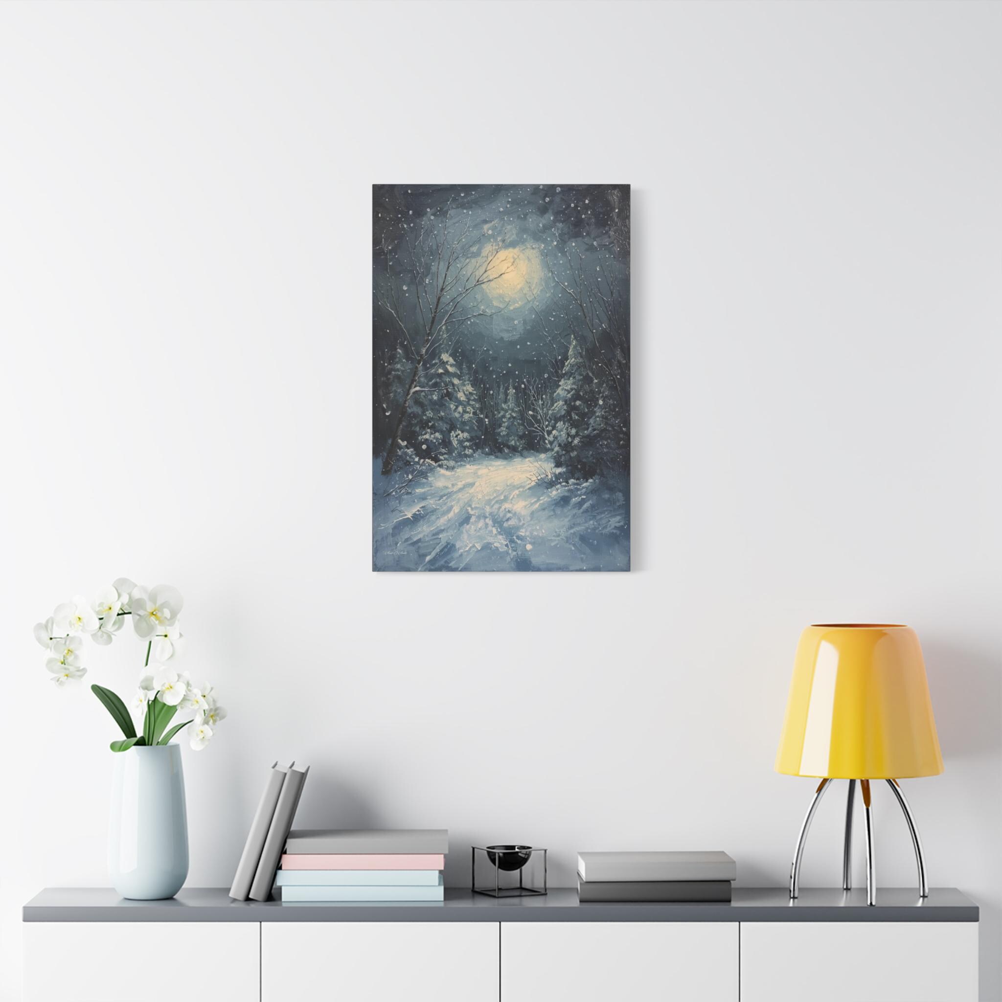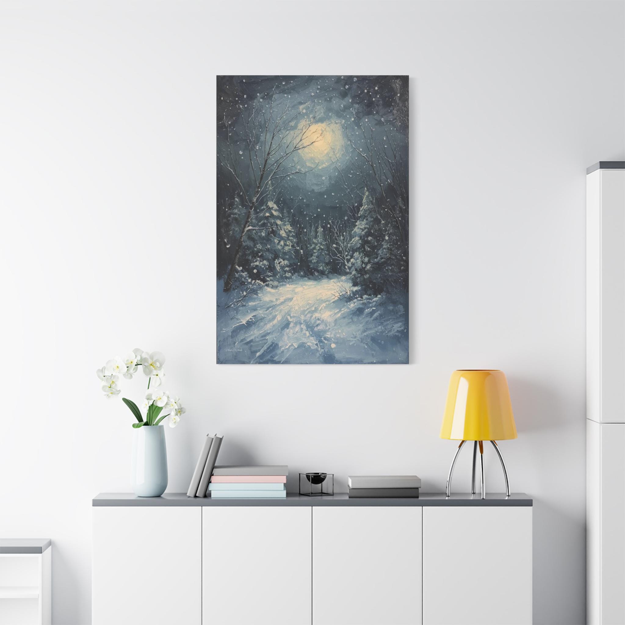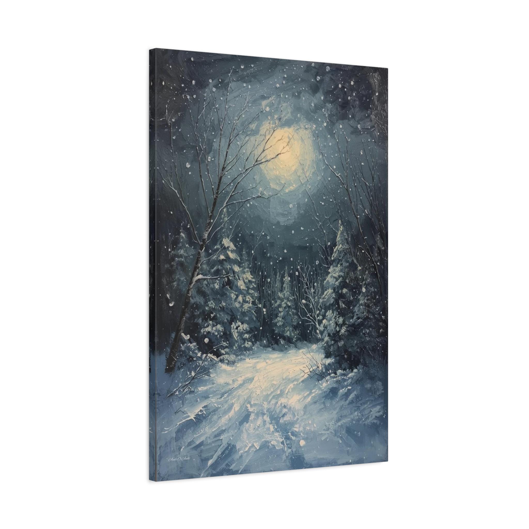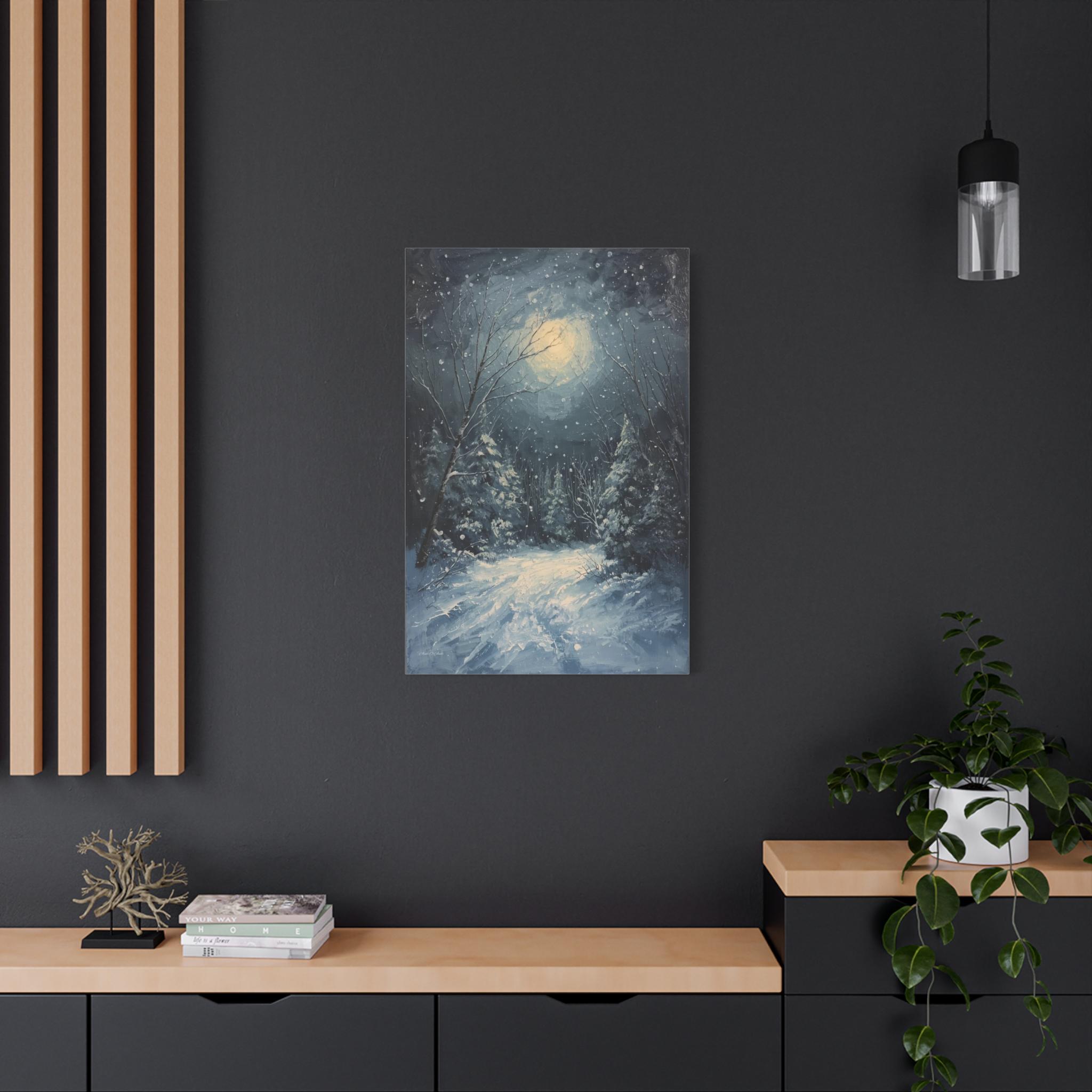 Bring the serene magic of a quiet winter night into your home with "Silent Winter Glow." This captivating canvas print features a luminous full moon casting a warm, ethereal light over a snow-covered forest.
