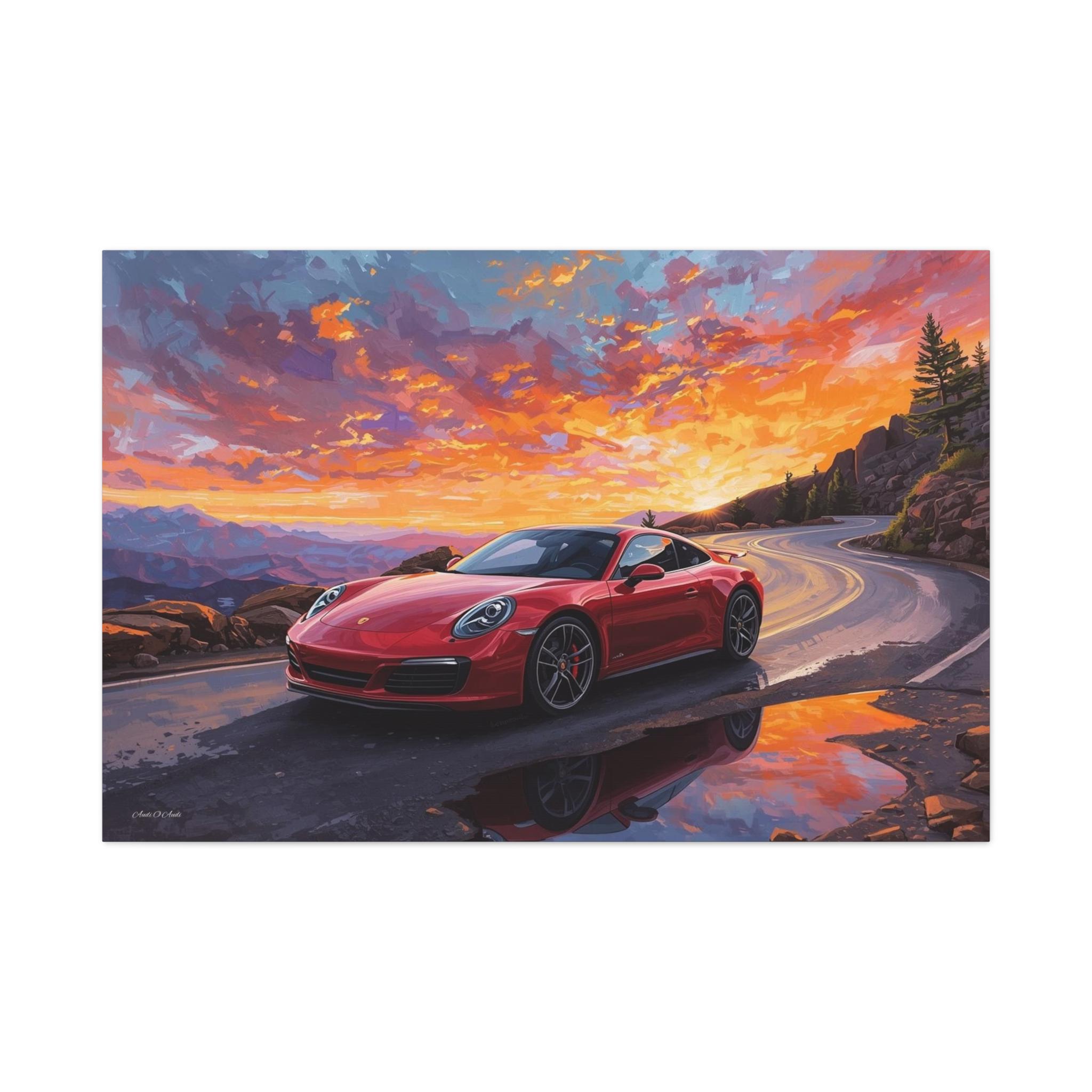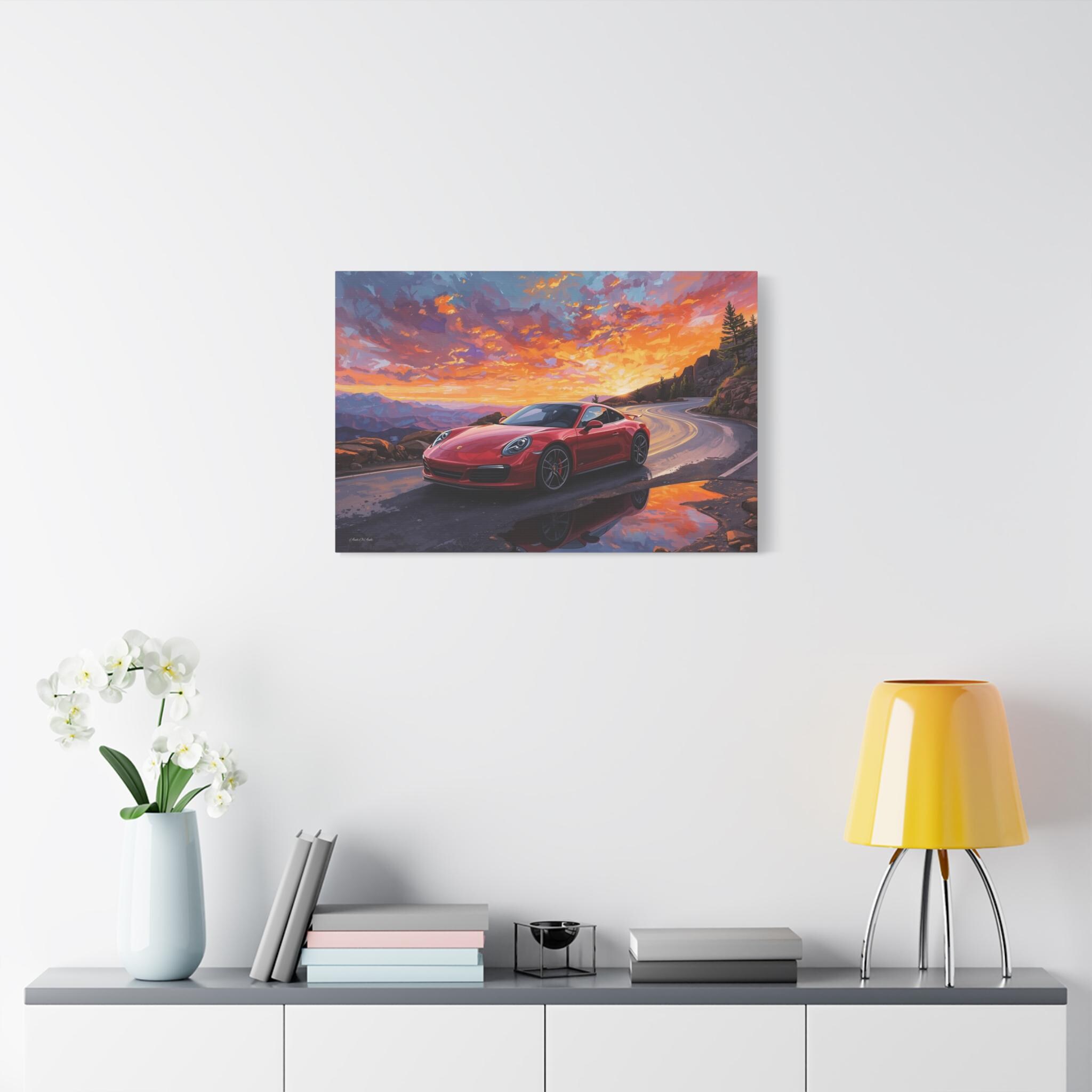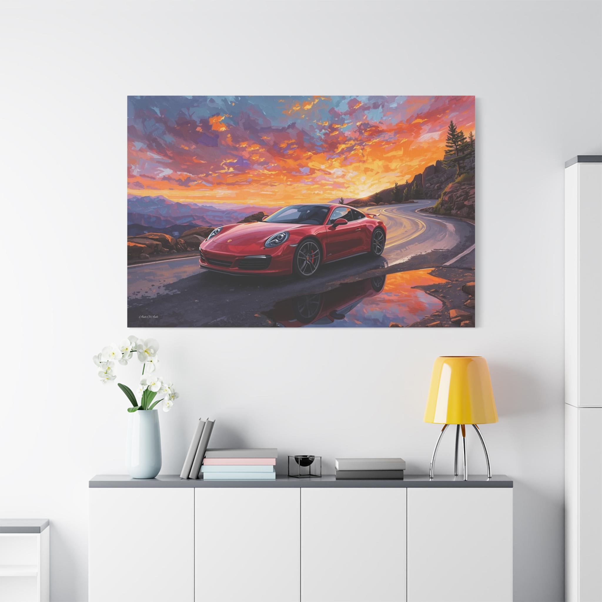 Capture the thrill of the open road with "Sunset Redline." This vibrant canvas print features a legendary red sports car navigating a winding mountain pass against a backdrop of a fiery, breathtaking sunset.
