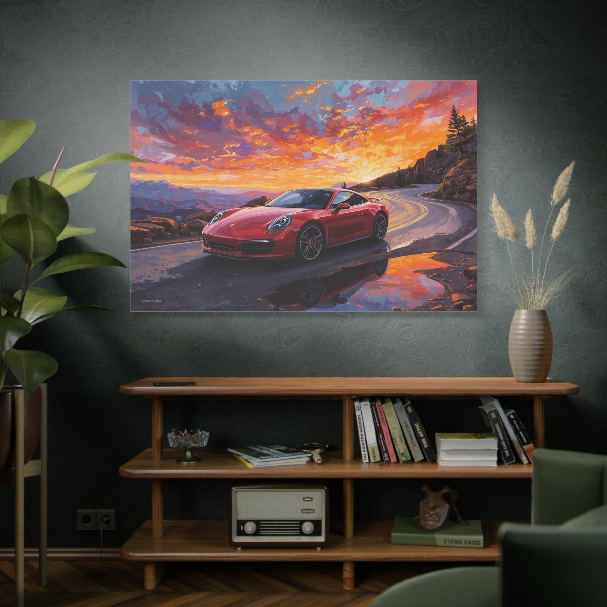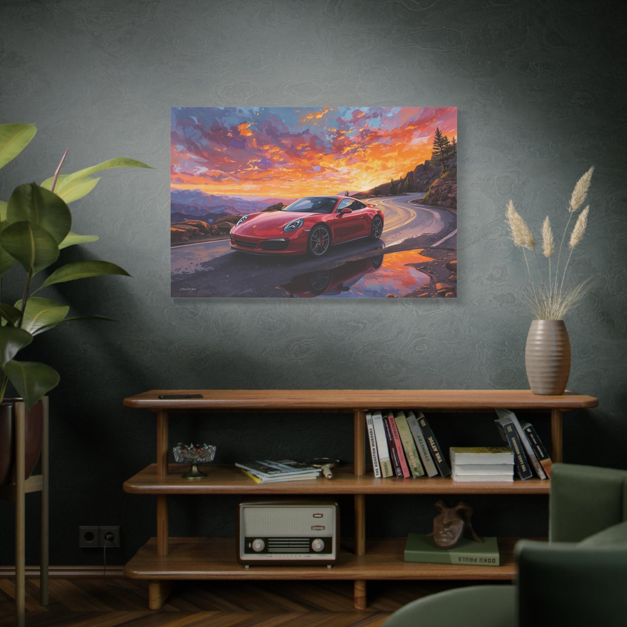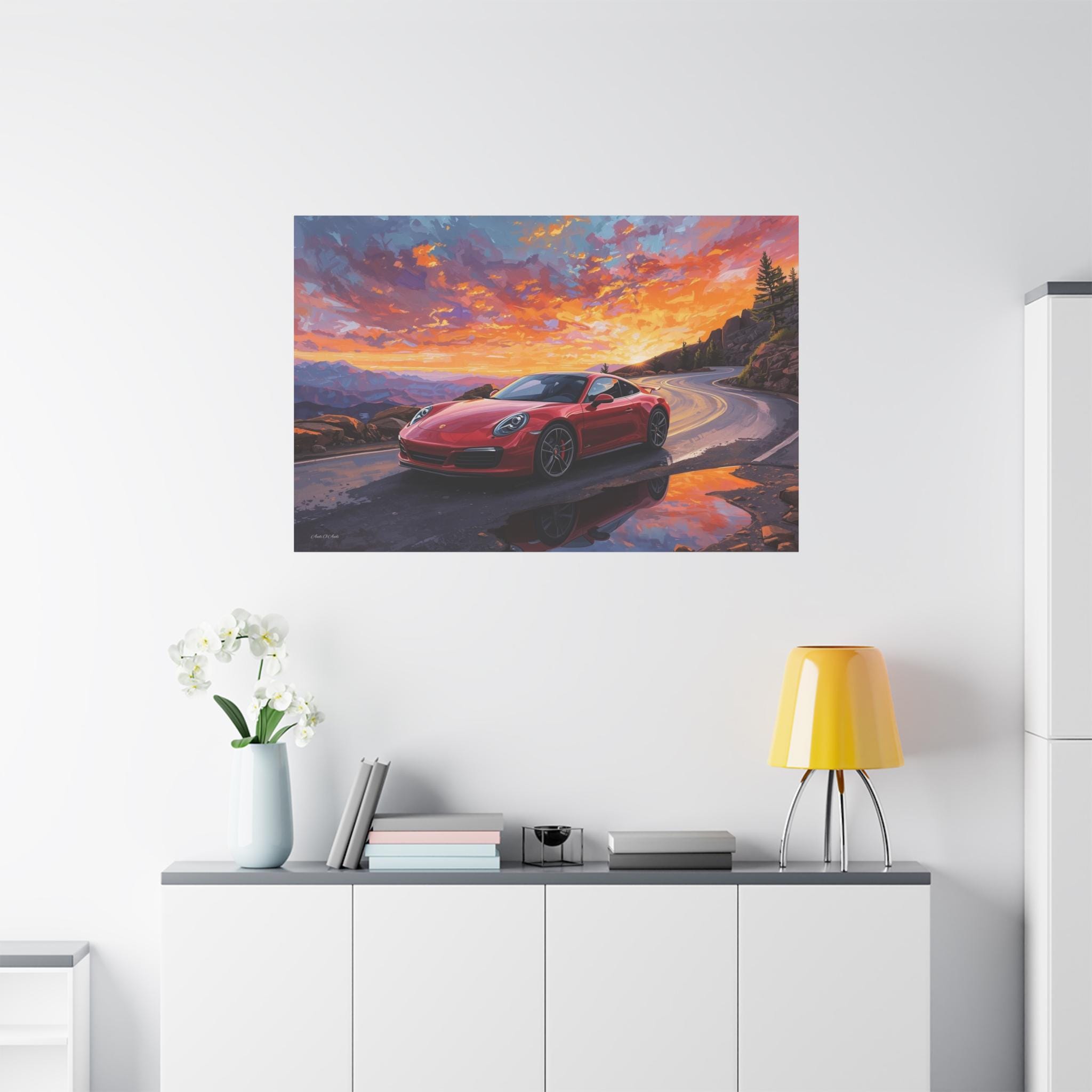 Capture the thrill of the open road with "Sunset Redline." This vibrant canvas print features a legendary red sports car navigating a winding mountain pass against a backdrop of a fiery, breathtaking sunset.