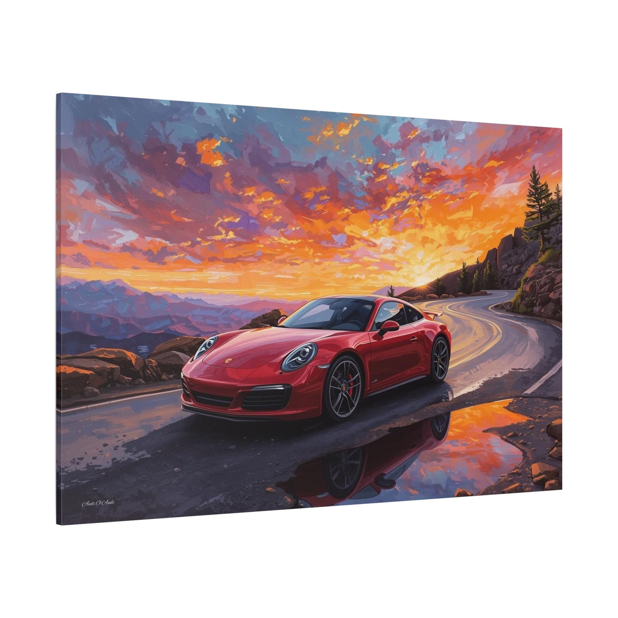 Designed with a rich, painterly aesthetic, this piece blends the precision of automotive design with the expressive beauty of oil painting. The vivid oranges and purples of the sky reflect beautifully in the roadside puddles, creating a dynamic and immersive scene.