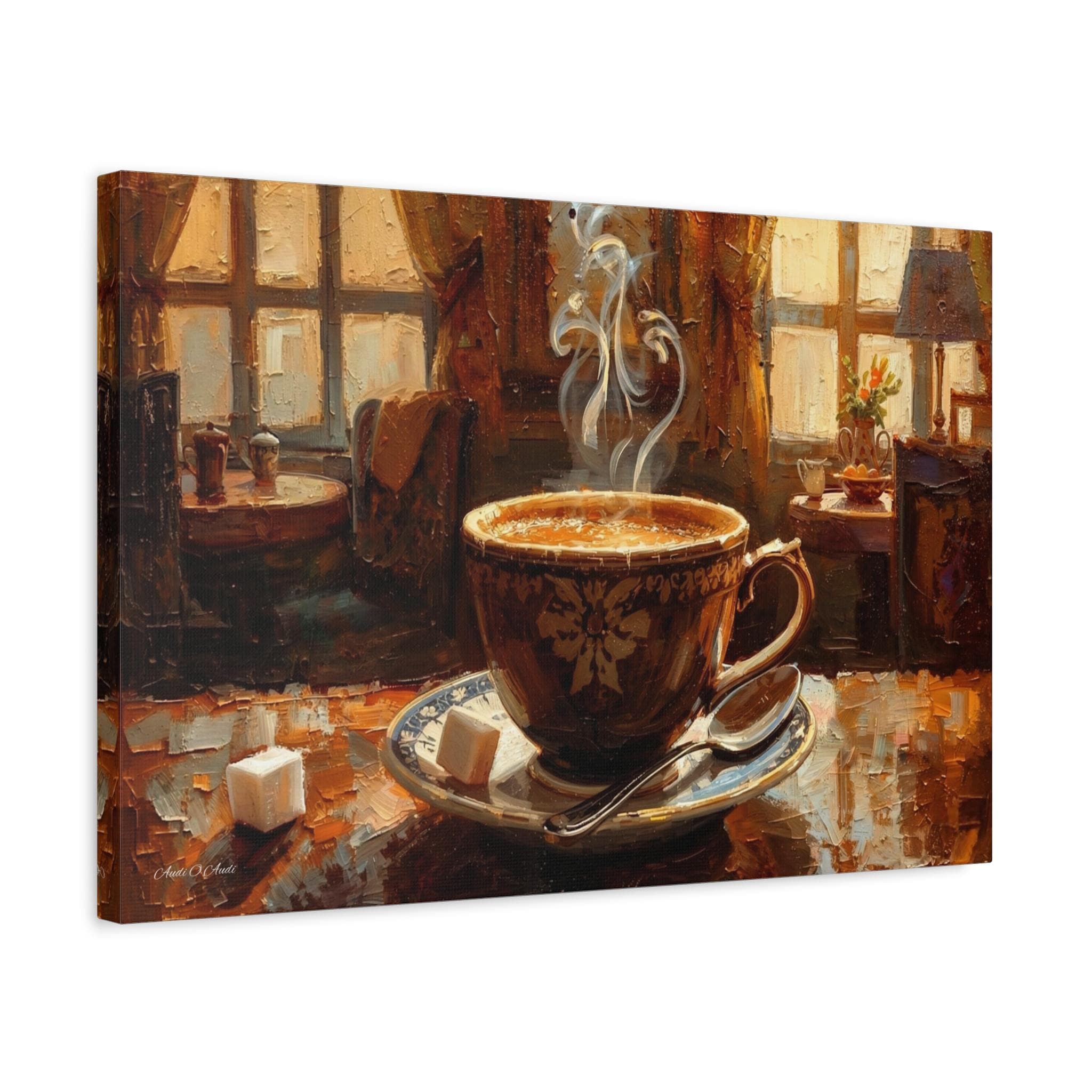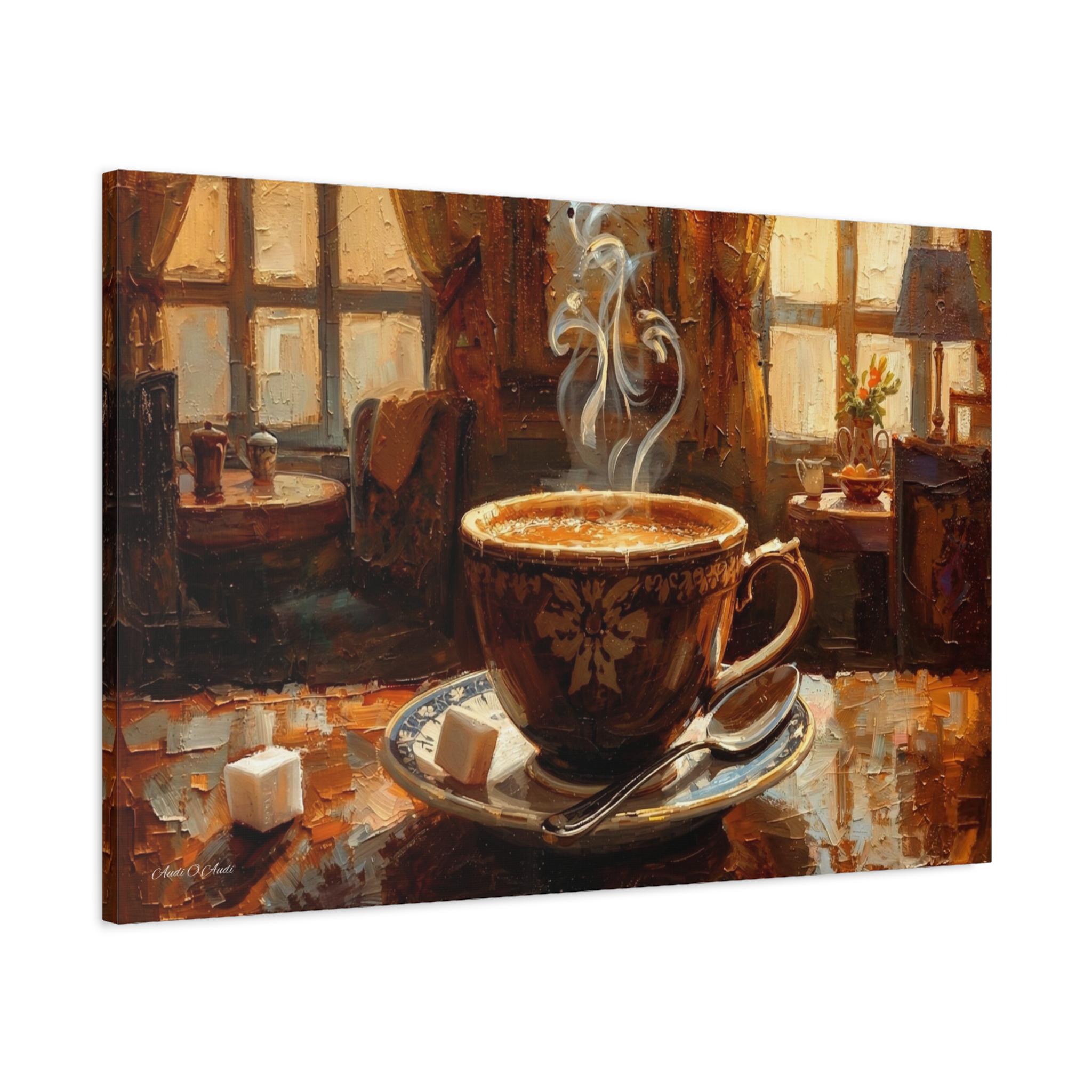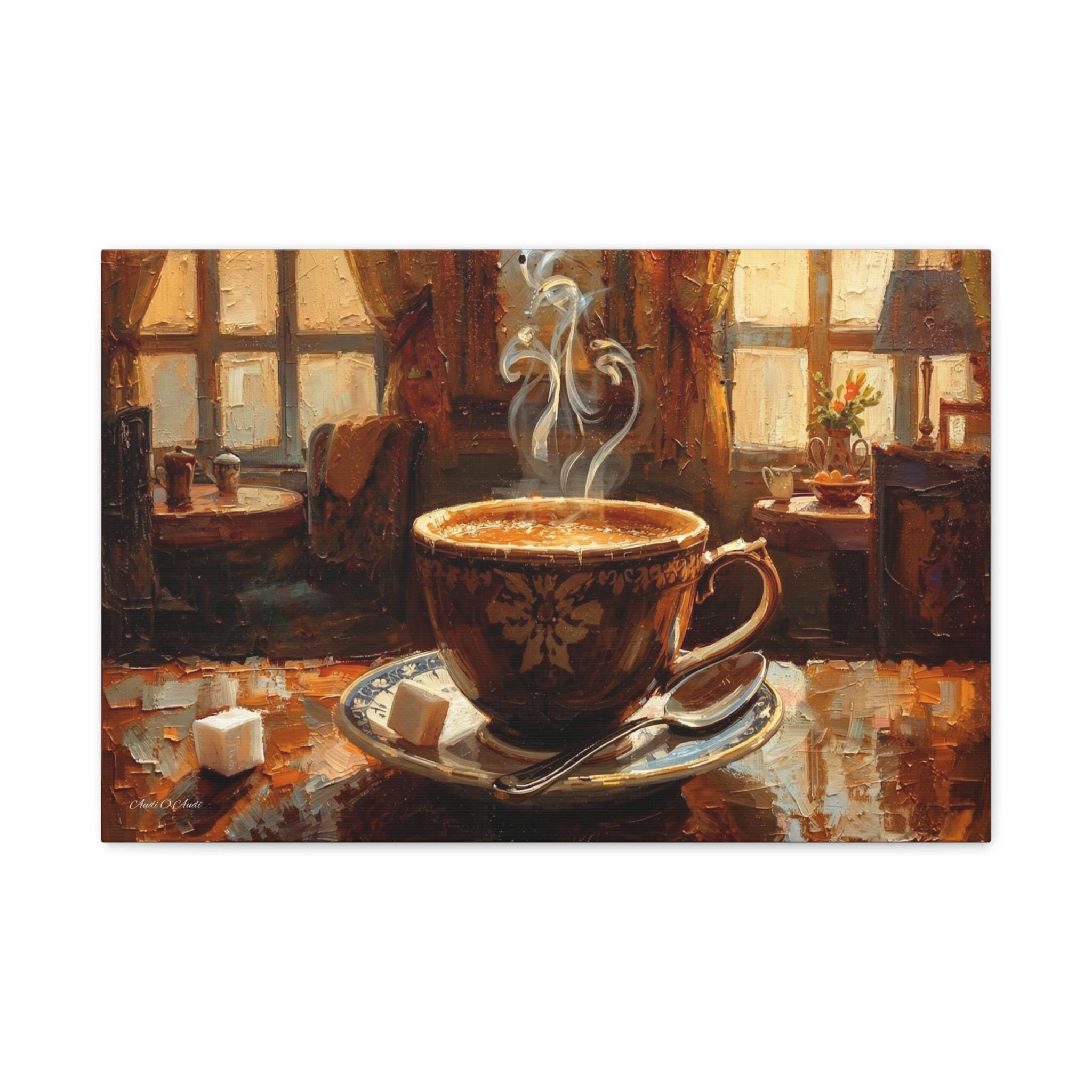 Wake up your walls with the inviting warmth of "Morning Serenity." This rich, textured canvas print captures the perfect quiet moment of the morning: a steaming cup of fresh coffee bathed in golden light.