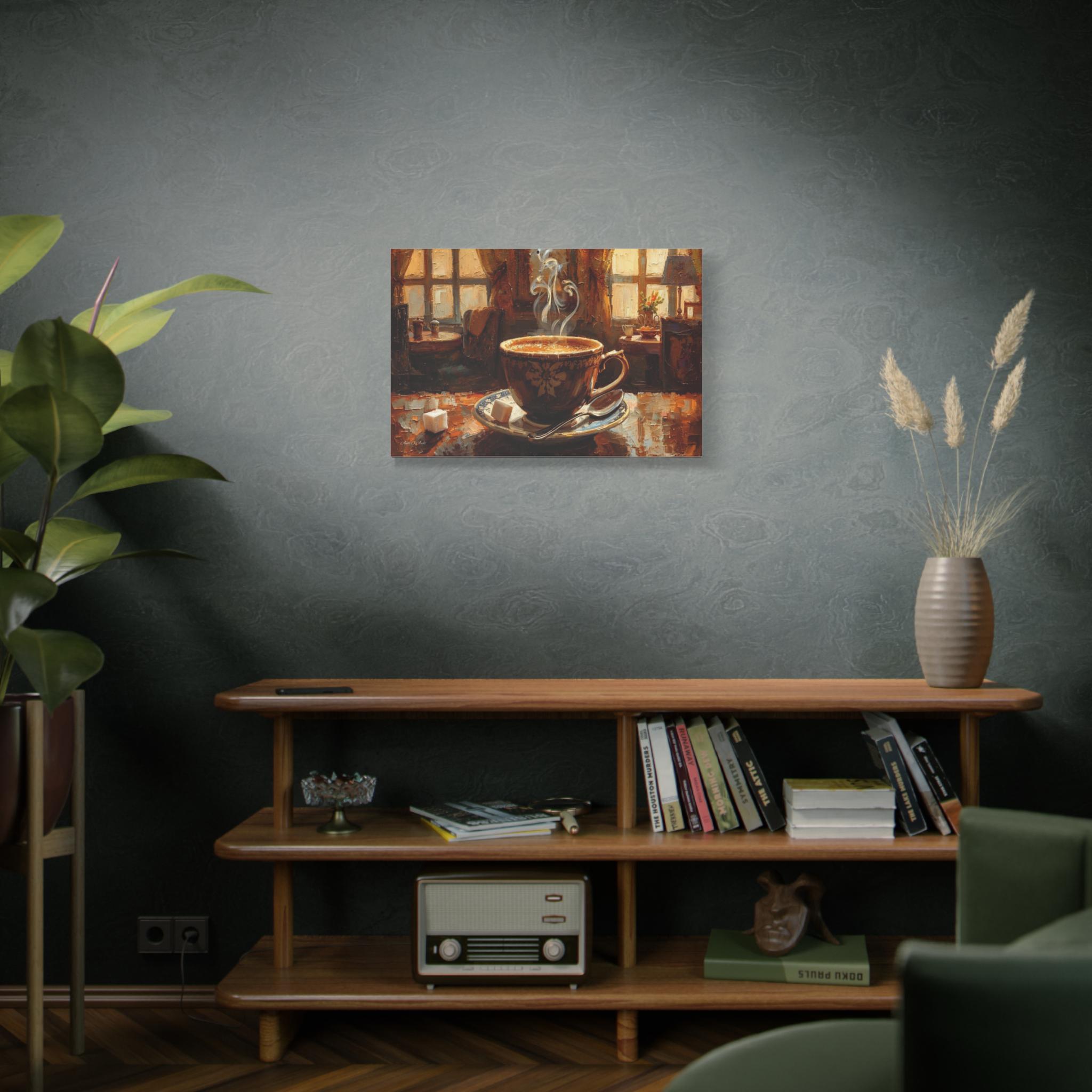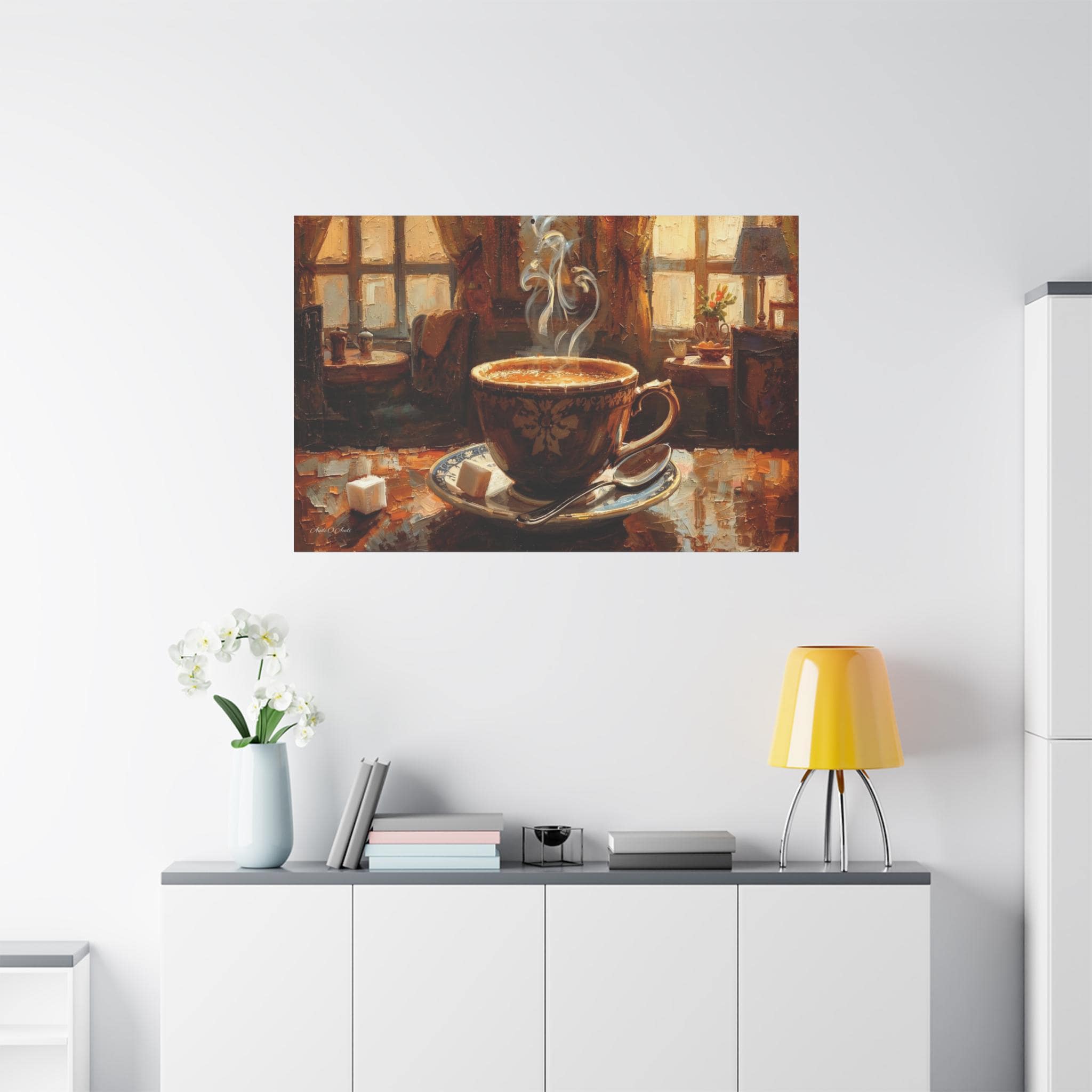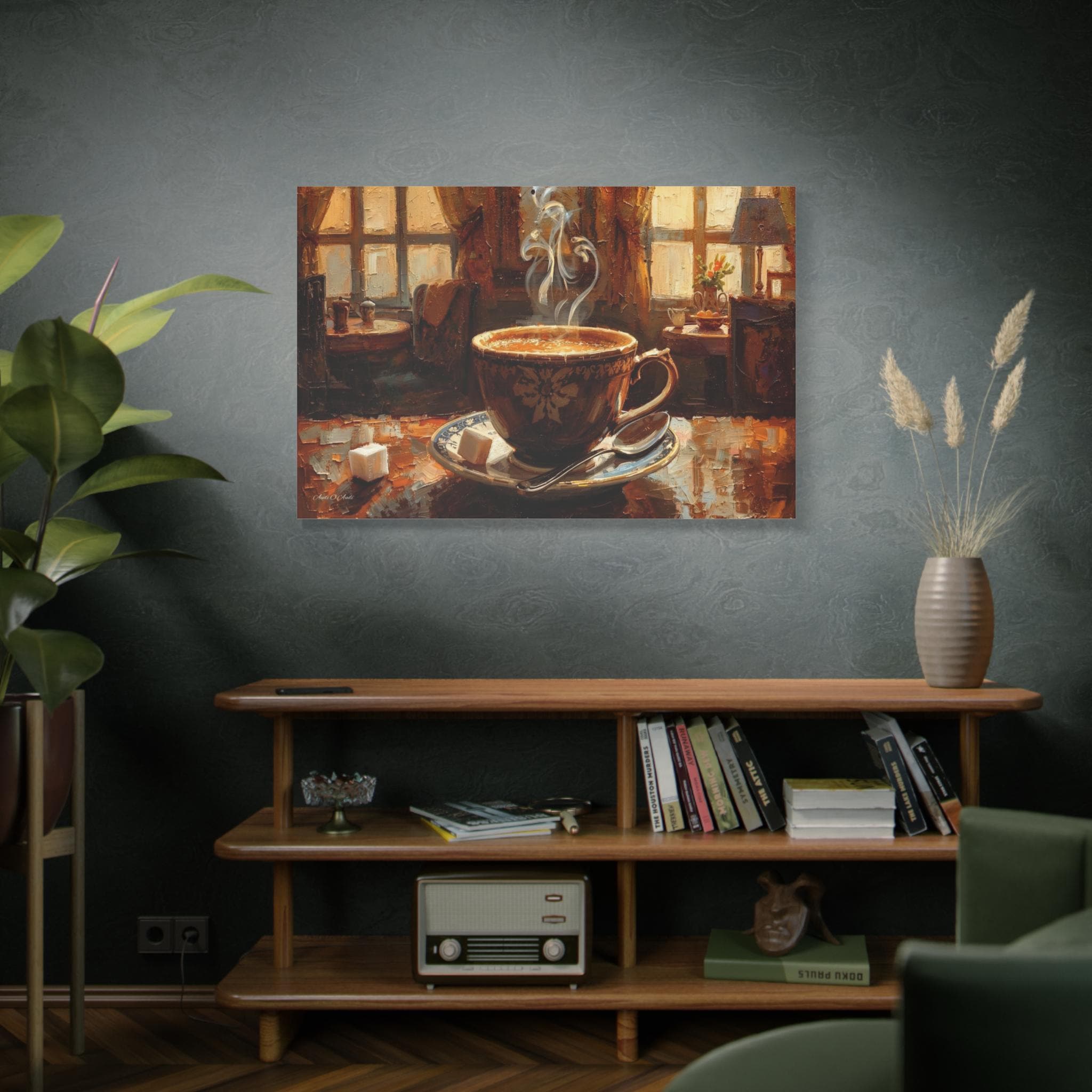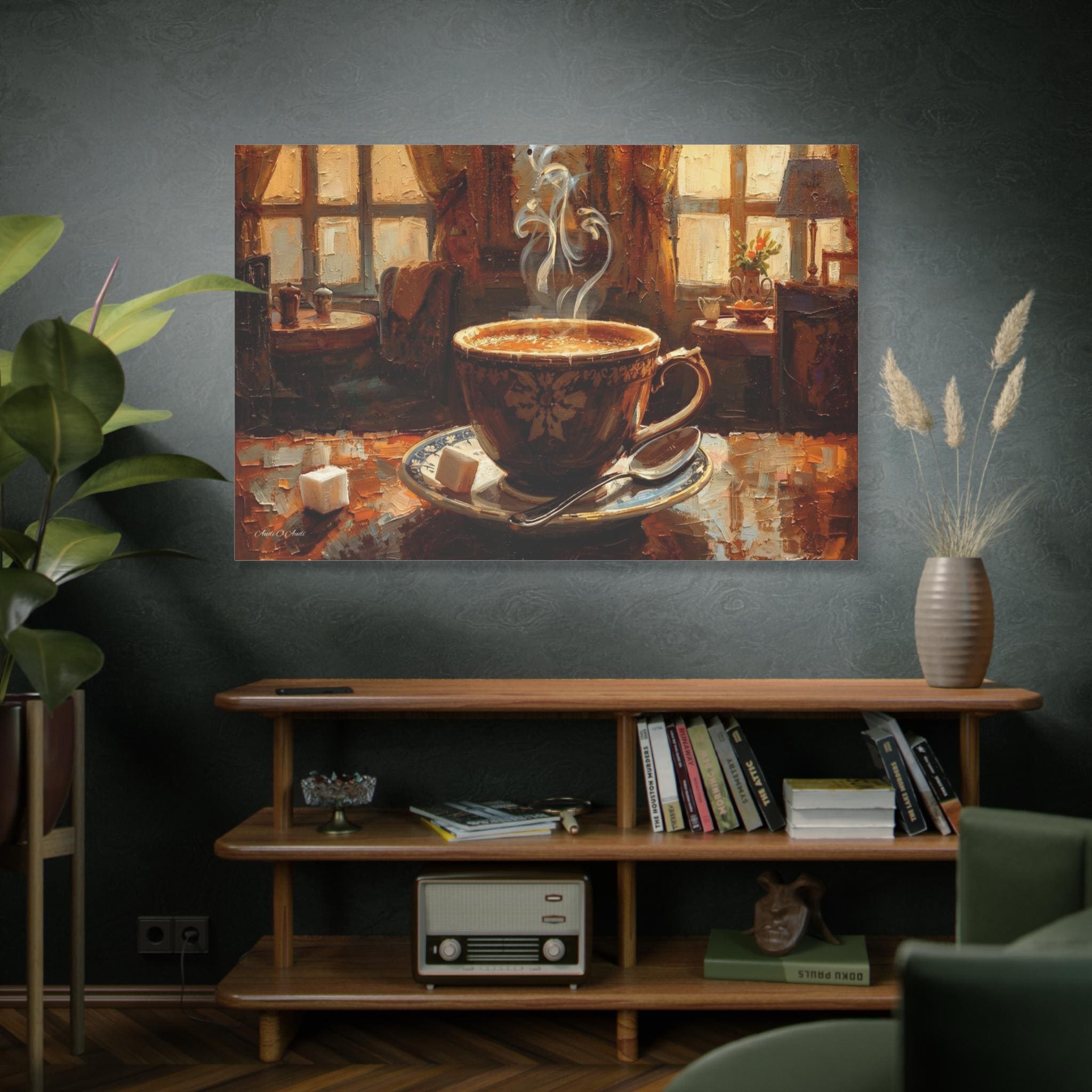 Wake up your walls with the inviting warmth of "Morning Serenity." This rich, textured canvas print captures the perfect quiet moment of the morning: a steaming cup of fresh coffee bathed in golden light.