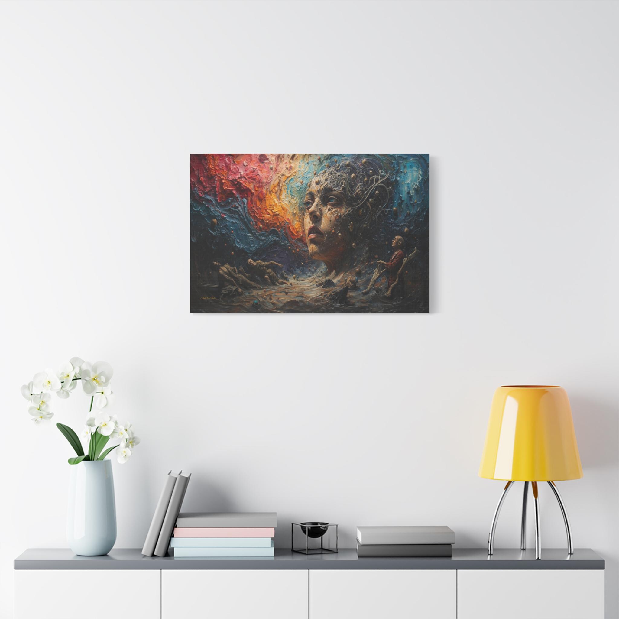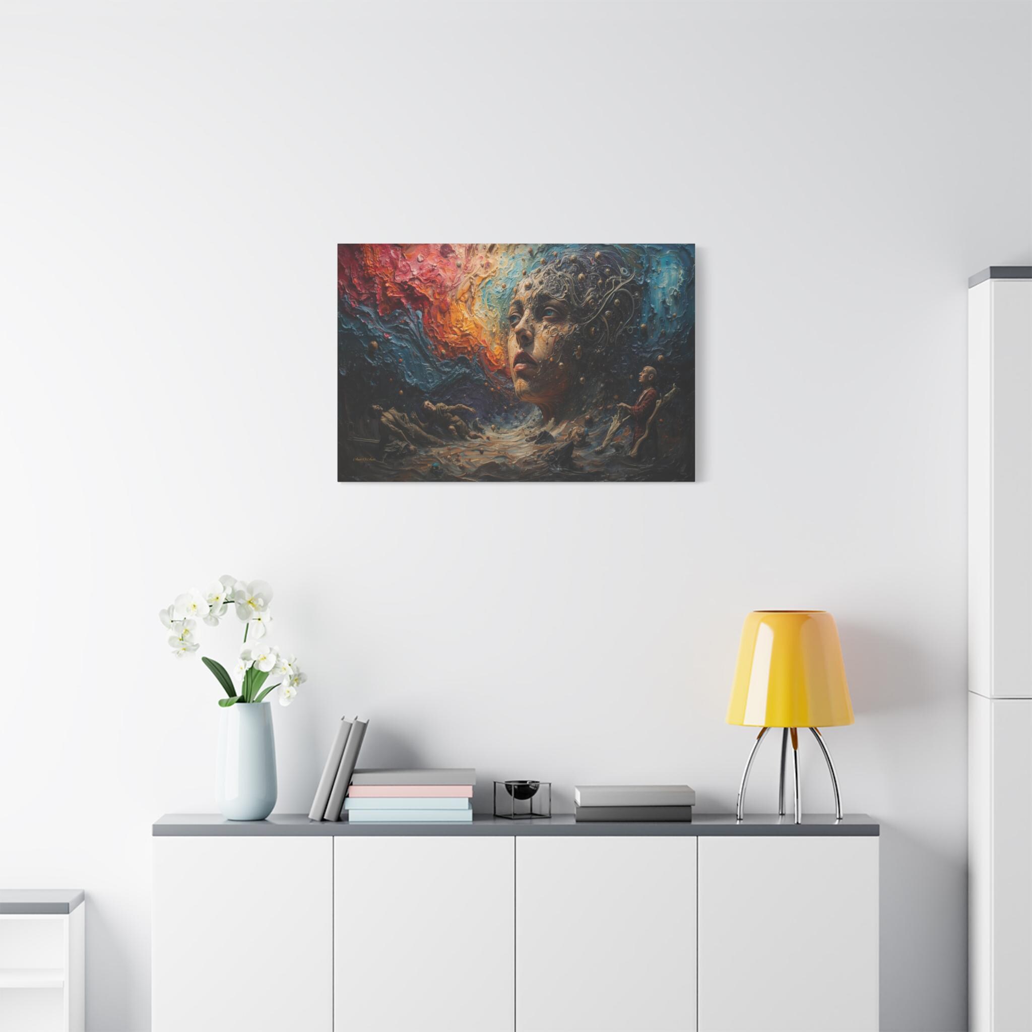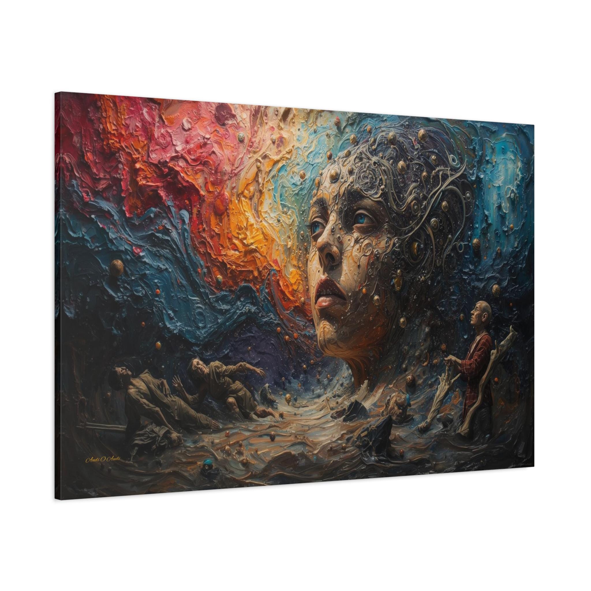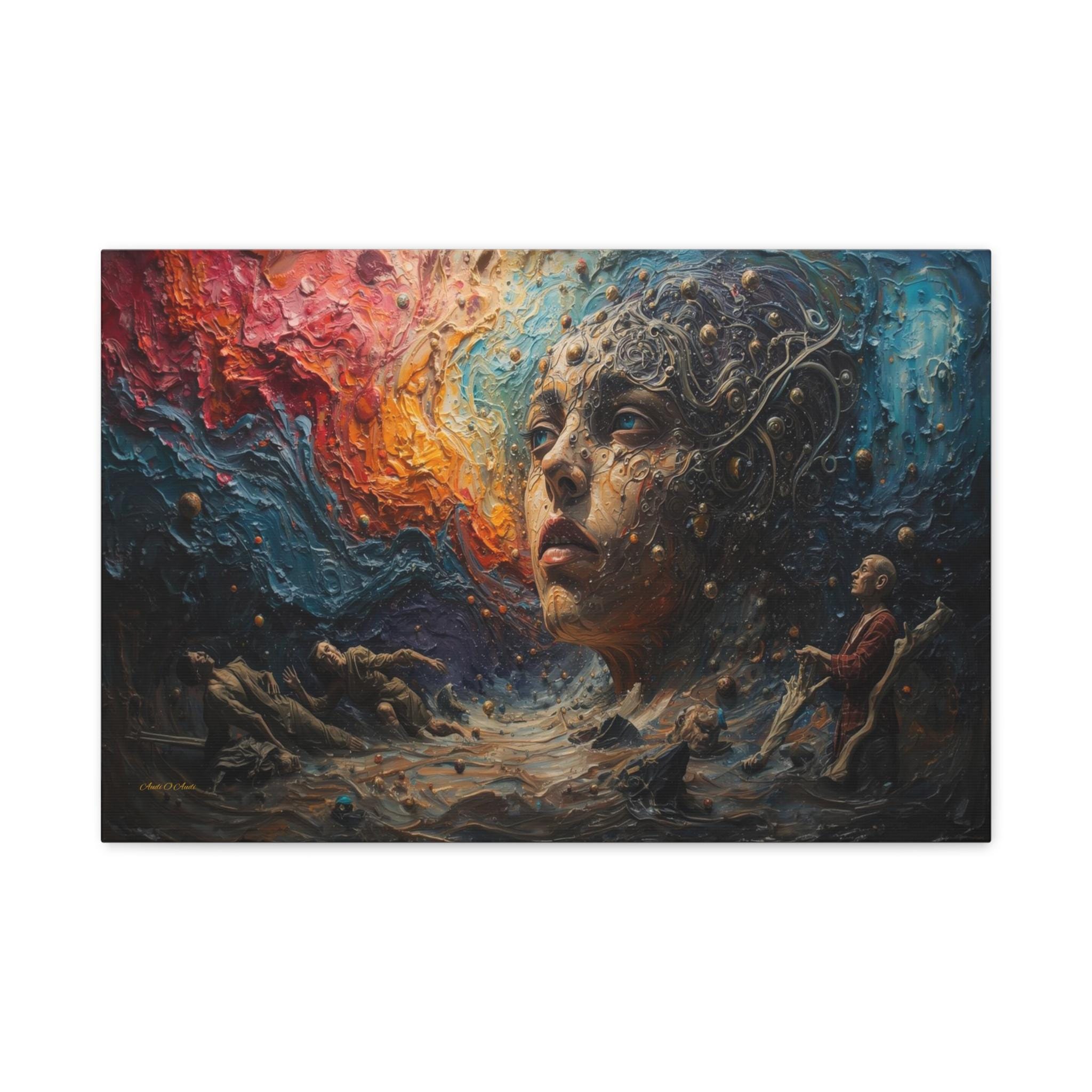 Step into a world beyond logic with "Cosmic Consciousness." This mesmerizing canvas print depicts a surreal dreamscape where the boundaries between humanity and the universe dissolve. Featuring a striking face emerging from swirling galaxies and thick, textured waves of color, this piece is a true masterpiece of imagination.