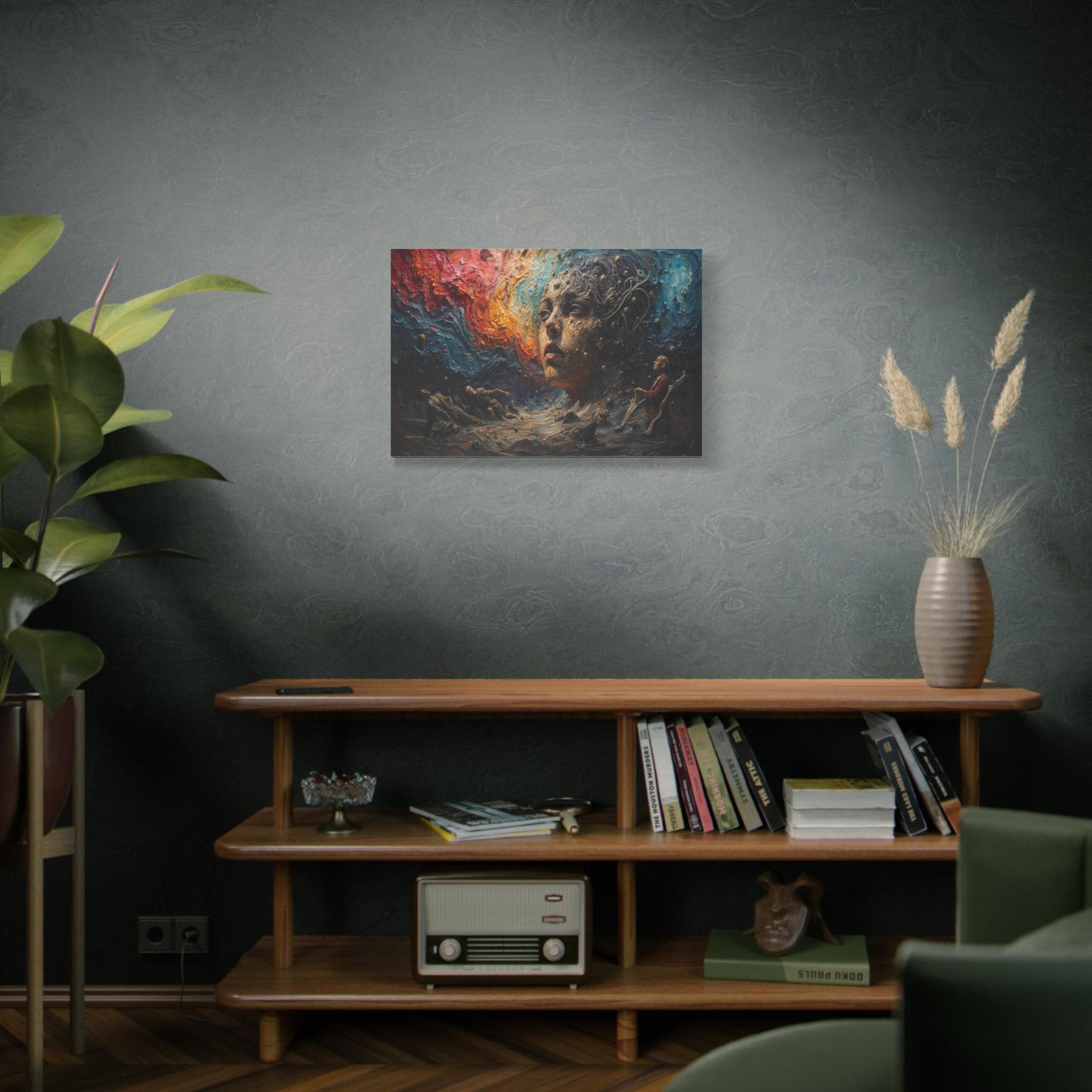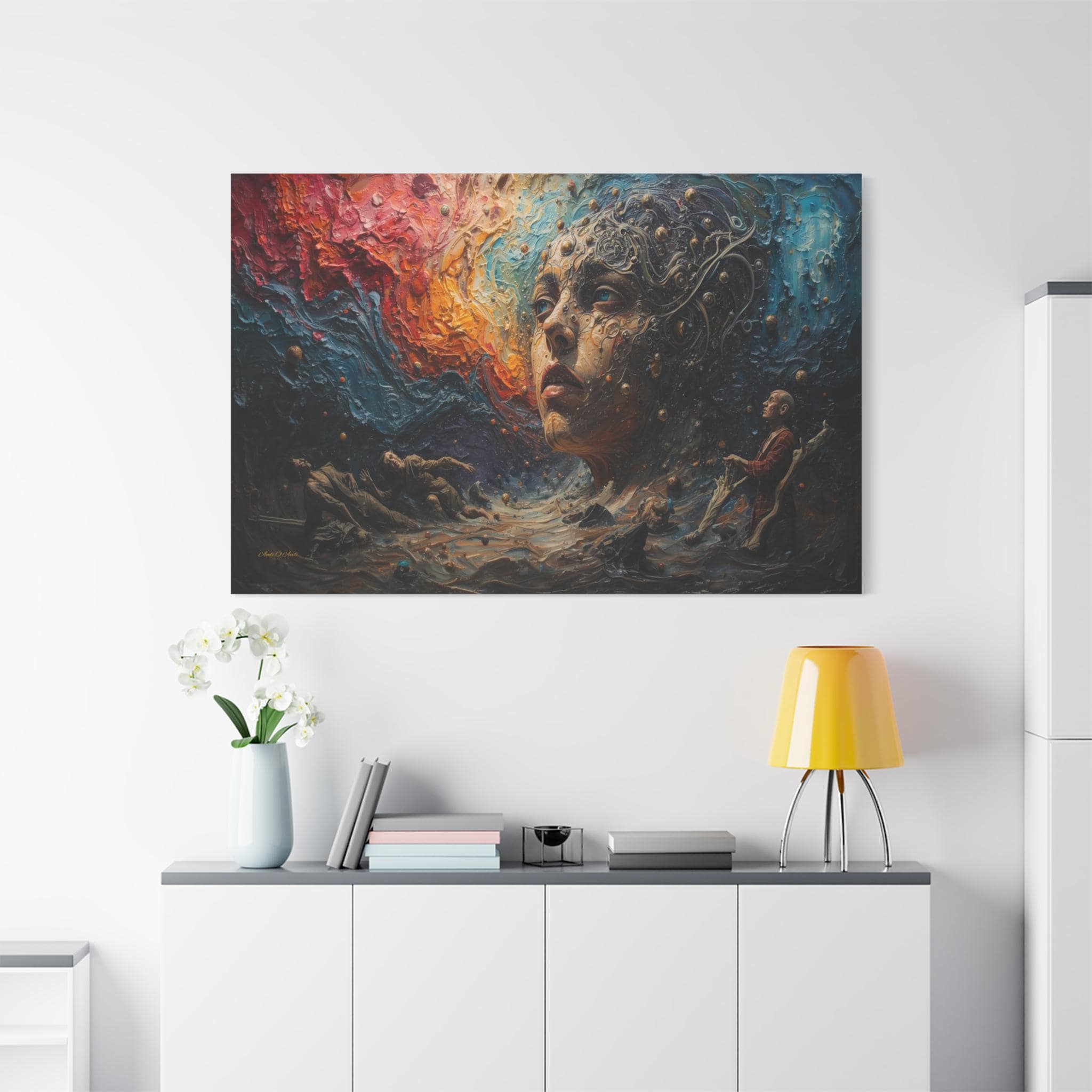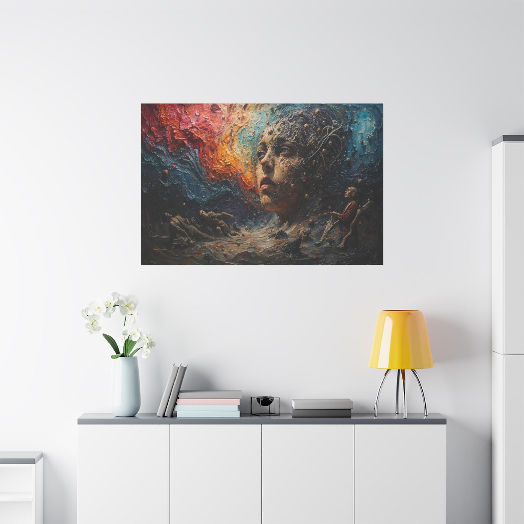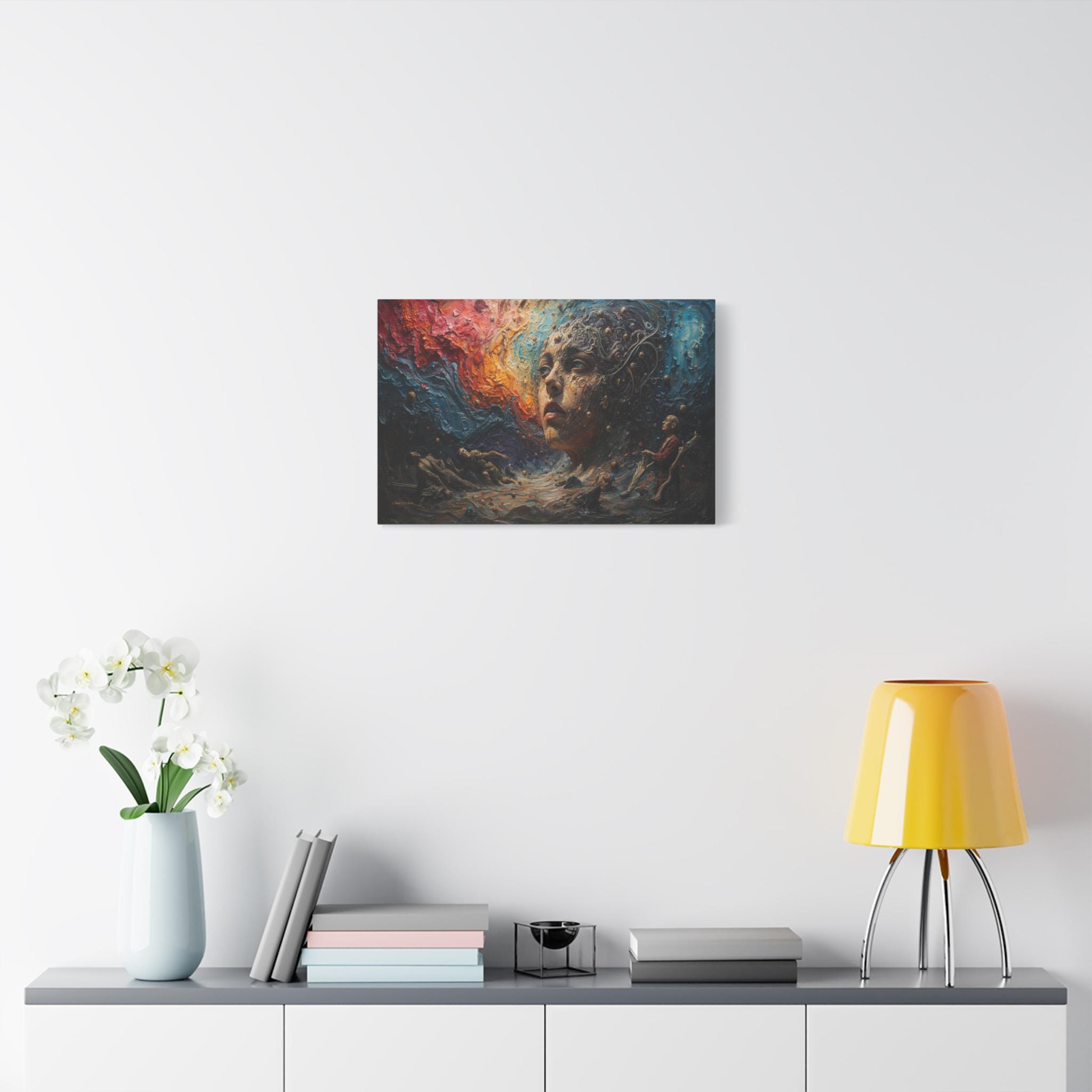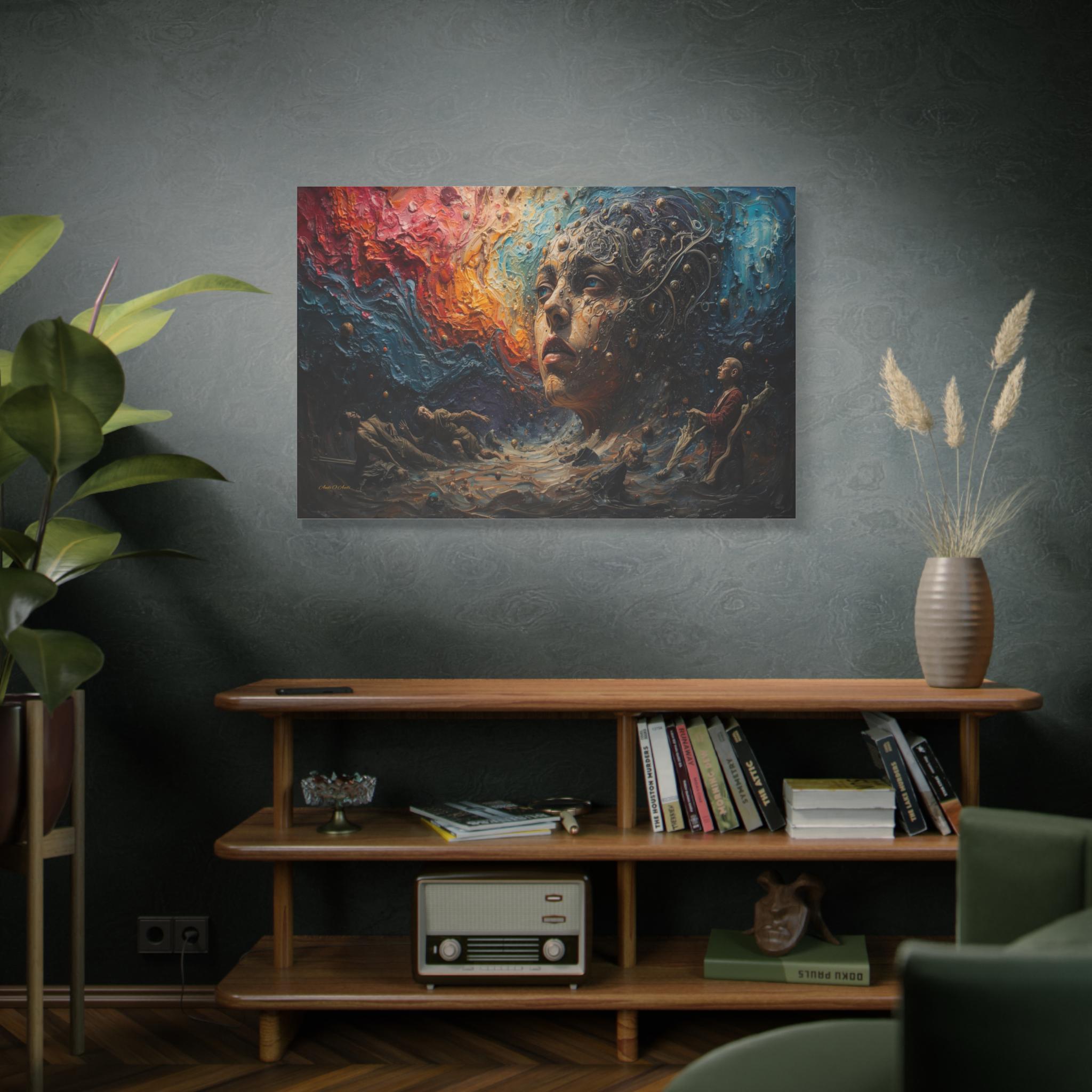 Step into a world beyond logic with "Cosmic Consciousness." This mesmerizing canvas print depicts a surreal dreamscape where the boundaries between humanity and the universe dissolve. Featuring a striking face emerging from swirling galaxies and thick, textured waves of color, this piece is a true masterpiece of imagination.