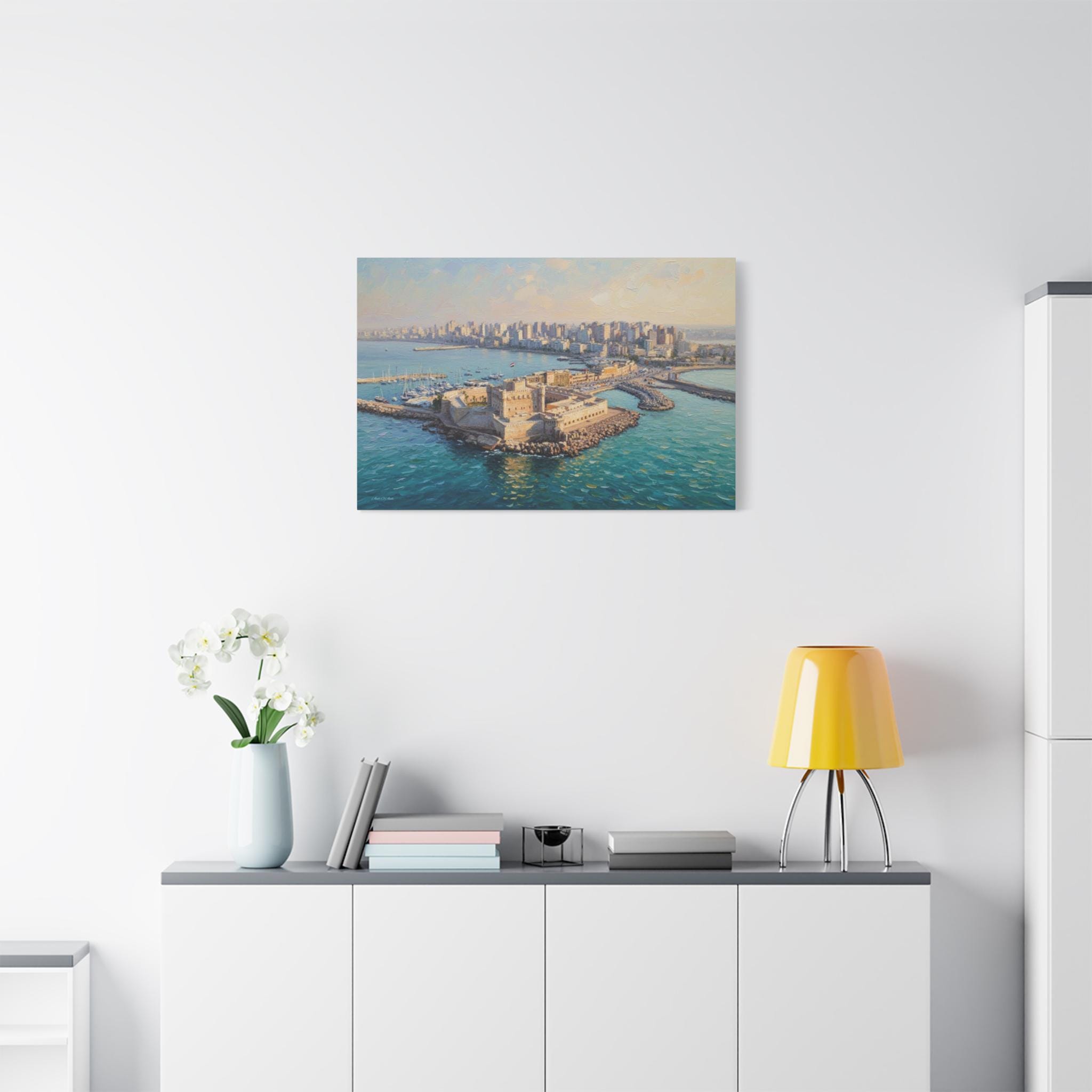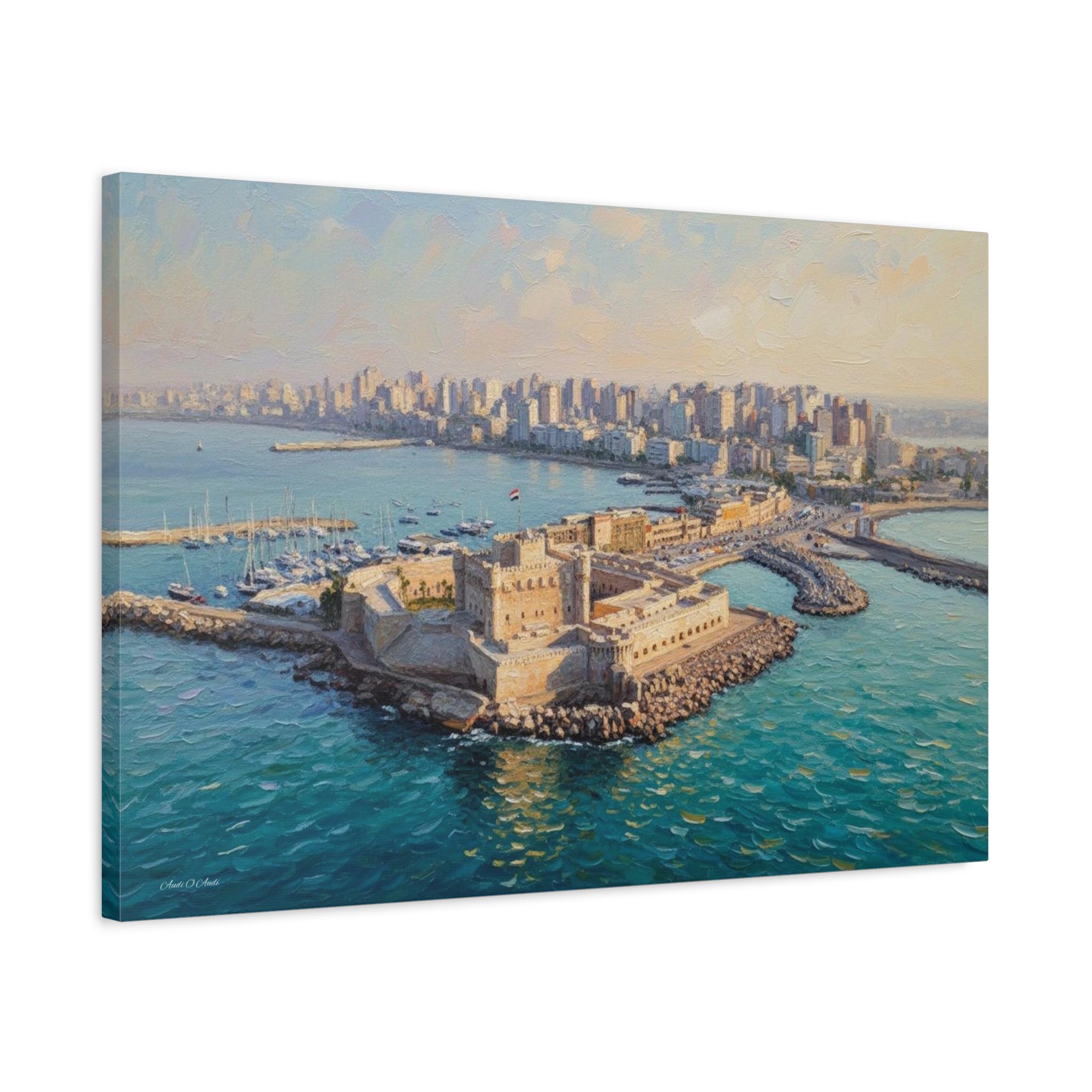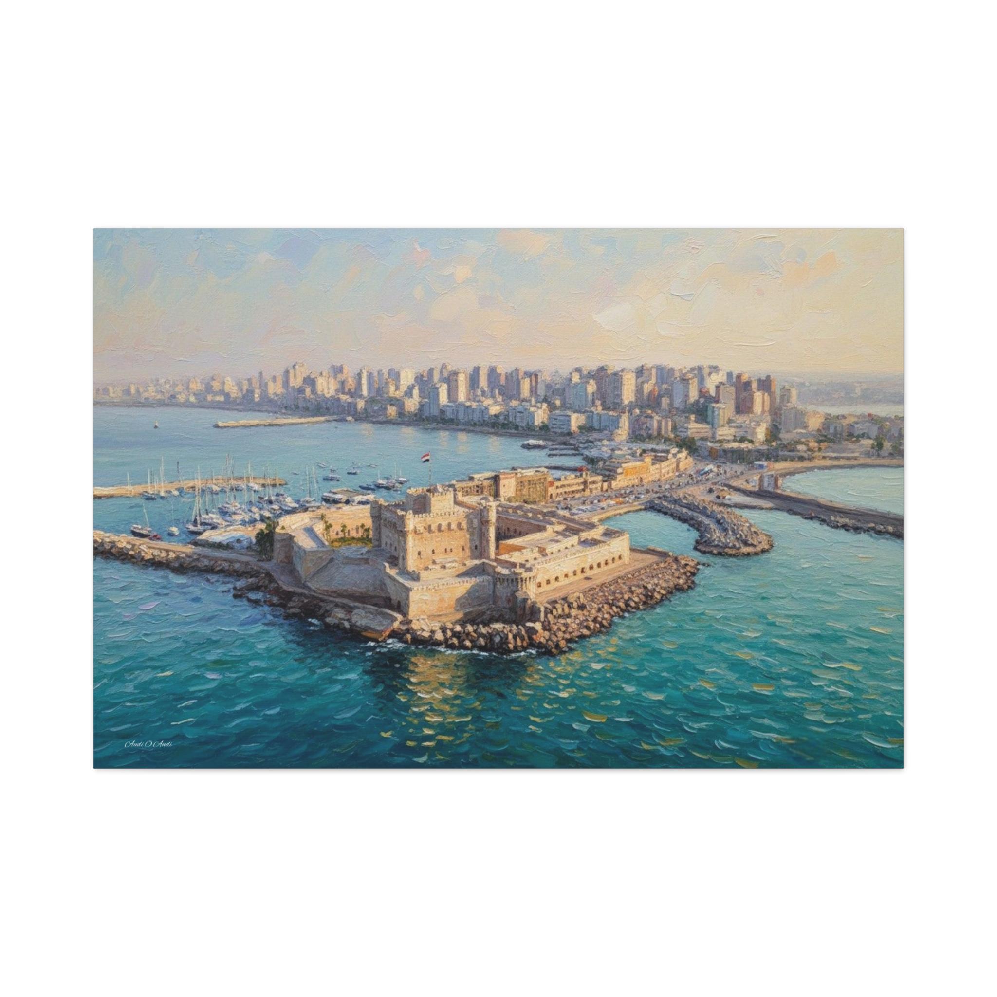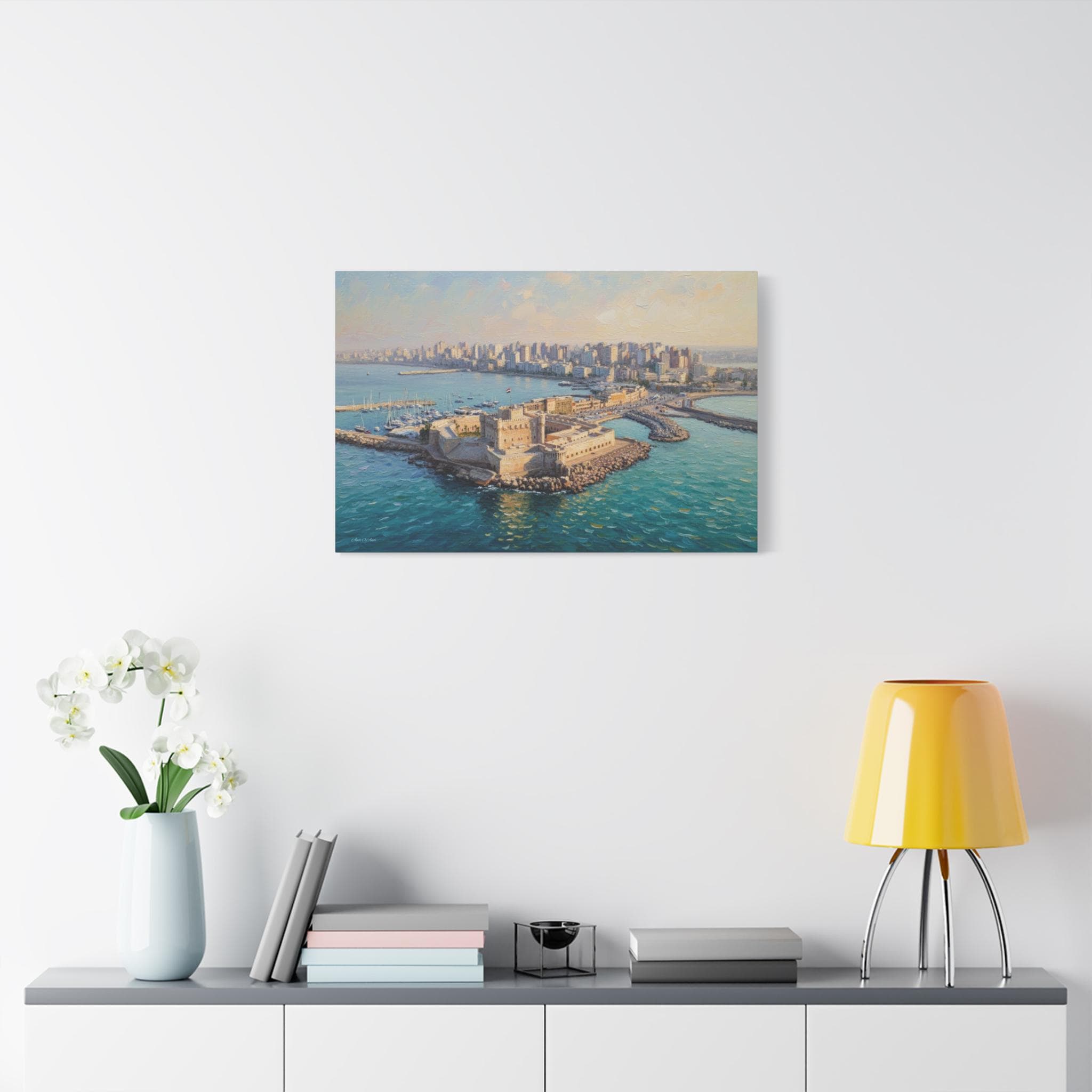 Transport your home to the sun-drenched shores of the Mediterranean with "The Pearl of Alexandria." This majestic canvas print features the iconic Citadel of Qaitbay standing guard over the harbor of Alexandria, Egypt.