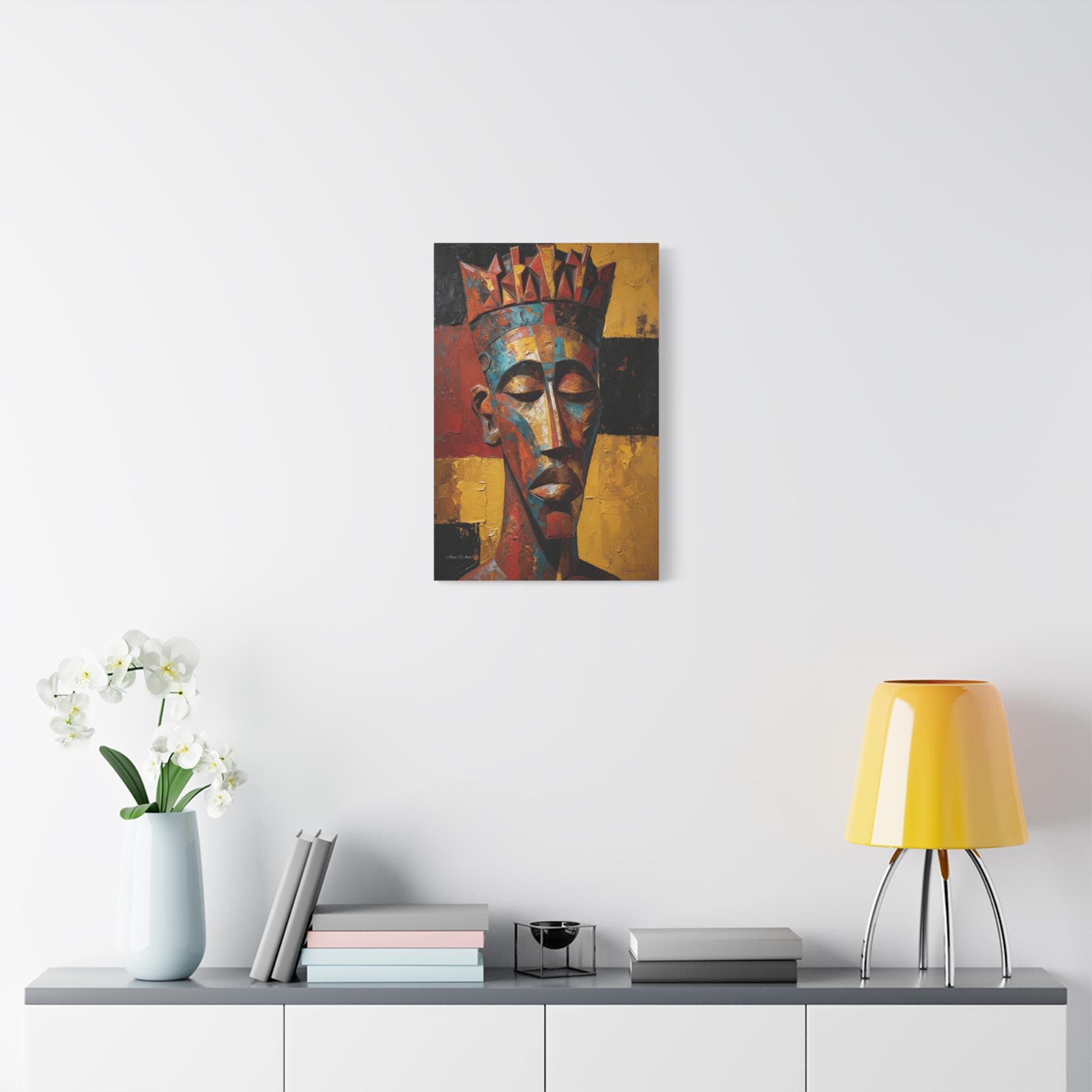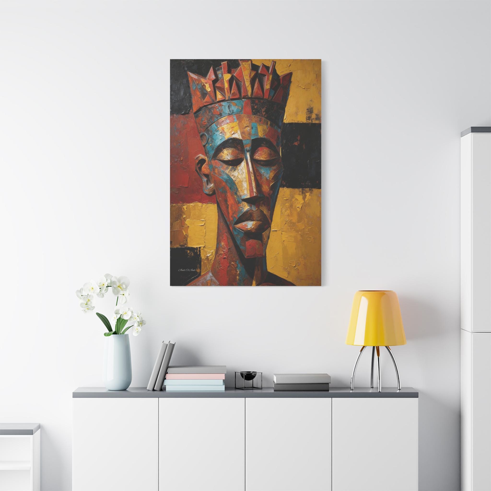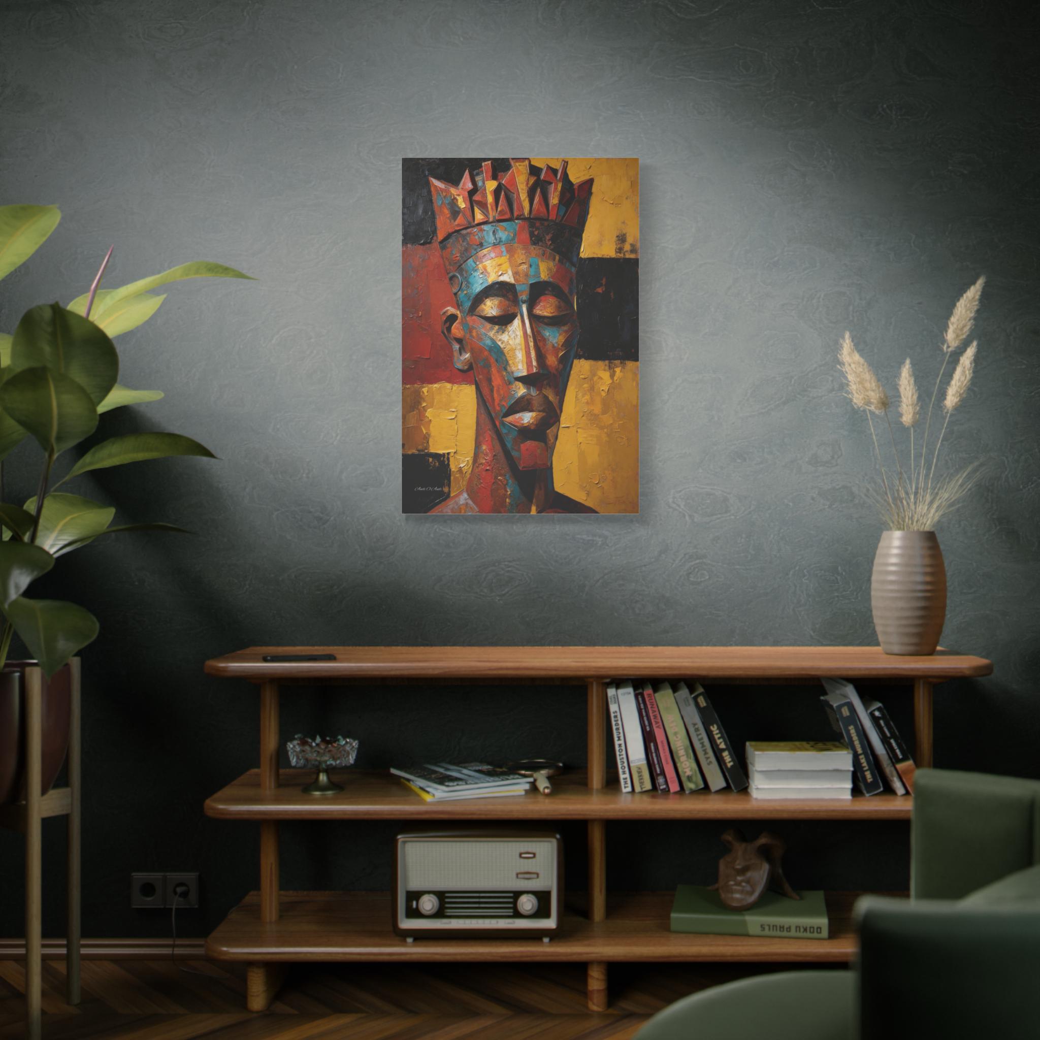 Bring regal elegance and bold culture to your walls with this striking abstract portrait. Featuring a stylized royal figure adorned with a geometric crown, this piece blends the look of traditional wood carving with vibrant modern impasto painting techniques.