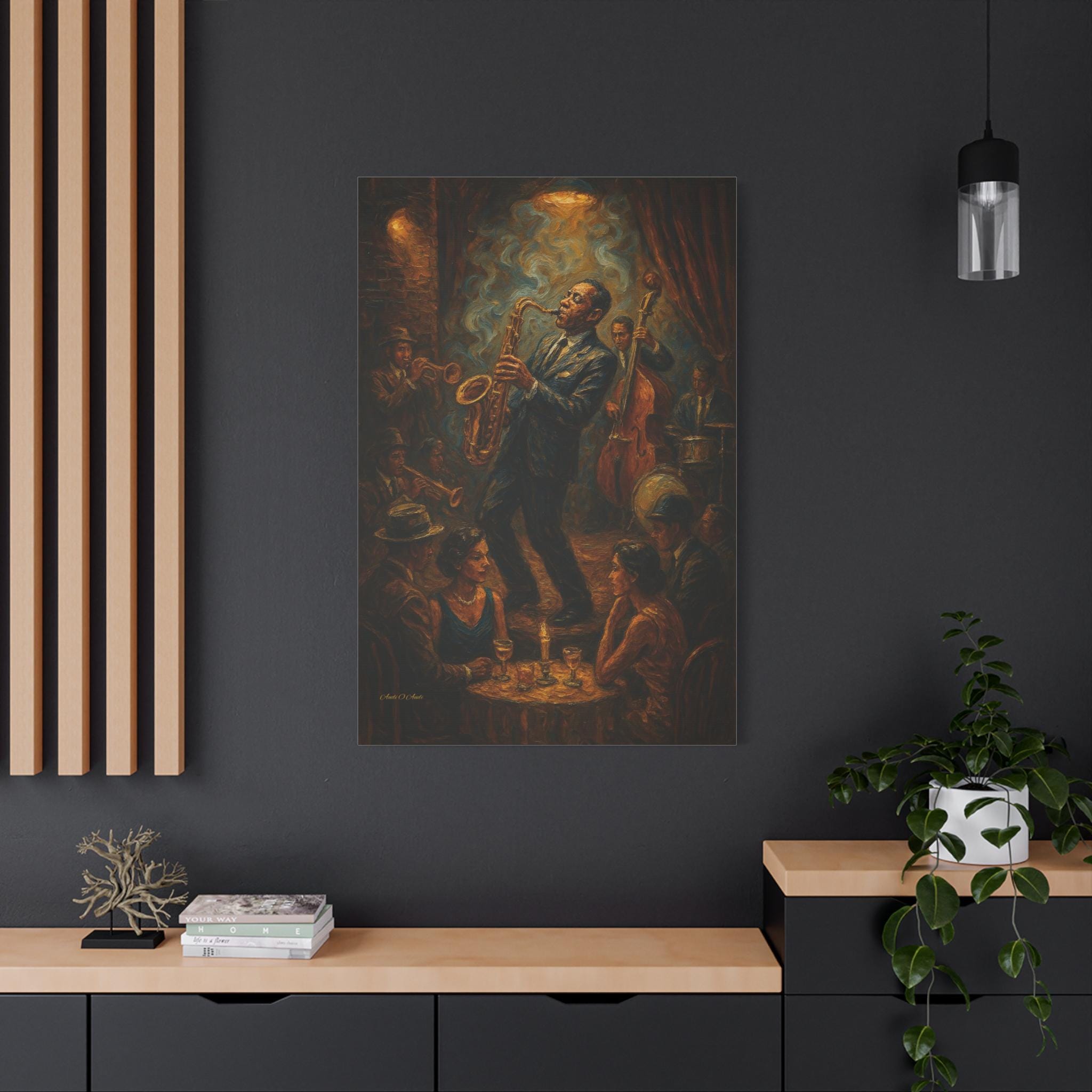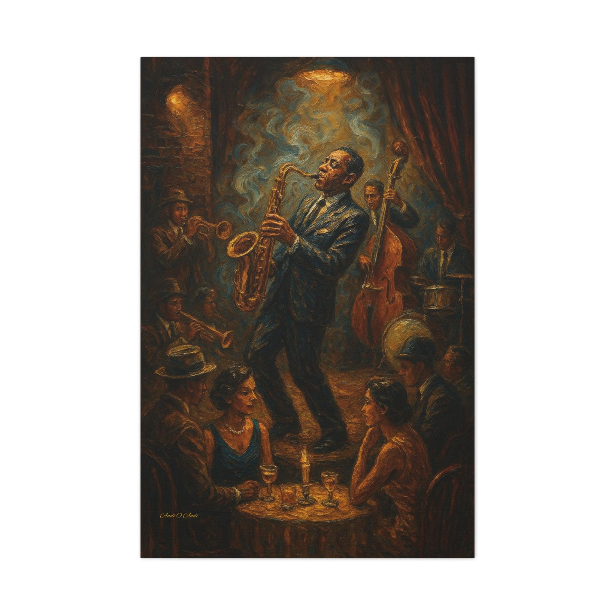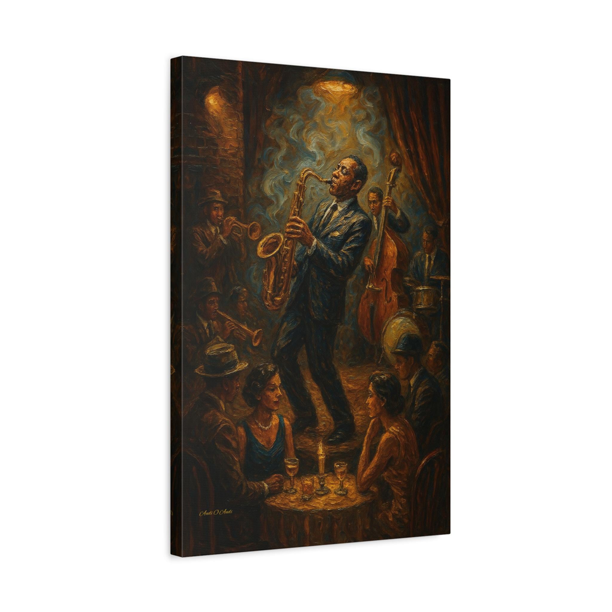 Bring the soulful rhythm of a vintage jazz club into your home with this stunning canvas print. Featuring a passionate saxophone player and his band immersed in blue swirls of smoke and golden stage light, this piece captures the energy of a live performance.