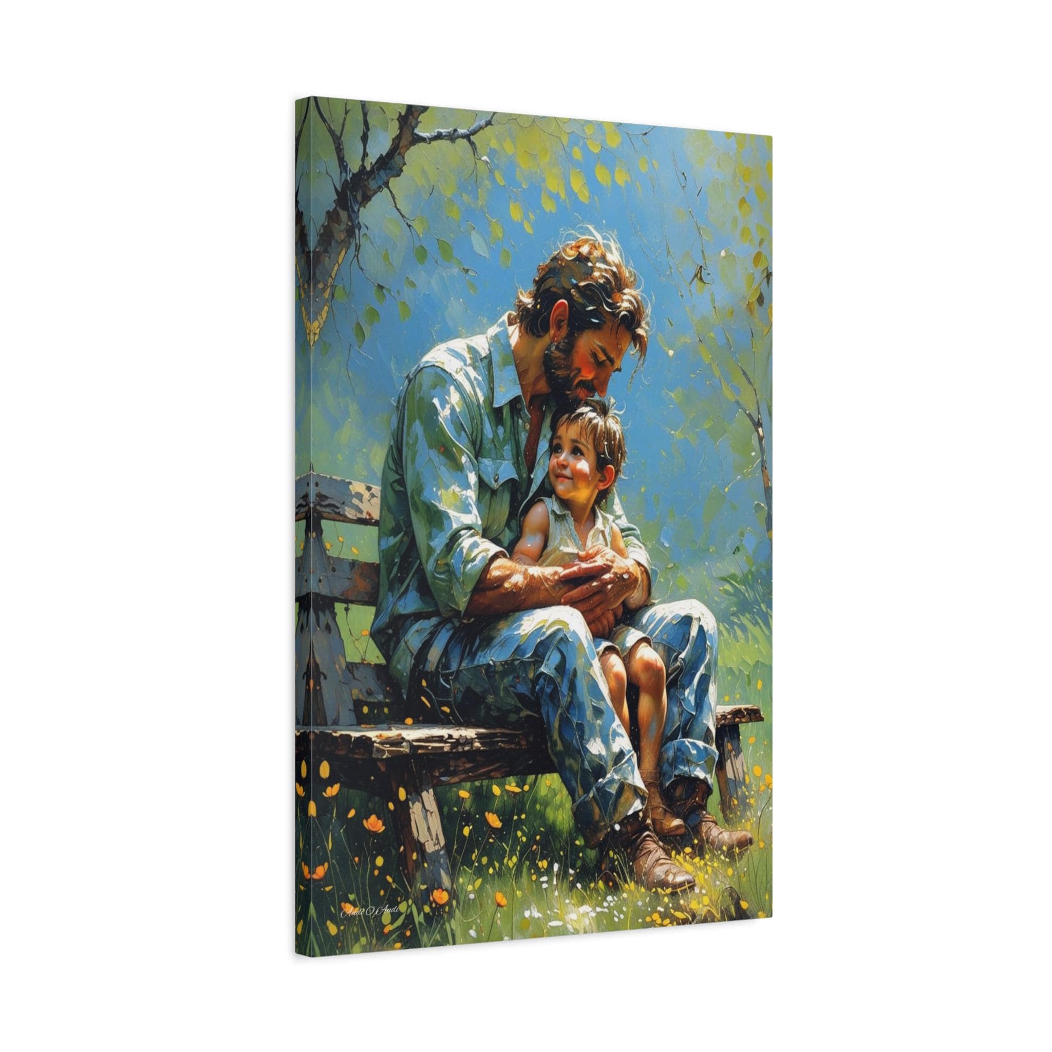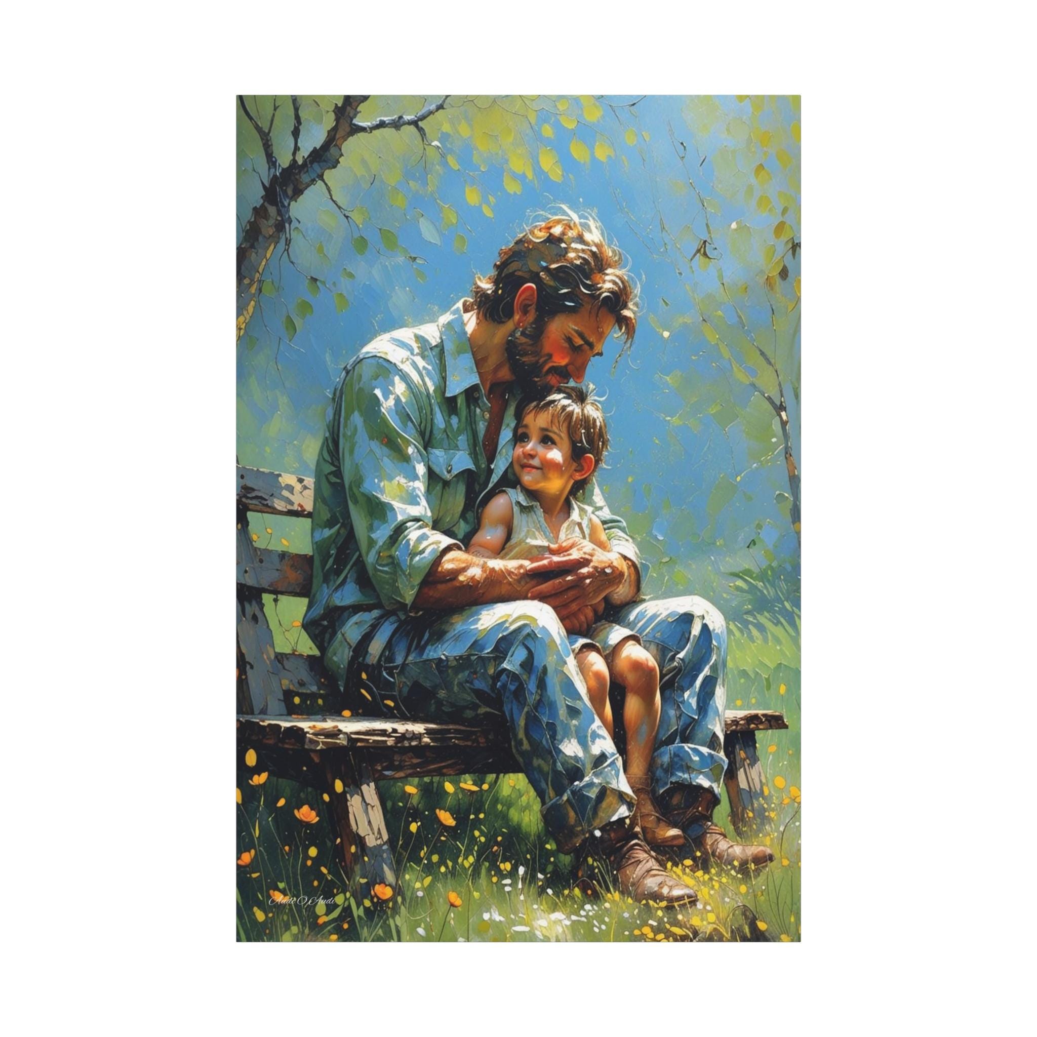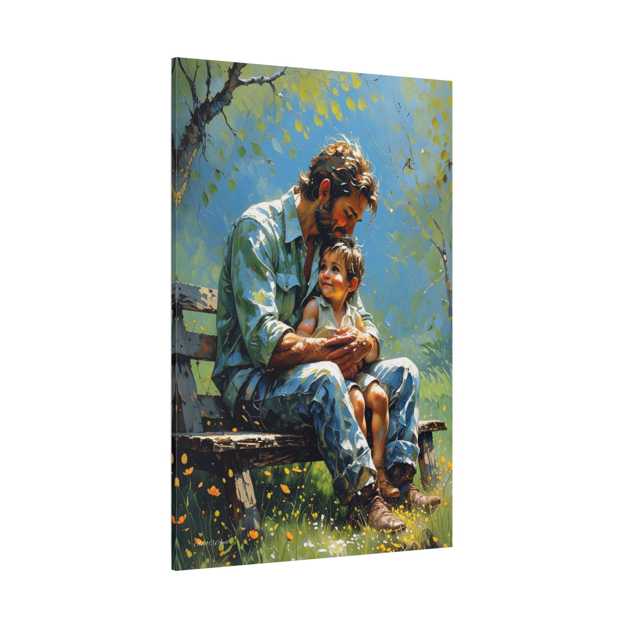 Celebrate the unbreakable bond of fatherhood with this heartwarming canvas print of a dad and child. Seated together on a rustic bench in a sunlit garden, this artwork captures a quiet, tender moment of connection as the child looks up at their father with pure love and trust.
