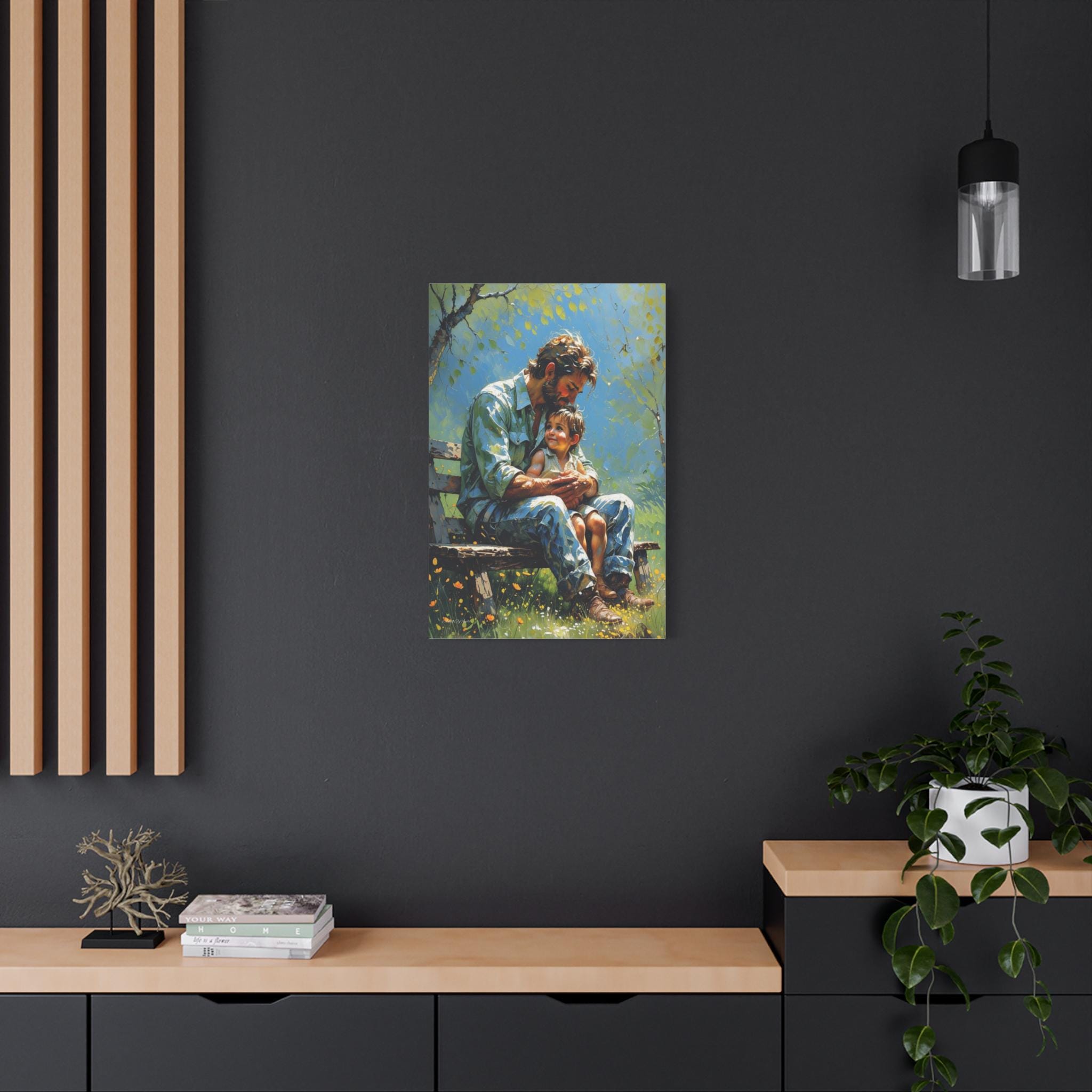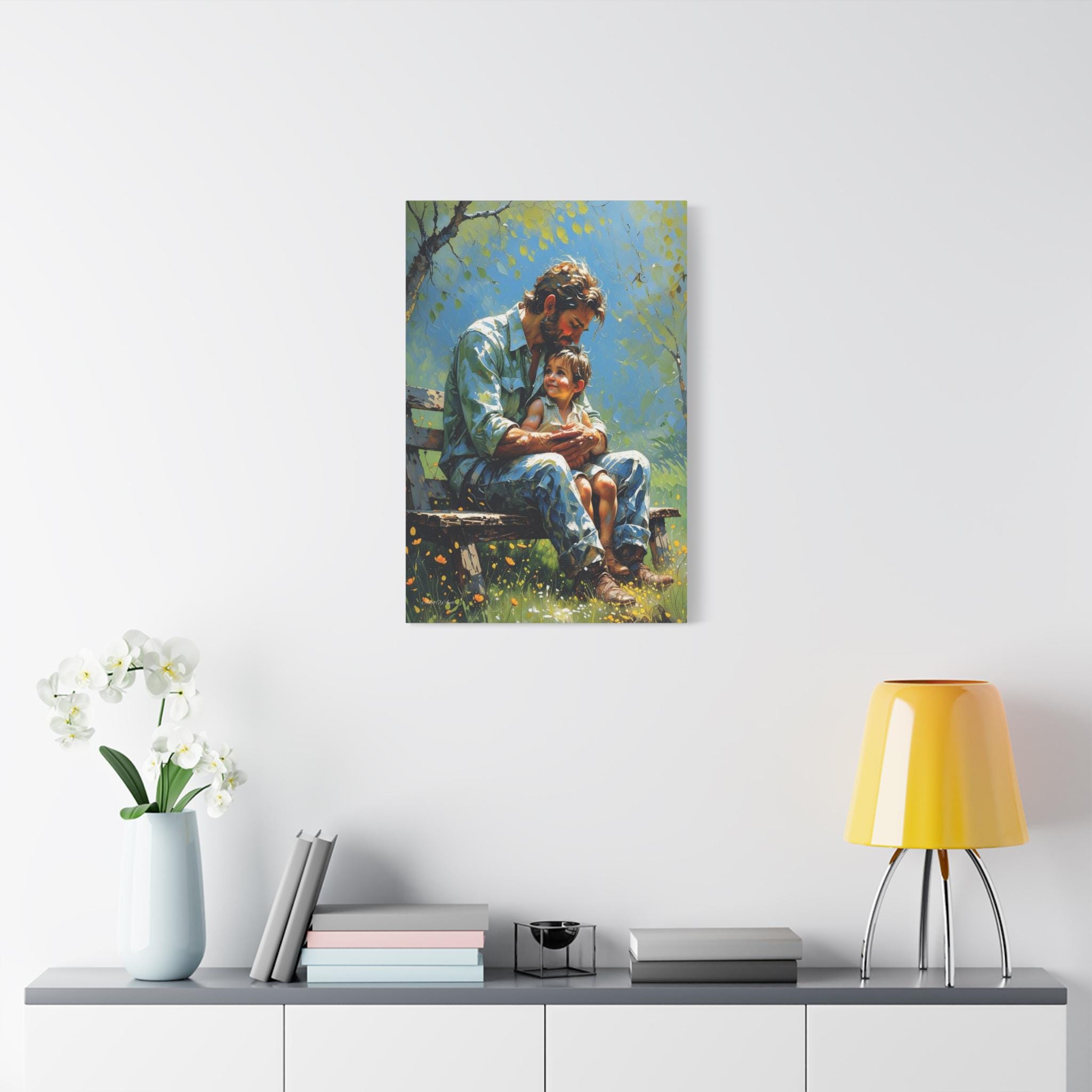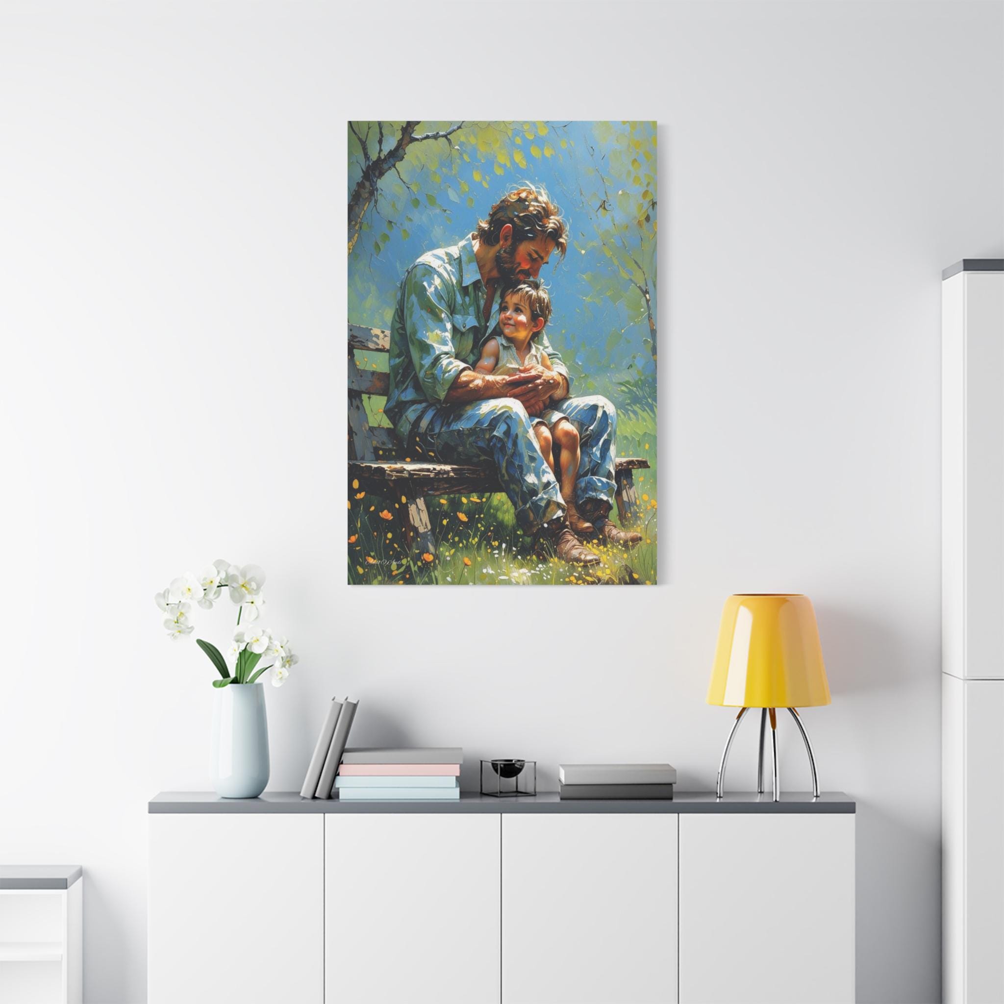Celebrate the unbreakable bond of fatherhood with this heartwarming canvas print of a dad and child. Seated together on a rustic bench in a sunlit garden, this artwork captures a quiet, tender moment of connection as the child looks up at their father with pure love and trust.