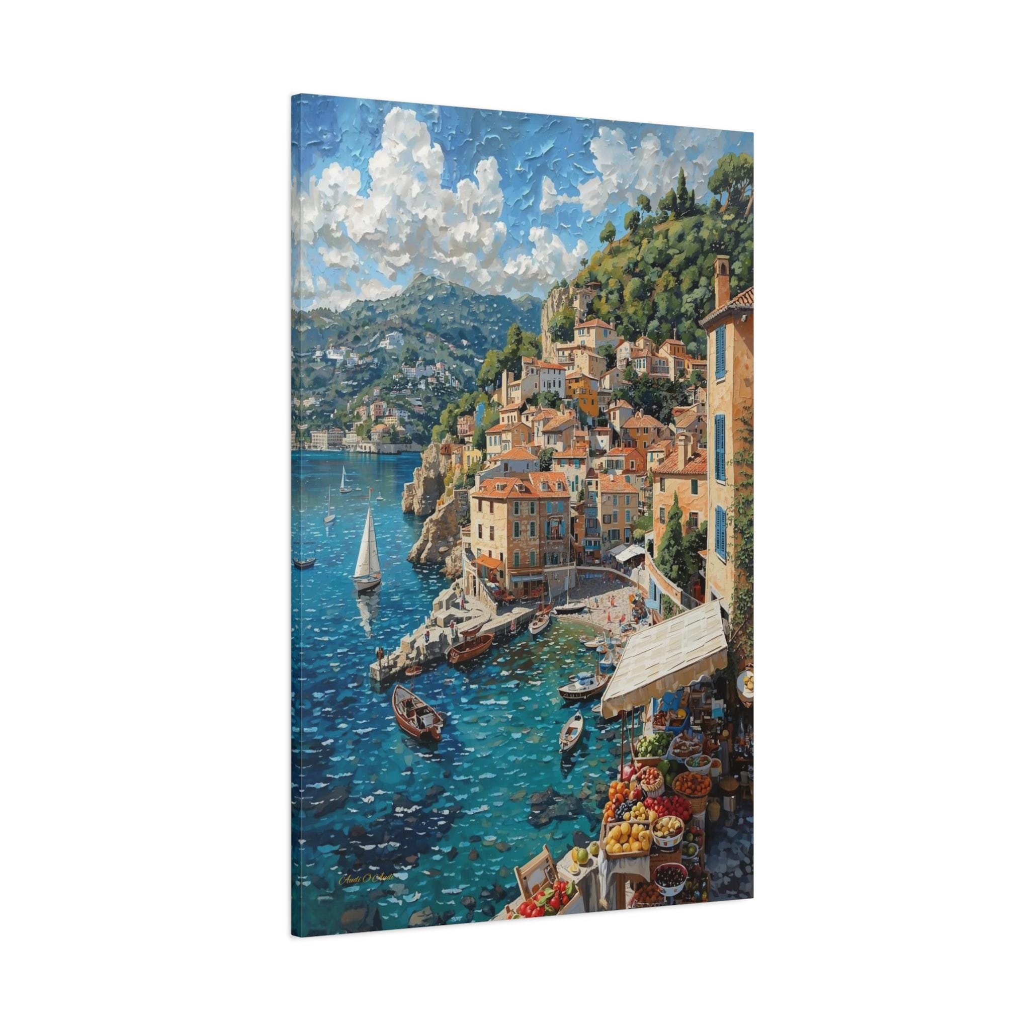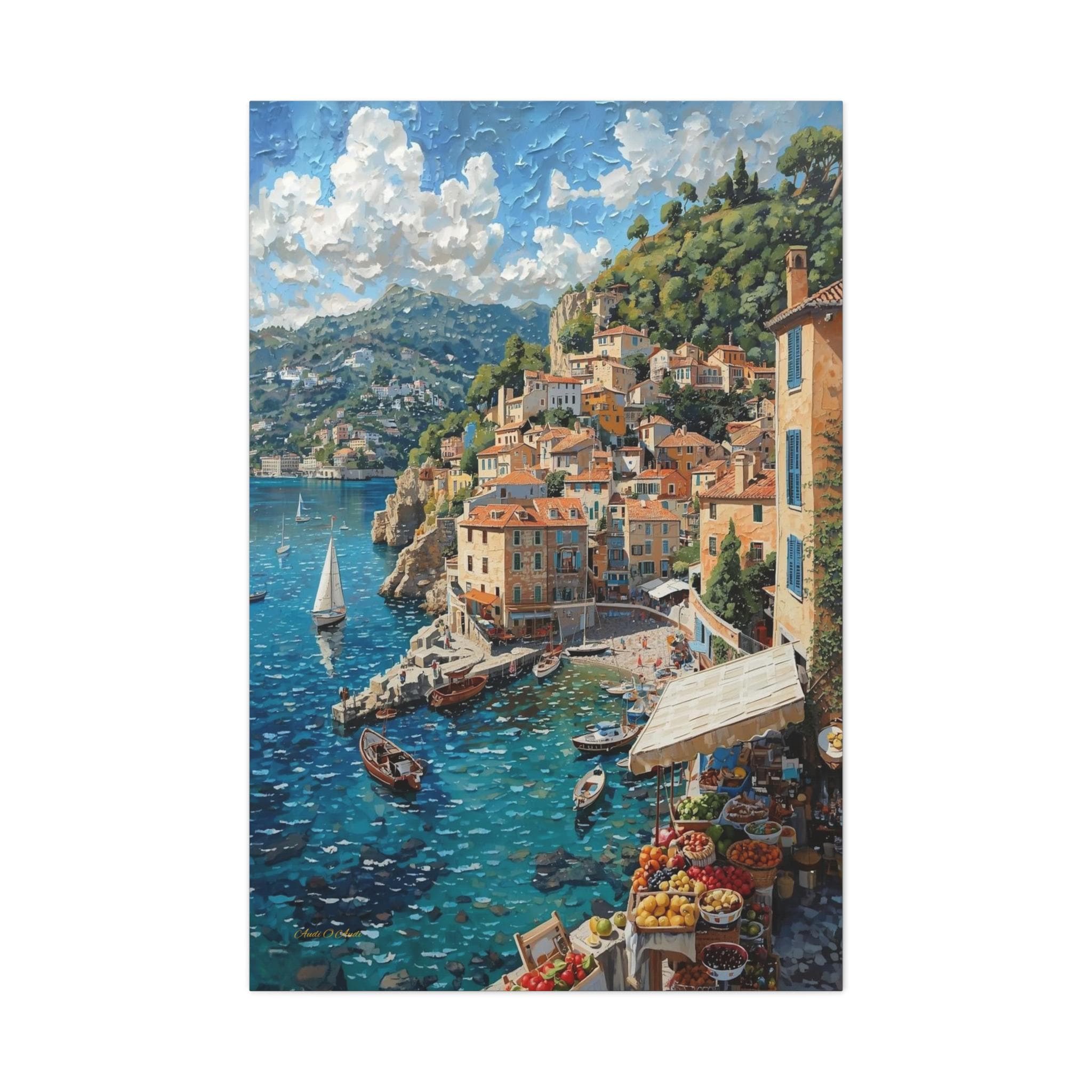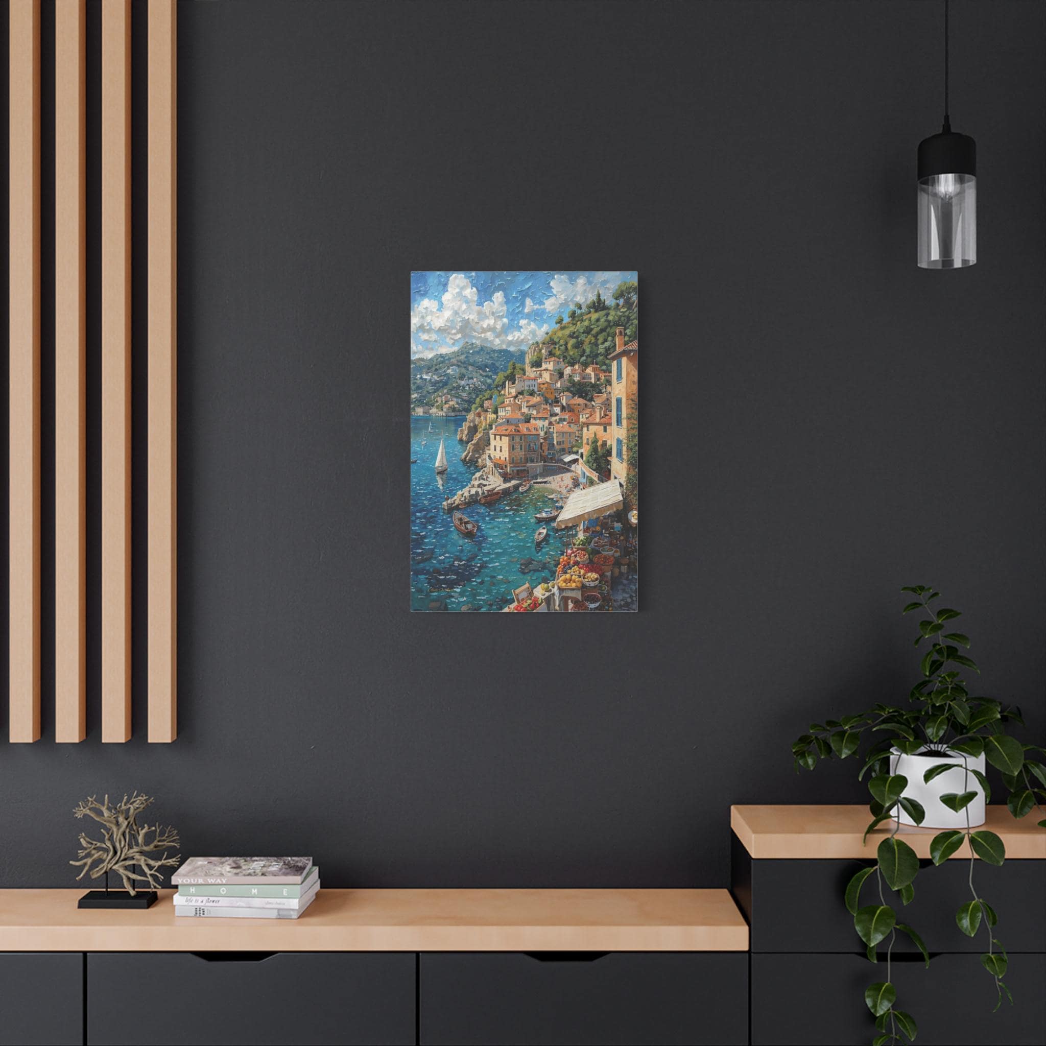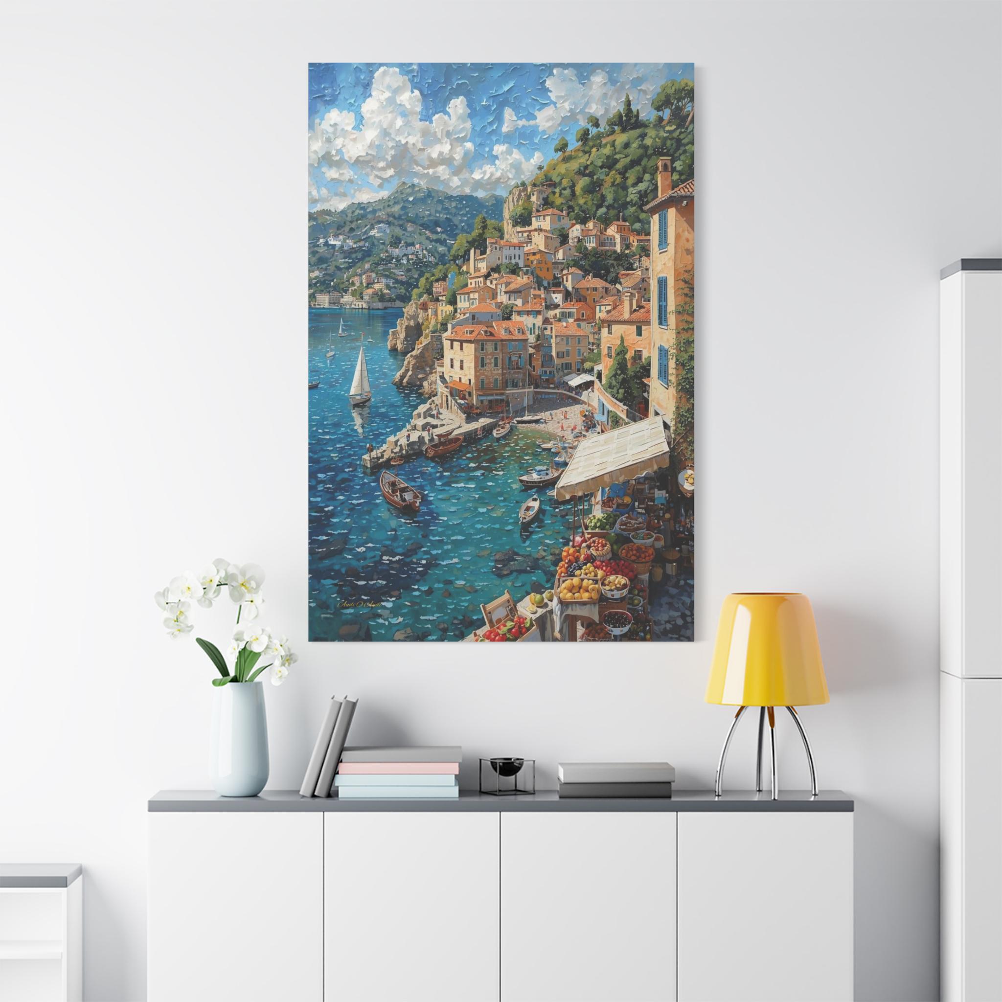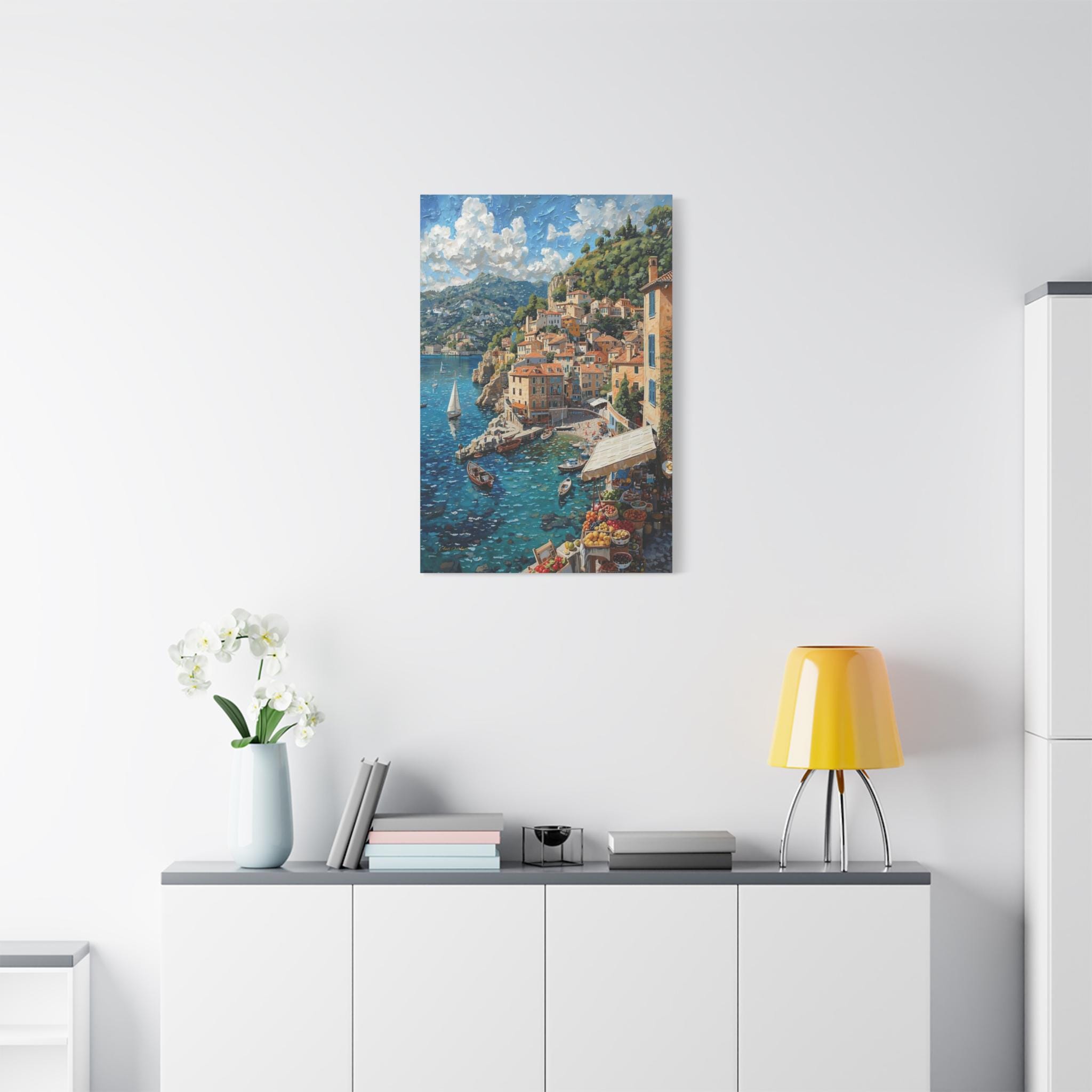 Bring the zest and vibrancy of an Italian summer into your home with this stunning vertical canvas print. Capturing a bustling market day on the coast, this artwork features baskets overflow with fresh lemons and fruits in the foreground, leading your eye out to a harbor filled with bobbing boats and a hillside of colorful village homes.