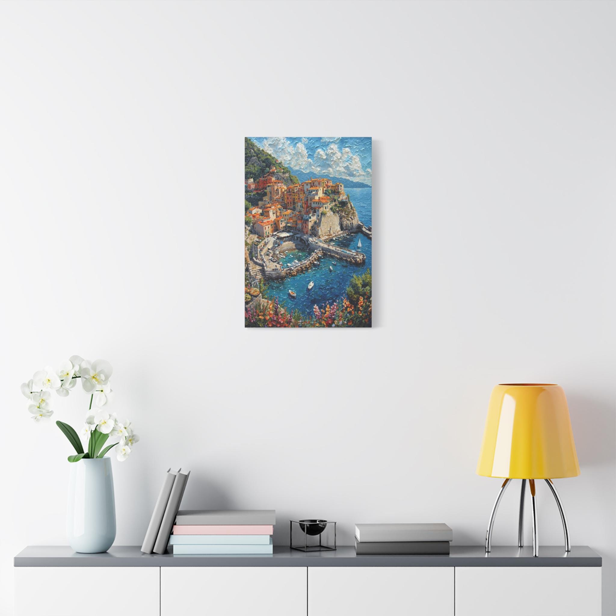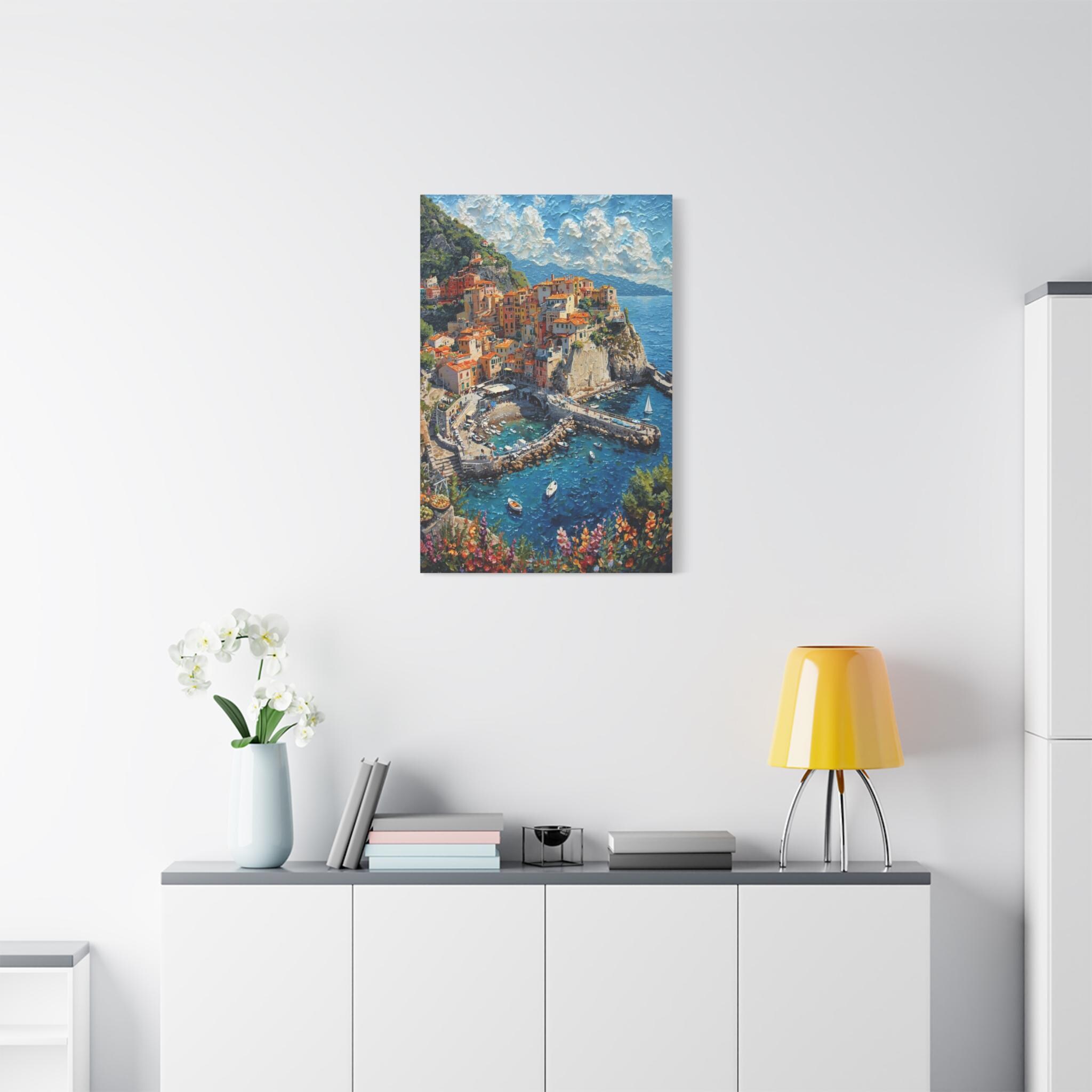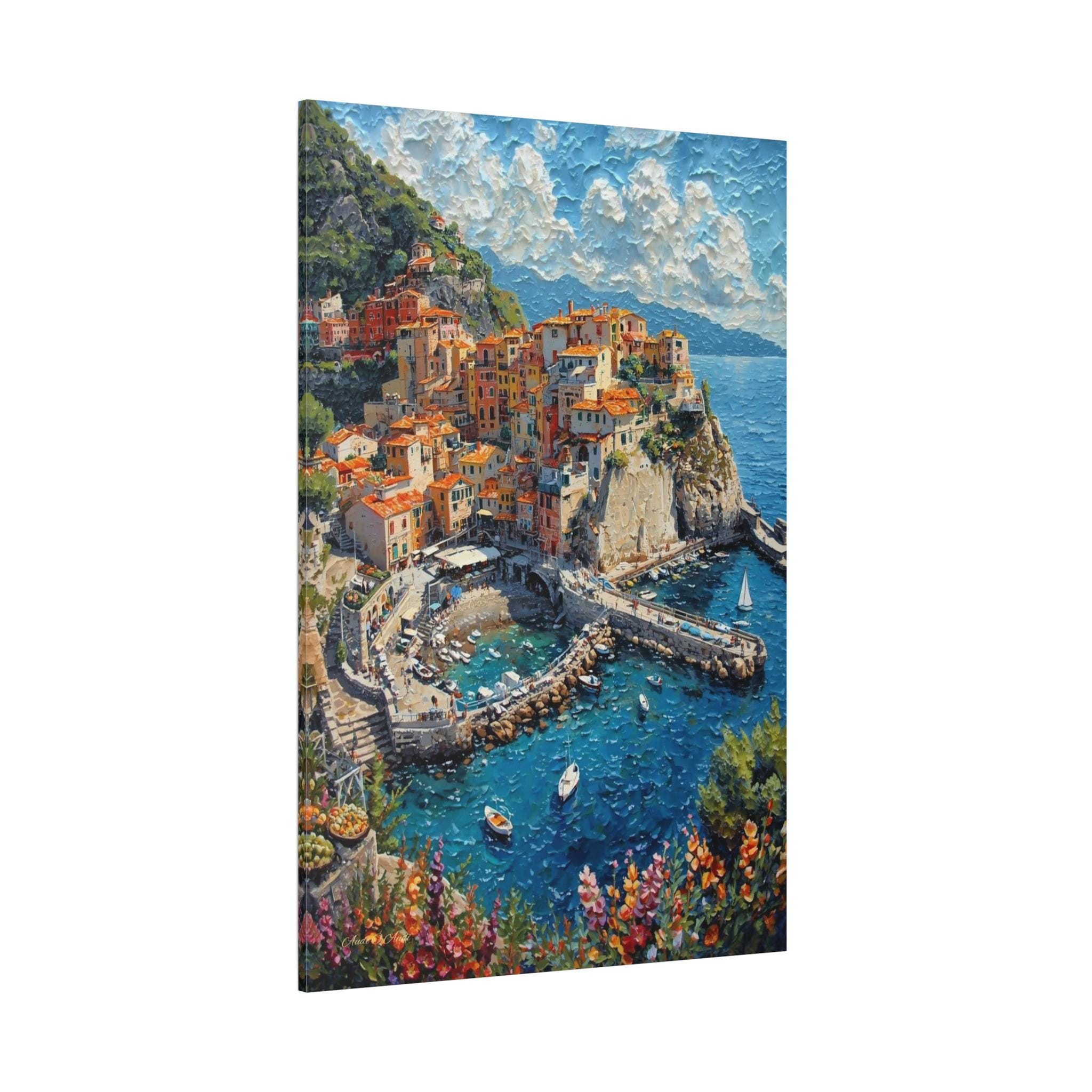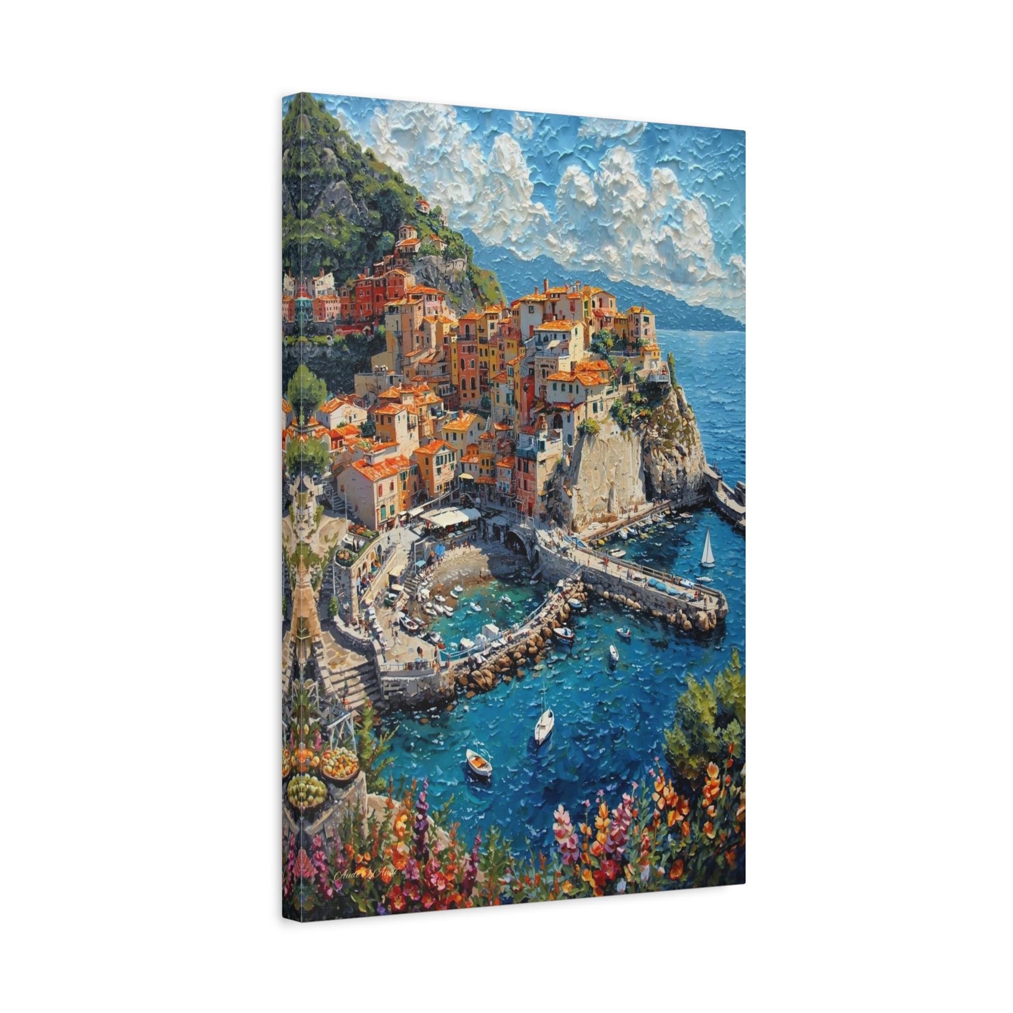 Bring the breathtaking beauty of the Italian Riviera into your home with this panoramic canvas print of a cliffside coastal village. Captured from a high vantage point and framed by vibrant wildflowers, this artwork showcases a cascade of colorful buildings tumbling down the cliffside to a sparkling turquoise harbor below.