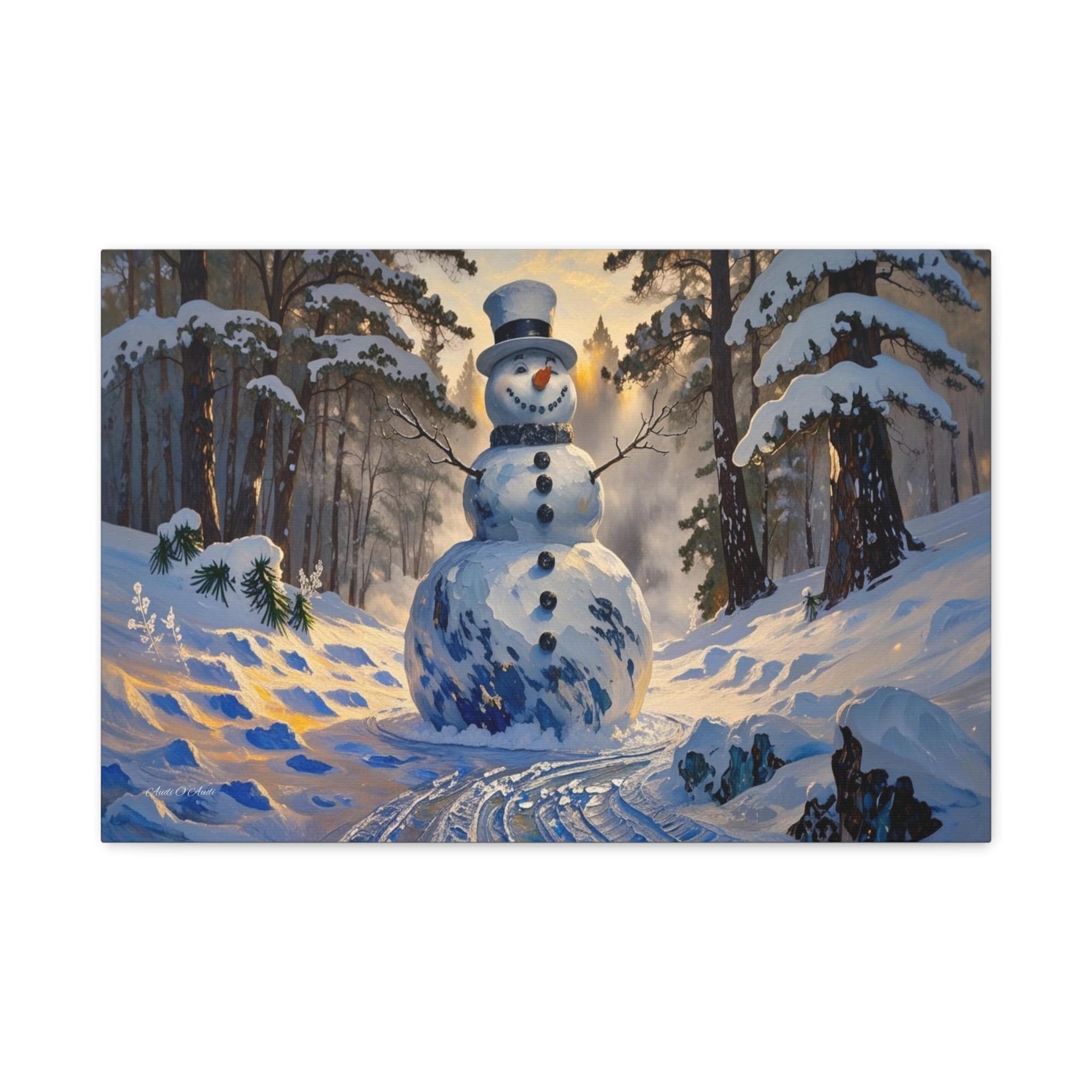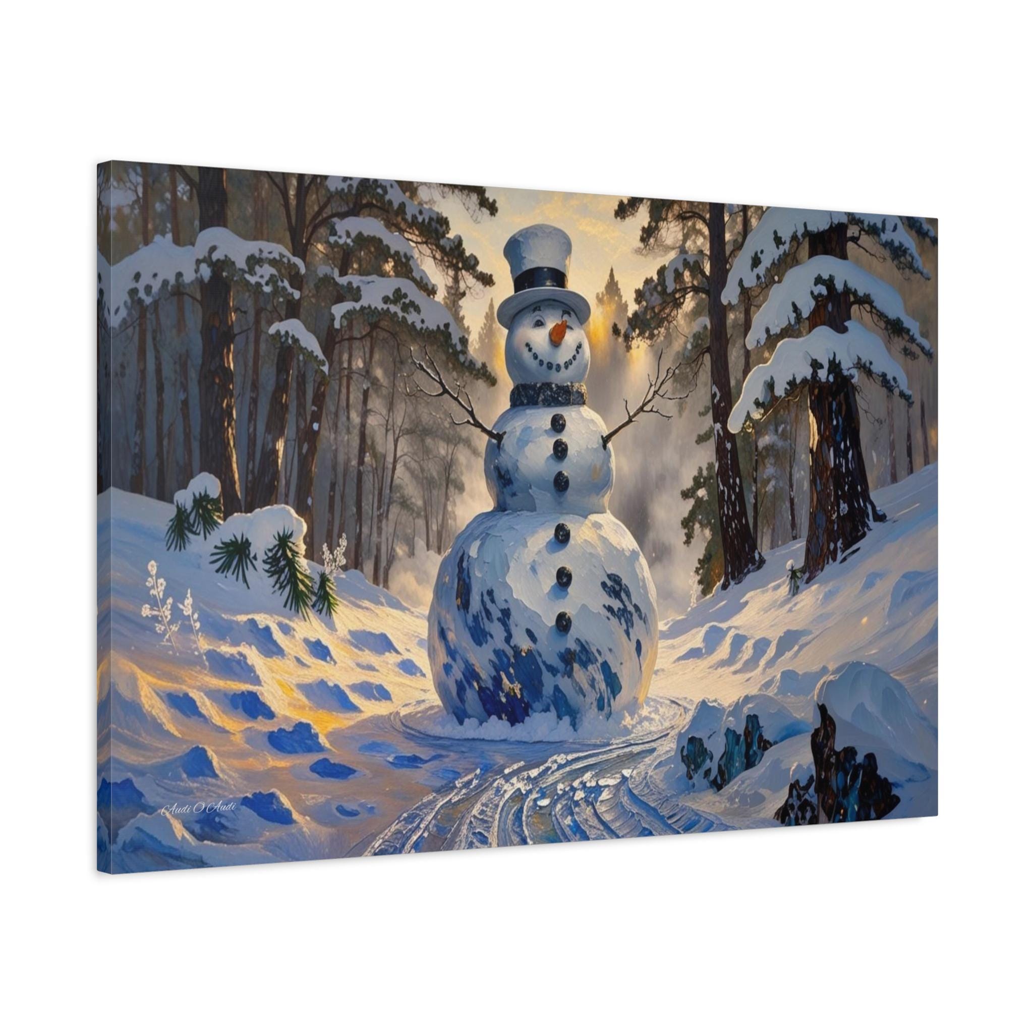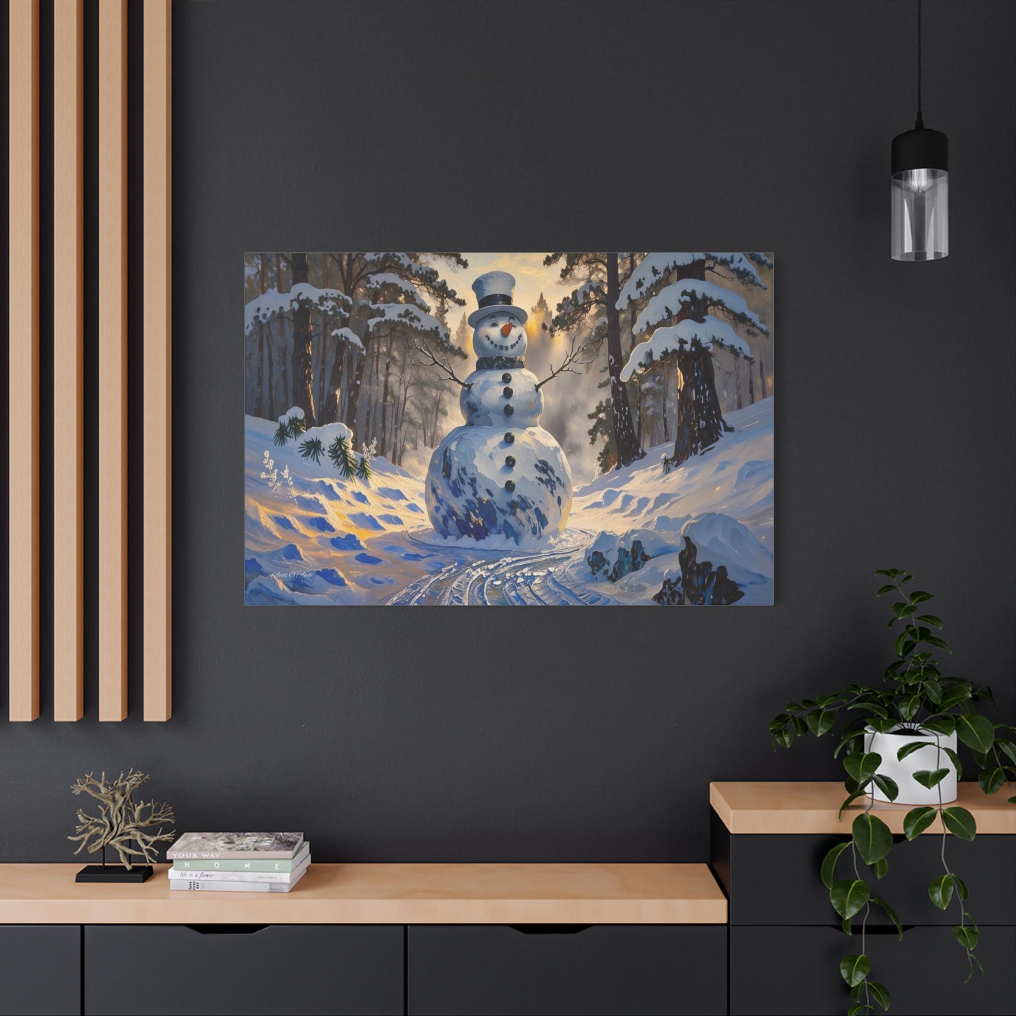 Bring the magic of a winter wonderland into your home with this charming canvas print of a classic snowman. Standing tall in a sun-drenched snowy forest, this cheerful figure features a traditional top hat, a carrot nose, and a warm smile that perfectly captures the joy of the season.
