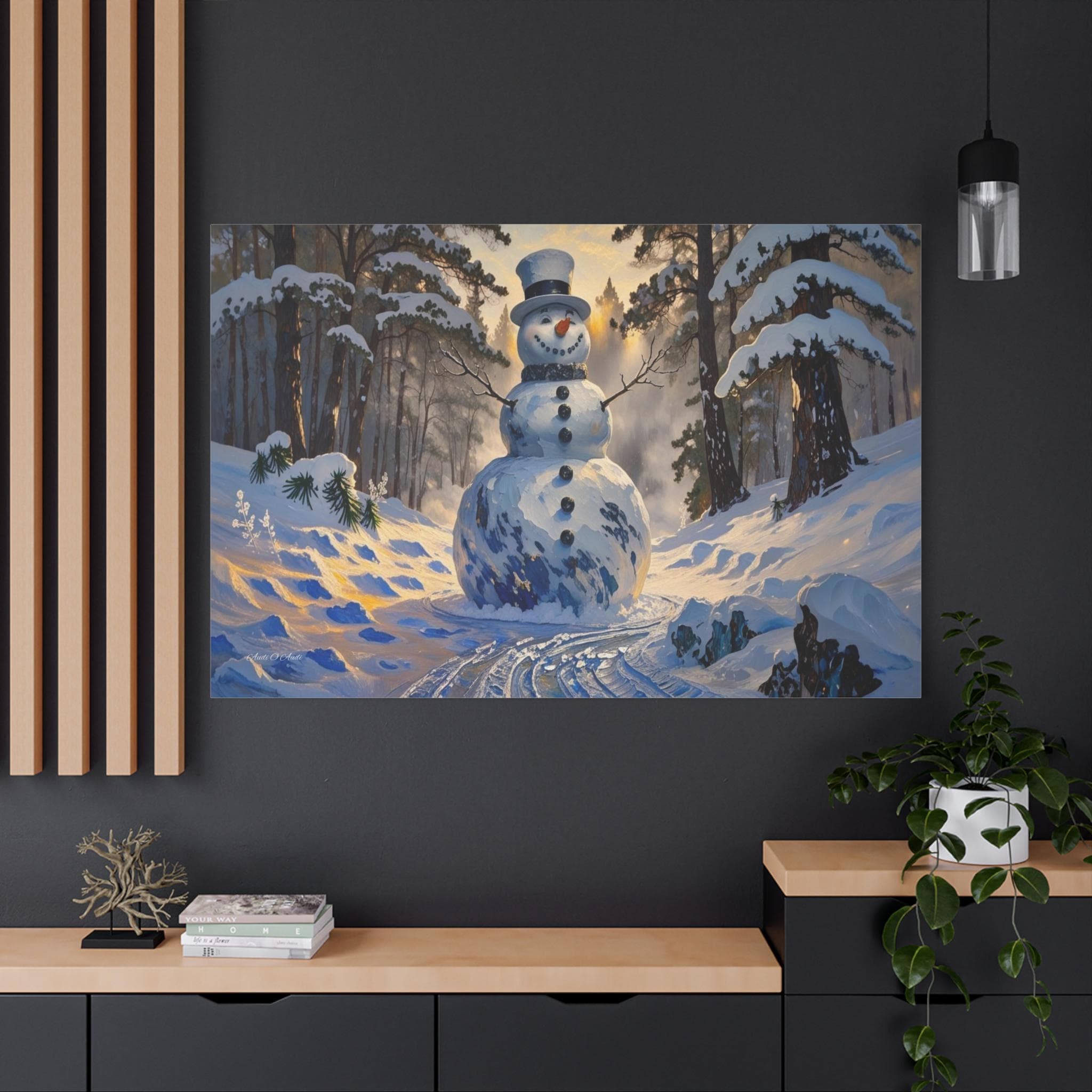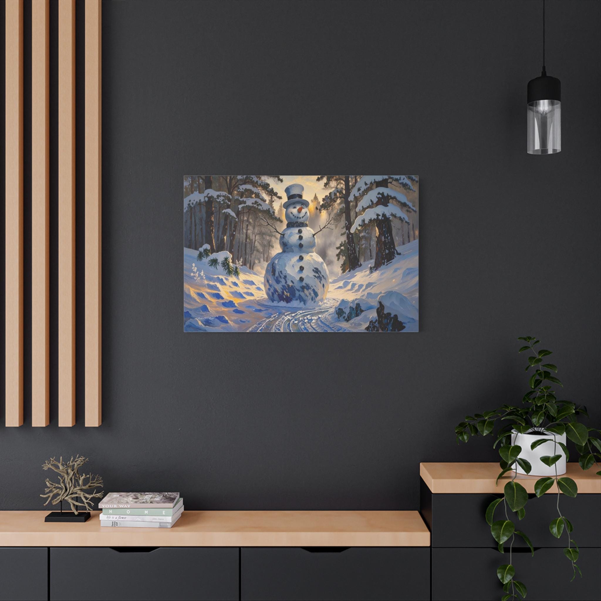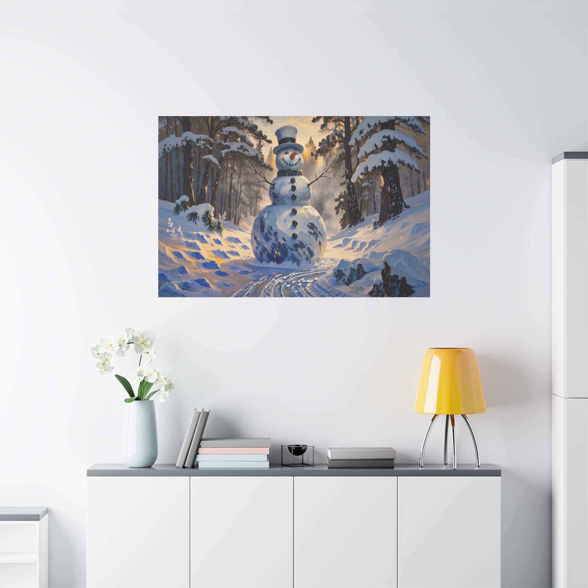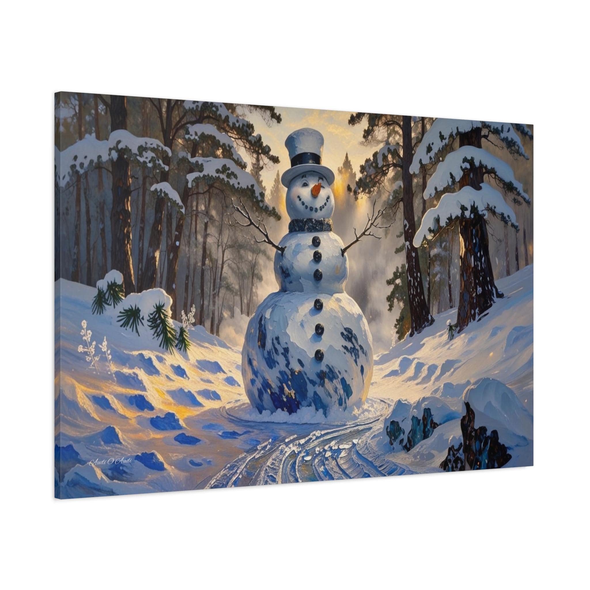 Bring the magic of a winter wonderland into your home with this charming canvas print of a classic snowman. Standing tall in a sun-drenched snowy forest, this cheerful figure features a traditional top hat, a carrot nose, and a warm smile that perfectly captures the joy of the season.