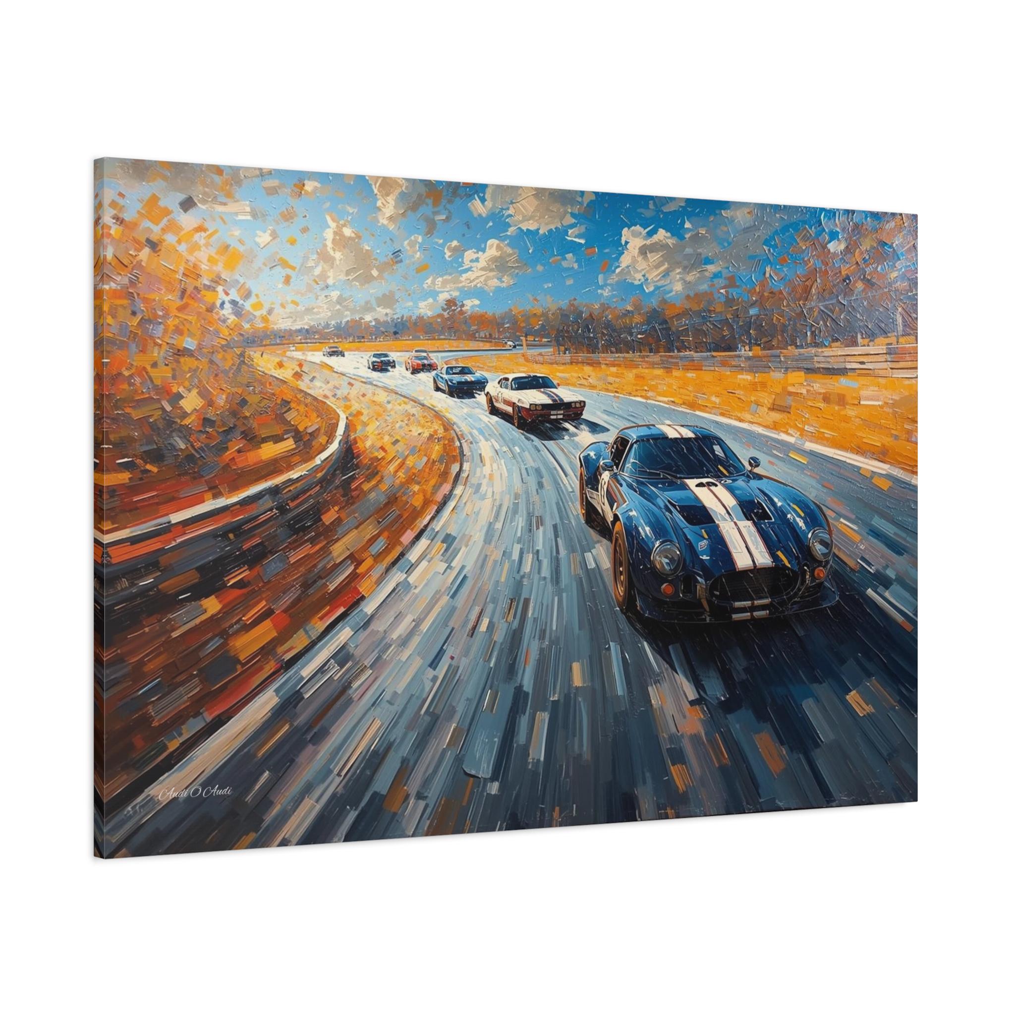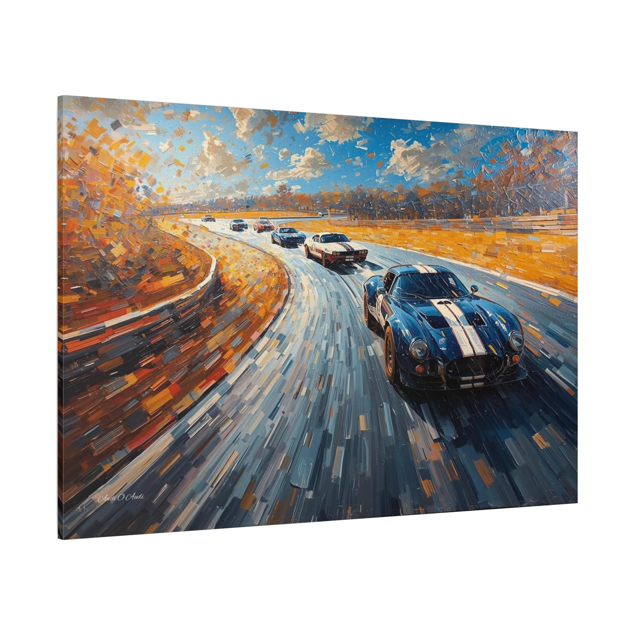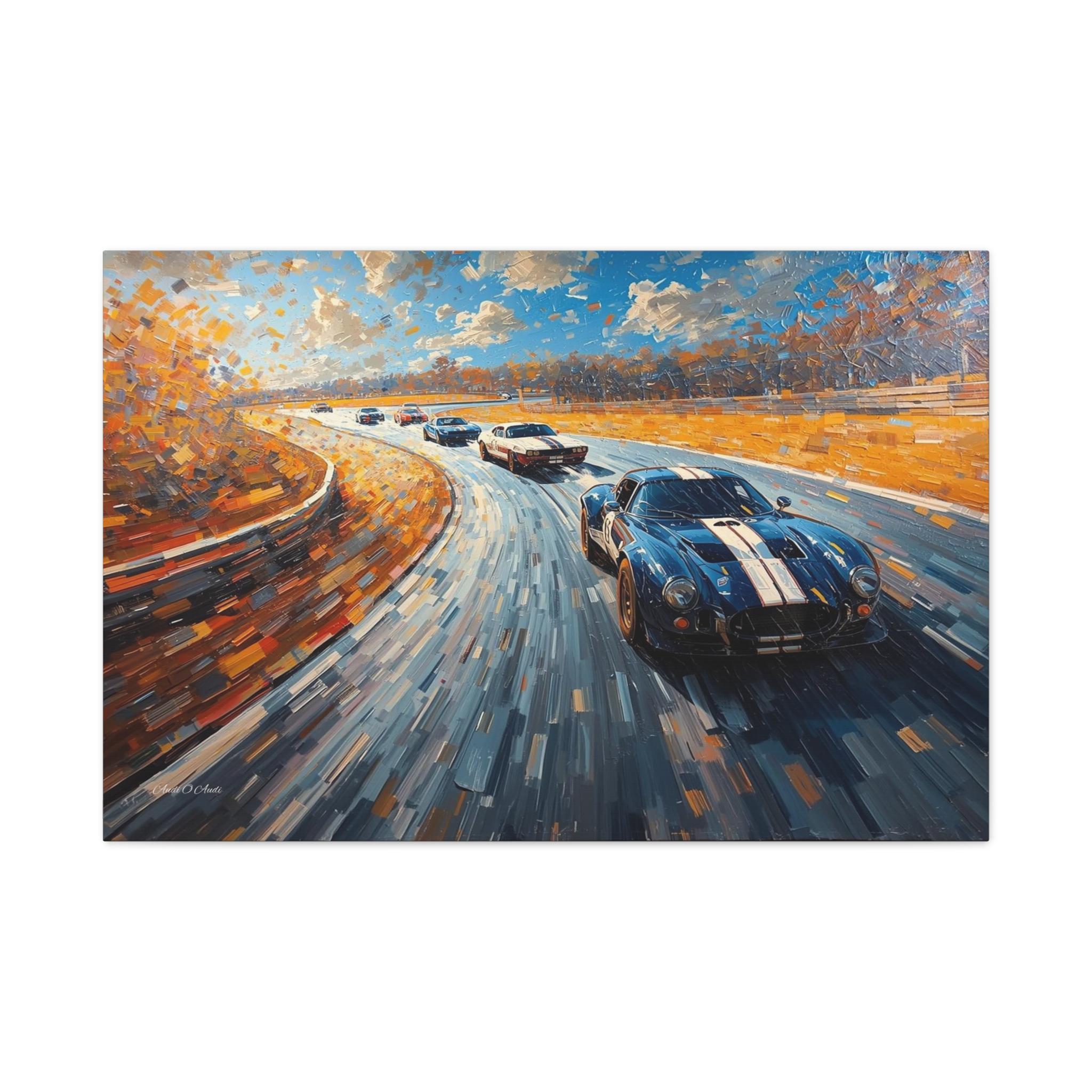 Relive the golden age of motorsport with this adrenaline-pumping canvas print of classic race cars. Leading the pack is an iconic blue vintage roadster with white racing stripes, tearing around a sun-drenched curve in a blur of speed and color.