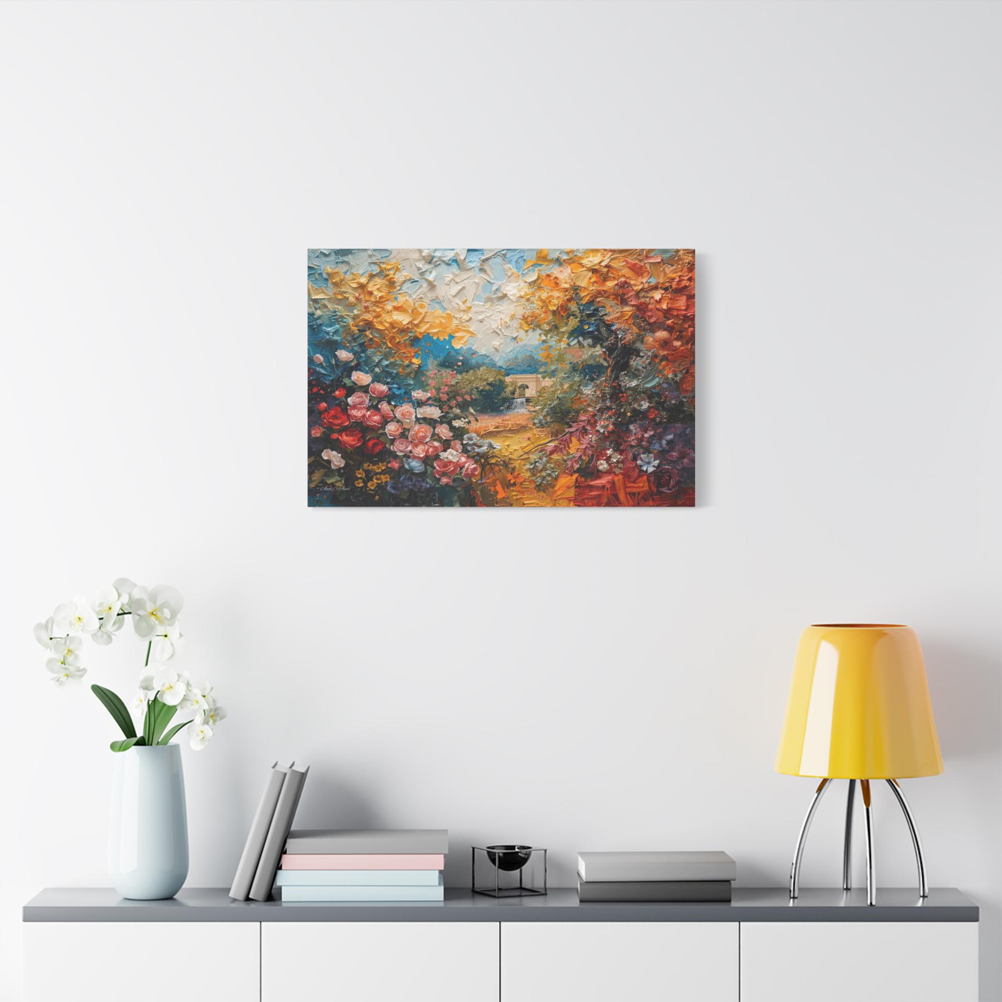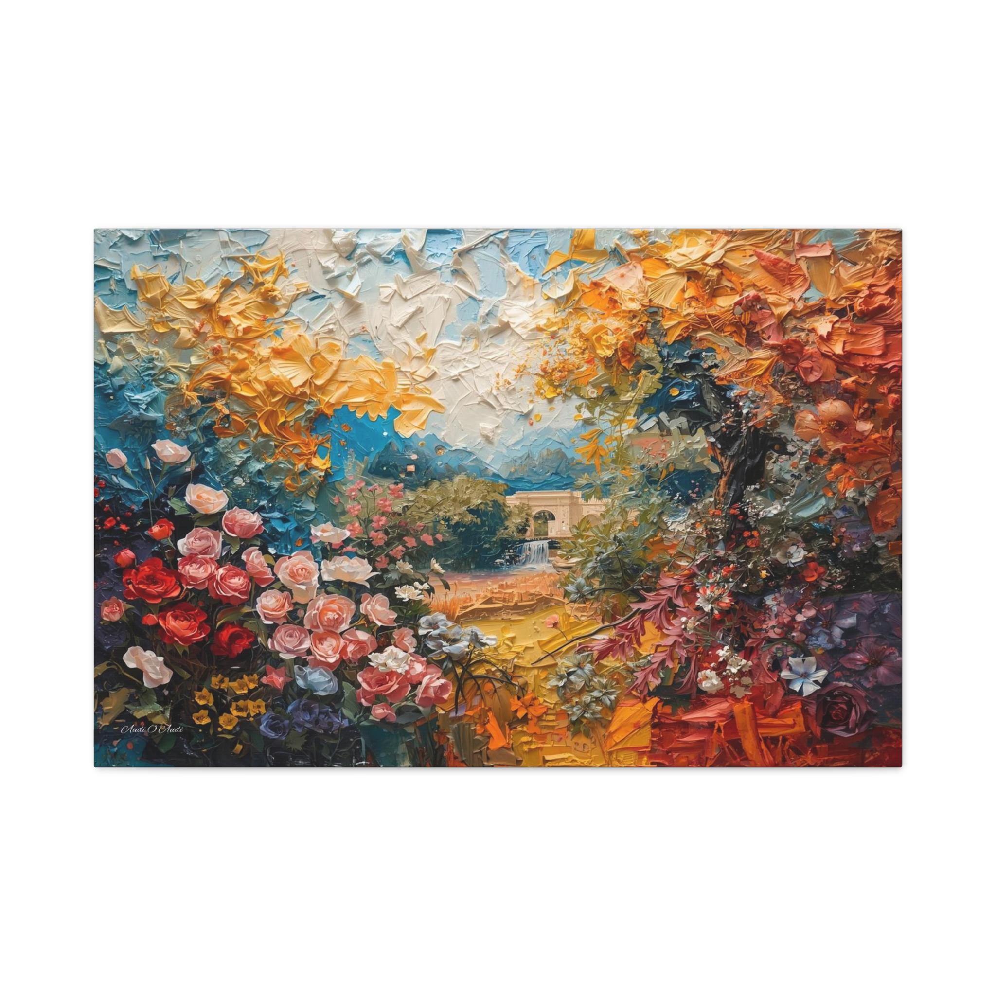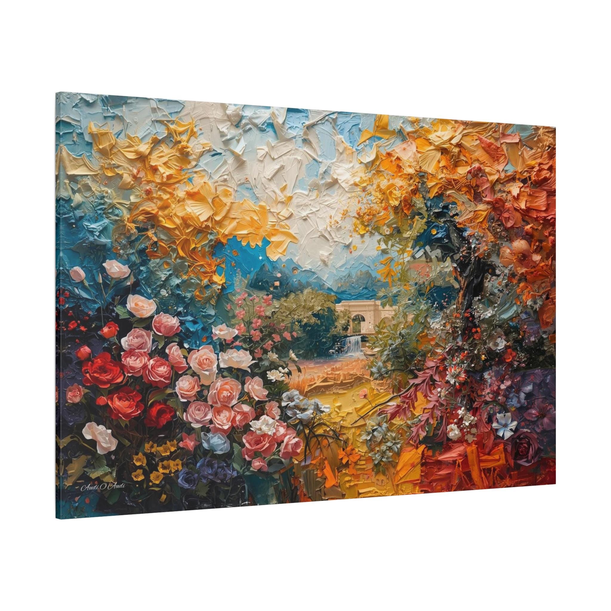 Step into a vibrant world of color and imagination with this breathtaking abstract landscape canvas print. This dreamlike scene features an explosion of blooming flowers in rich reds and pinks, transitioning into a canopy of golden yellow foliage and a mysterious, distant stone archway over water.