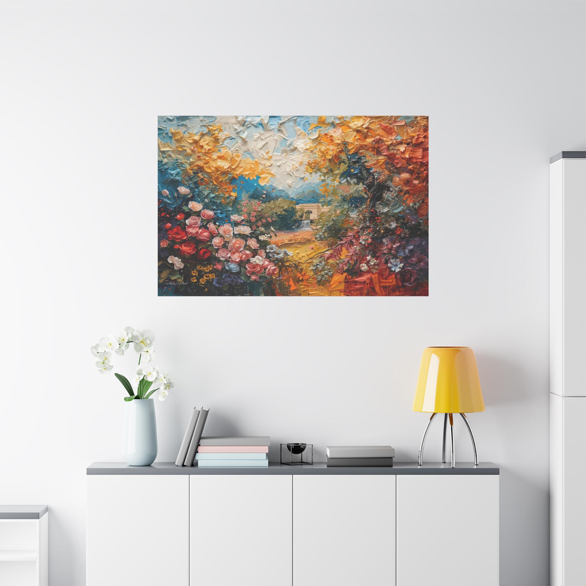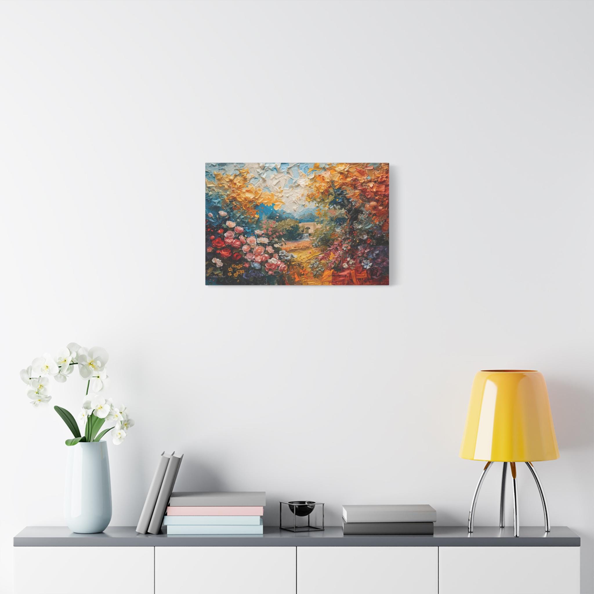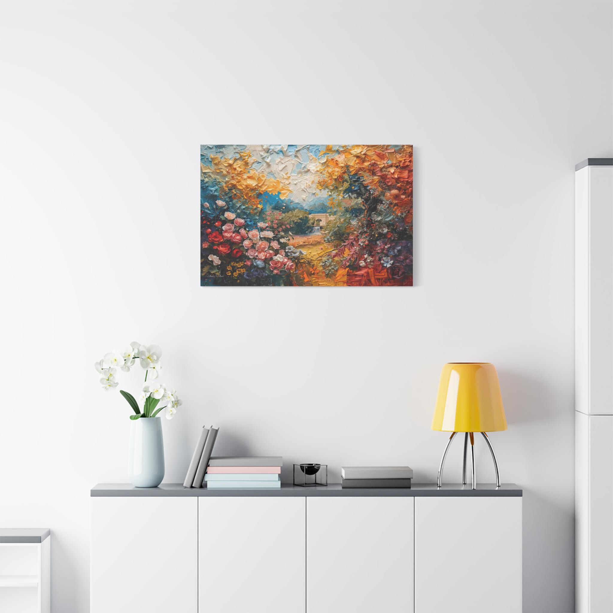 Step into a vibrant world of color and imagination with this breathtaking abstract landscape canvas print. This dreamlike scene features an explosion of blooming flowers in rich reds and pinks, transitioning into a canopy of golden yellow foliage and a mysterious, distant stone archway over water.