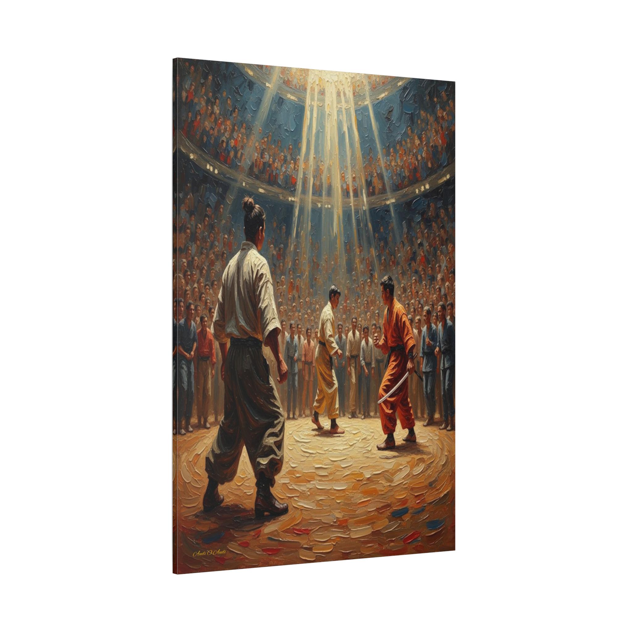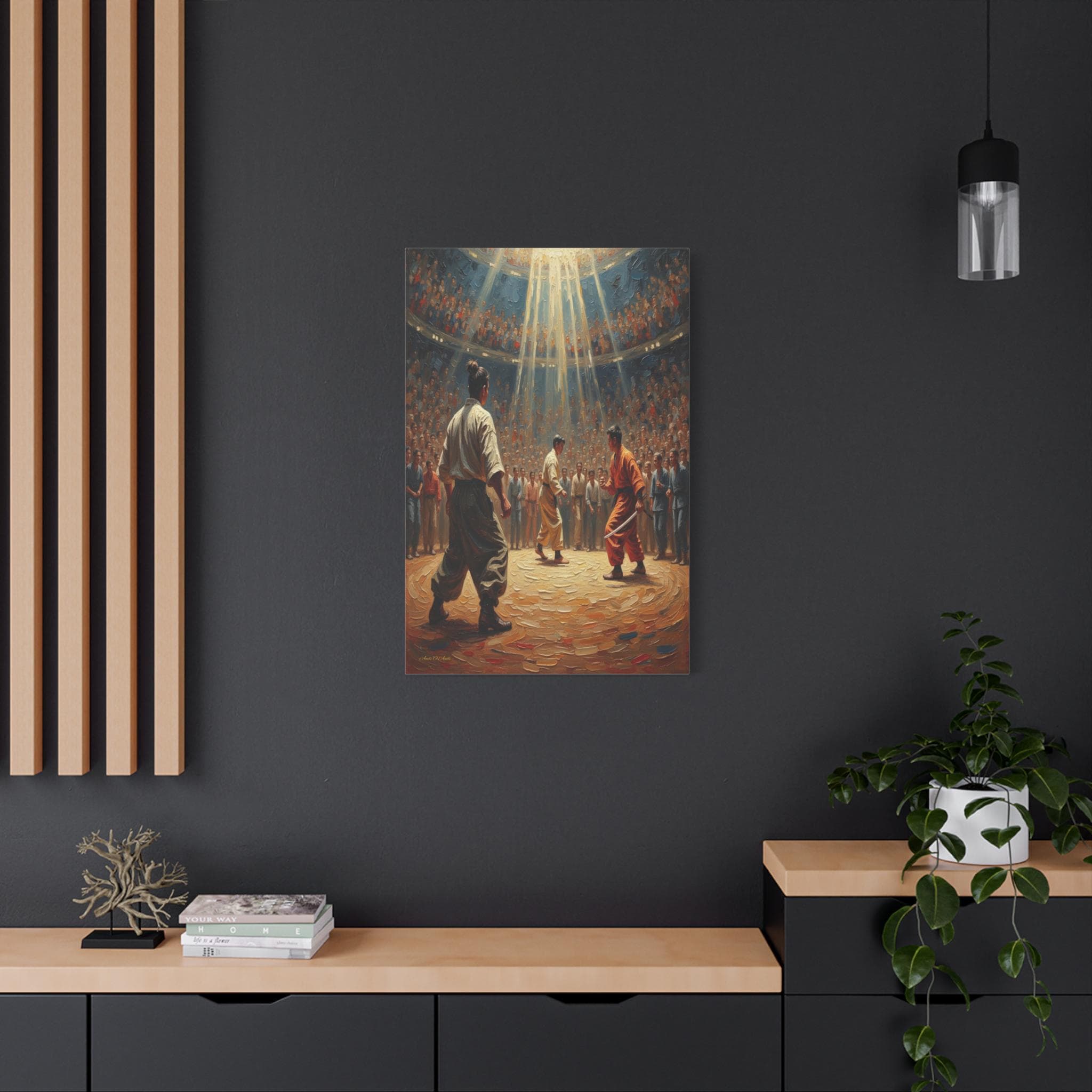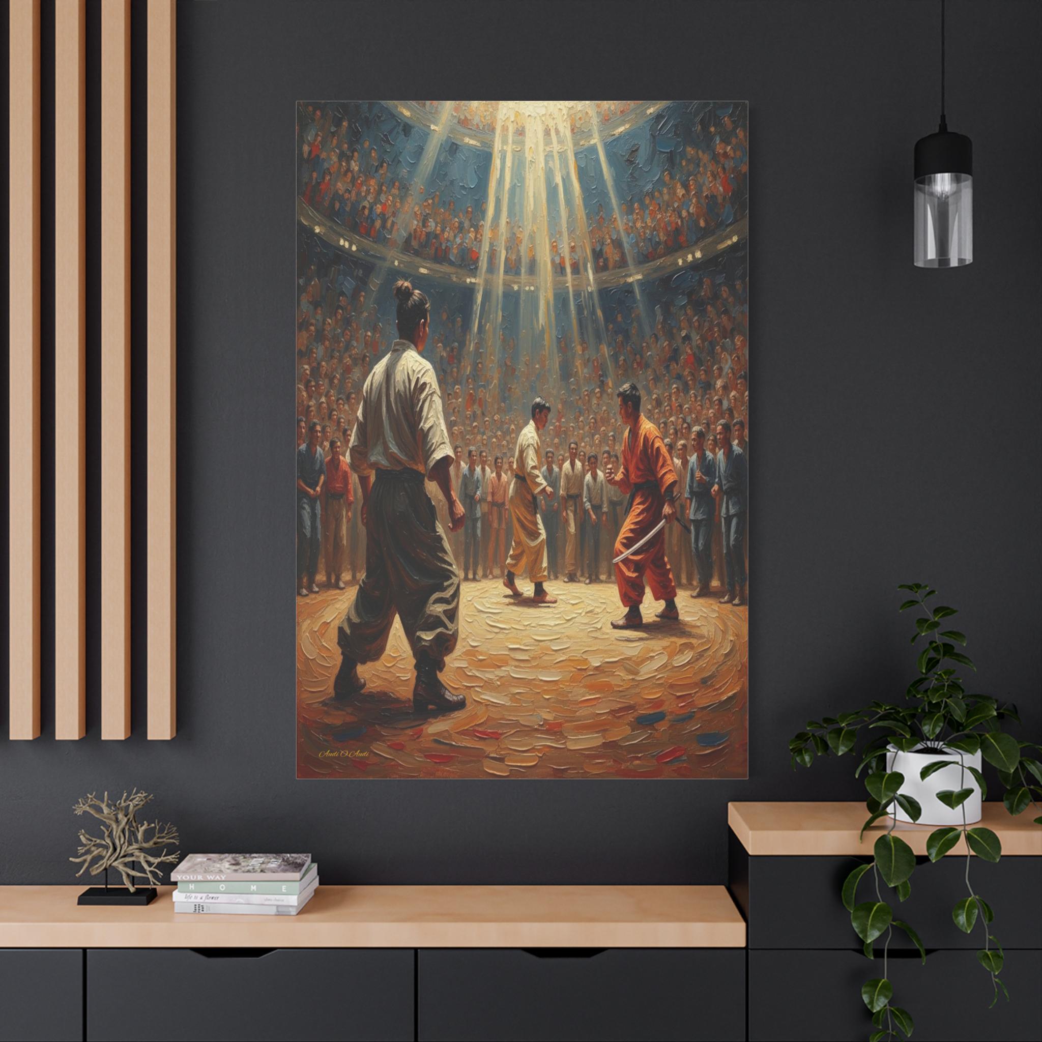 Step into the circle of honor with this intense canvas print of a martial arts duel. This dramatic artwork captures the height of competition, where focused warriors face off under a beam of divine light in a packed arena. The perspective places you right behind the challenger, facing an opponent armed with a blade, creating an immersive storytelling experience.