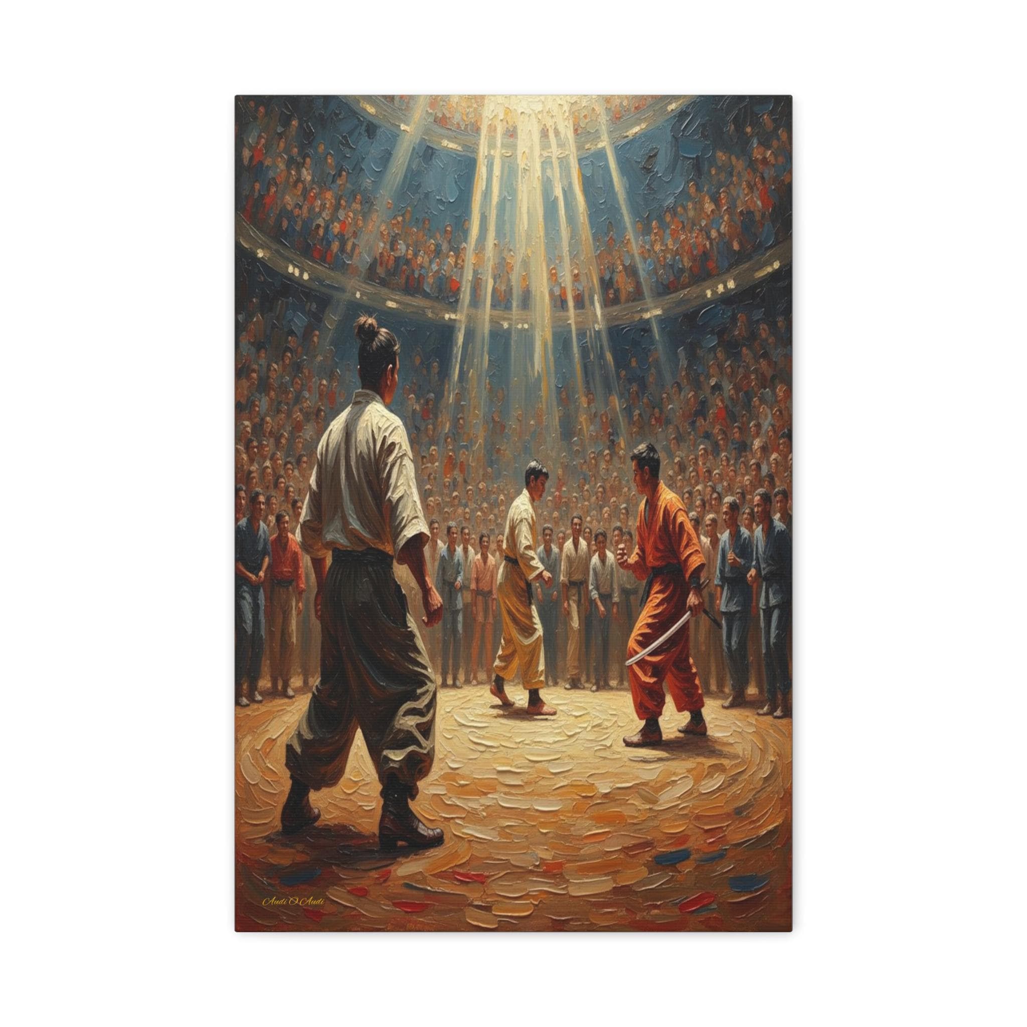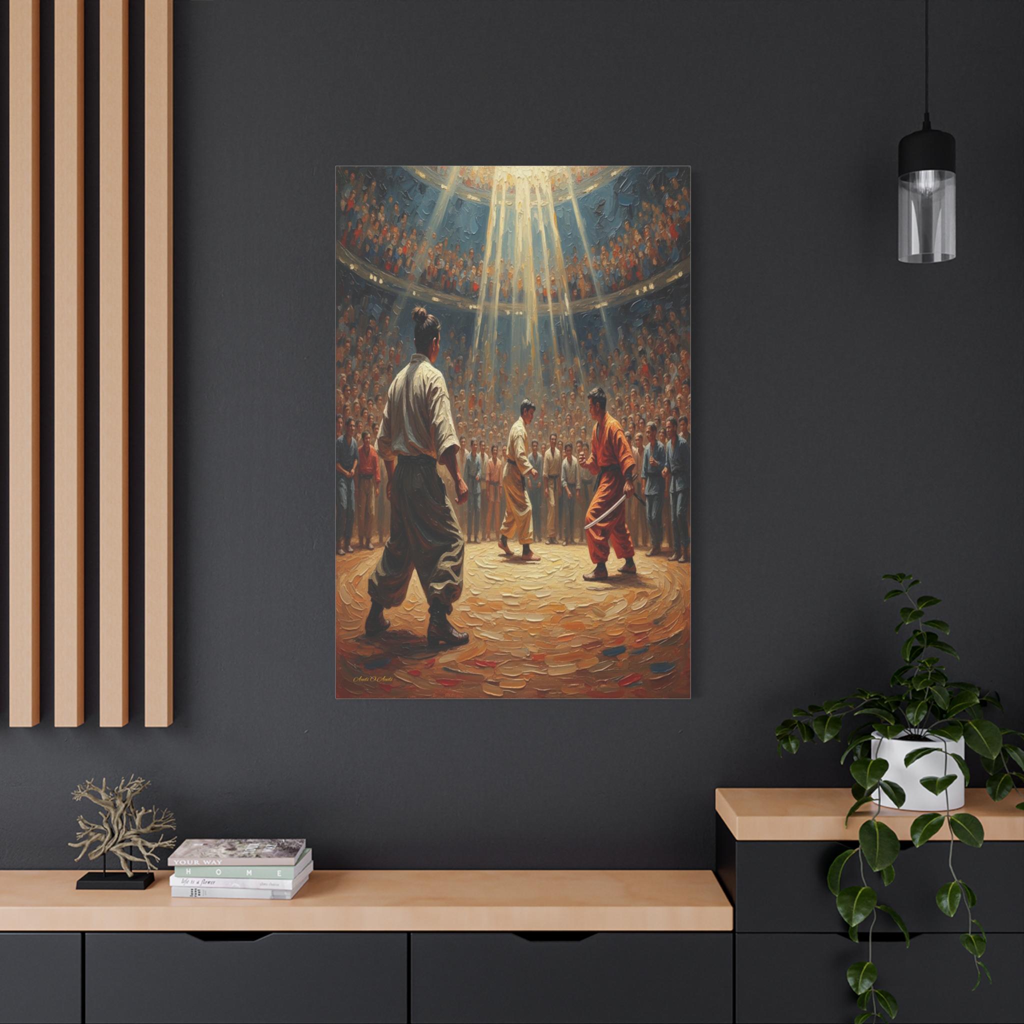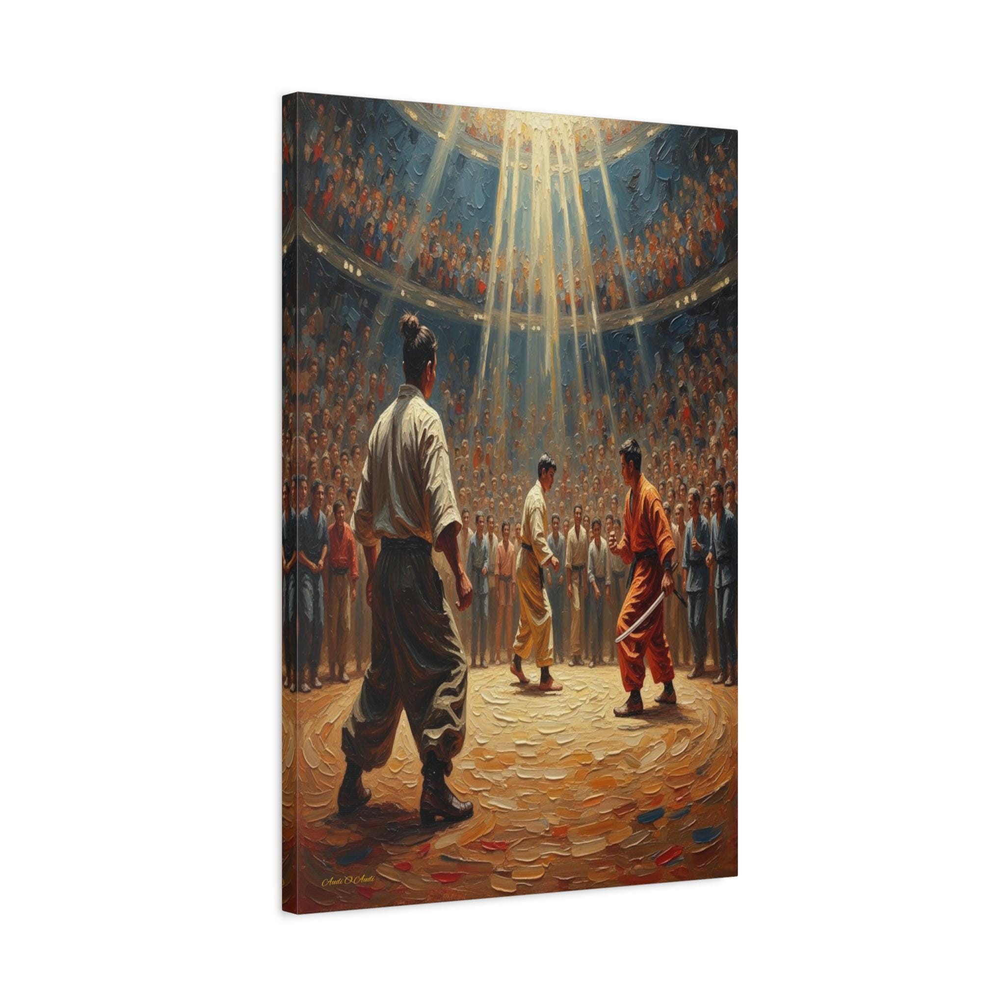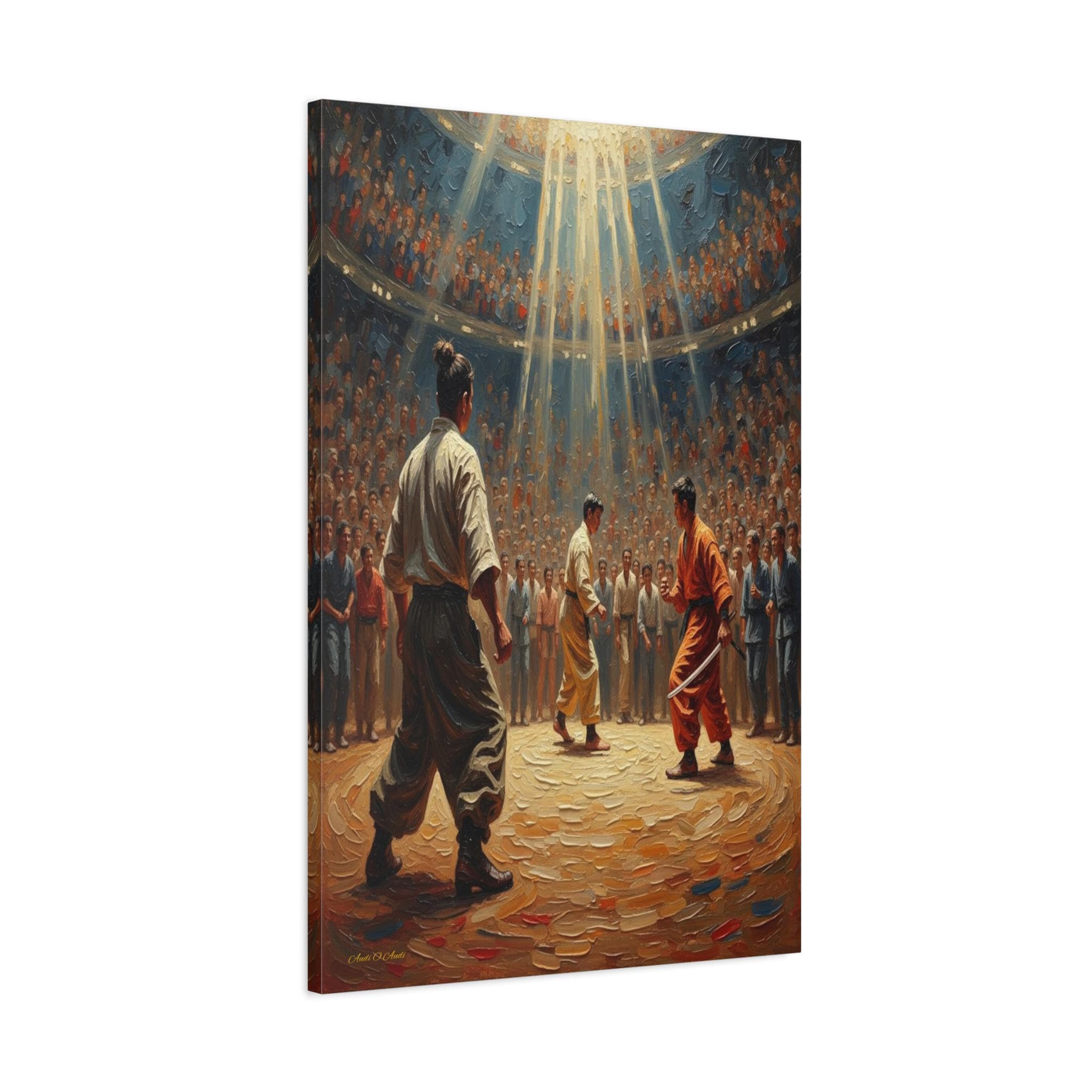 Step into the circle of honor with this intense canvas print of a martial arts duel. This dramatic artwork captures the height of competition, where focused warriors face off under a beam of divine light in a packed arena. The perspective places you right behind the challenger, facing an opponent armed with a blade, creating an immersive storytelling experience.