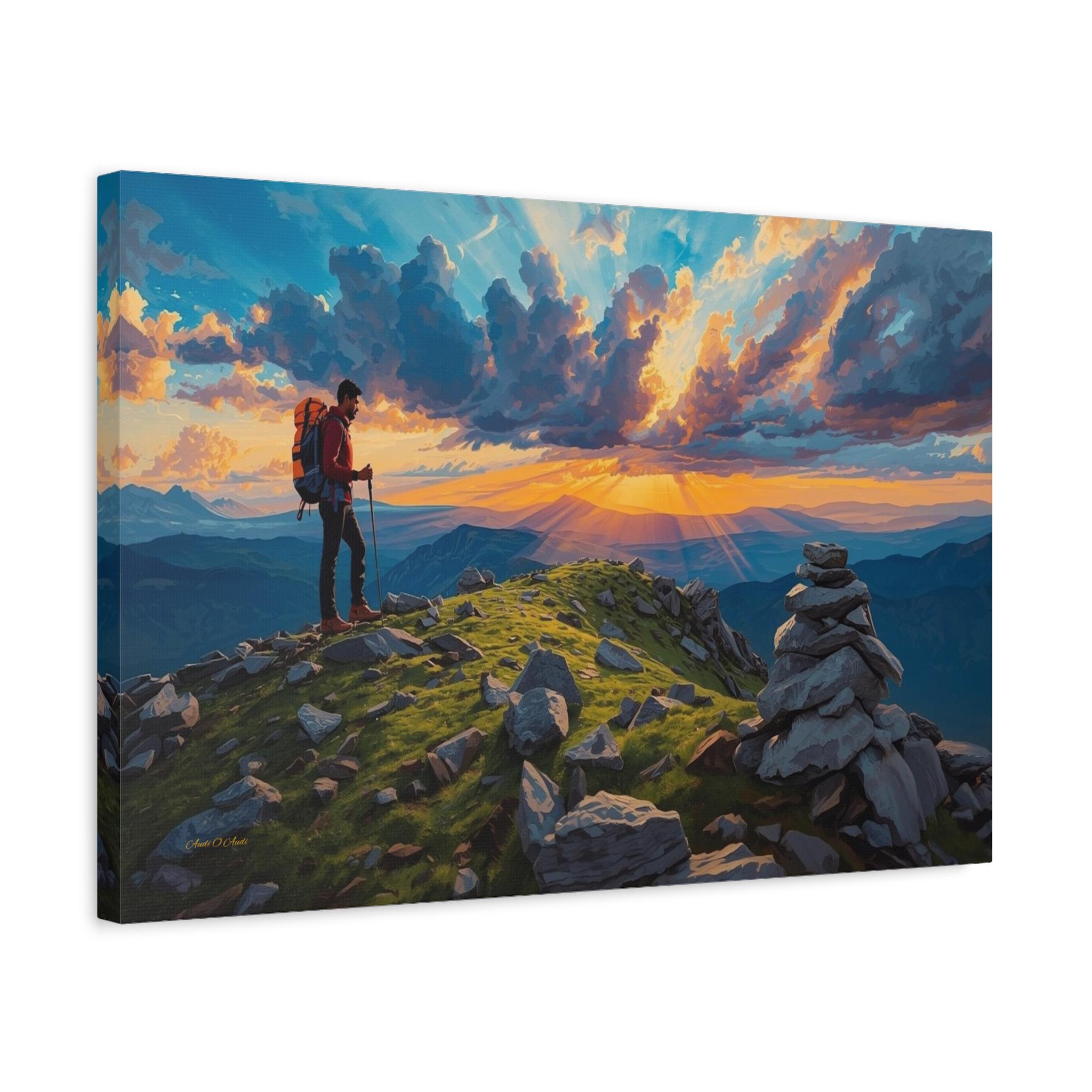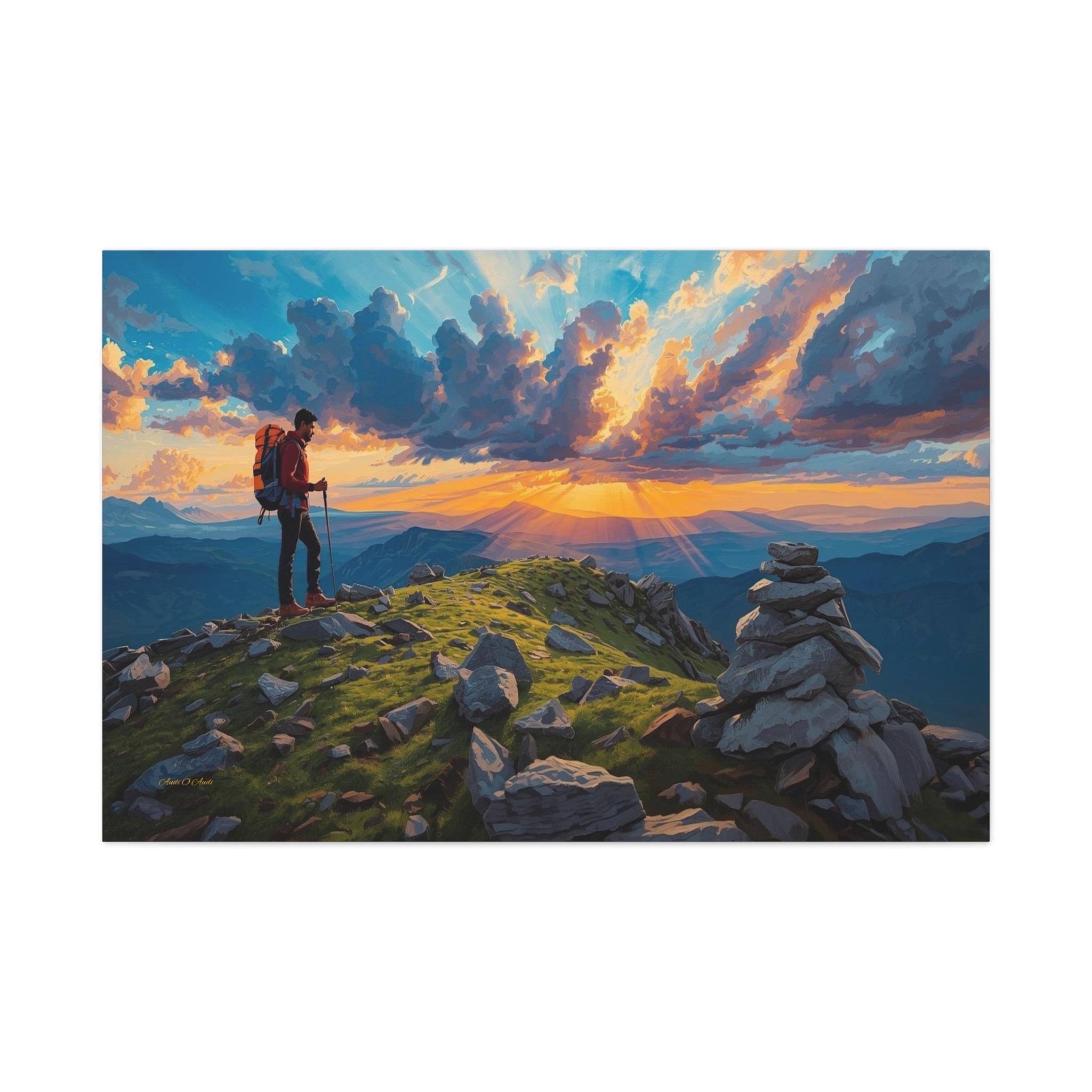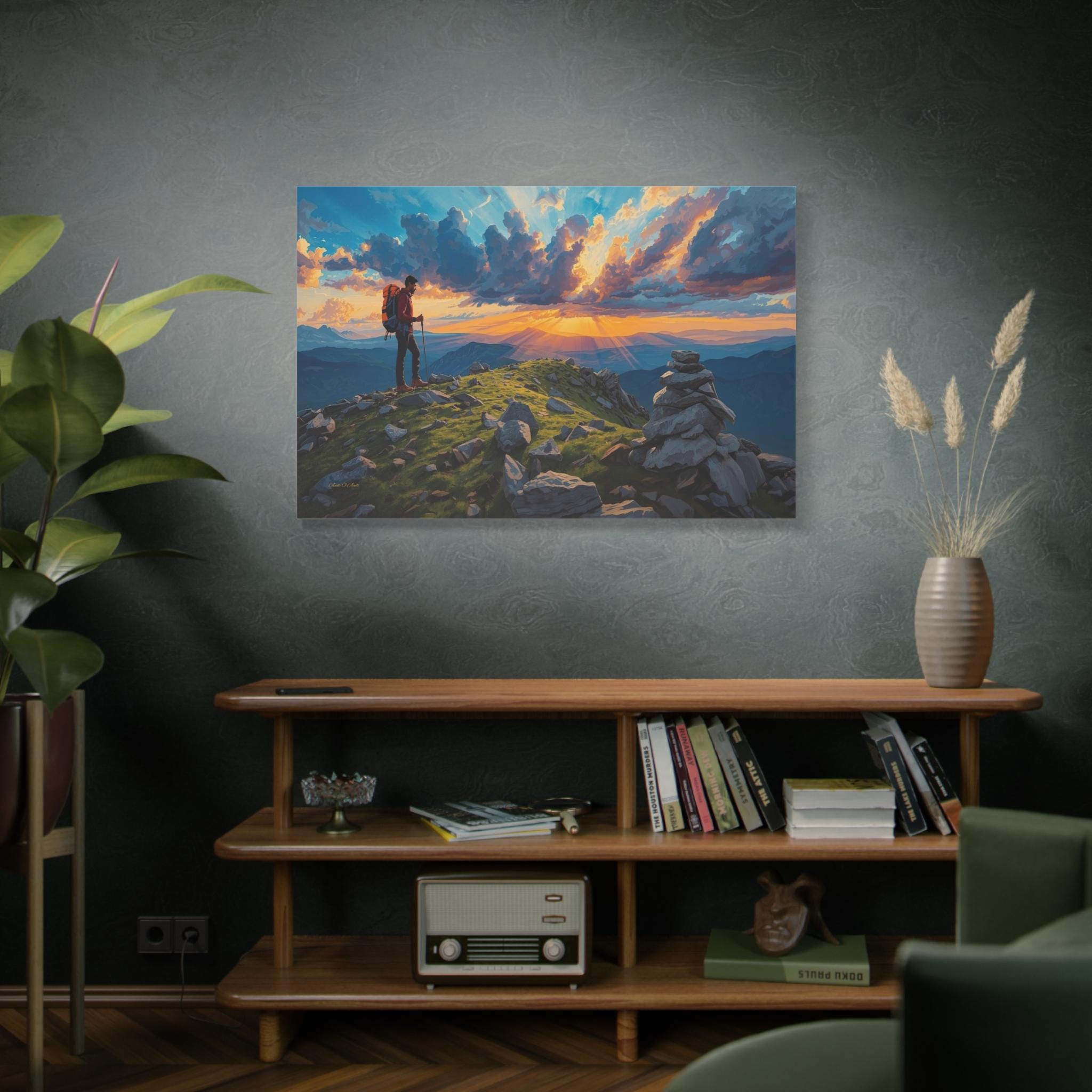 Celebrate the spirit of adventure and the thrill of the summit with this breathtaking canvas print of a hiker reaching the peak. This majestic artwork captures a lone explorer standing on a rocky mountain top, looking out over a vast range of blue peaks as the sun bursts through the clouds in a glorious display of orange and gold.