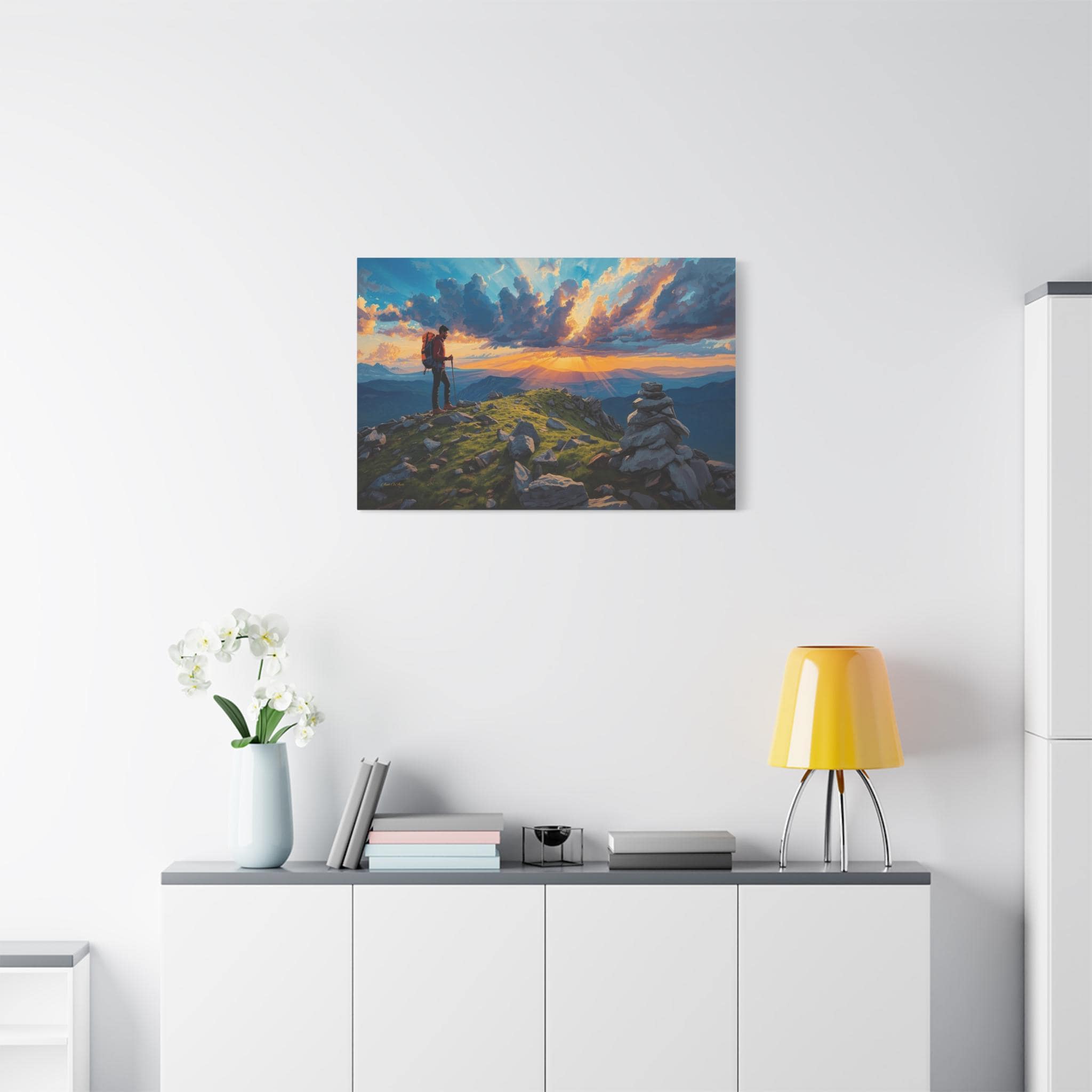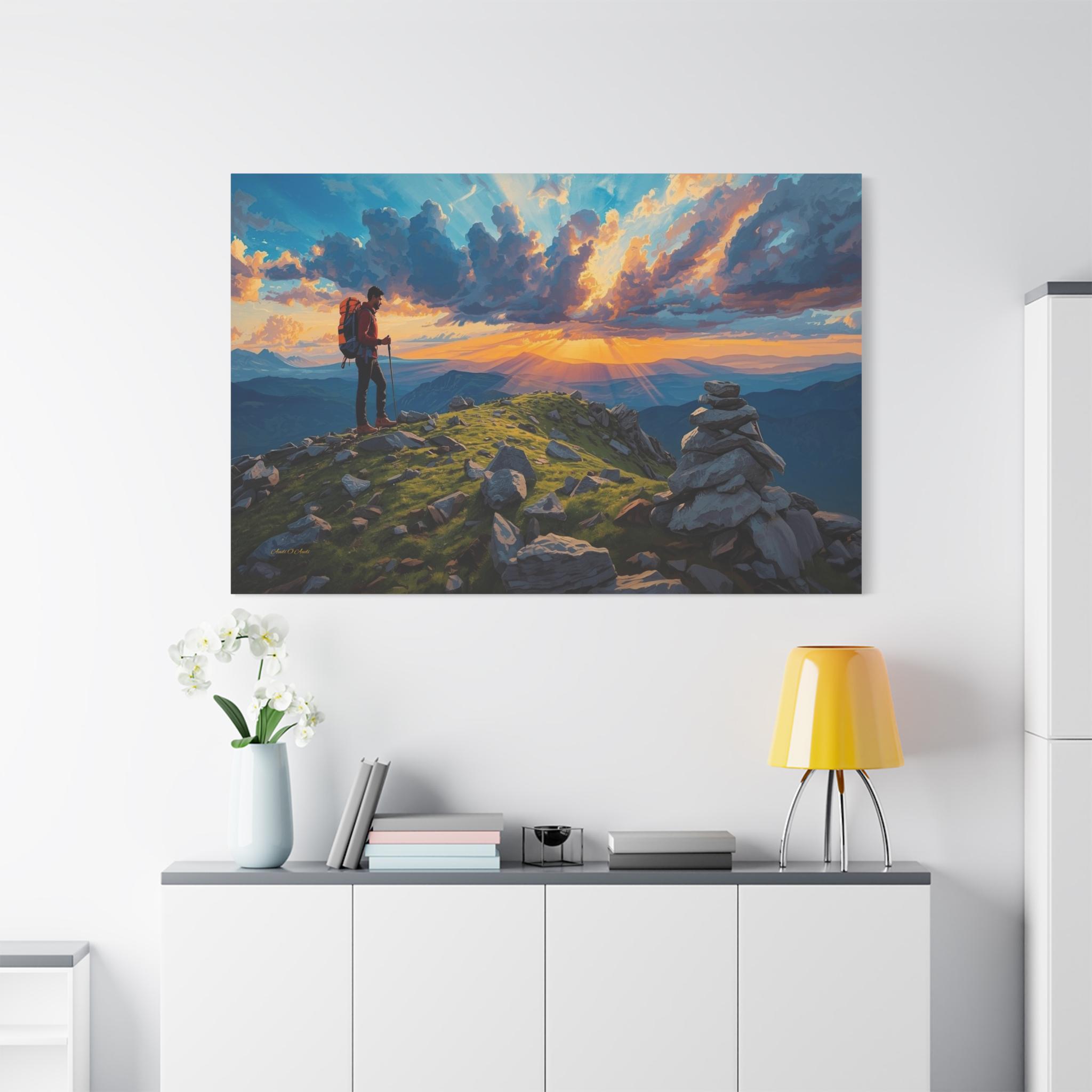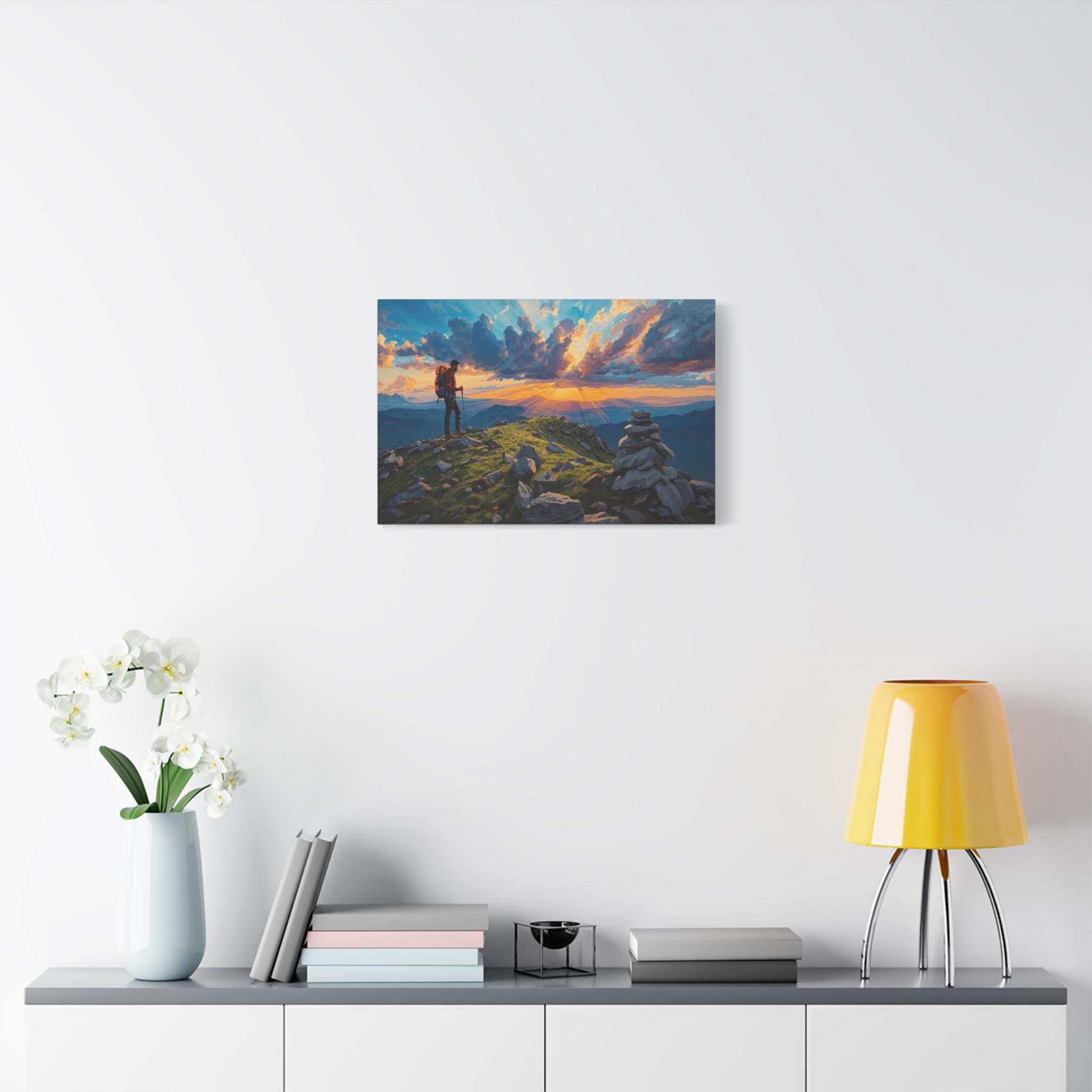 Celebrate the spirit of adventure and the thrill of the summit with this breathtaking canvas print of a hiker reaching the peak. This majestic artwork captures a lone explorer standing on a rocky mountain top, looking out over a vast range of blue peaks as the sun bursts through the clouds in a glorious display of orange and gold.