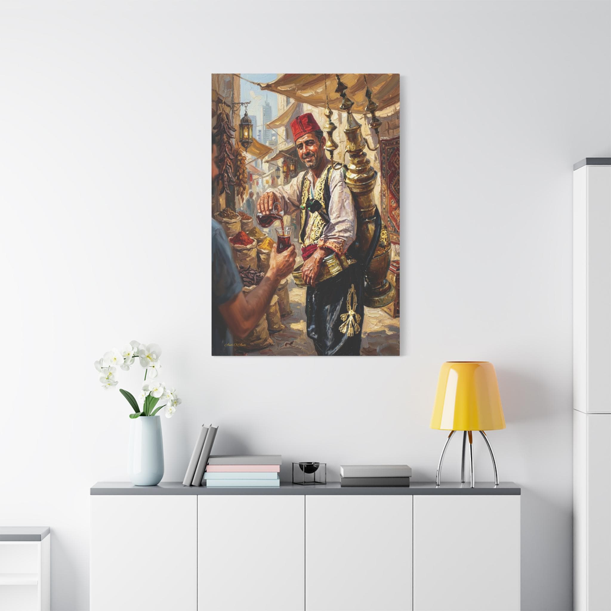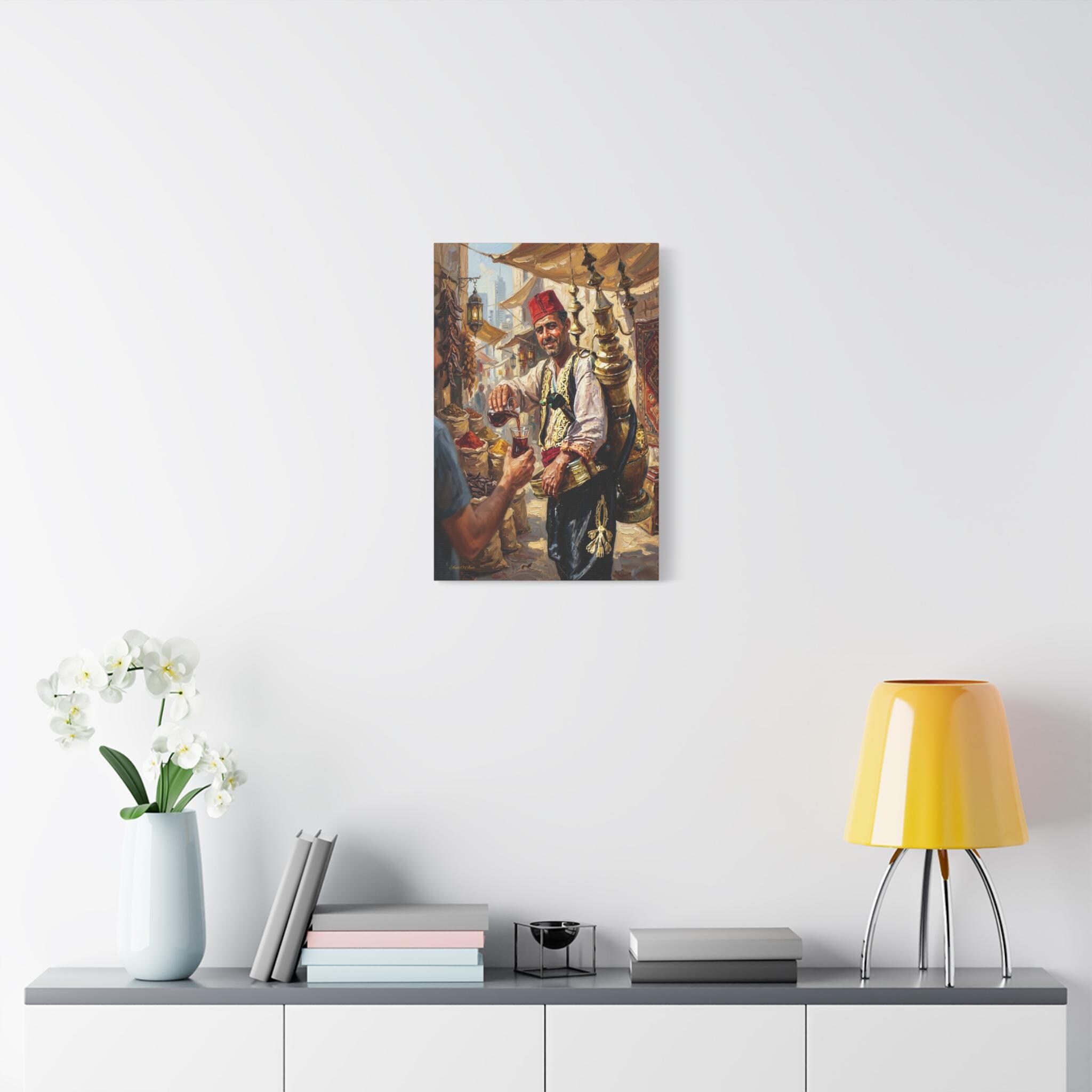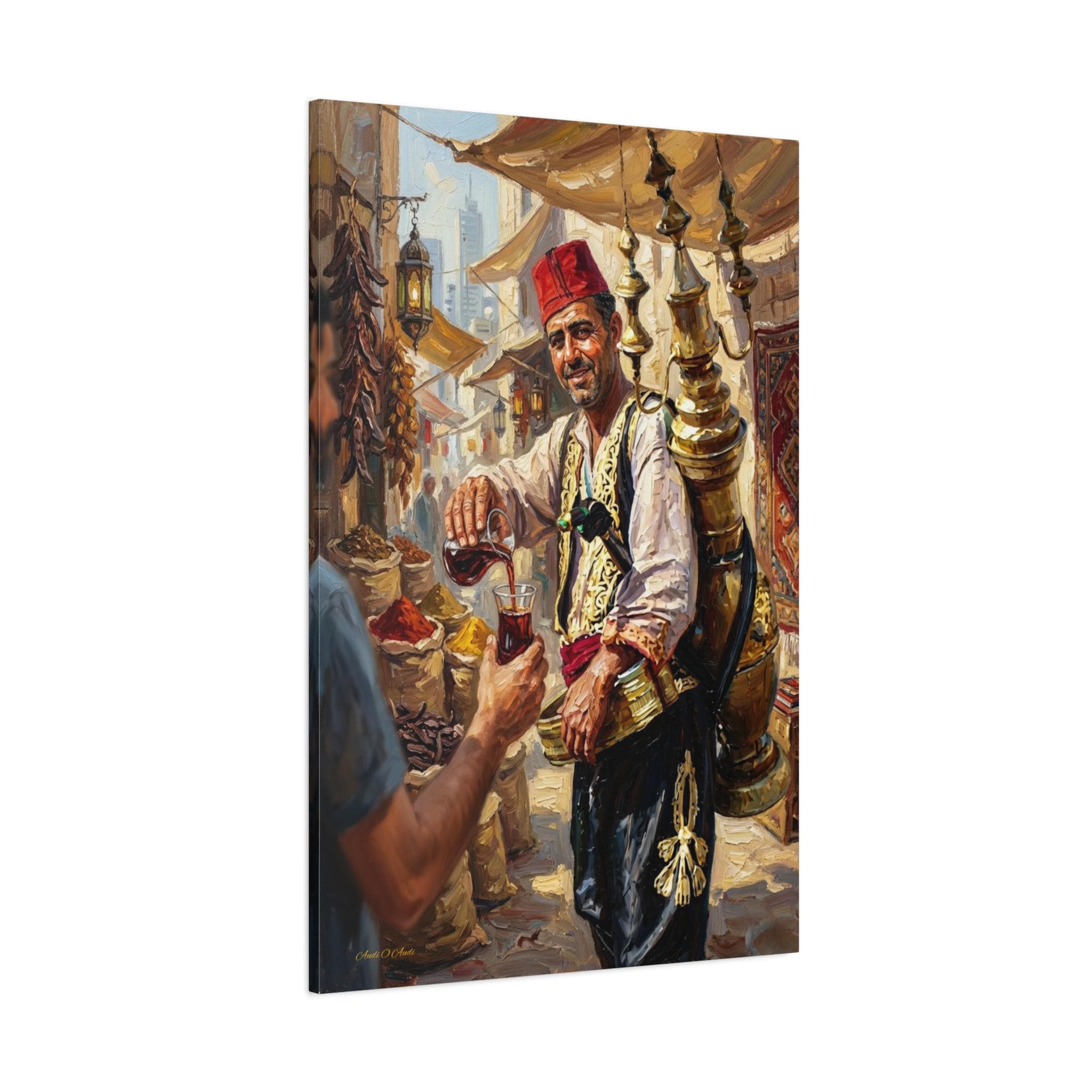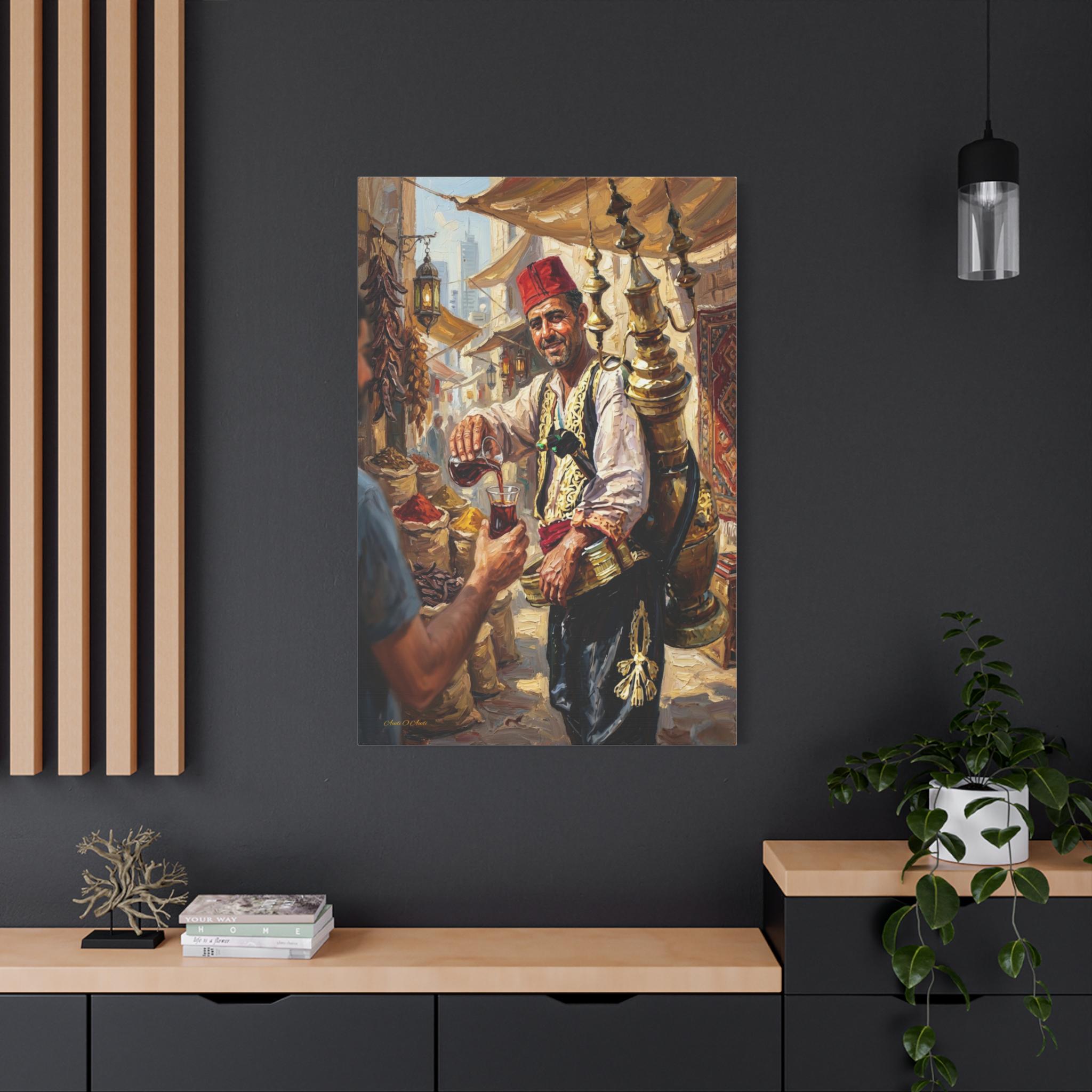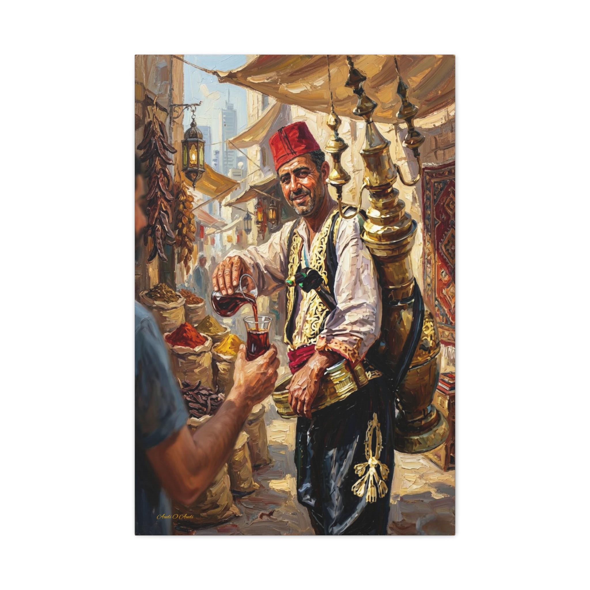Transport your home to the heart of a bustling ancient marketplace with this vibrant canvas print of a traditional drink seller. This captivating artwork features a smiling vendor in traditional attire, pouring a refreshing glass of carob juice (or tamarind sherbet) from an ornate, towering brass dispenser strapped to his back.