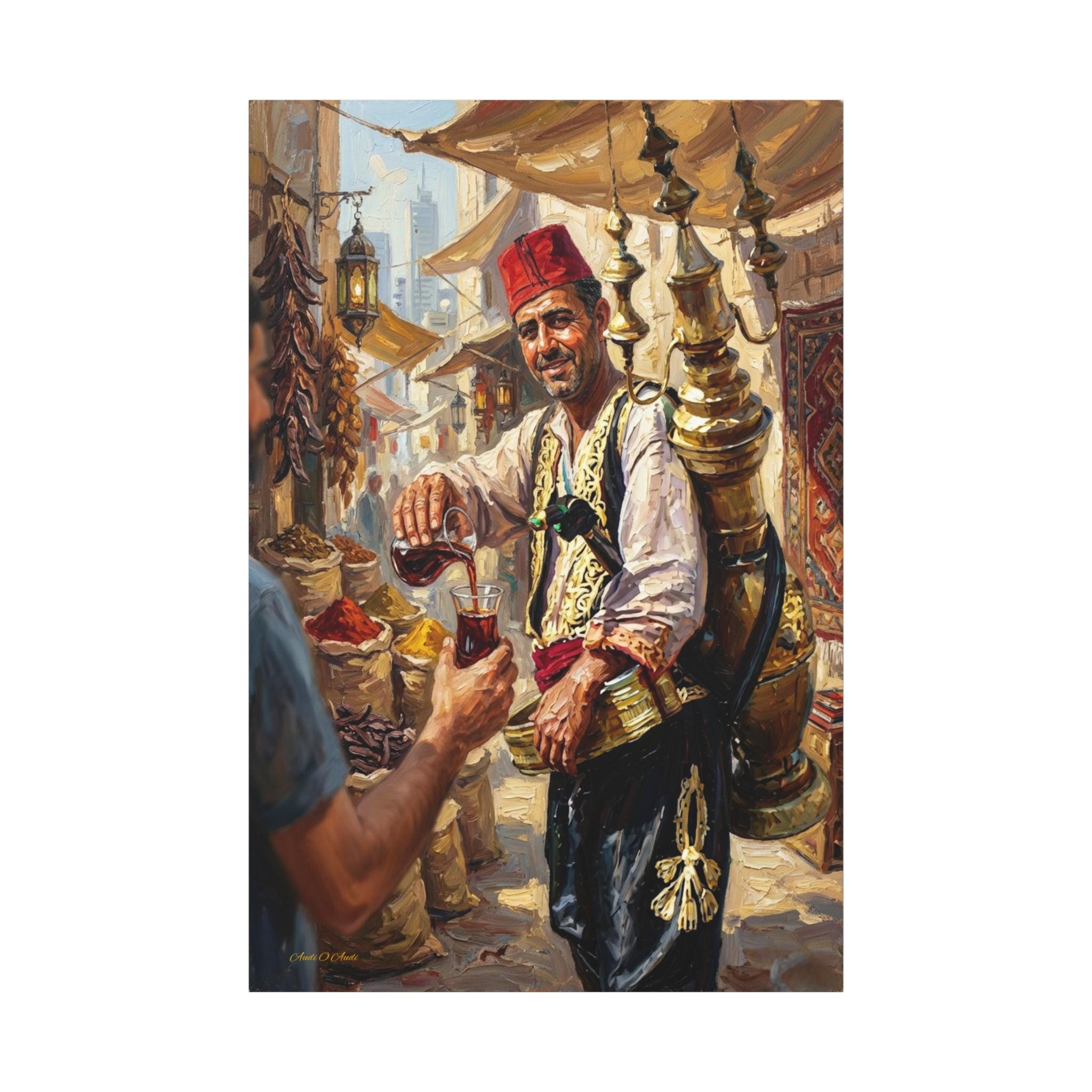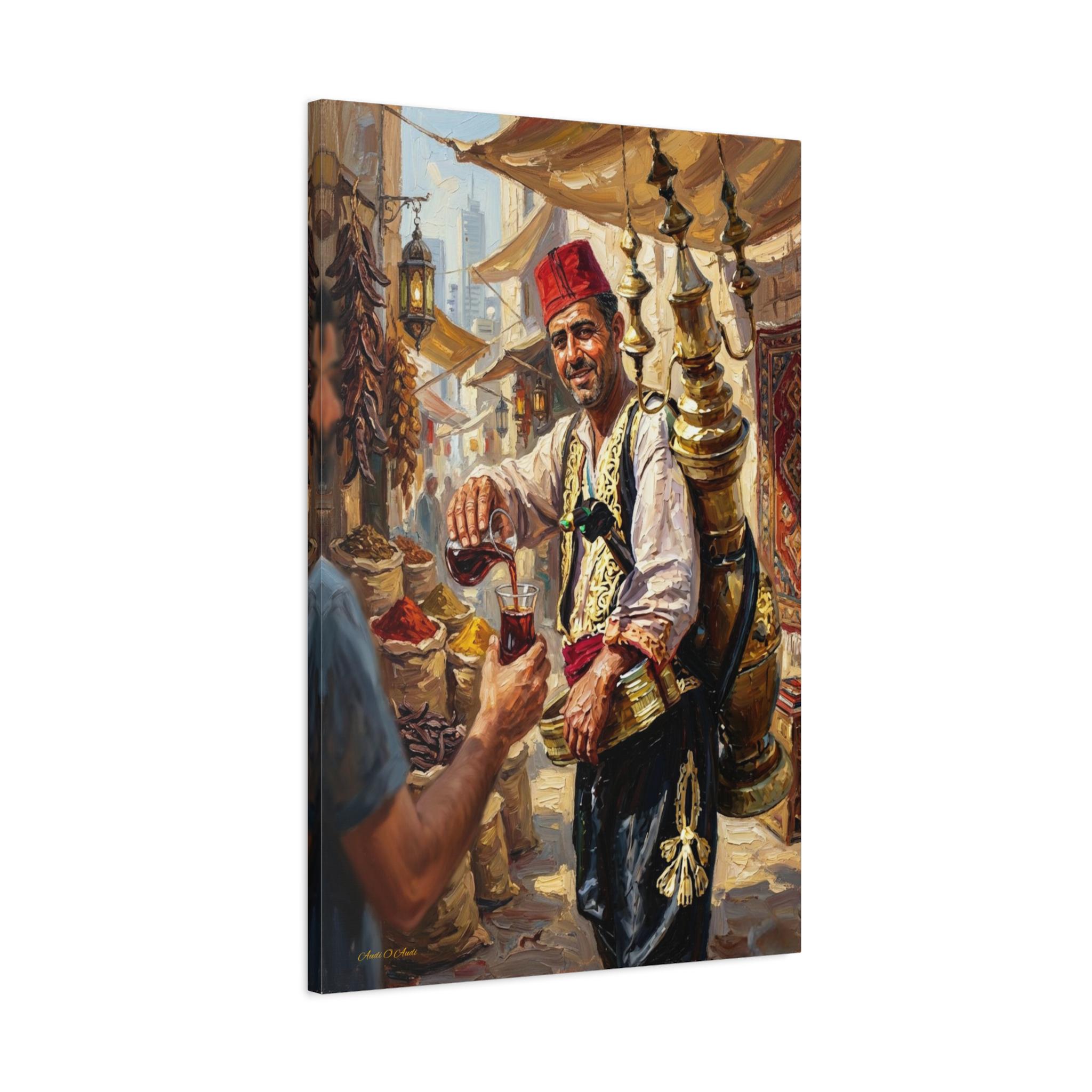 The background is filled with the rich details of a souk, from sacks of aromatic spices to hanging dried goods. The design utilizes a rich impasto oil painting style, where the textured brushstrokes bring the gleam of the brass, the folds of the clothing, and the rustic market atmosphere to life. It is a symbol of hospitality and heritage.