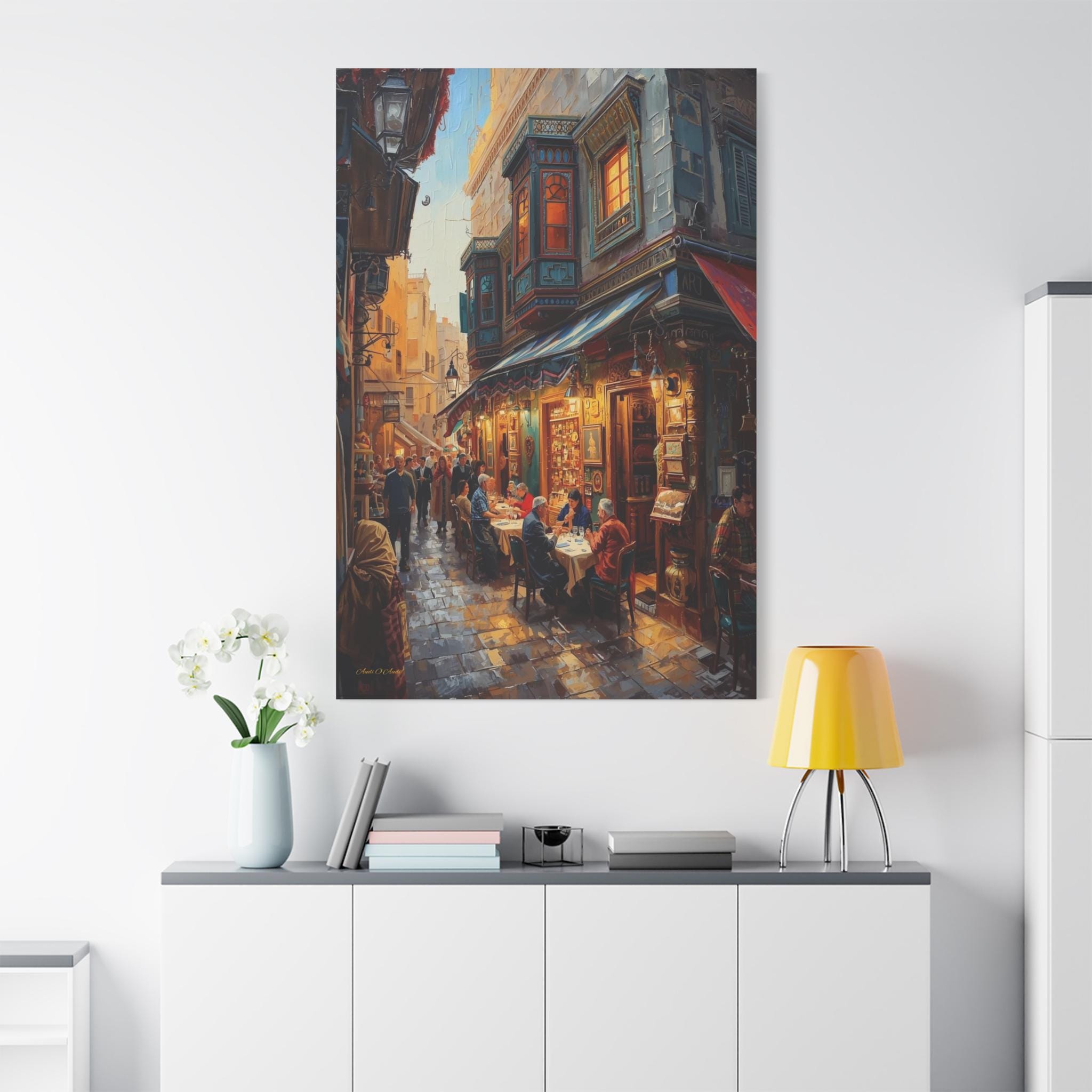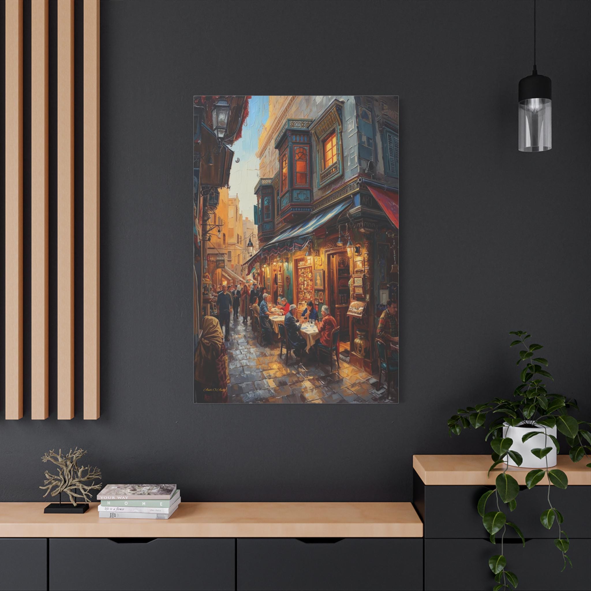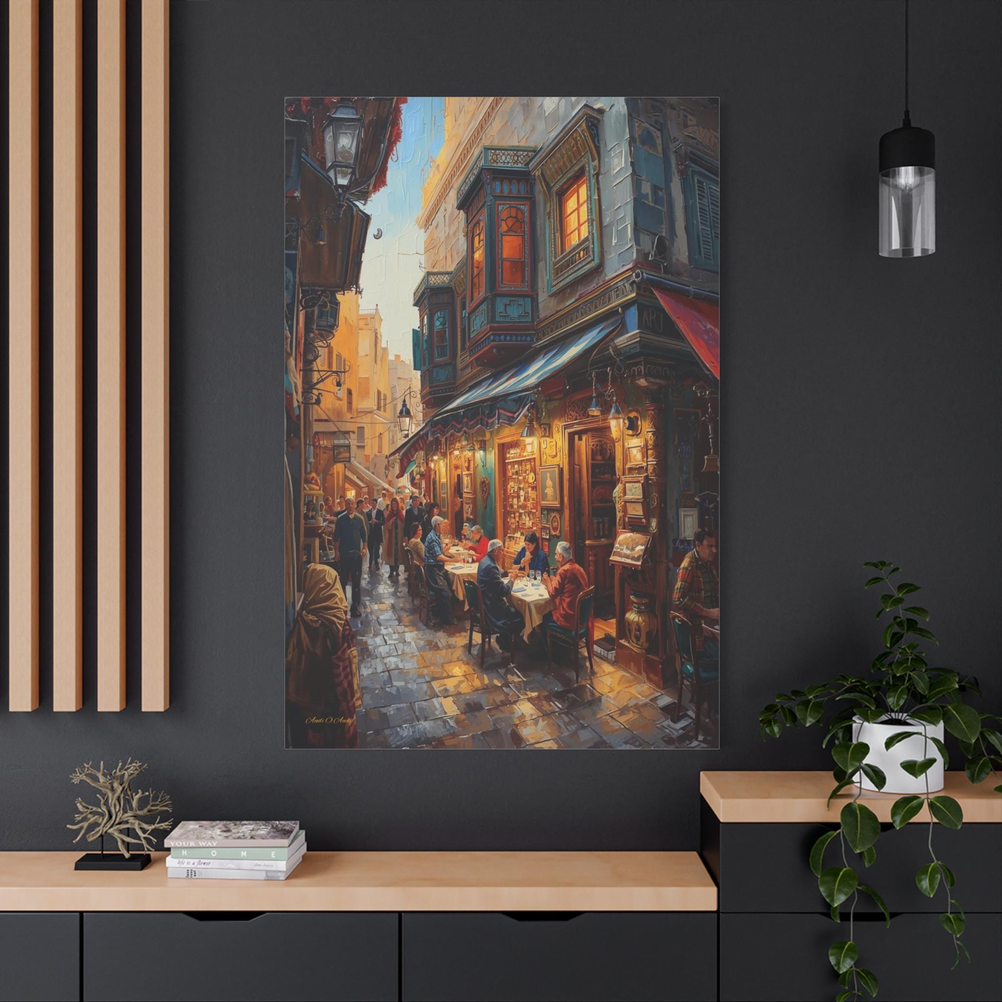 Invite the warmth and charm of a bustling historic alleyway into your home with this captivating canvas print of an outdoor cafe. This scene transports you to the heart of an ancient city, where diners enjoy a meal at street-side tables beneath stunning, ornate wooden balconies (mashrabiya) and warm, glowing lanterns.