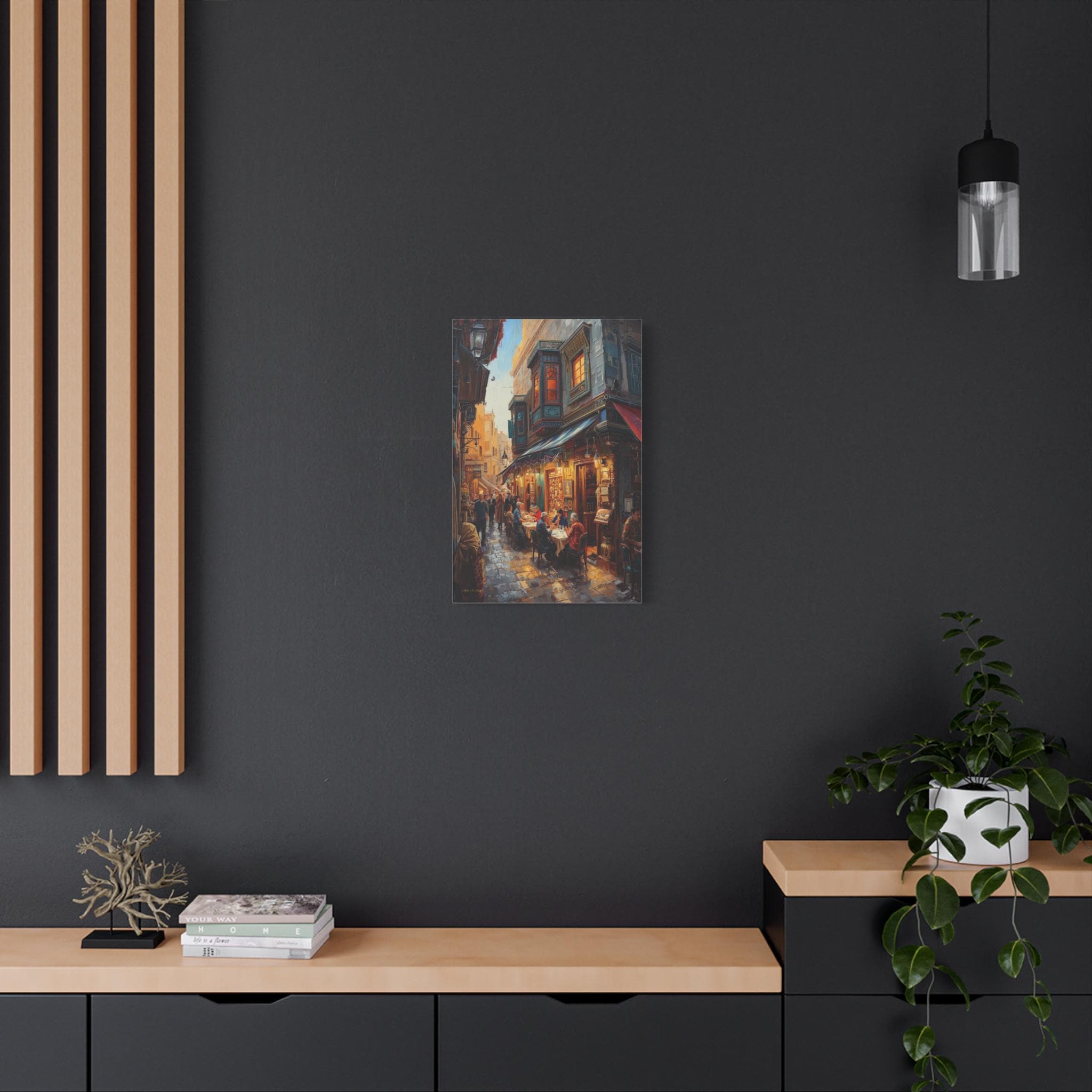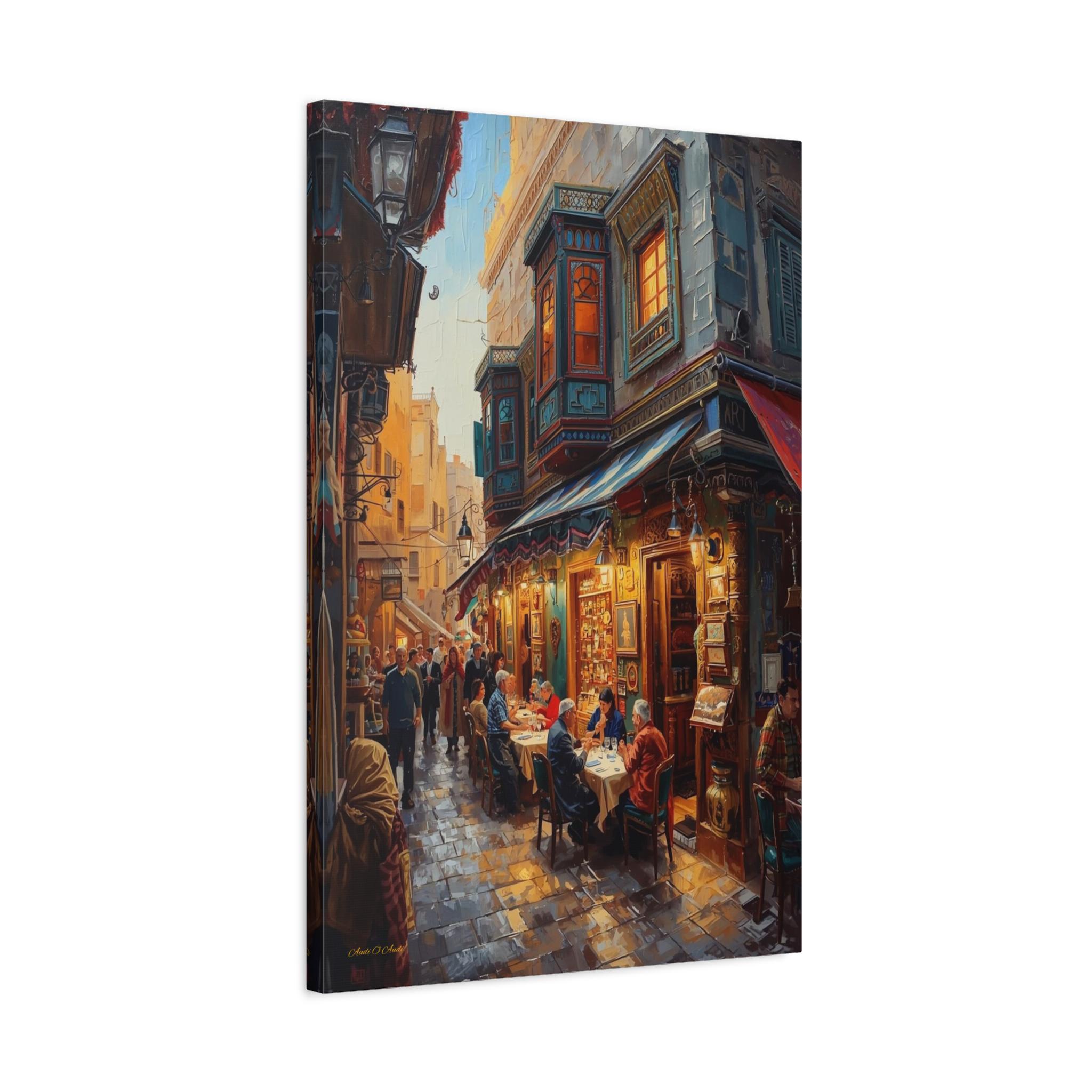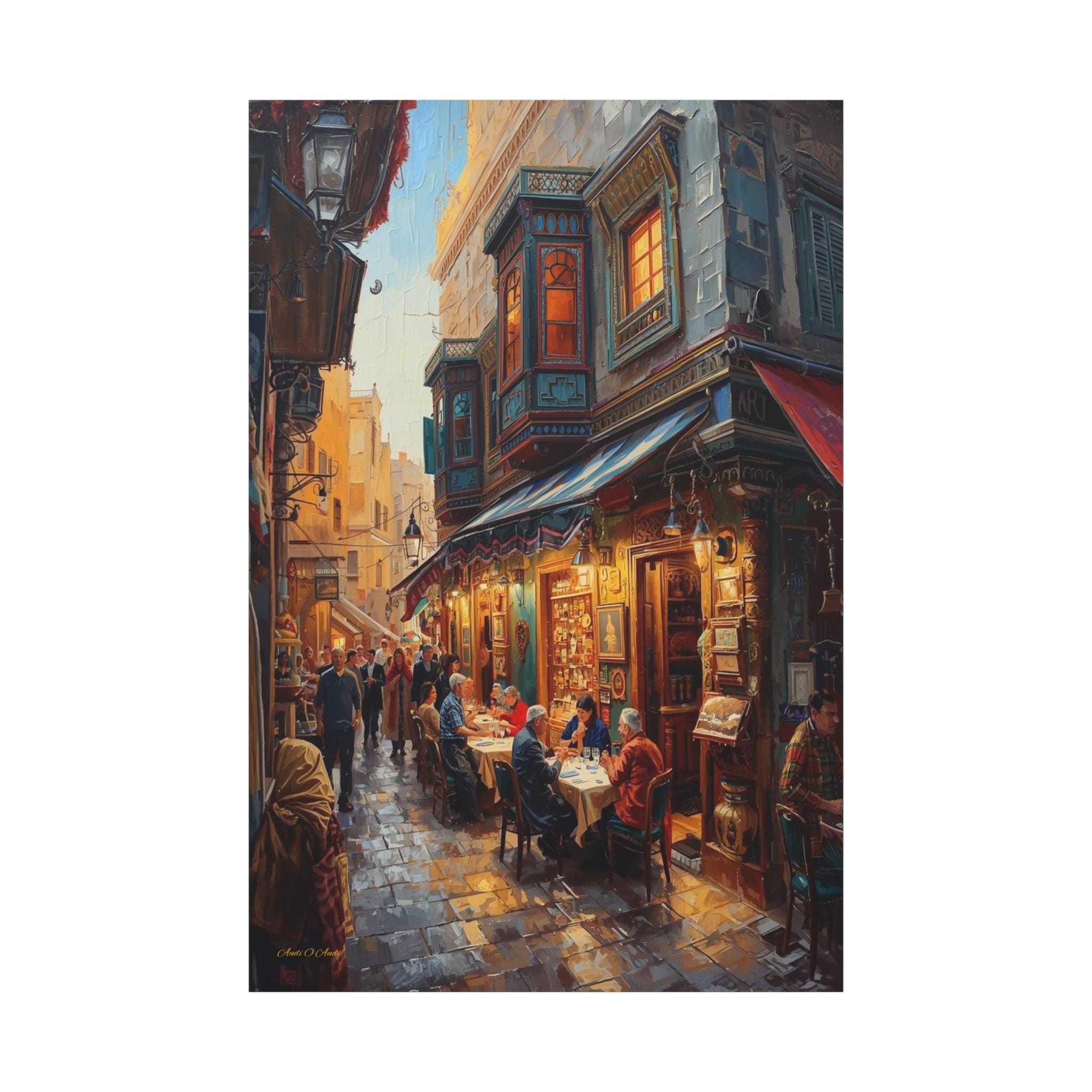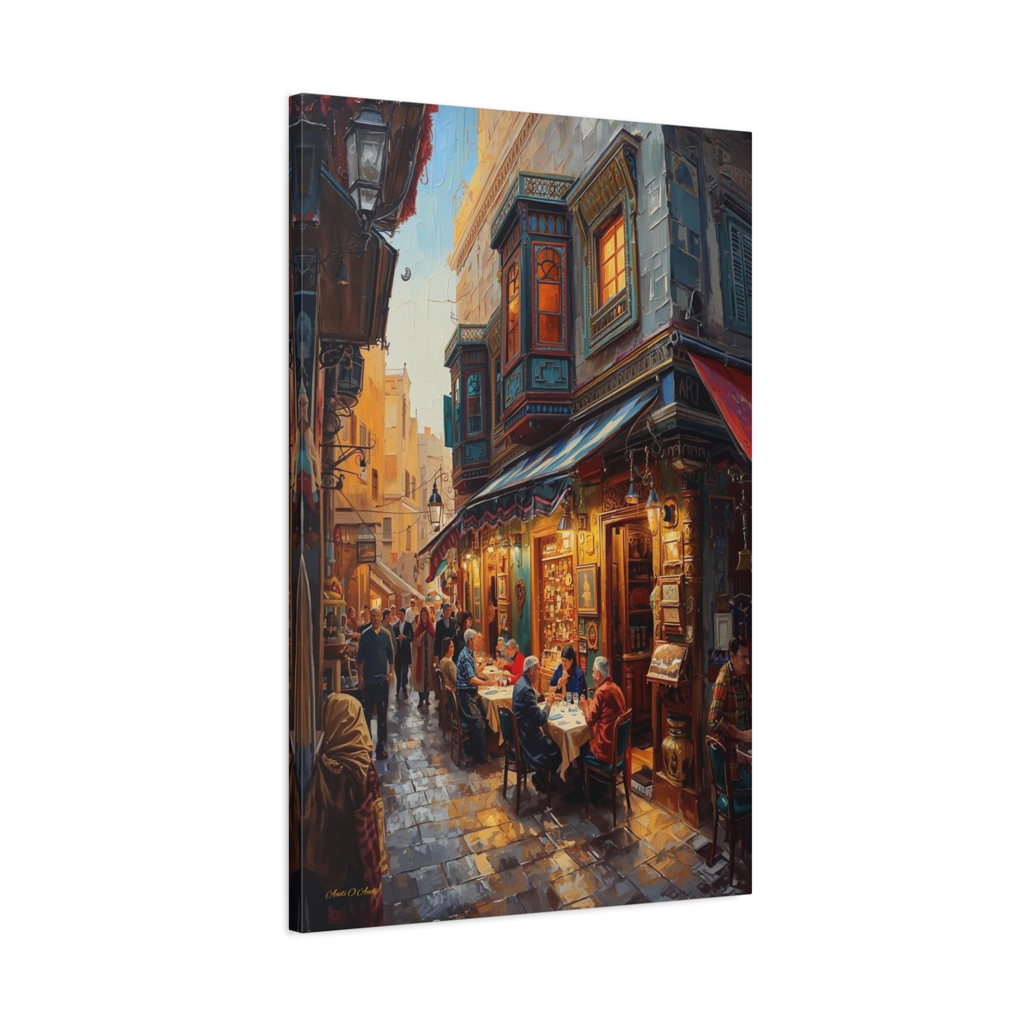 Invite the warmth and charm of a bustling historic alleyway into your home with this captivating canvas print of an outdoor cafe. This scene transports you to the heart of an ancient city, where diners enjoy a meal at street-side tables beneath stunning, ornate wooden balconies (mashrabiya) and warm, glowing lanterns.