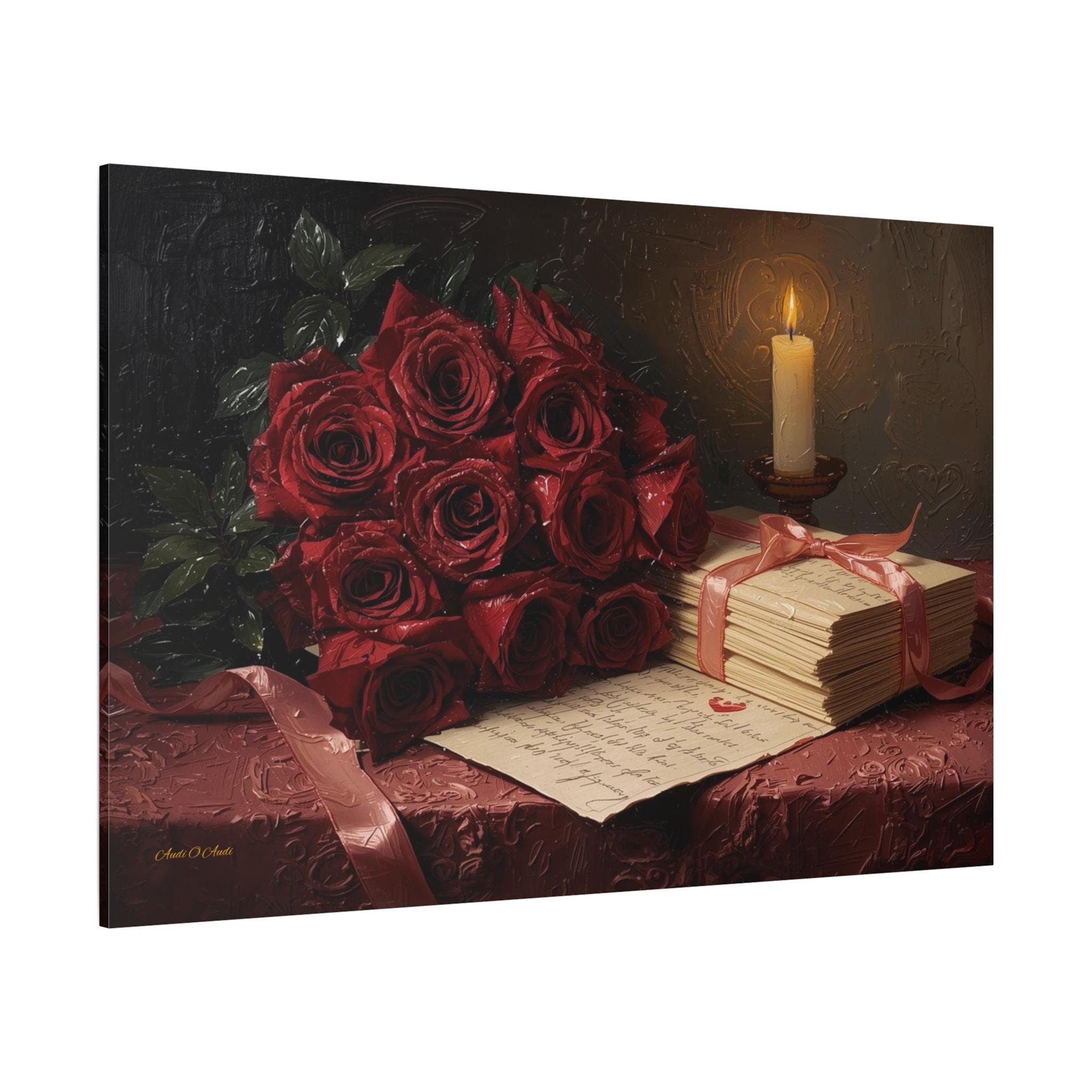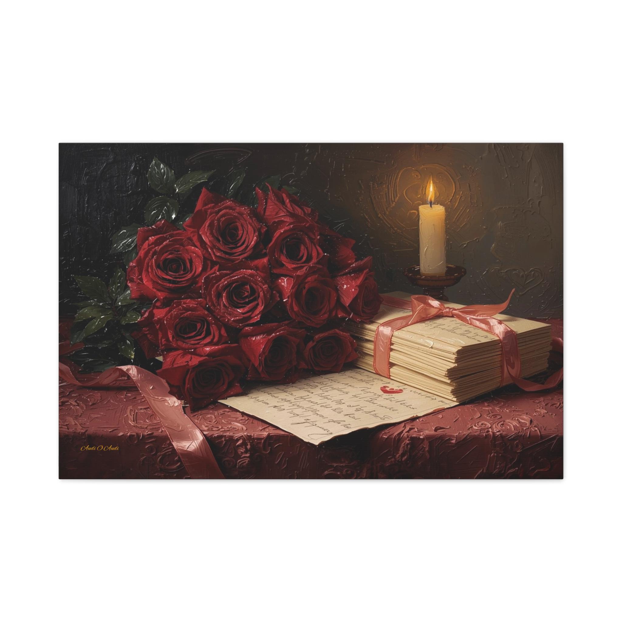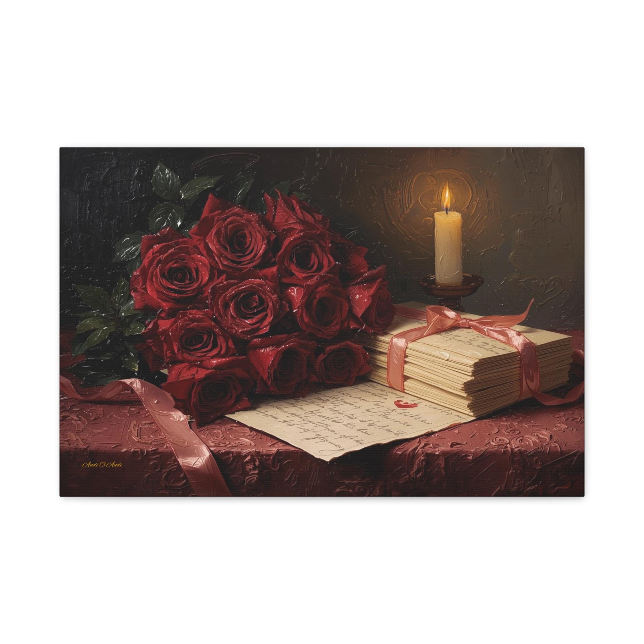 Celebrate the timeless beauty of romance with this exquisite canvas print of roses and love letters. This moody, nostalgic still life features a lush bouquet of deep red roses resting beside a stack of handwritten letters tied with a silk ribbon, all illuminated by the soft, flickering glow of a single candle.