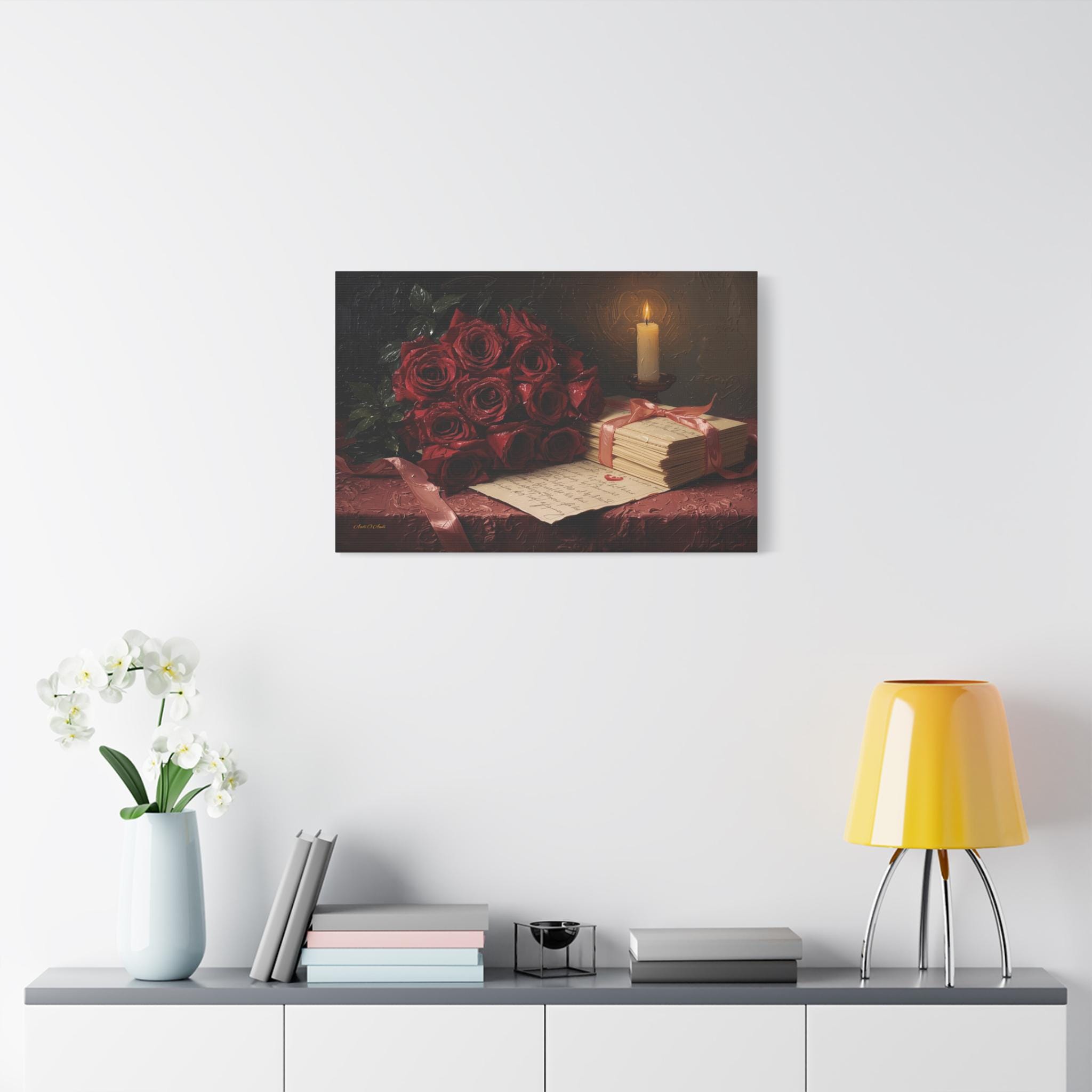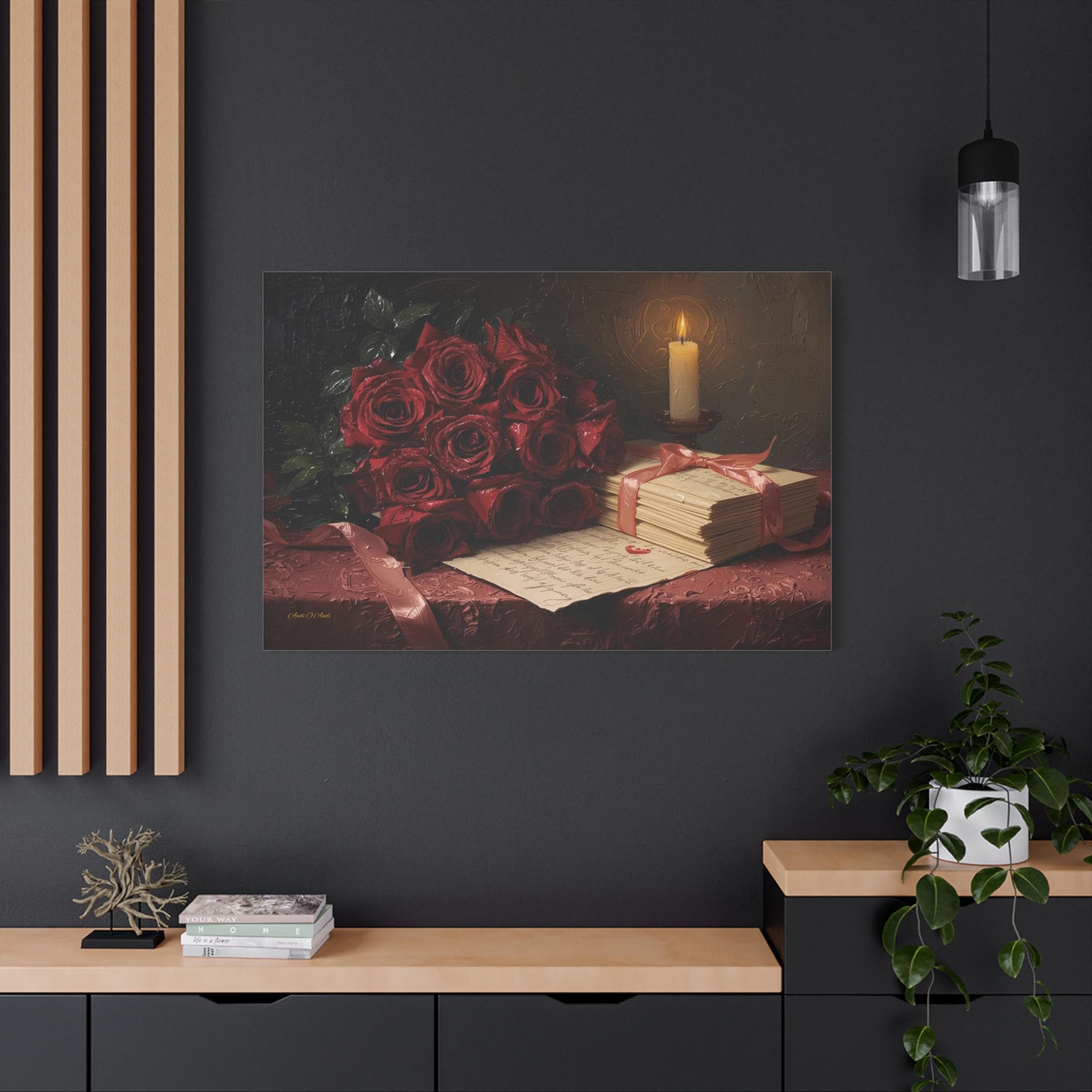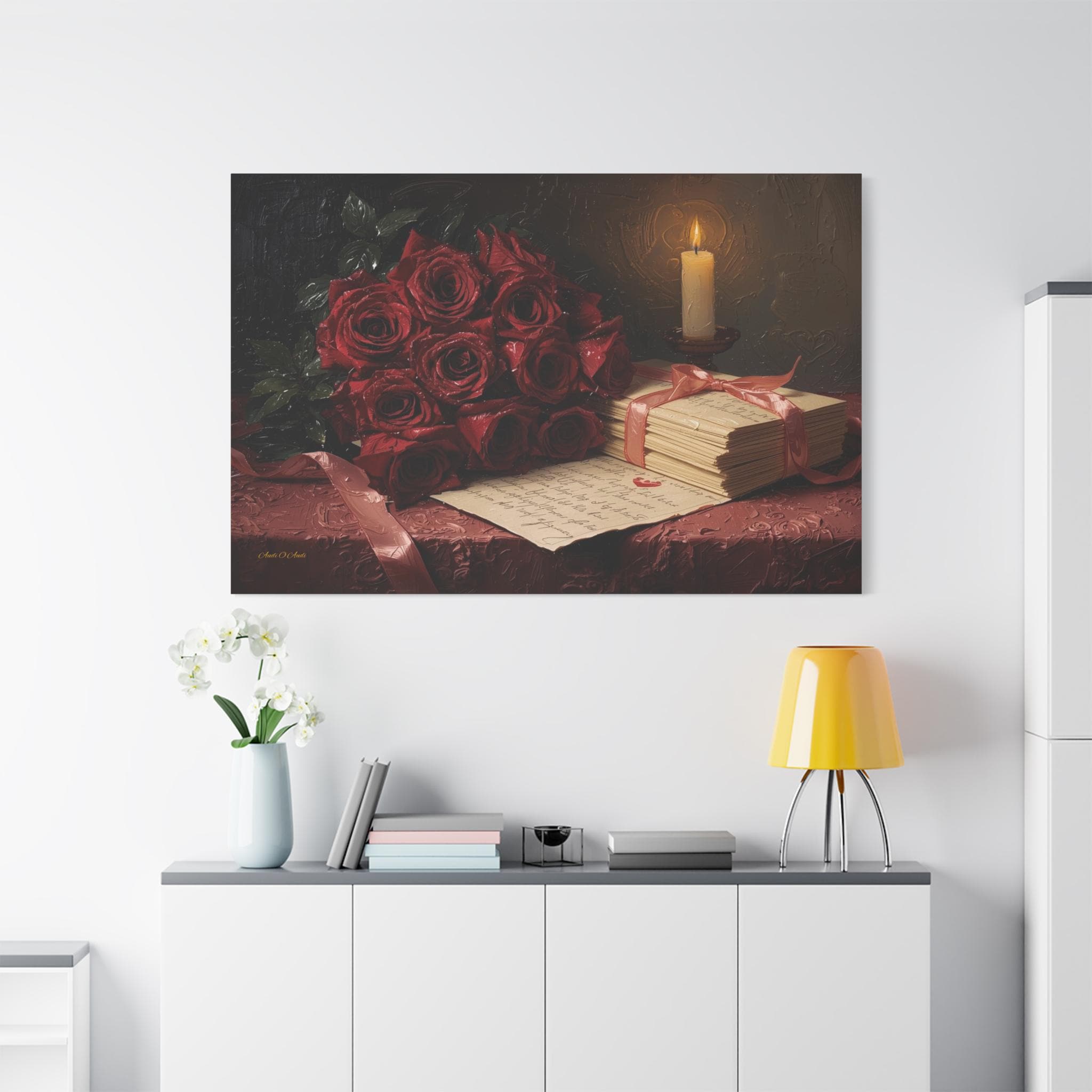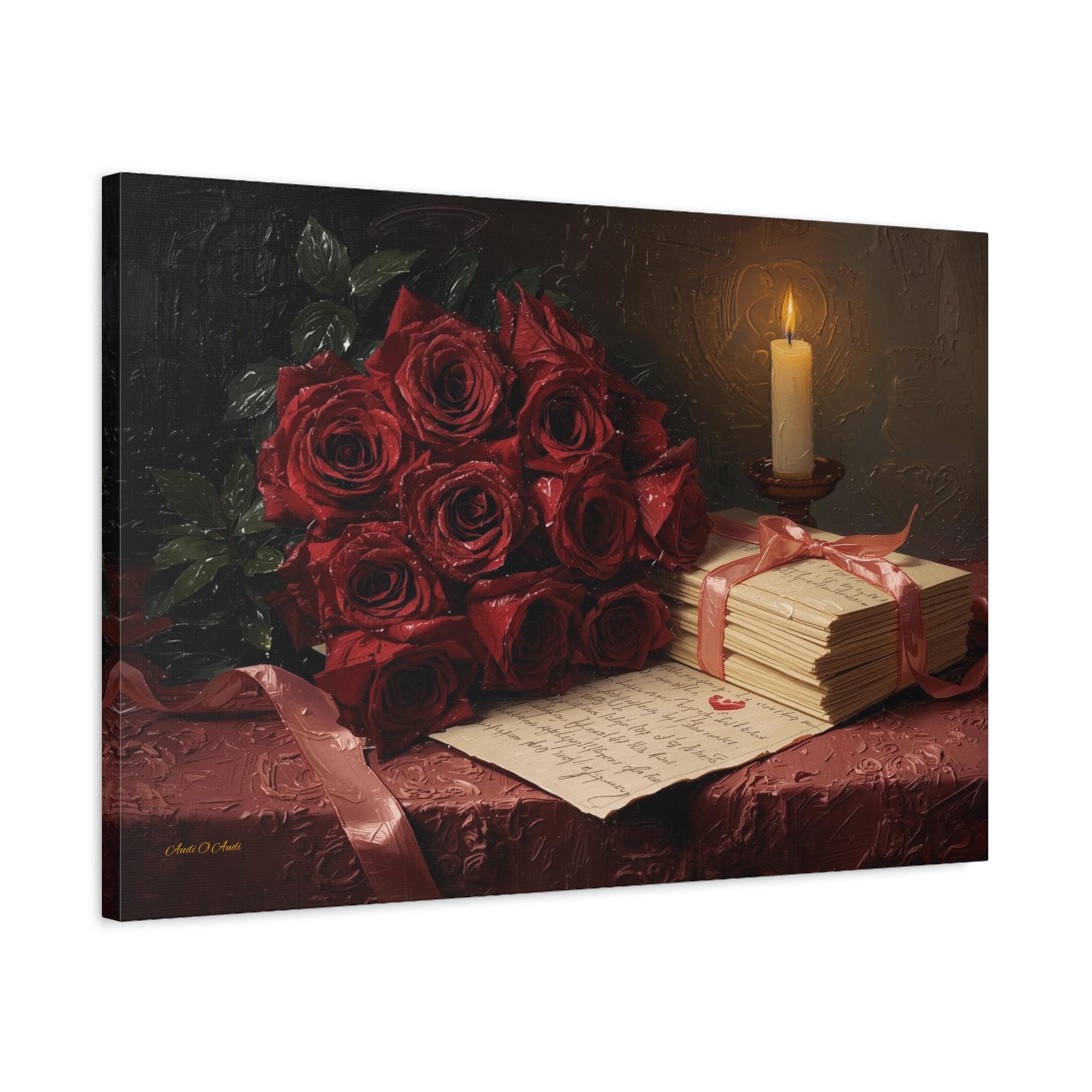 Celebrate the timeless beauty of romance with this exquisite canvas print of roses and love letters. This moody, nostalgic still life features a lush bouquet of deep red roses resting beside a stack of handwritten letters tied with a silk ribbon, all illuminated by the soft, flickering glow of a single candle.