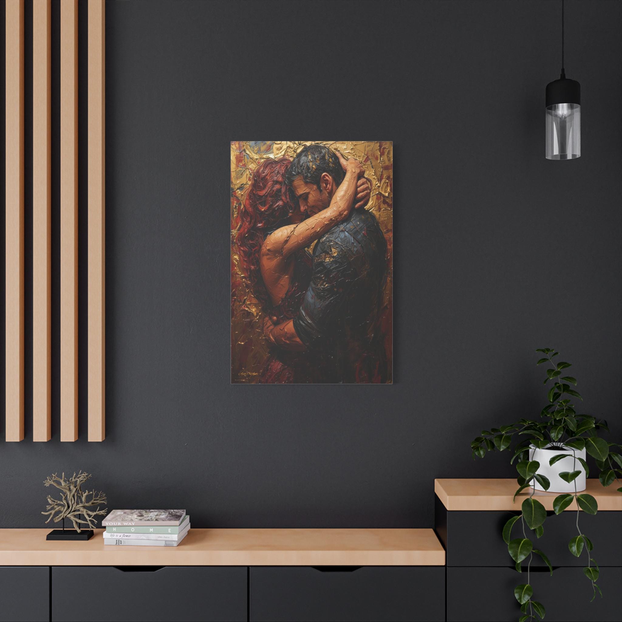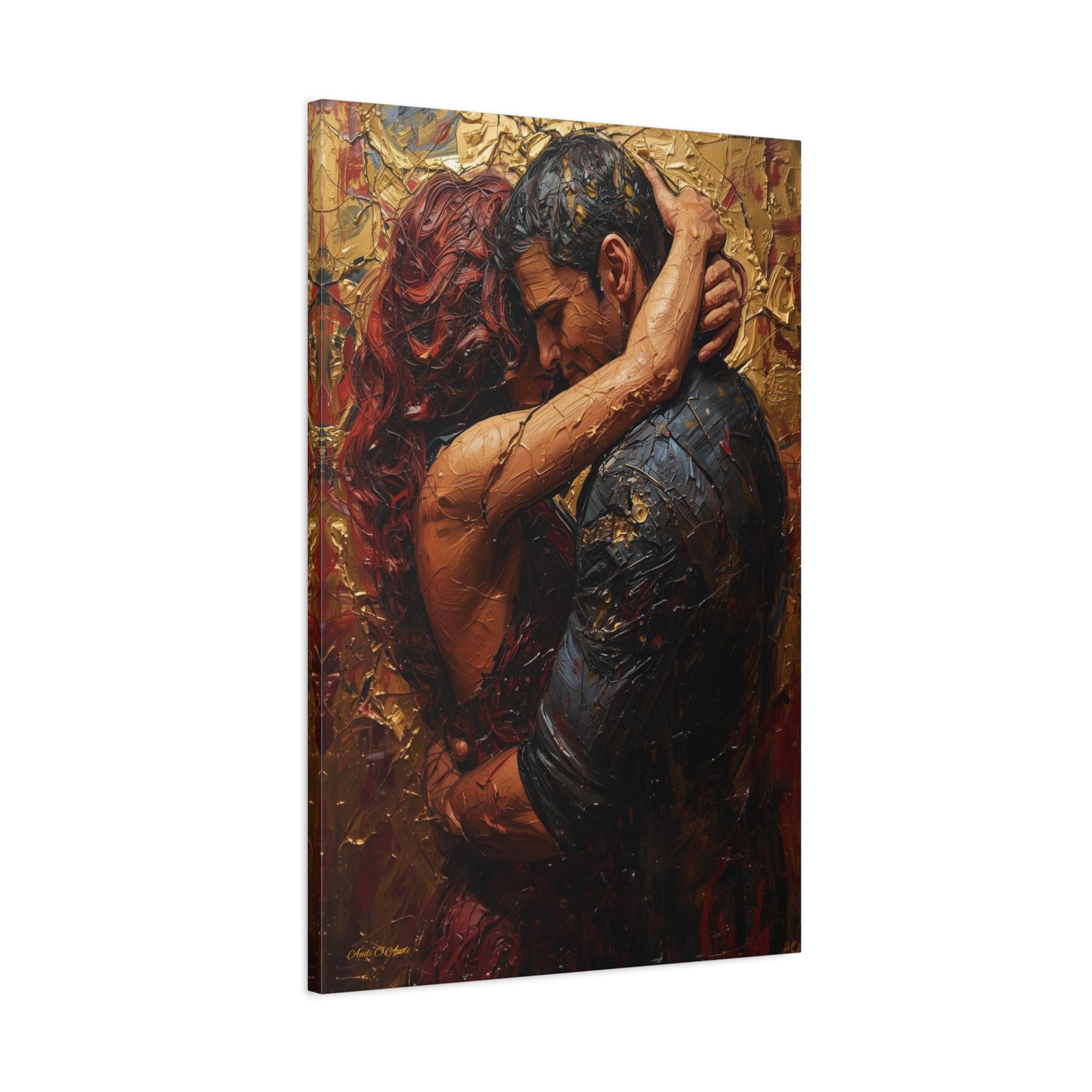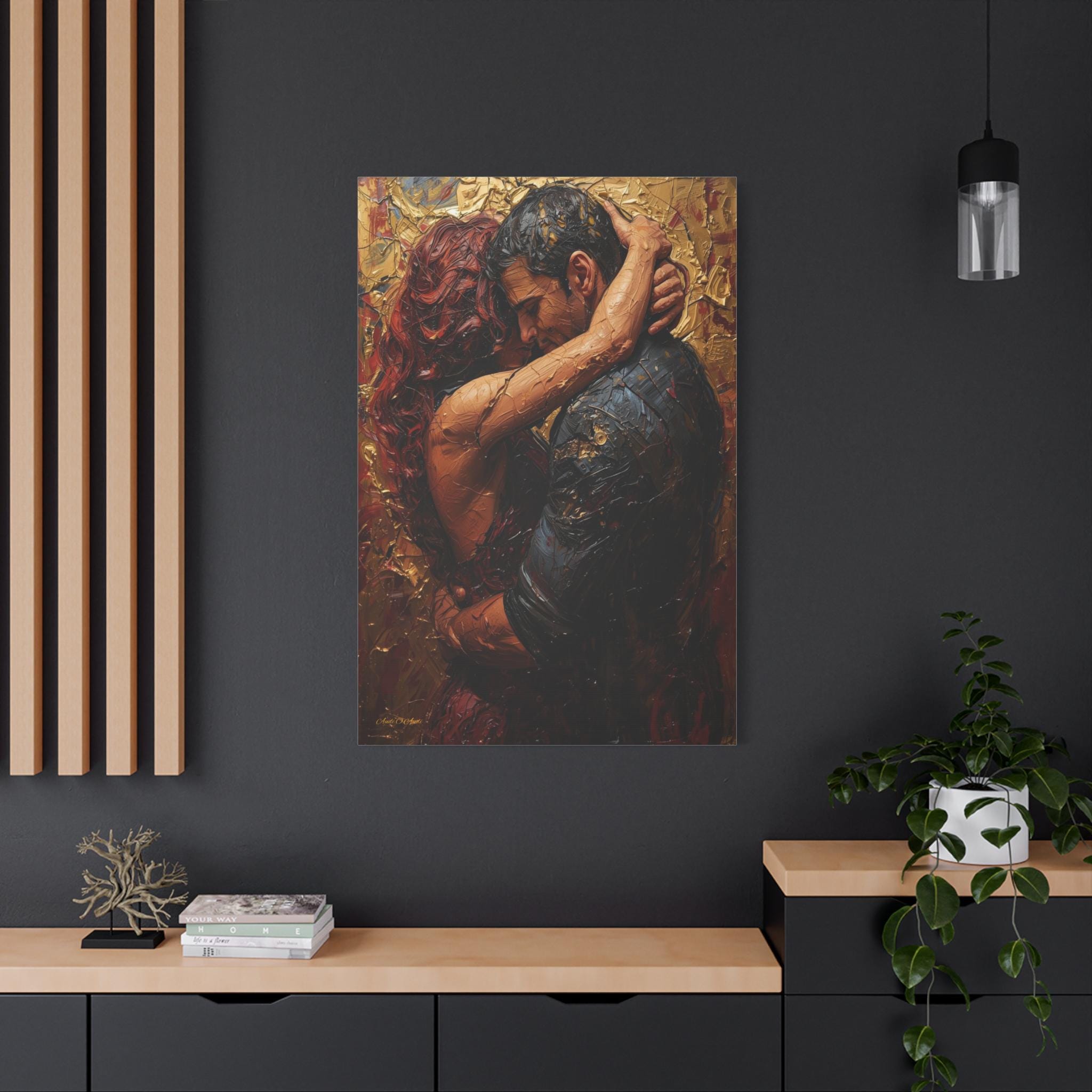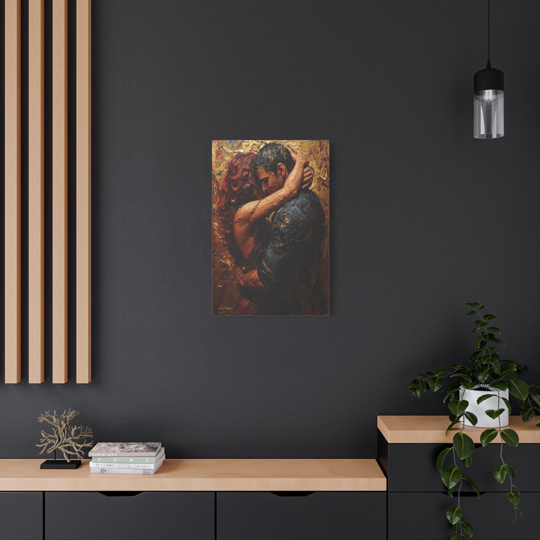 Celebrate the precious bond of true love with this luxurious canvas print of a couple in a deep embrace. Bathed in stunning shades of antique gold, bronze, and deep crimson, this artwork captures a tender moment where the world fades away, leaving only the comfort and safety of holding the one you love.