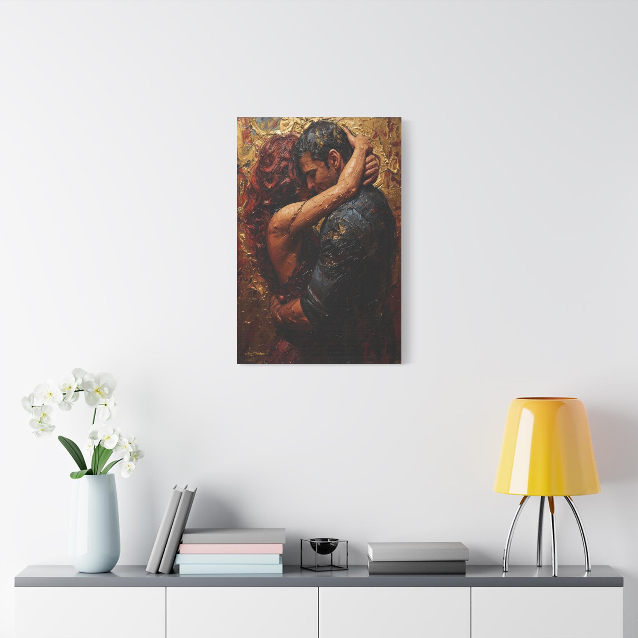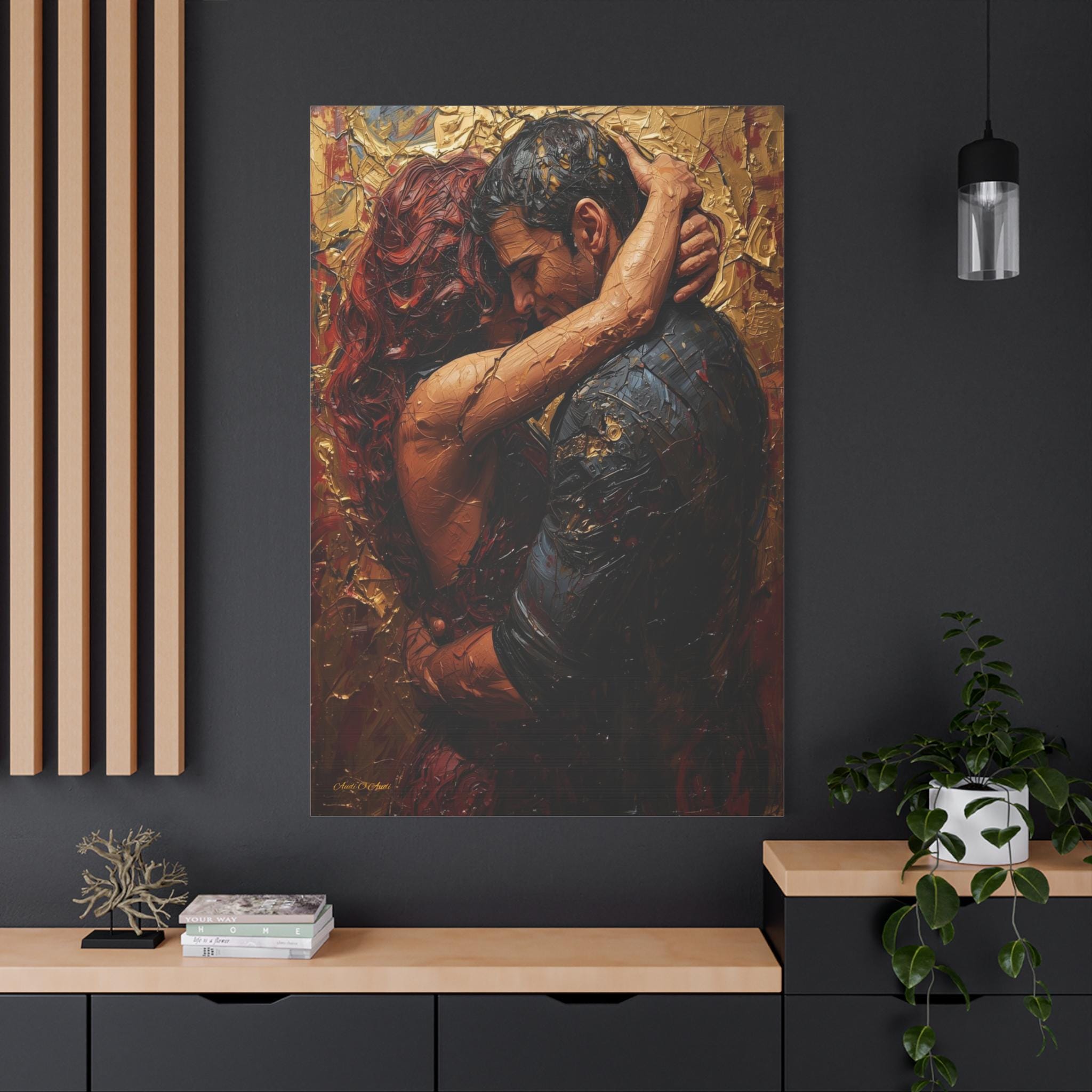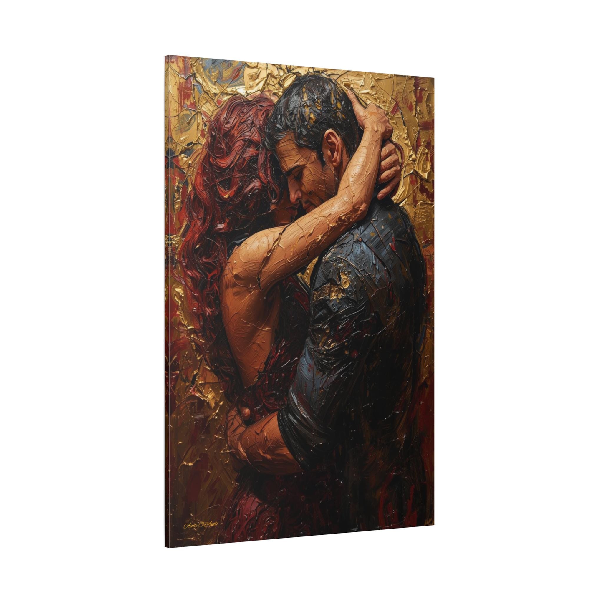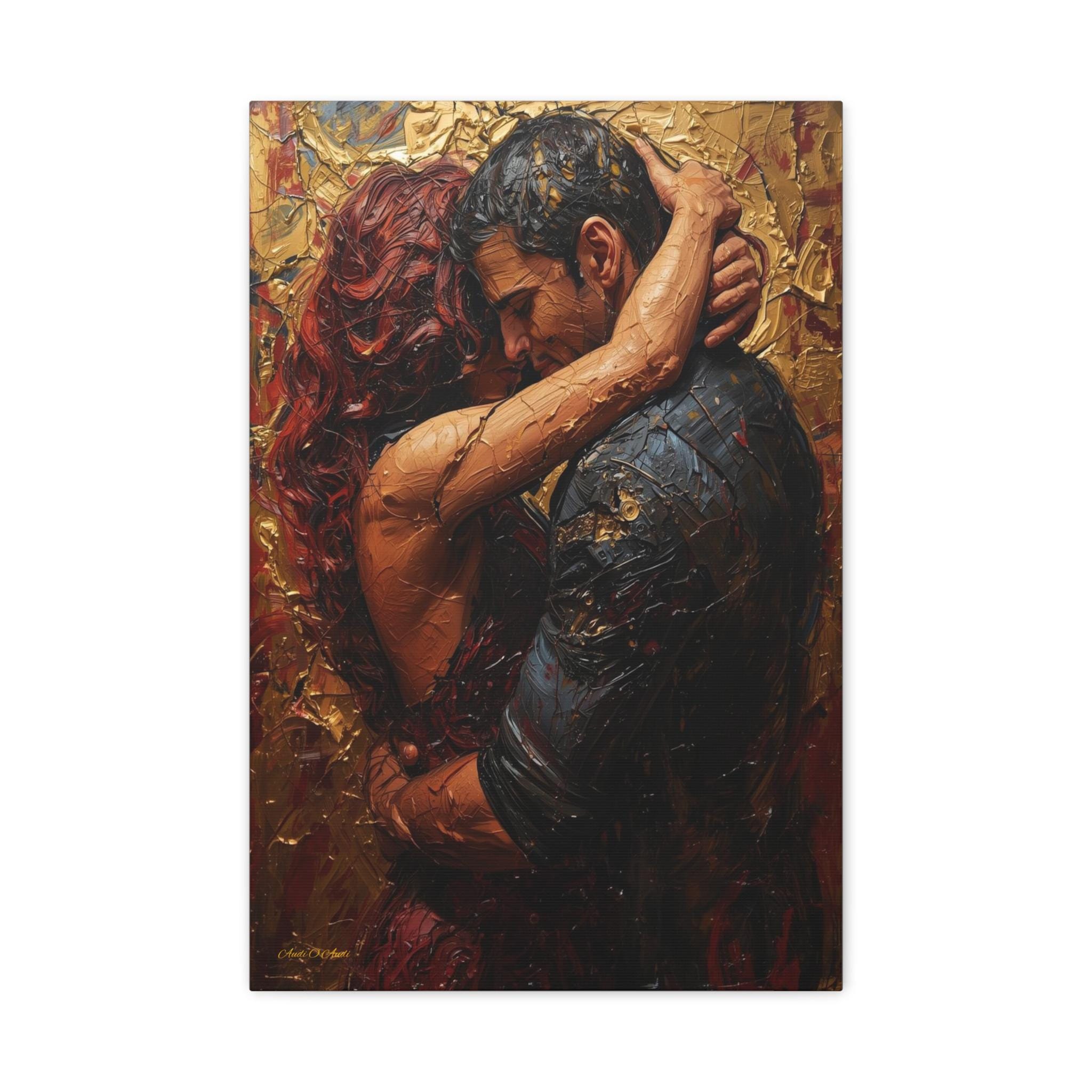 Celebrate the precious bond of true love with this luxurious canvas print of a couple in a deep embrace. Bathed in stunning shades of antique gold, bronze, and deep crimson, this artwork captures a tender moment where the world fades away, leaving only the comfort and safety of holding the one you love.