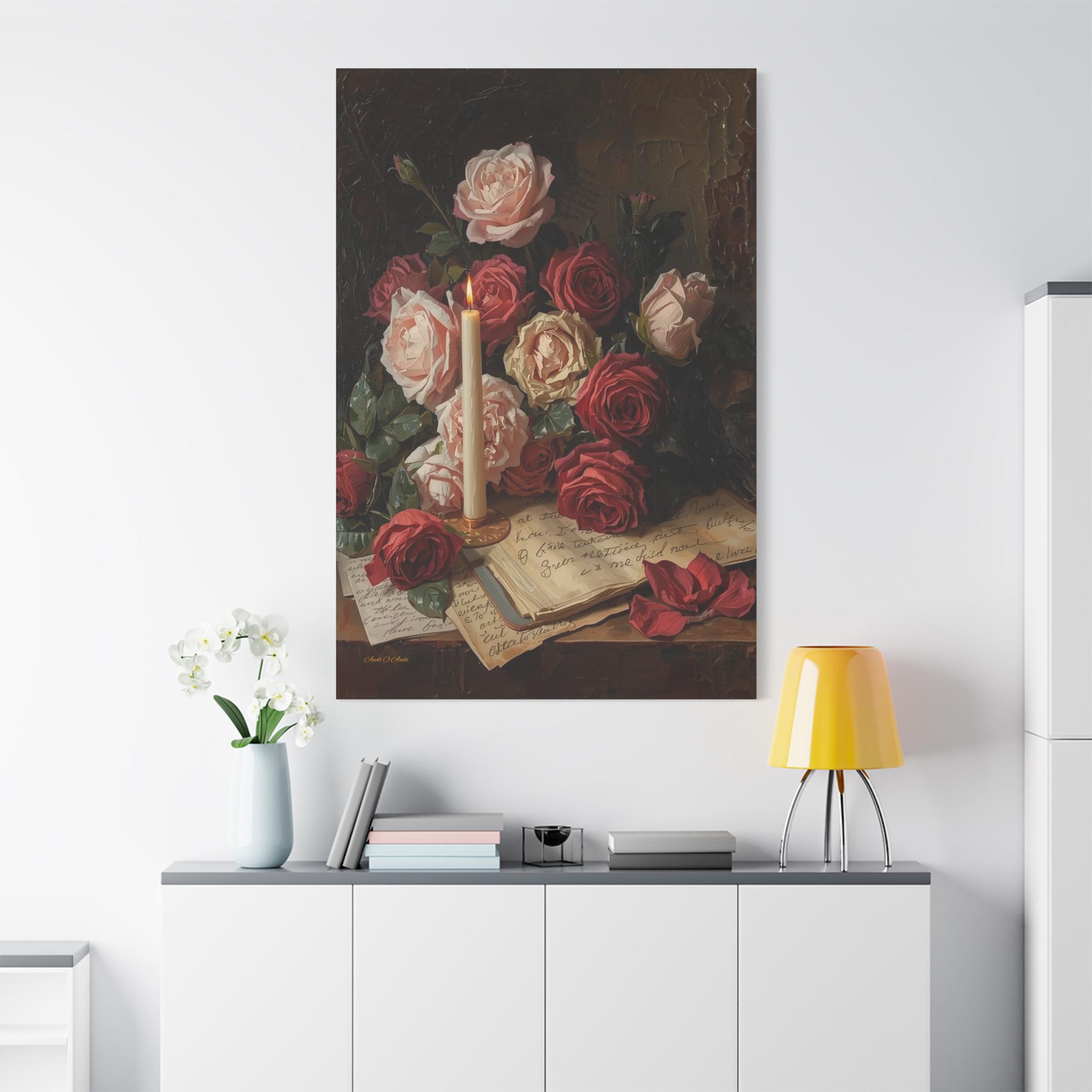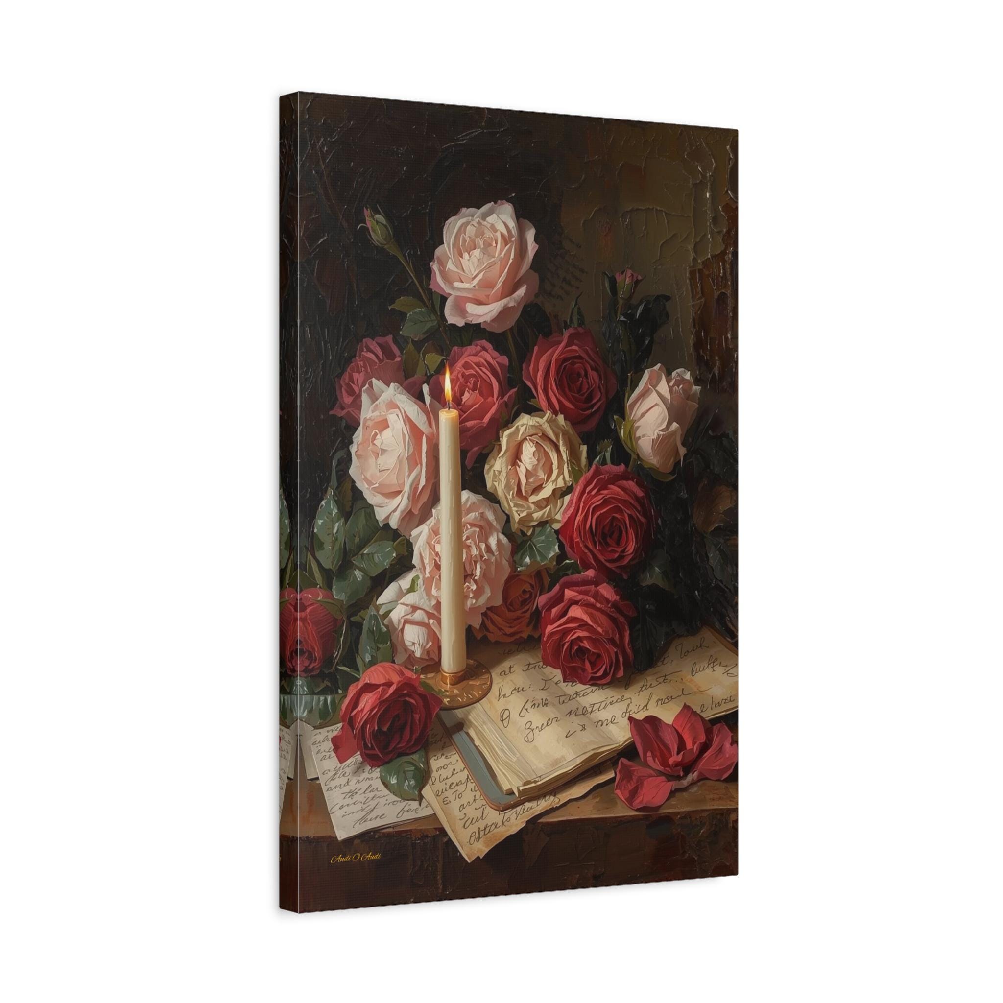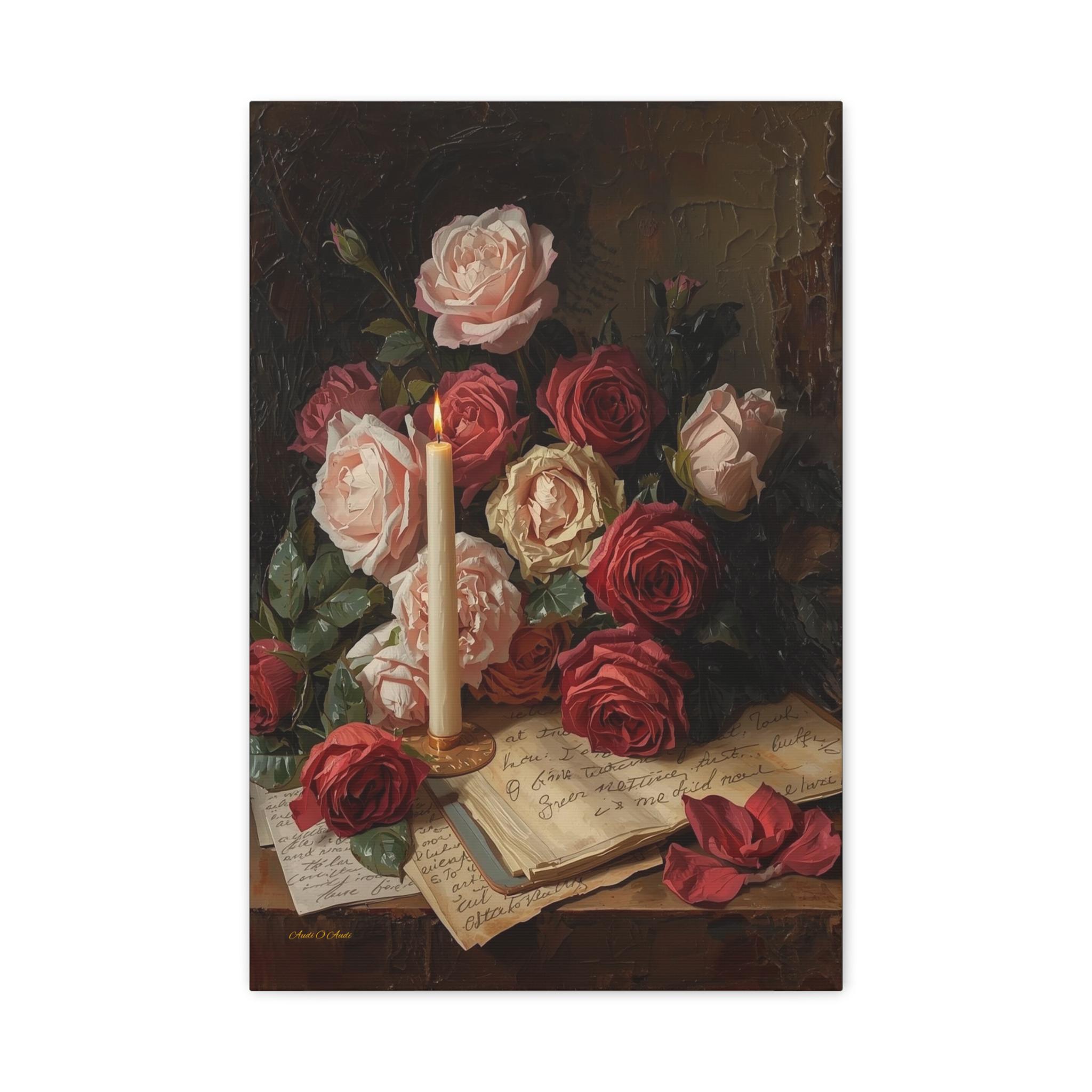 Capture the essence of timeless romance with this enchanting canvas print of a floral bouquet and handwritten letters. This nostalgic still life features a lush arrangement of soft pink, creamy white, and deep red roses, resting beside a stack of vintage love letters illuminated by the warm glow of a single candle.