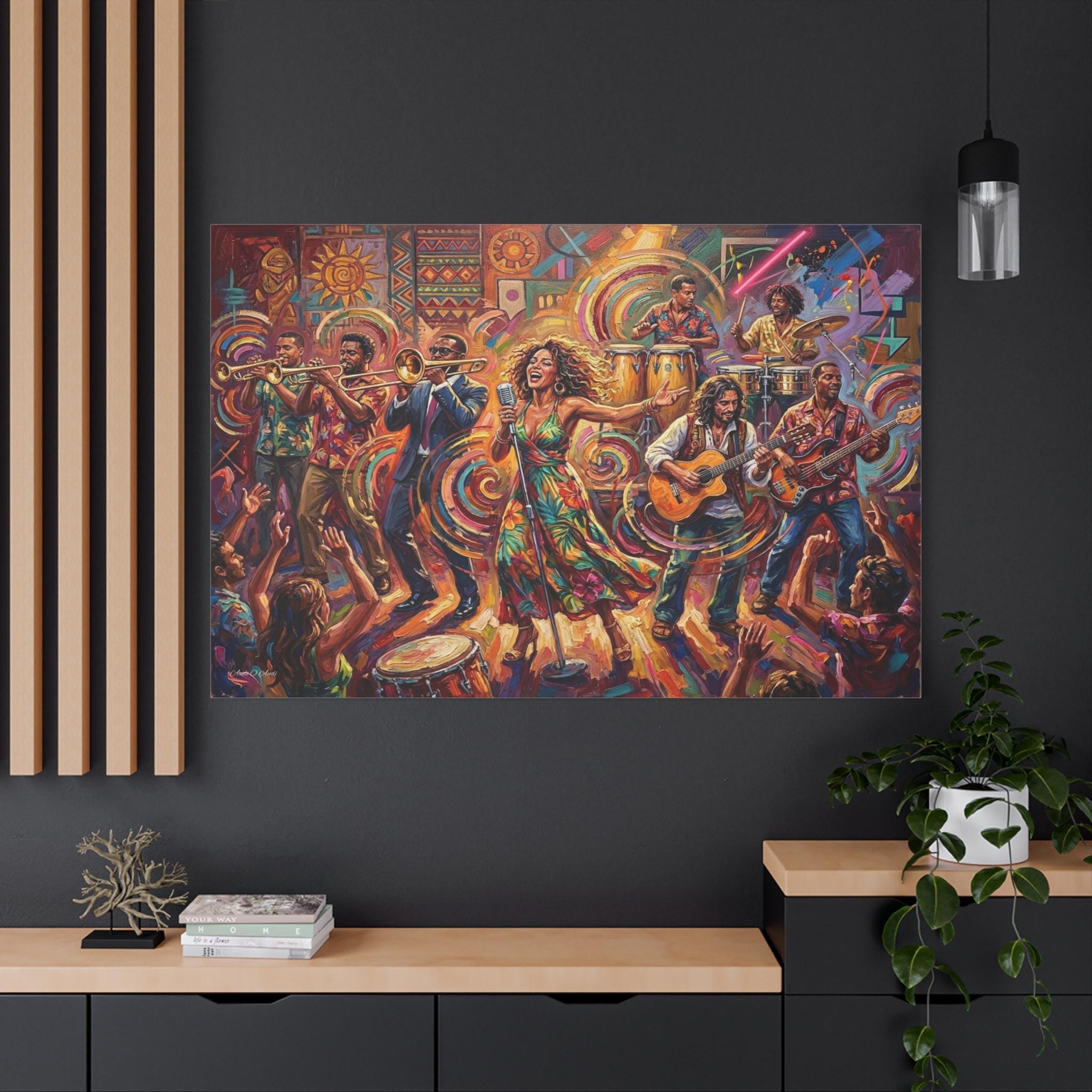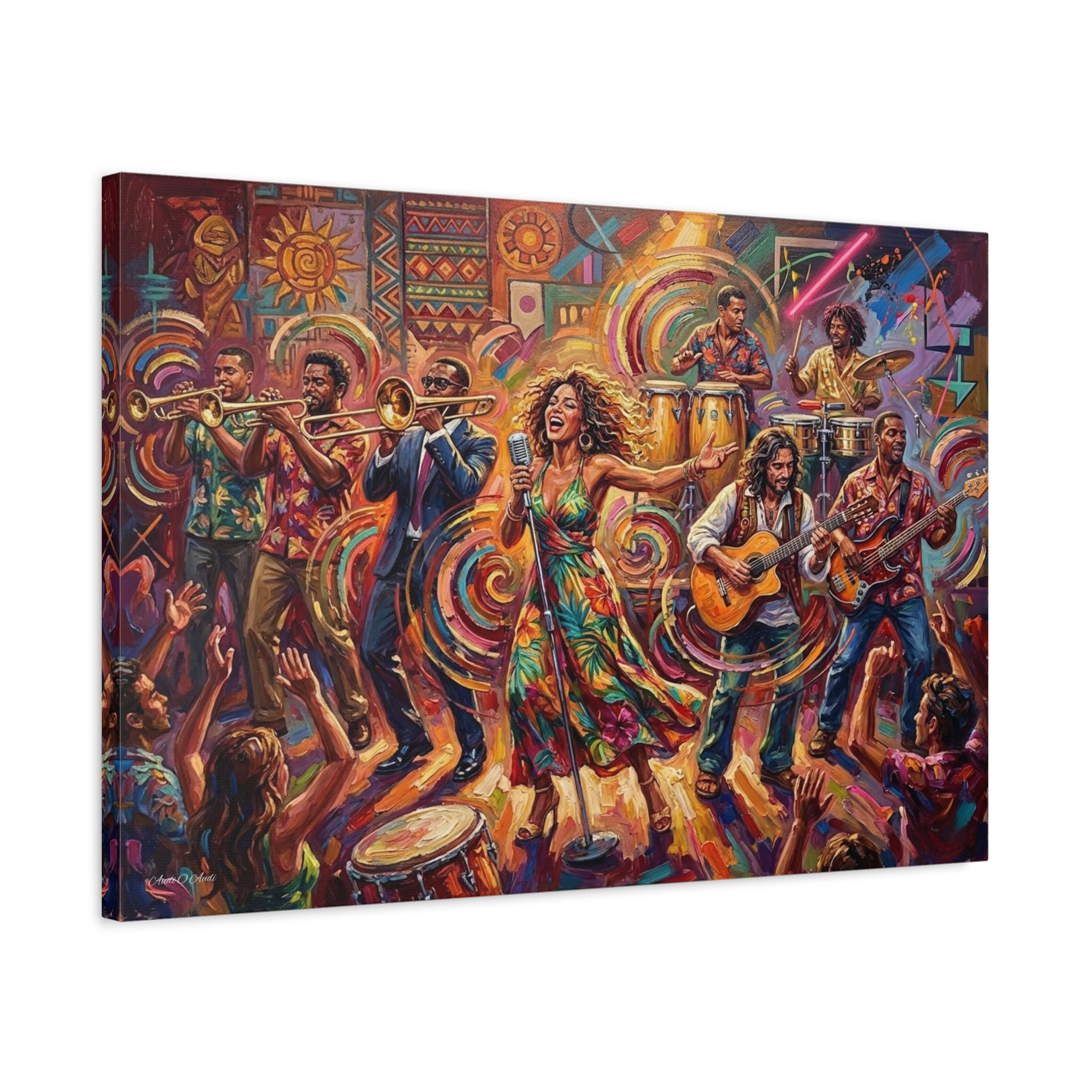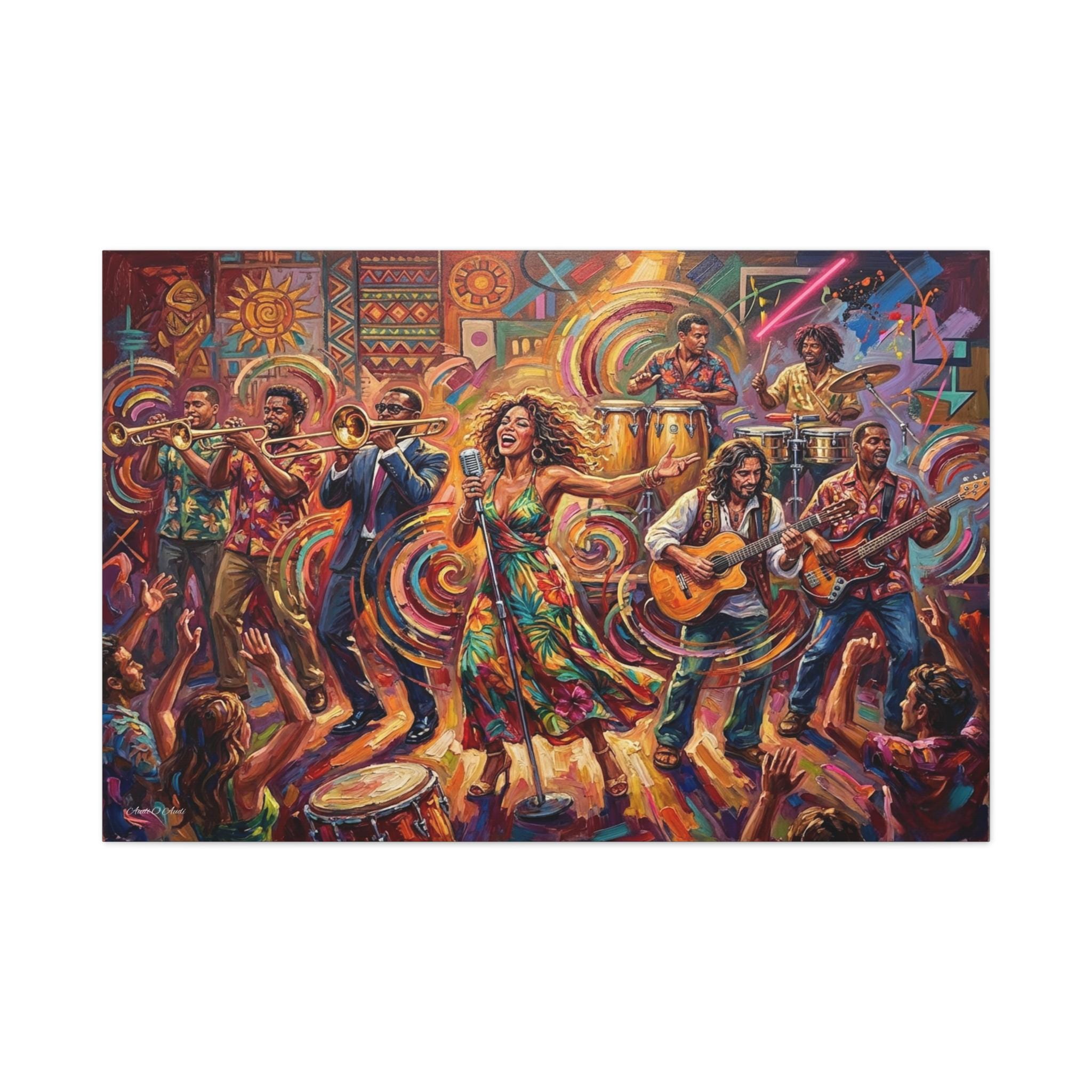 Bring the infectious rhythm and color of the Caribbean into your home with this spectacular canvas print of a tropical Latin band. This high-energy artwork features a full ensemble in mid-performance, led by a passionate female vocalist in a floral dress, backed by trumpet players, guitarists, and percussionists.