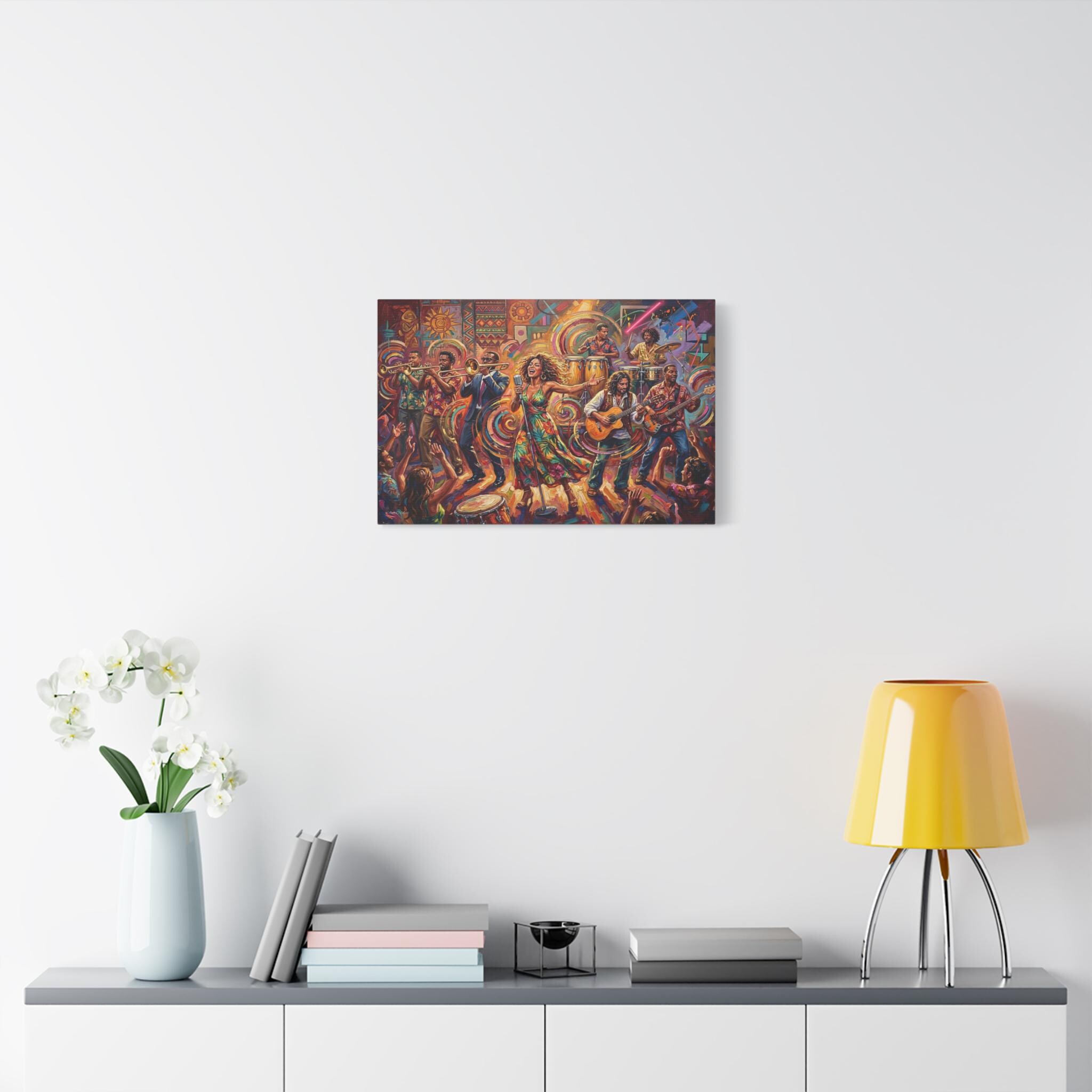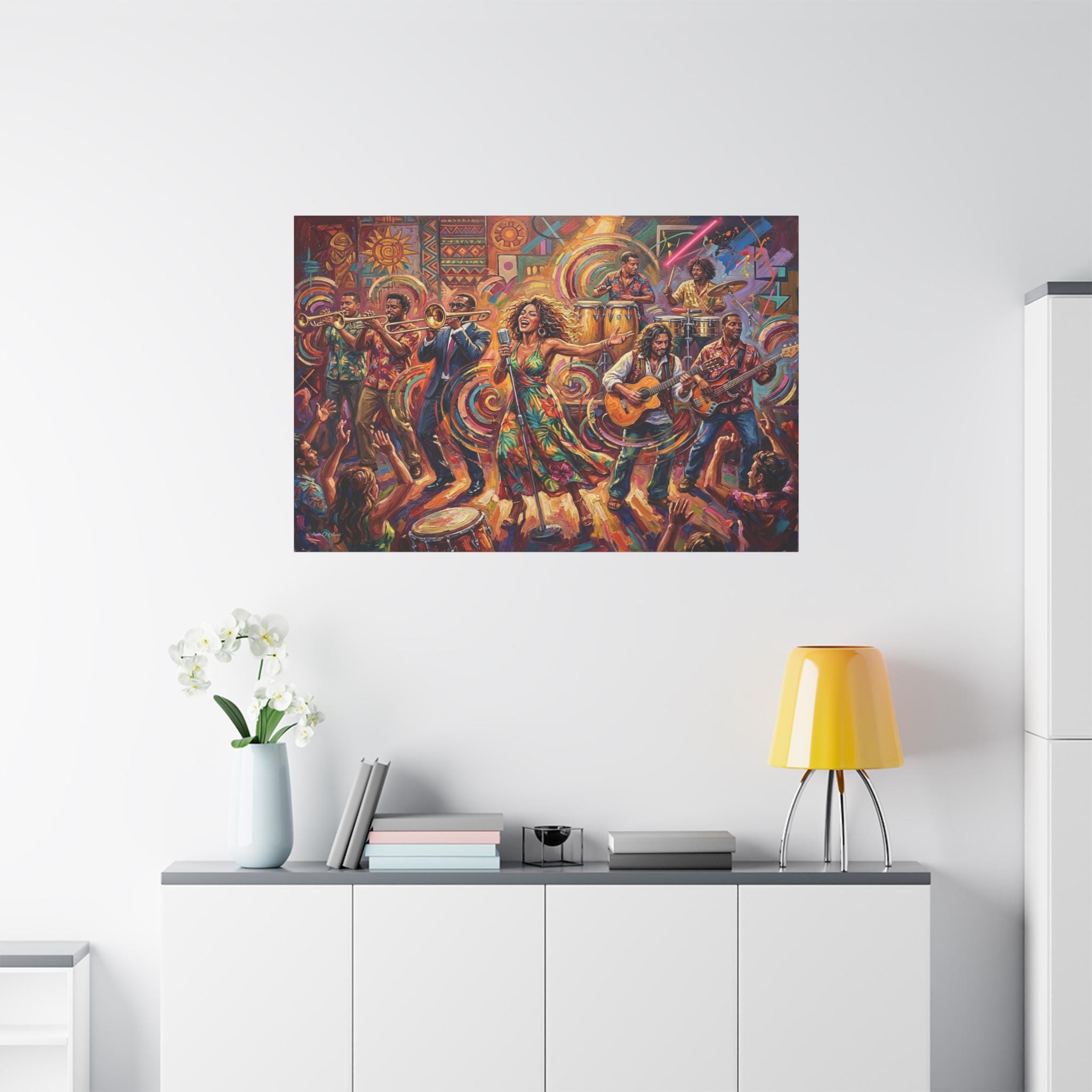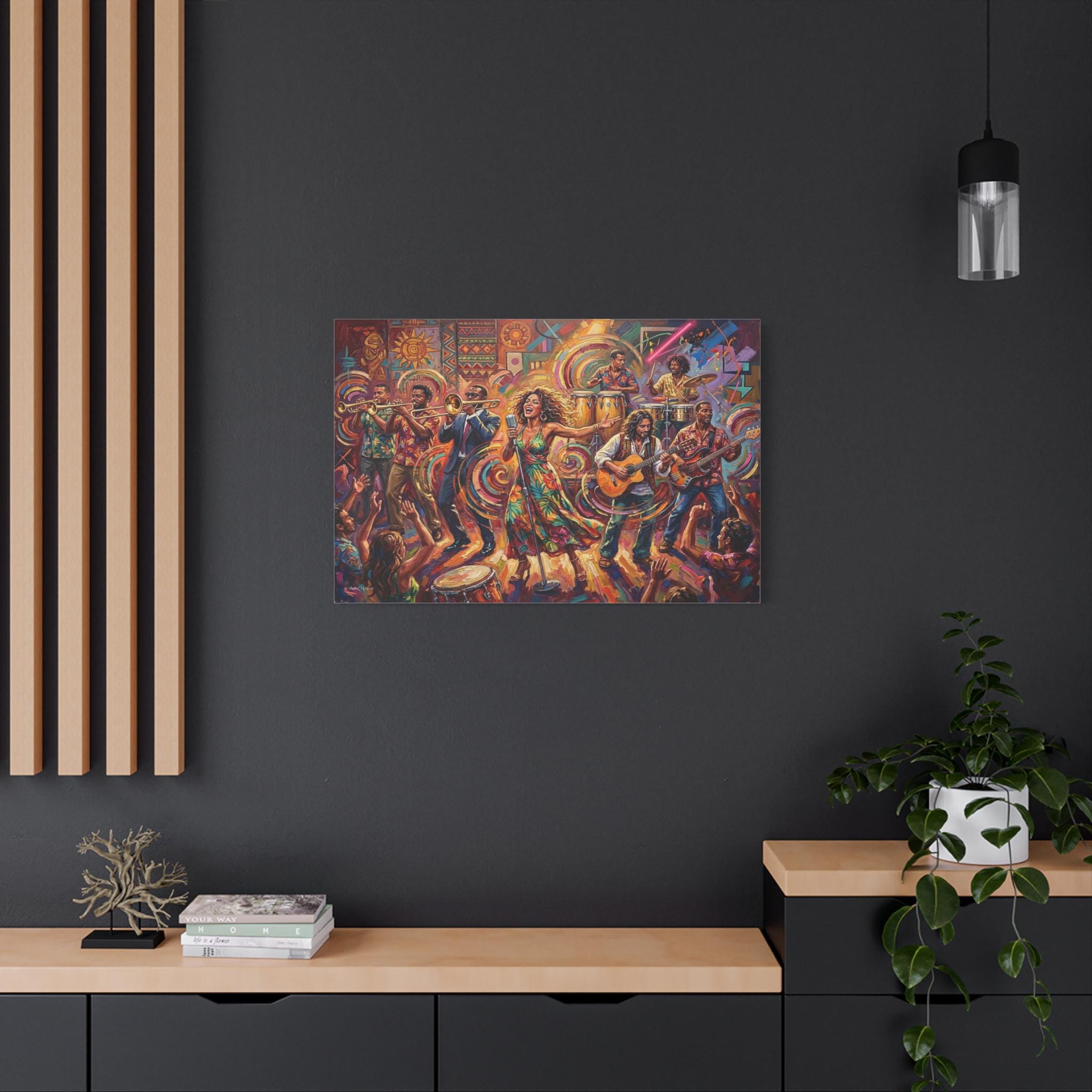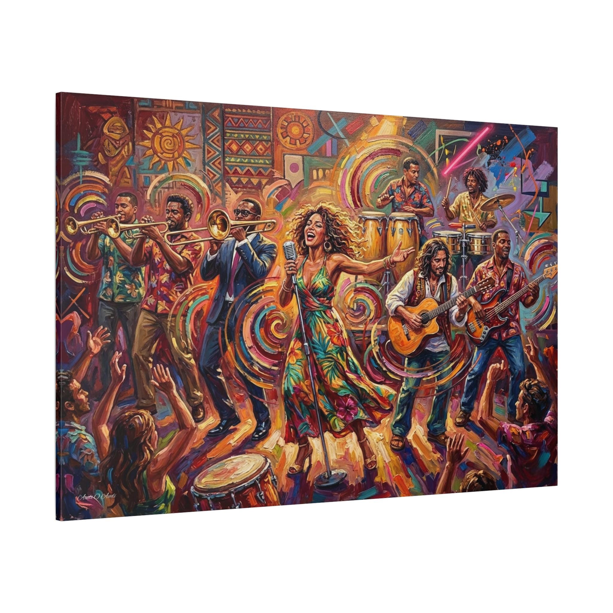 Bring the infectious rhythm and color of the Caribbean into your home with this spectacular canvas print of a tropical Latin band. This high-energy artwork features a full ensemble in mid-performance, led by a passionate female vocalist in a floral dress, backed by trumpet players, guitarists, and percussionists.