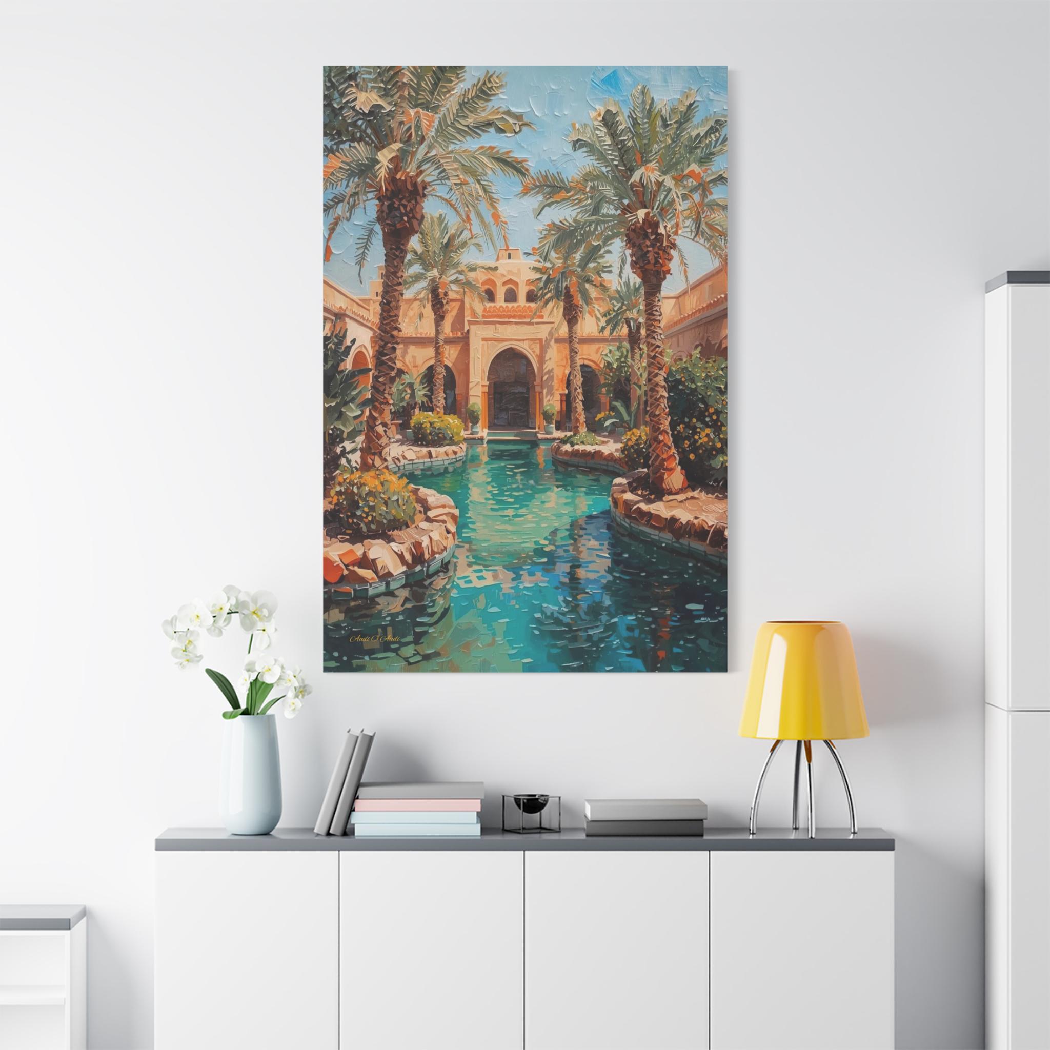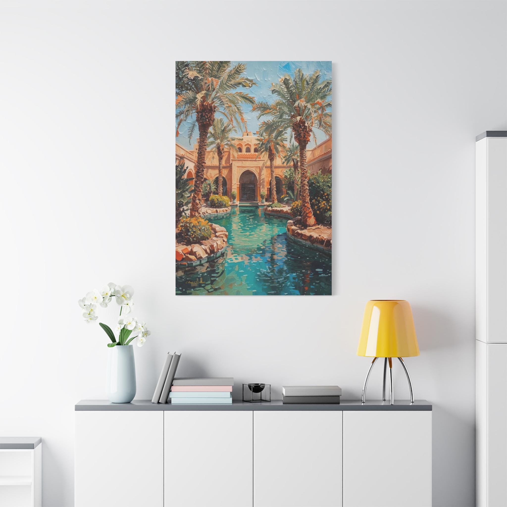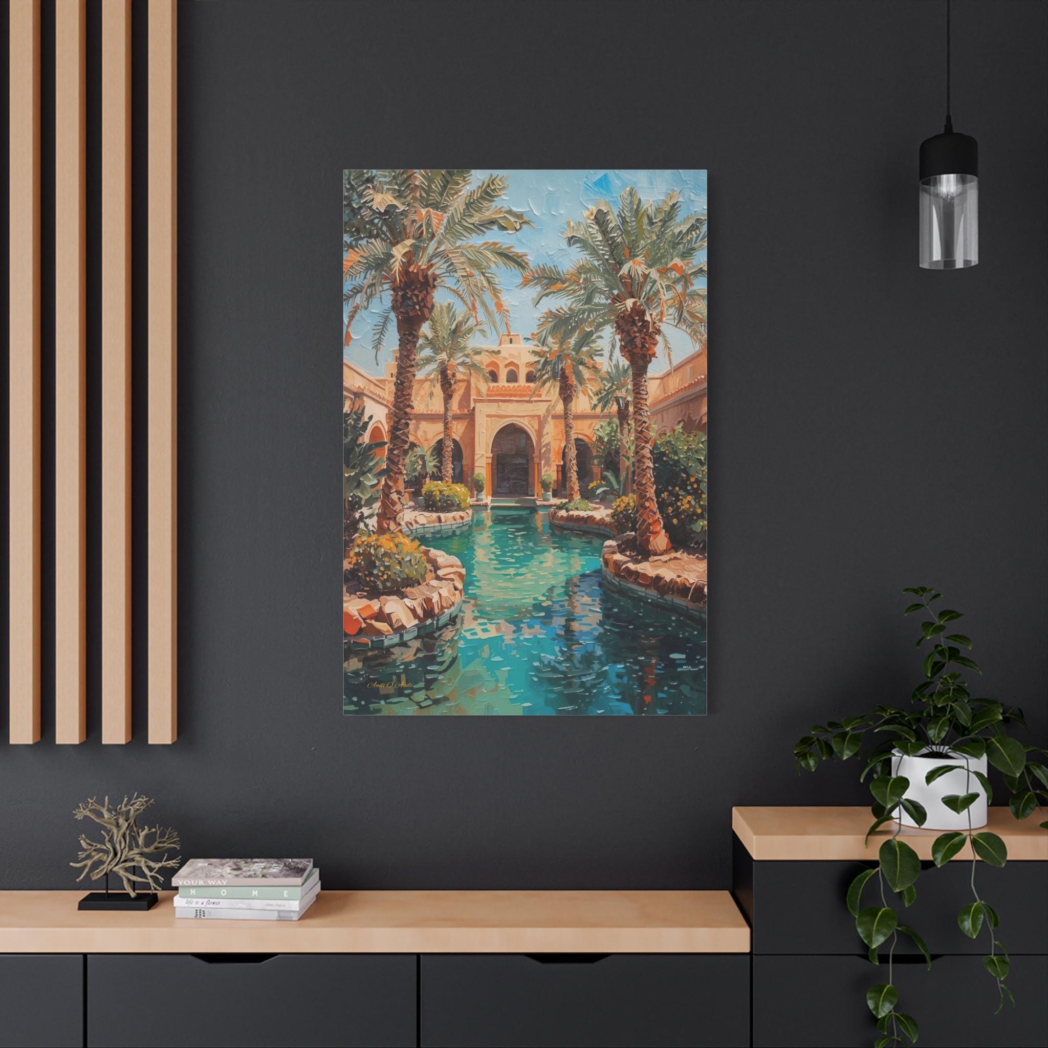 Escape to a private paradise with this breathtaking canvas print of a Moroccan courtyard. This sun-drenched artwork captures the serenity of a luxurious Riad, featuring a crystal-clear turquoise pool surrounded by towering palm trees, lush greenery, and stunning traditional terracotta architecture.