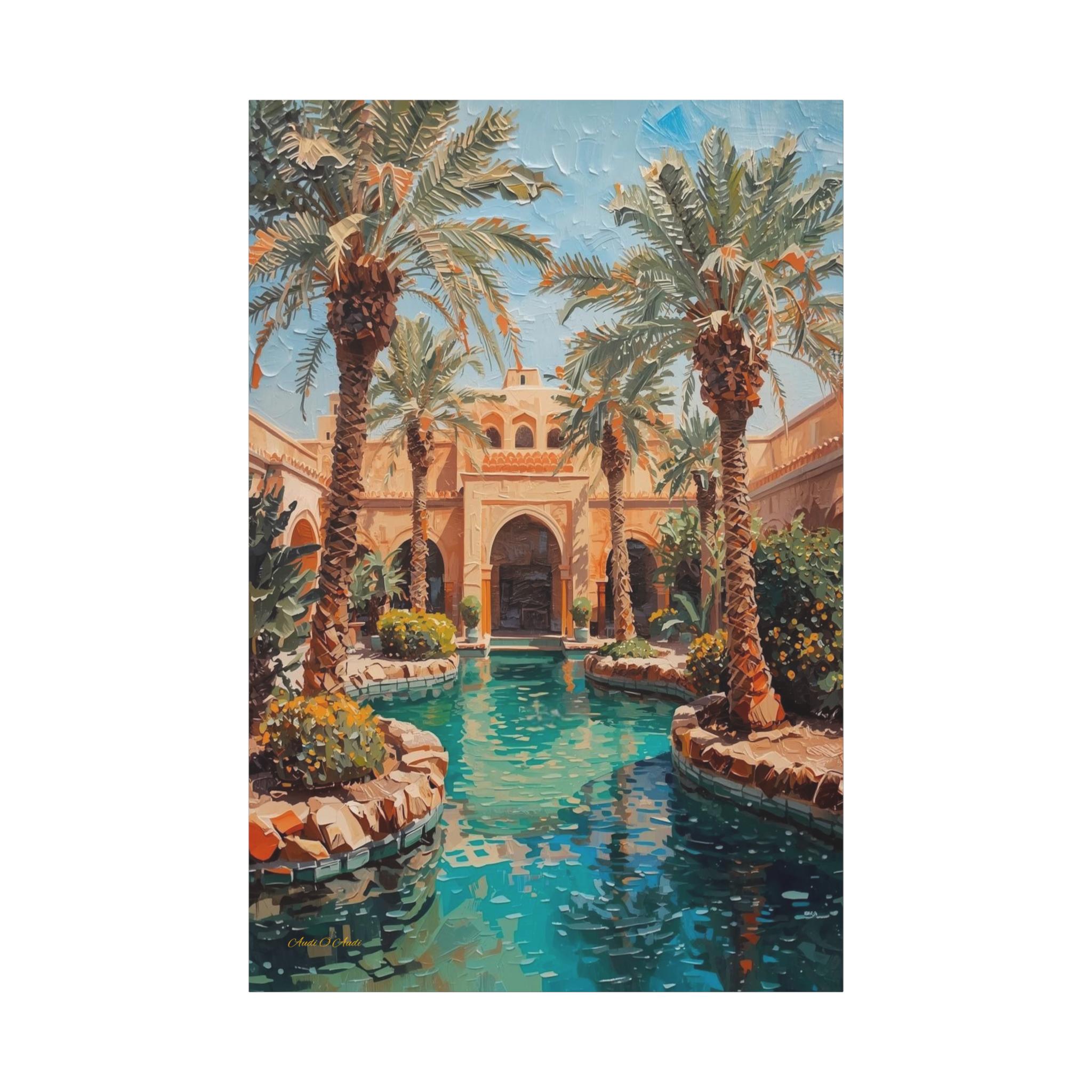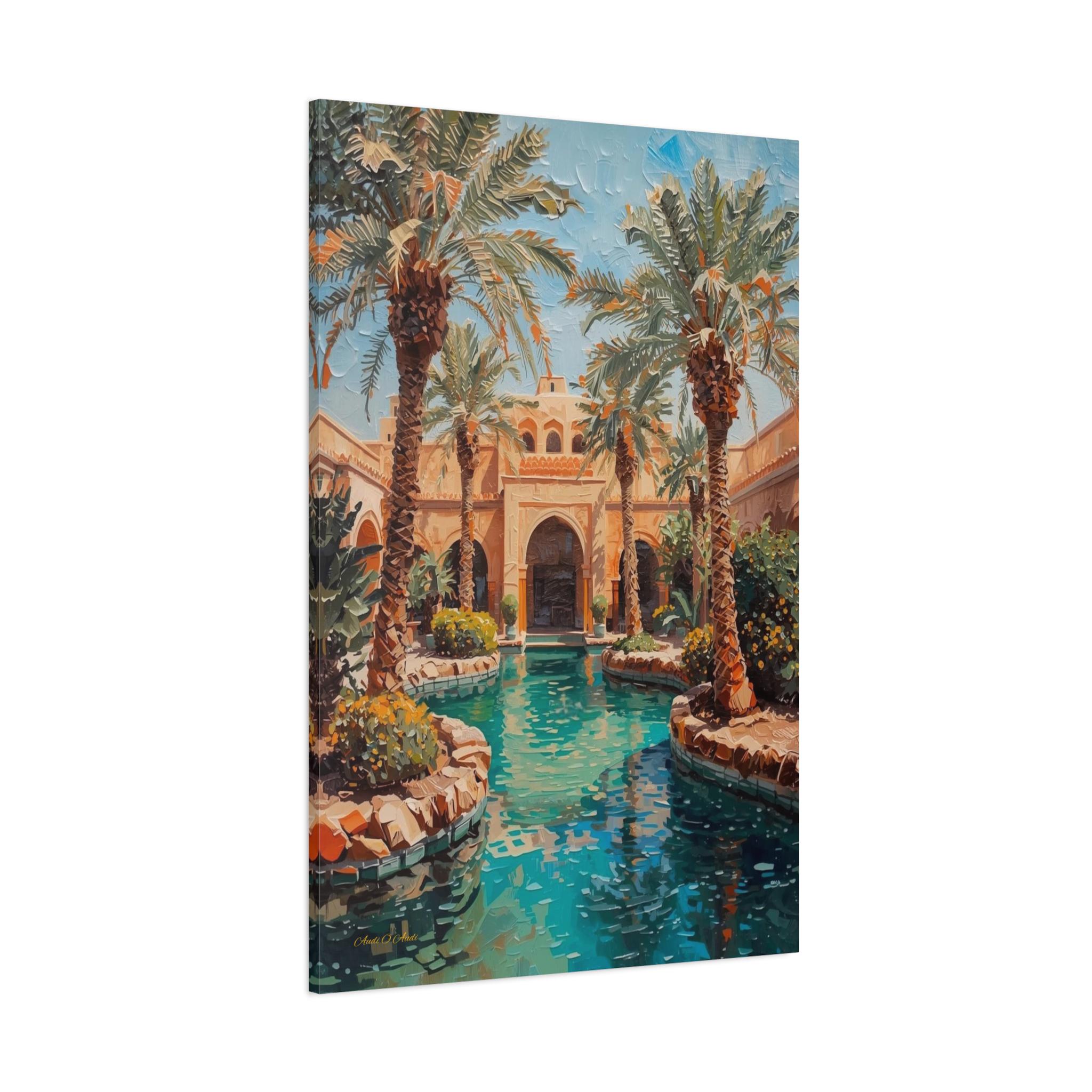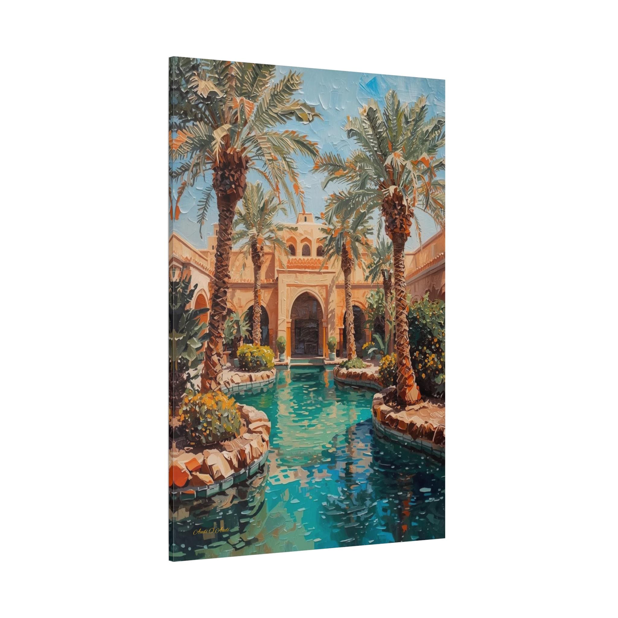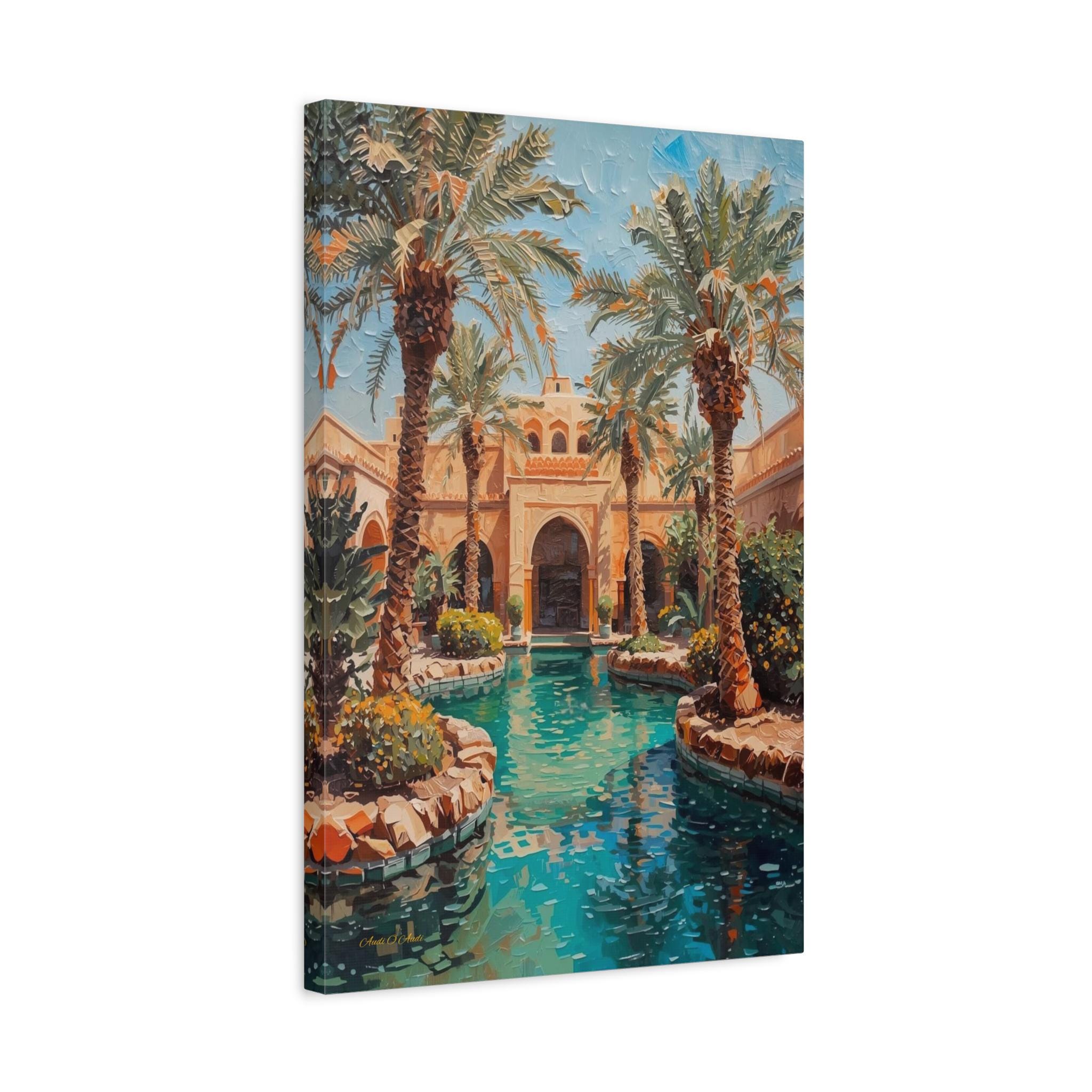 Escape to a private paradise with this breathtaking canvas print of a Moroccan courtyard. This sun-drenched artwork captures the serenity of a luxurious Riad, featuring a crystal-clear turquoise pool surrounded by towering palm trees, lush greenery, and stunning traditional terracotta architecture.