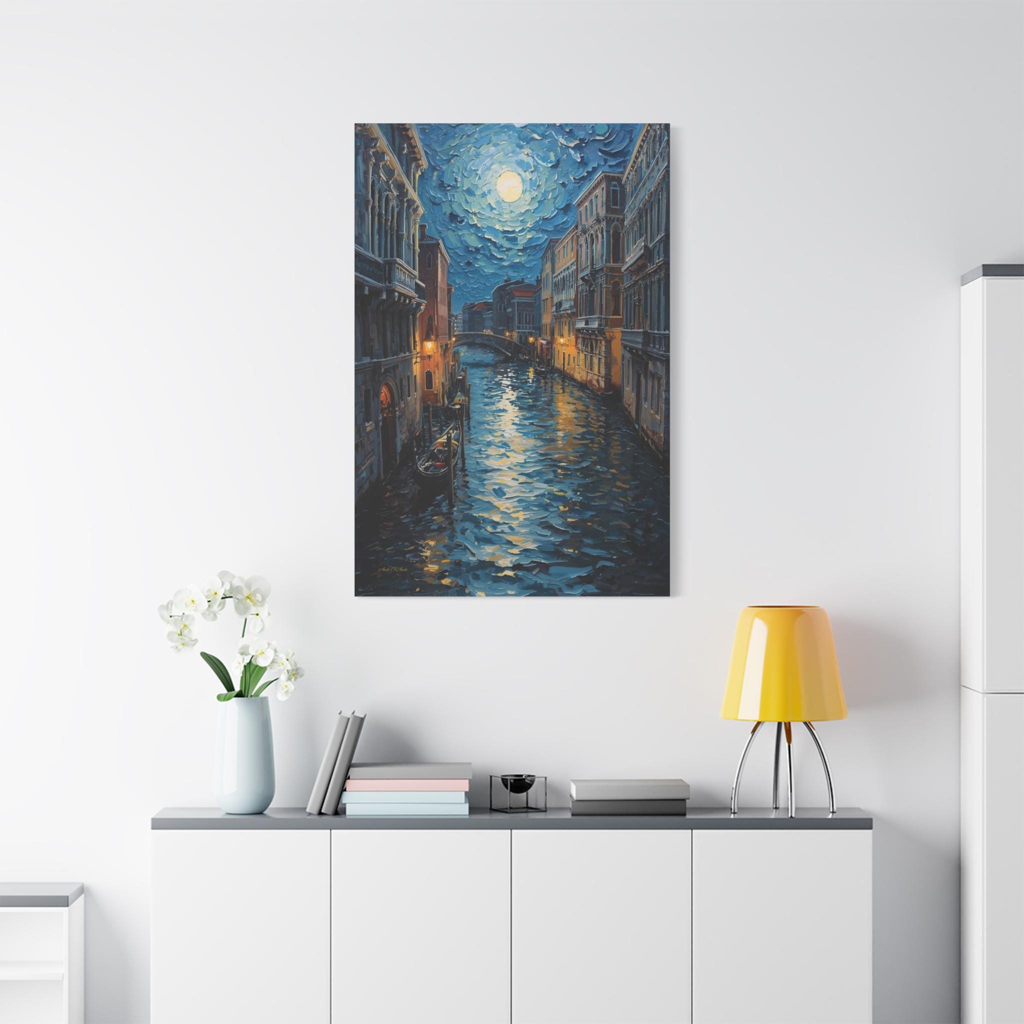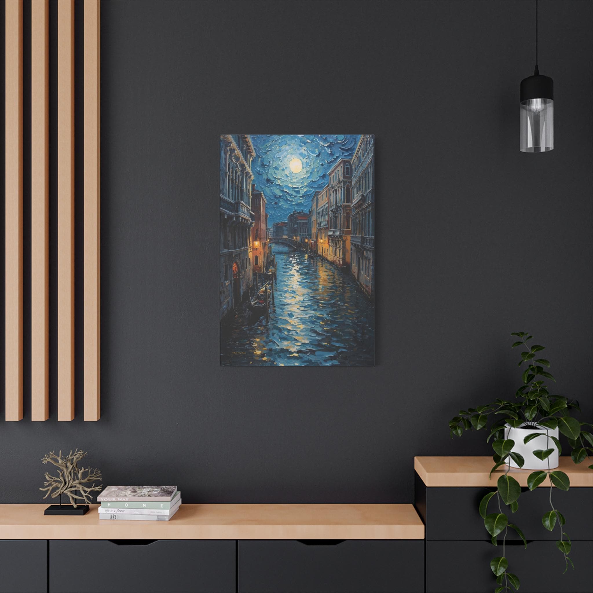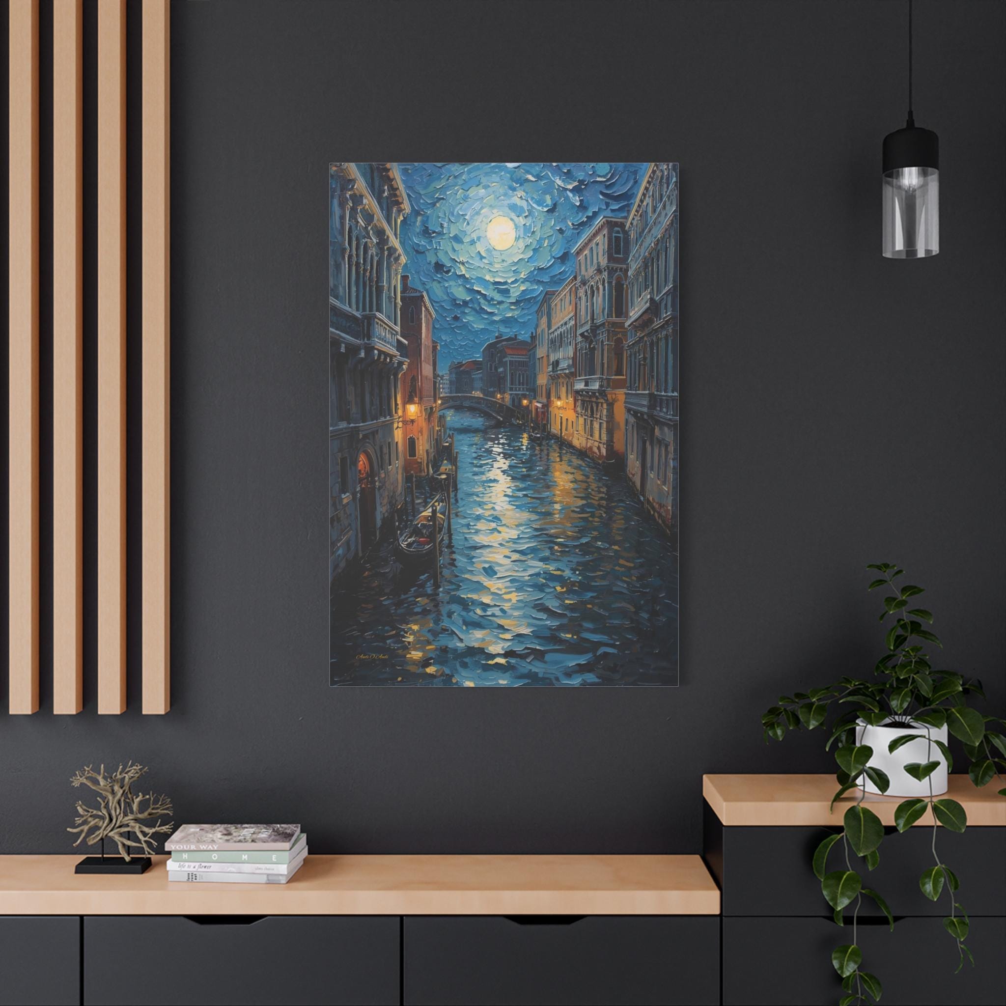 Transport your home to the romantic waterways of Italy with this enchanting canvas print of a Venetian canal at night. This mesmerizing artwork features a serene canal lined with historic buildings and docked gondolas, all illuminated by the warm glow of streetlamps and a magnificent, swirling full moon.