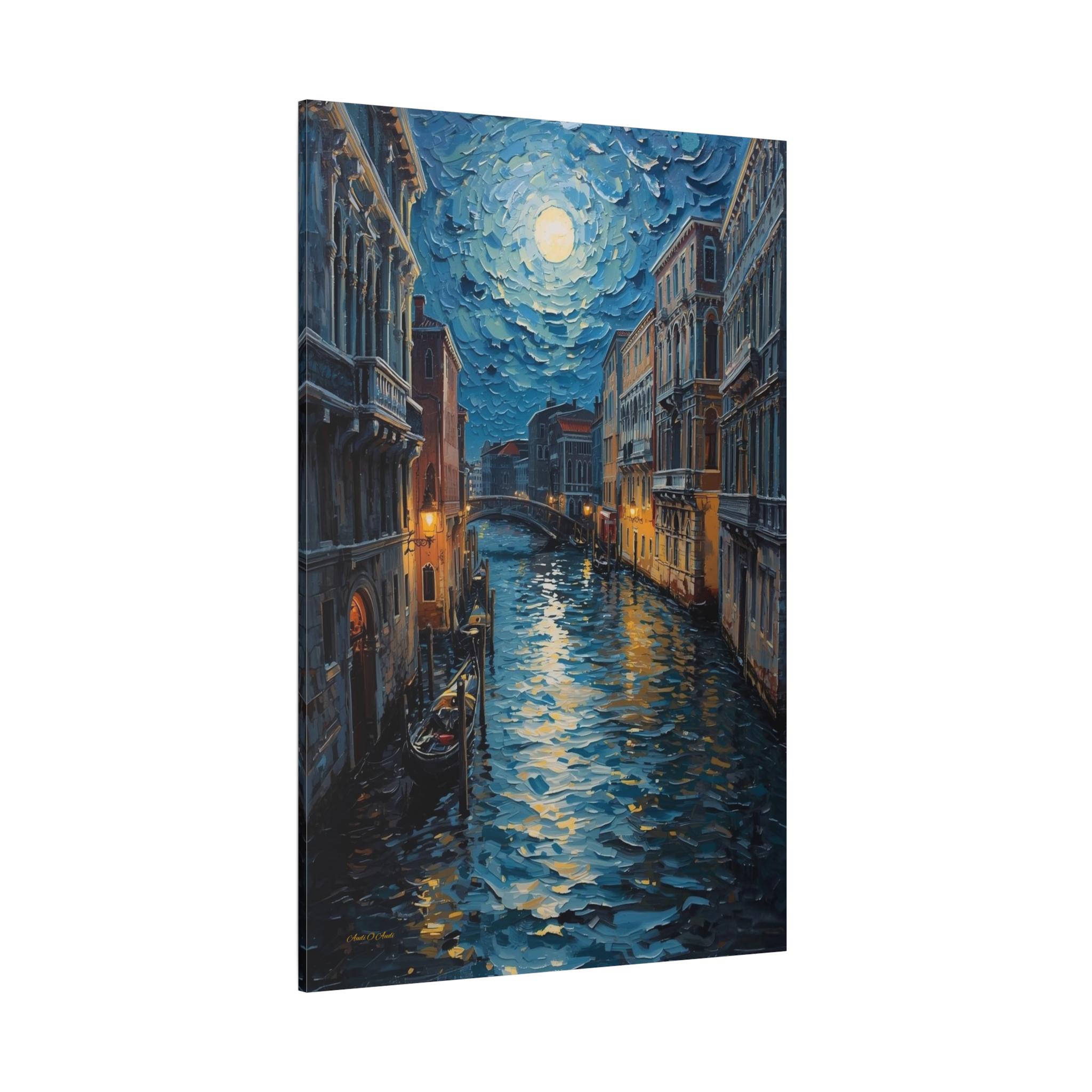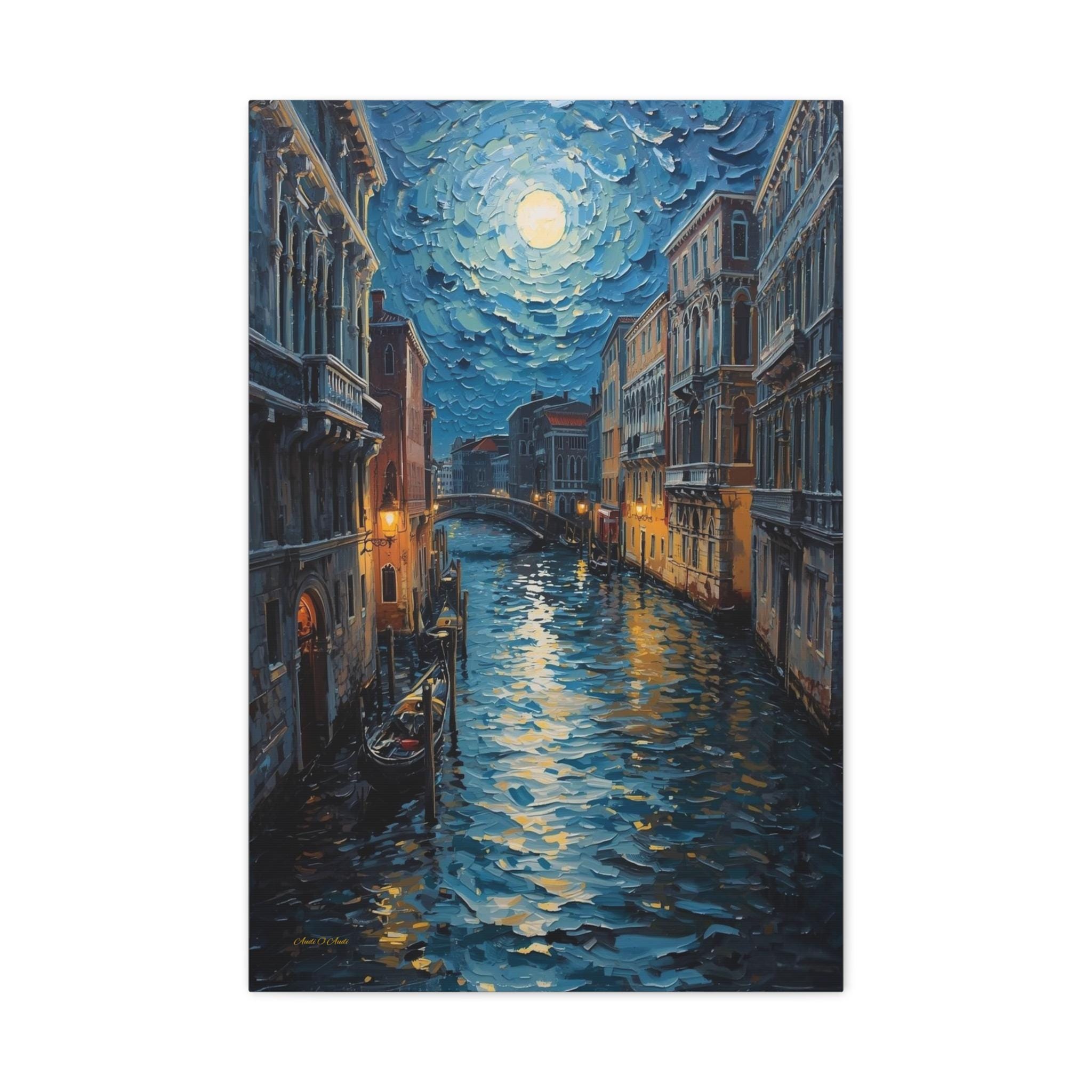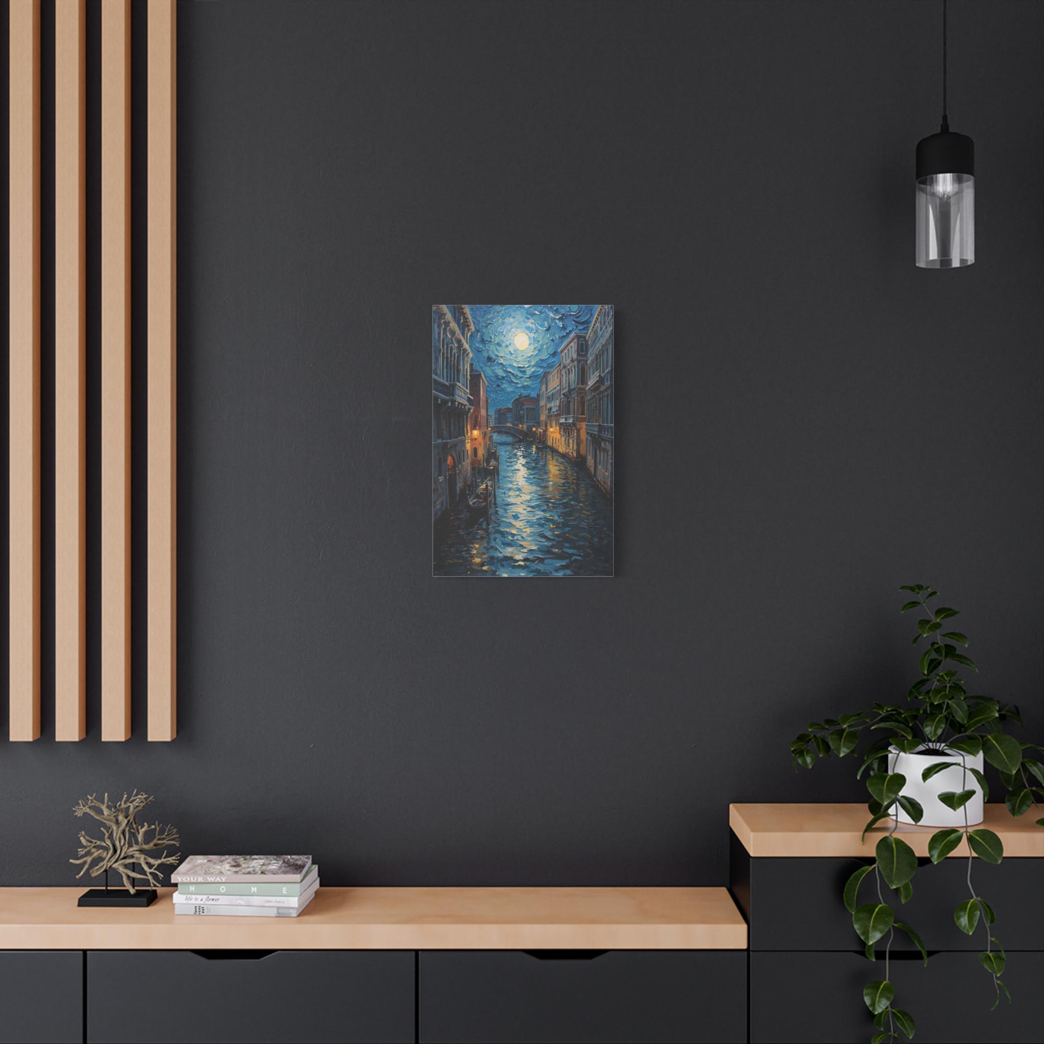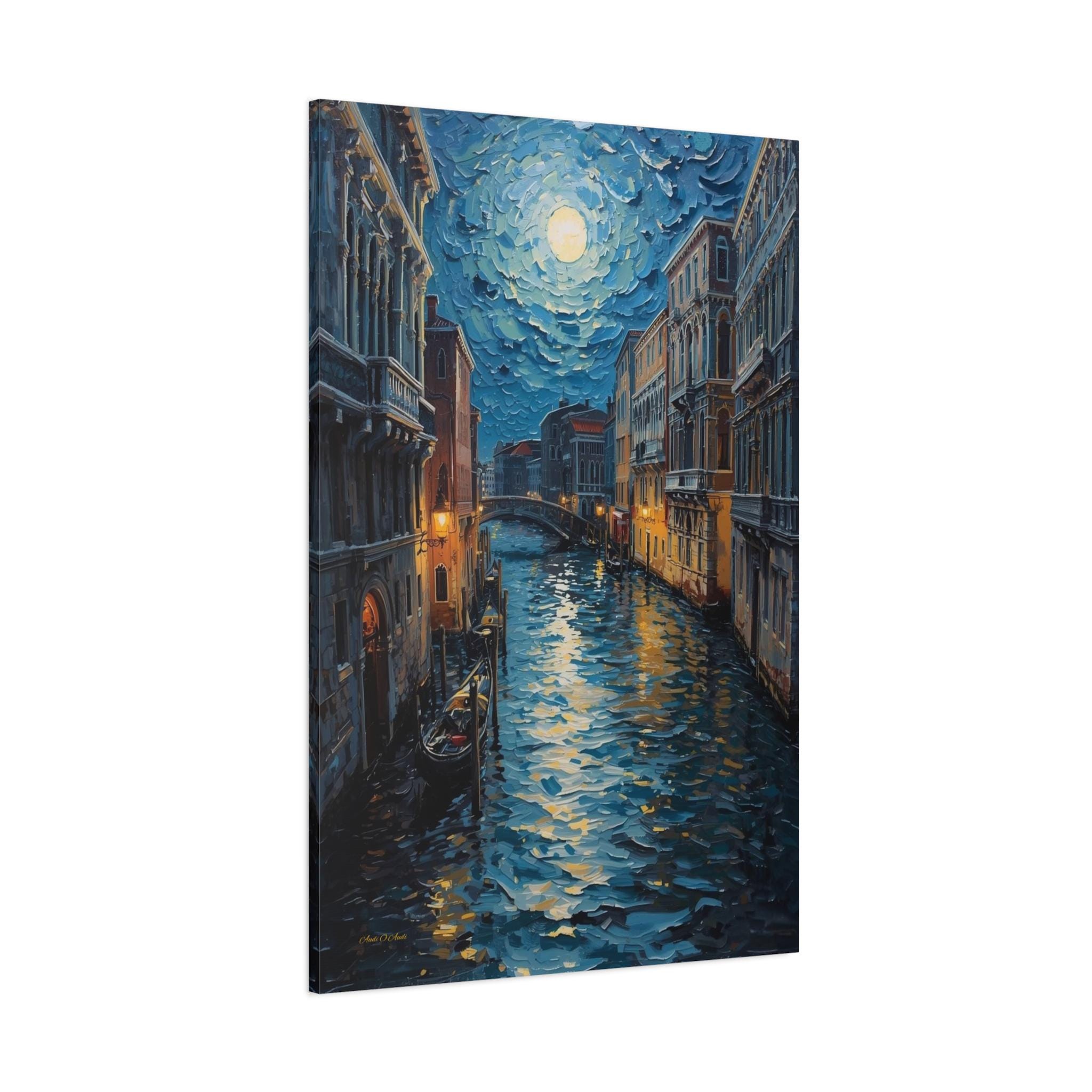 Transport your home to the romantic waterways of Italy with this enchanting canvas print of a Venetian canal at night. This mesmerizing artwork features a serene canal lined with historic buildings and docked gondolas, all illuminated by the warm glow of streetlamps and a magnificent, swirling full moon.
