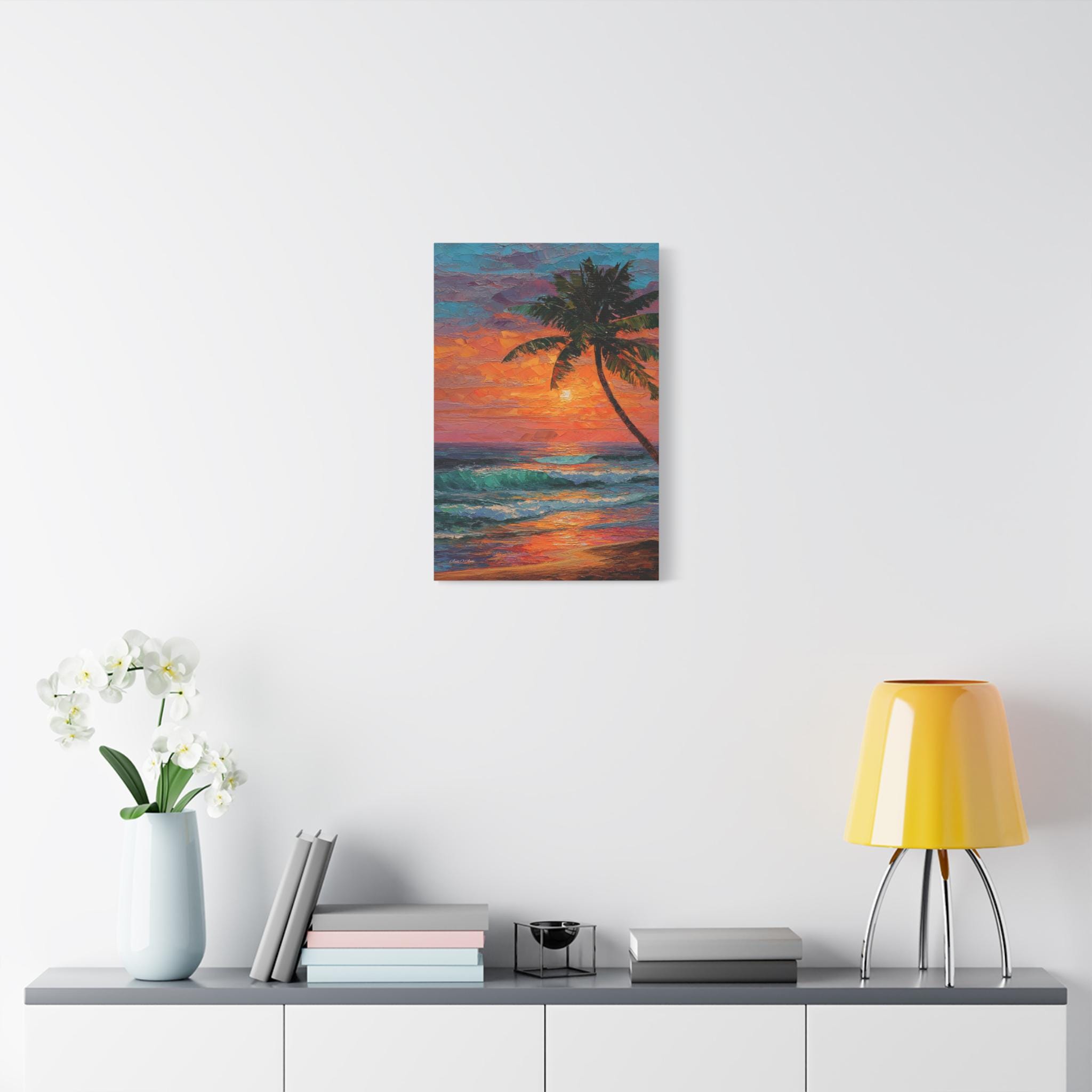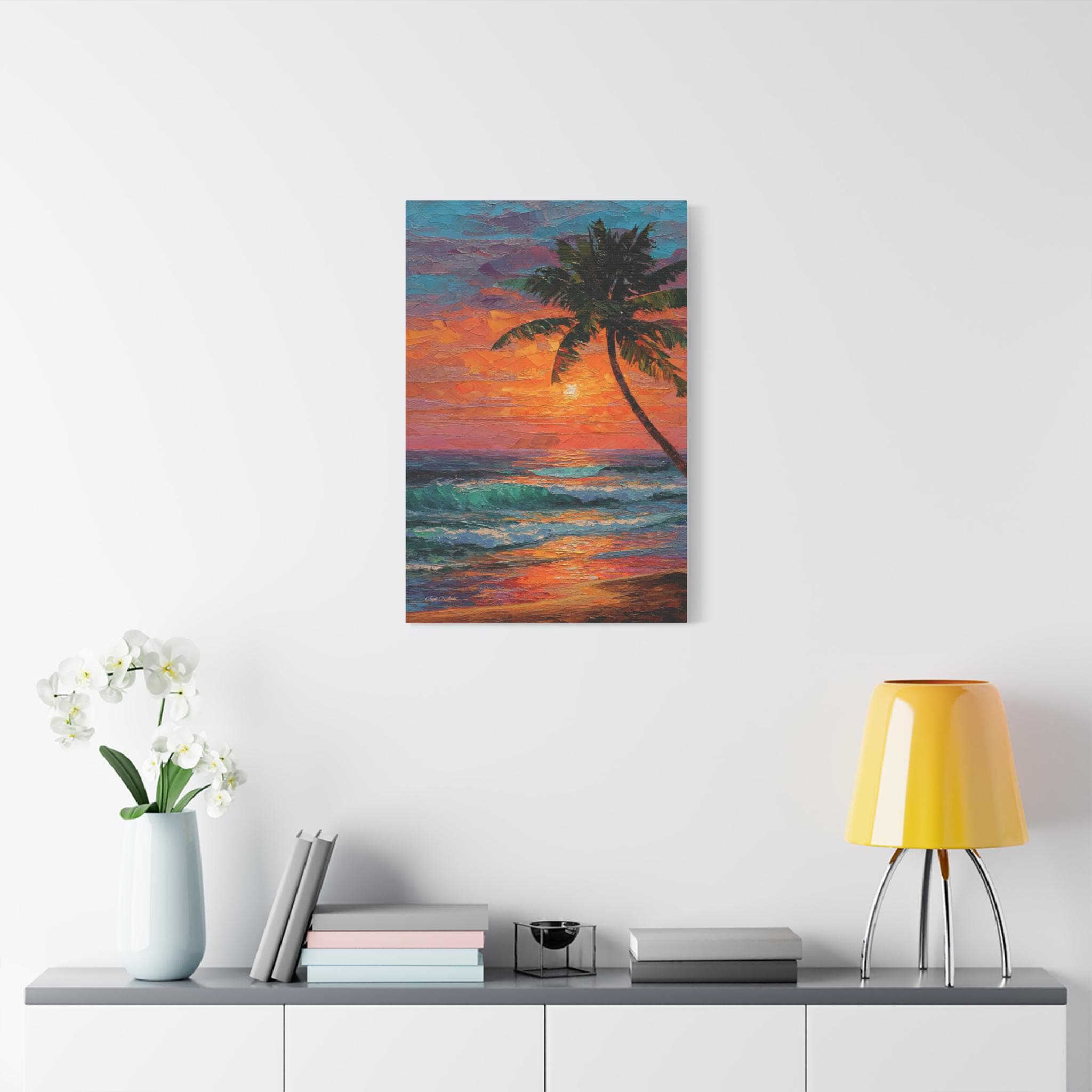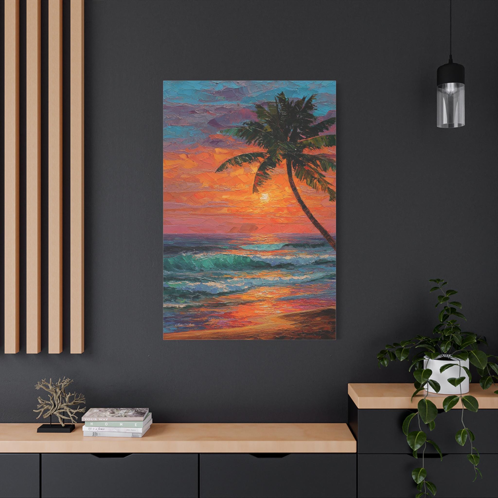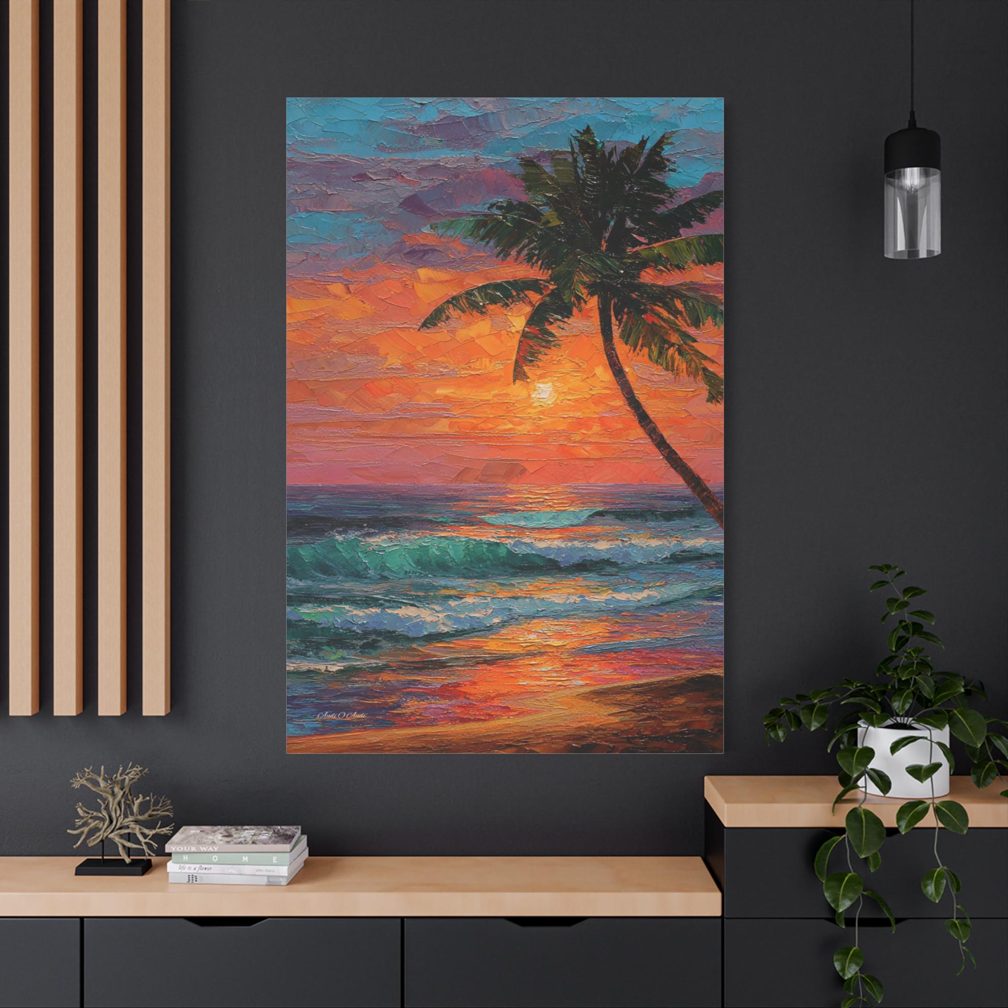 Create a window to paradise in any room with this stunning vertical canvas print of a tropical sunset. This vibrant artwork features a solitary, majestic palm tree leaning over a tranquil beach, silhouetted against a breathtaking sky that fades from deep twilight purple to fiery sunset orange.