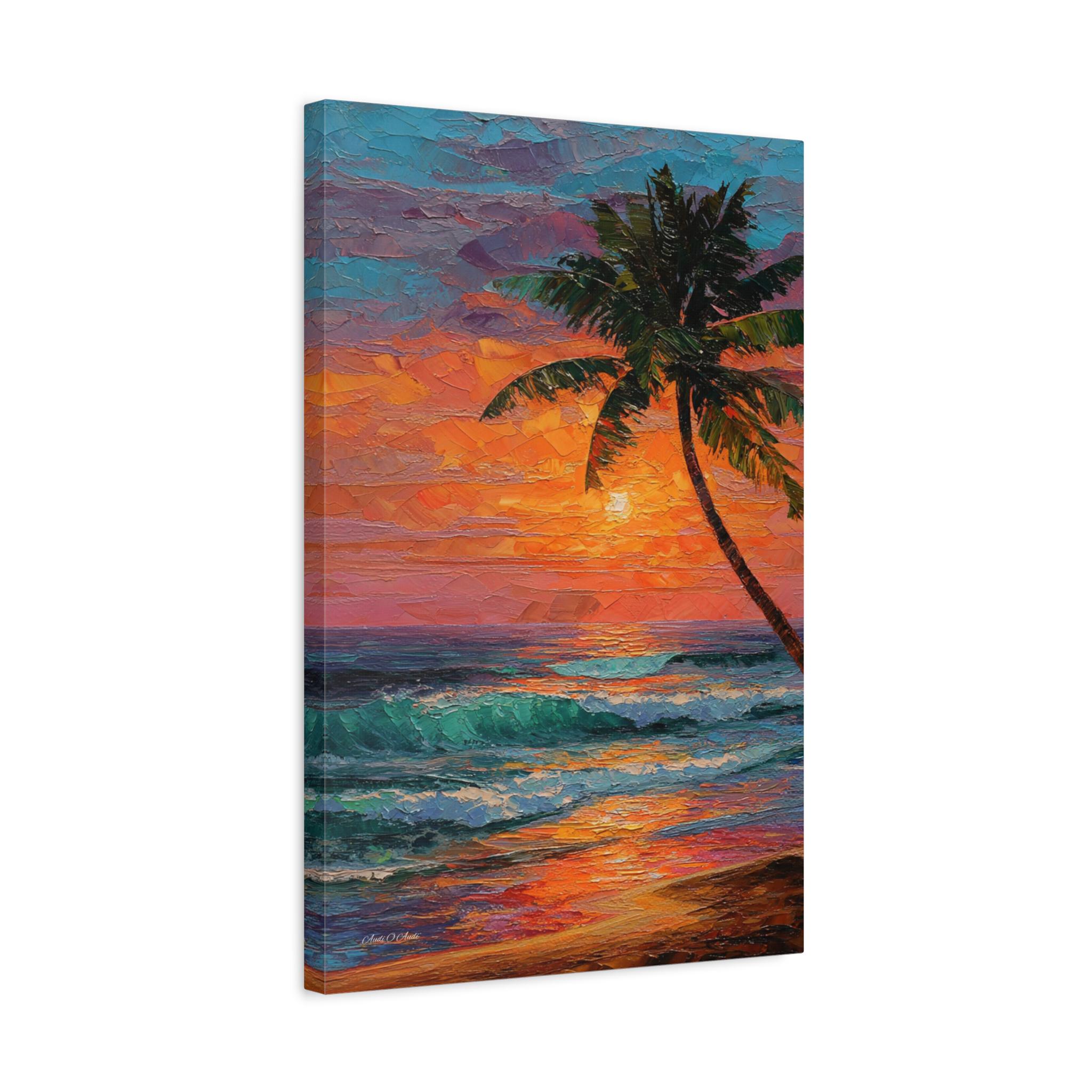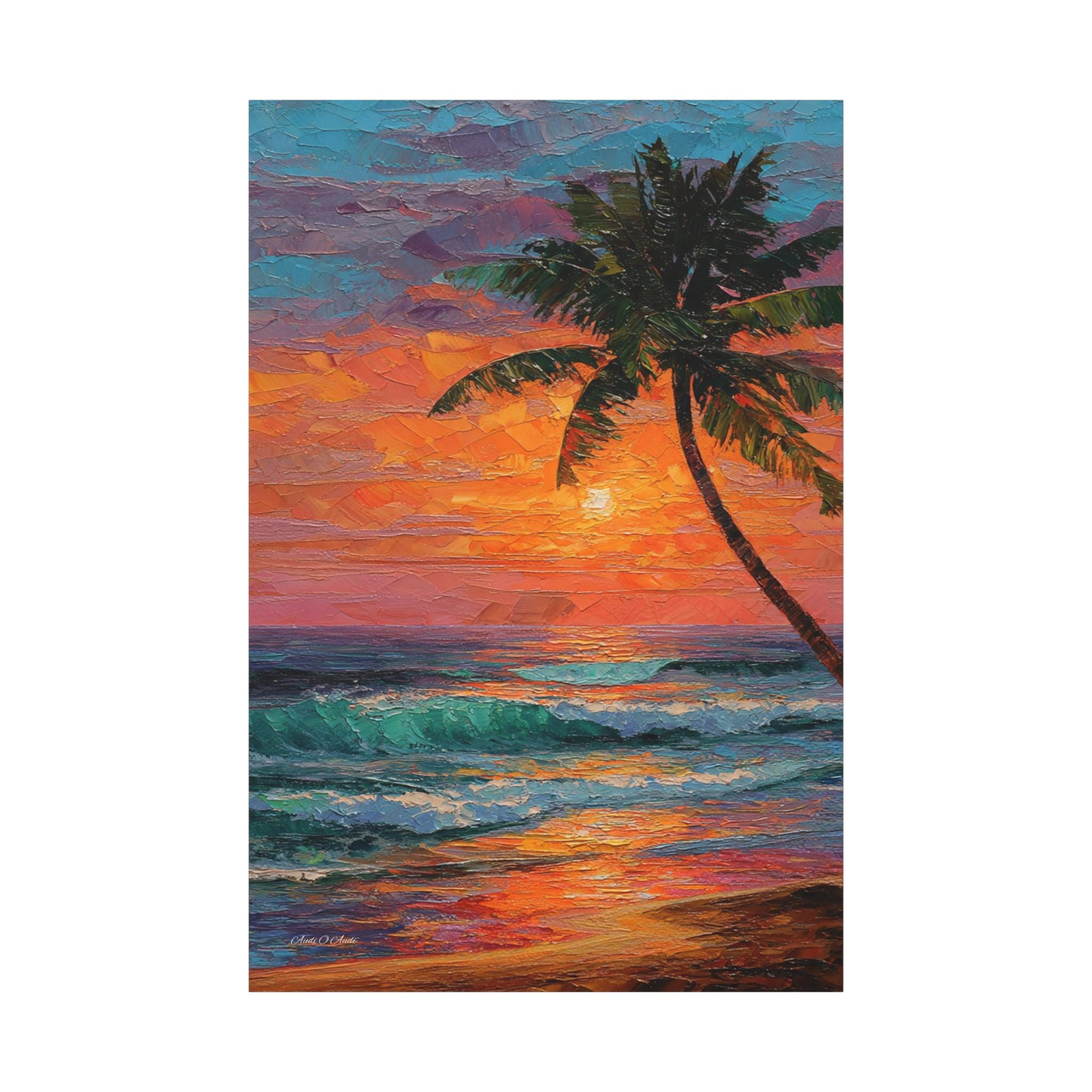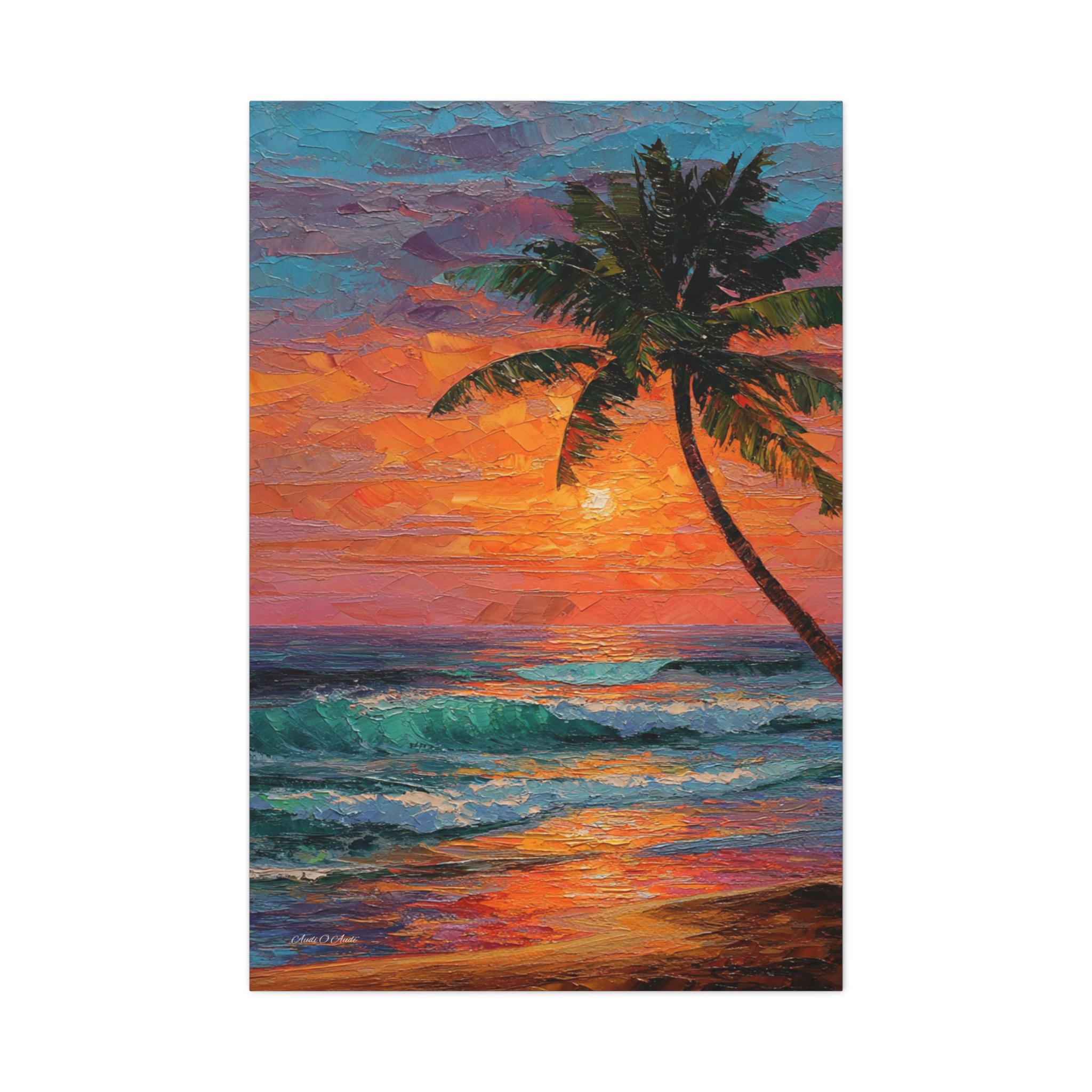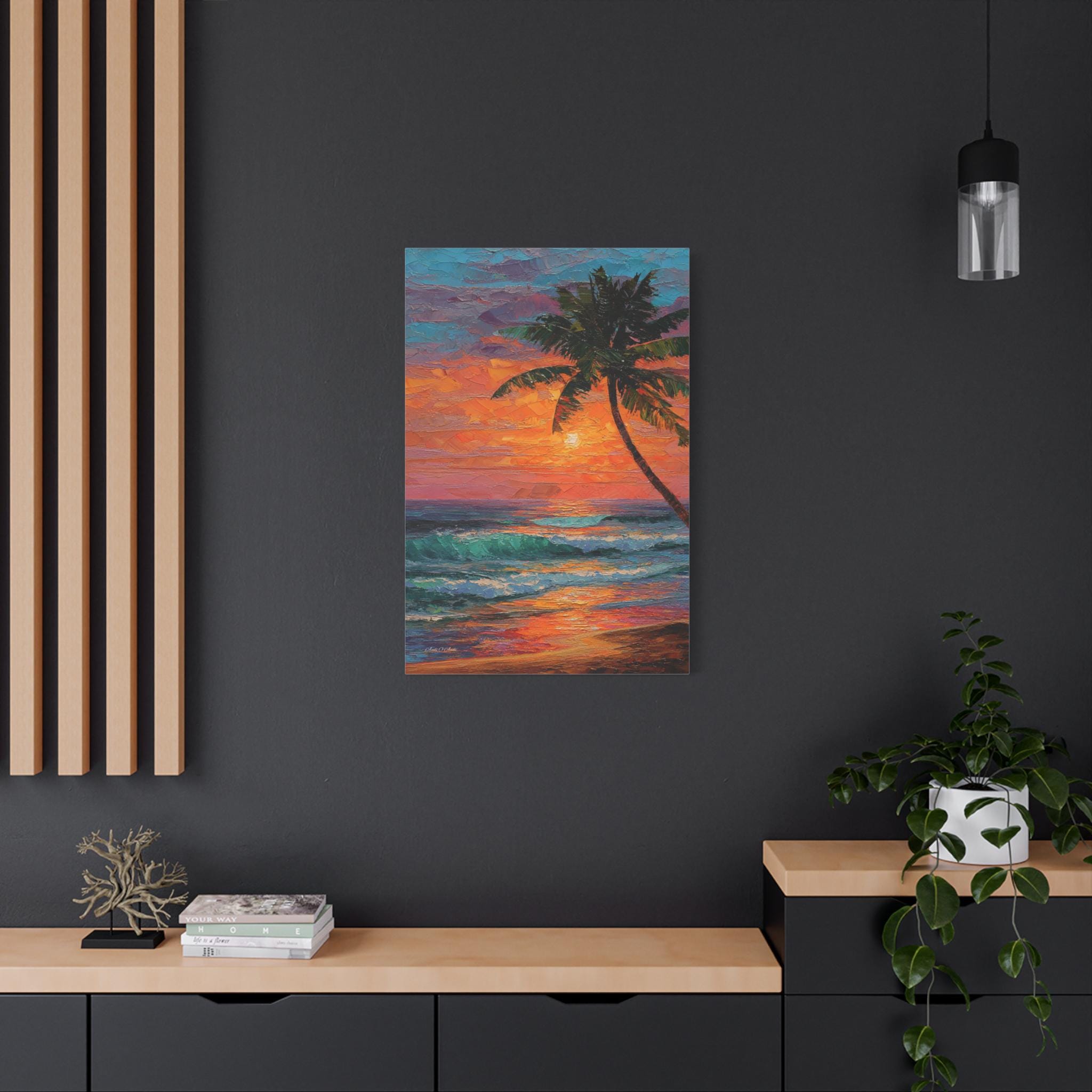 Create a window to paradise in any room with this stunning vertical canvas print of a tropical sunset. This vibrant artwork features a solitary, majestic palm tree leaning over a tranquil beach, silhouetted against a breathtaking sky that fades from deep twilight purple to fiery sunset orange.