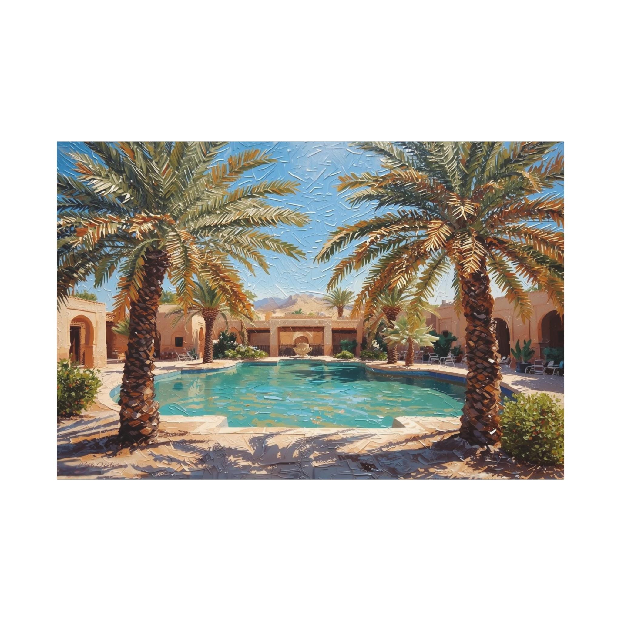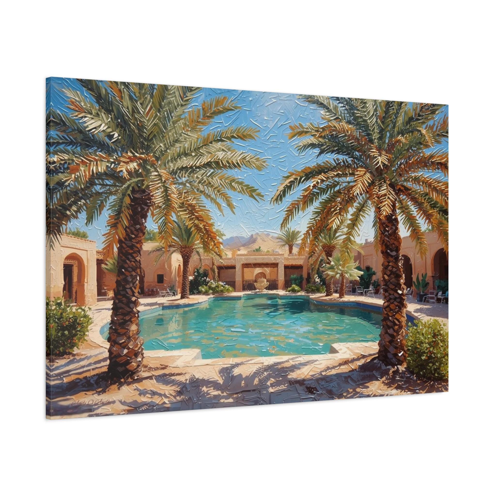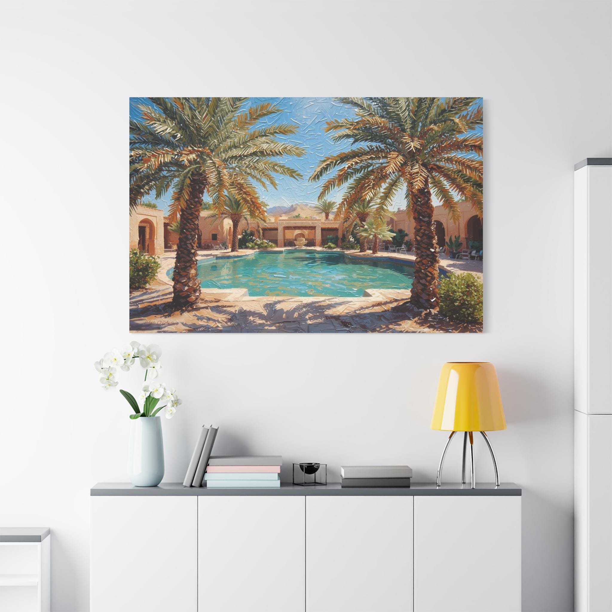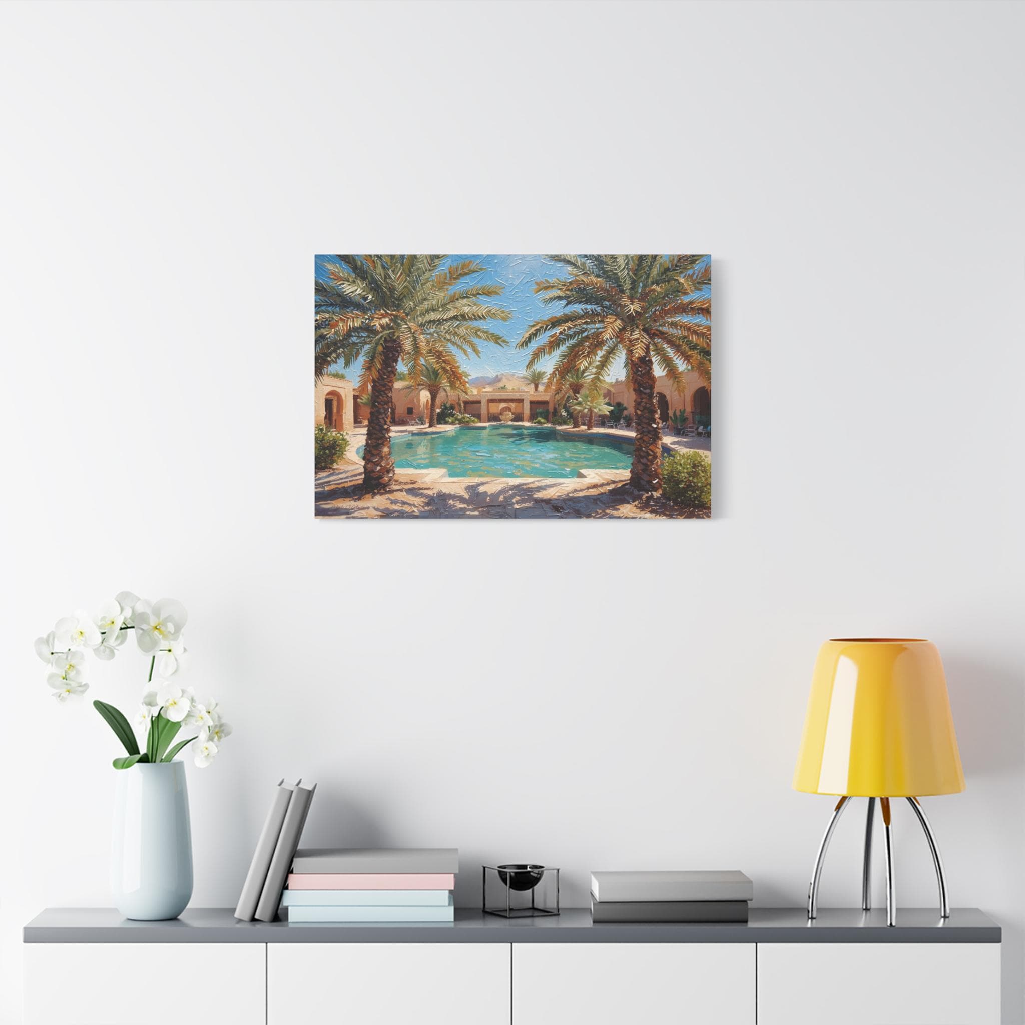 Transform your home into a five-star retreat with this stunning canvas print of a luxurious desert villa. This sun-drenched artwork features a crystal-clear swimming pool flanked by majestic palm trees, leading the eye to a traditional terracotta estate and rugged mountains in the distance.
