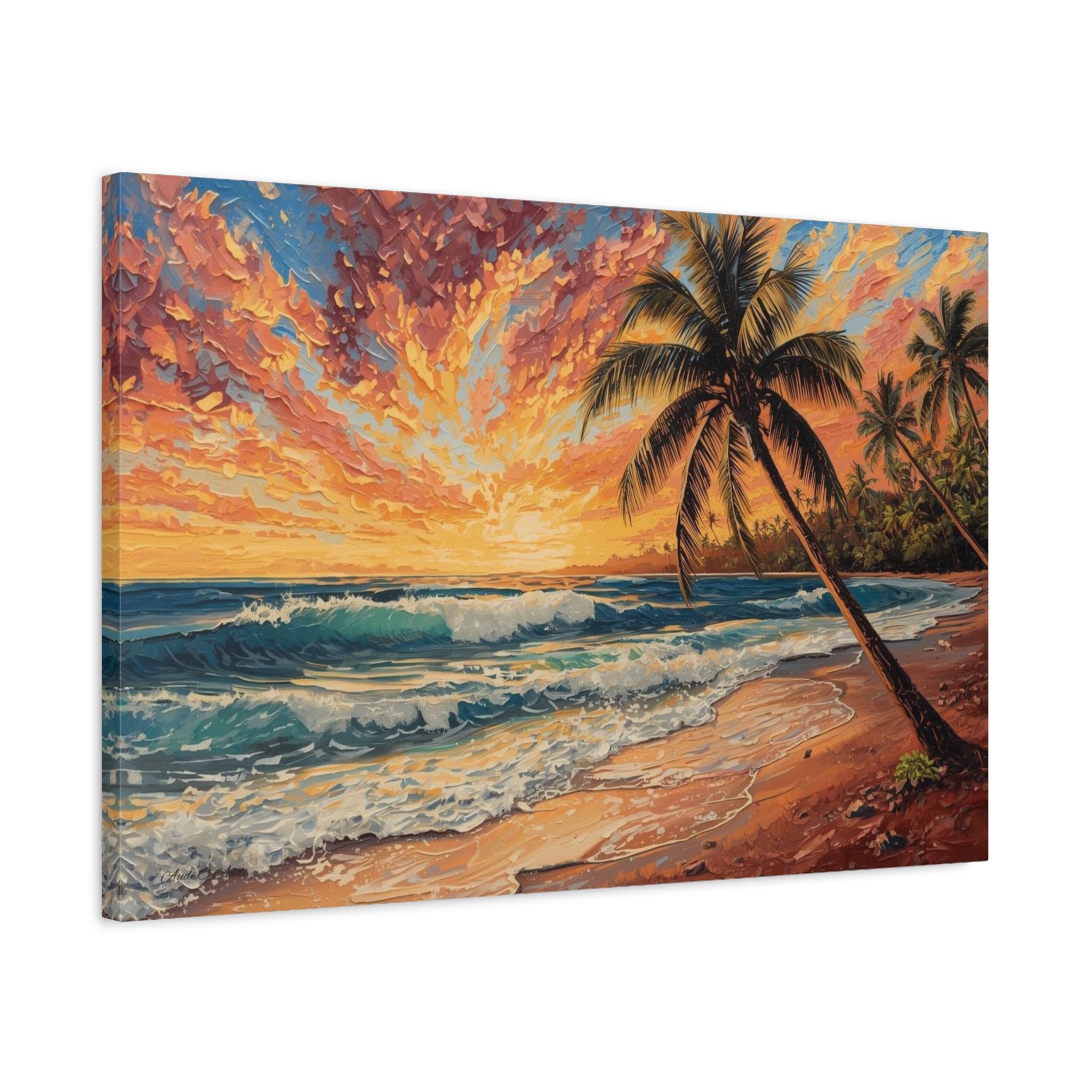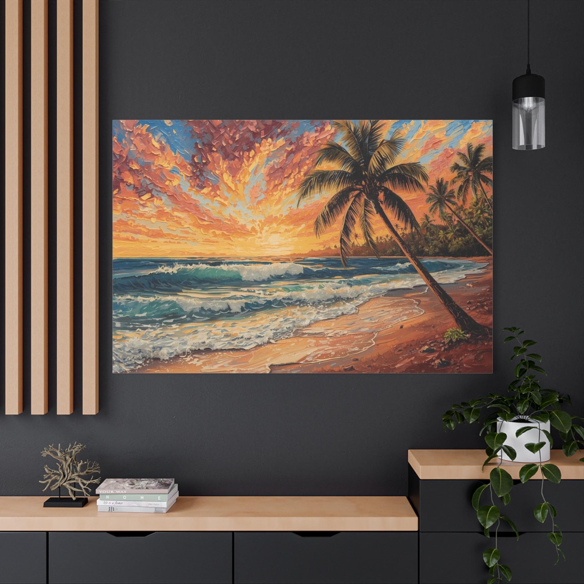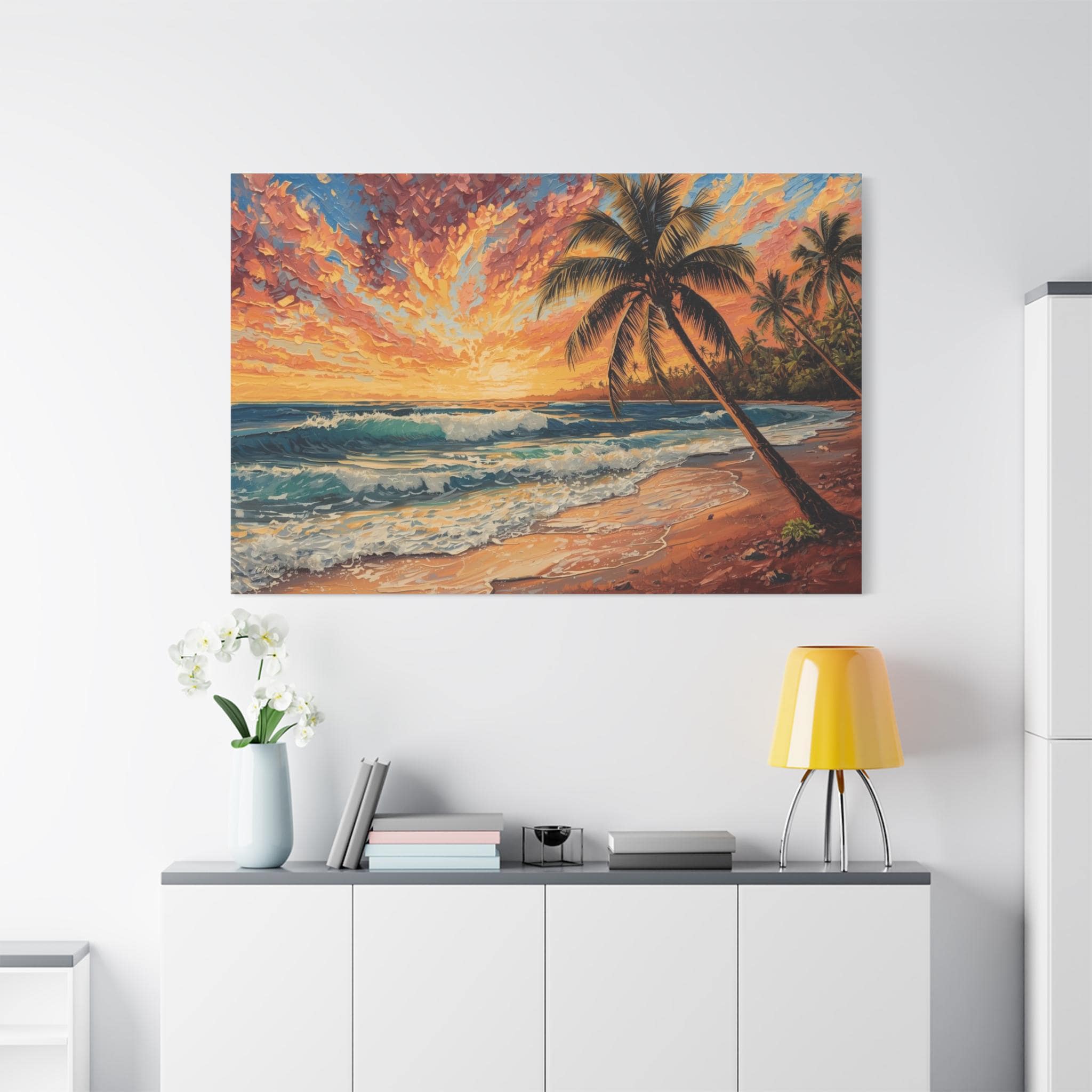 Drift away to paradise with this mesmerizing canvas print of a tropical beach at twilight. This vibrant artwork captures the magic hour where the sky is painted in breathtaking shades of fiery orange, golden yellow, and deep lavender, casting a warm glow over the turquoise ocean waves.