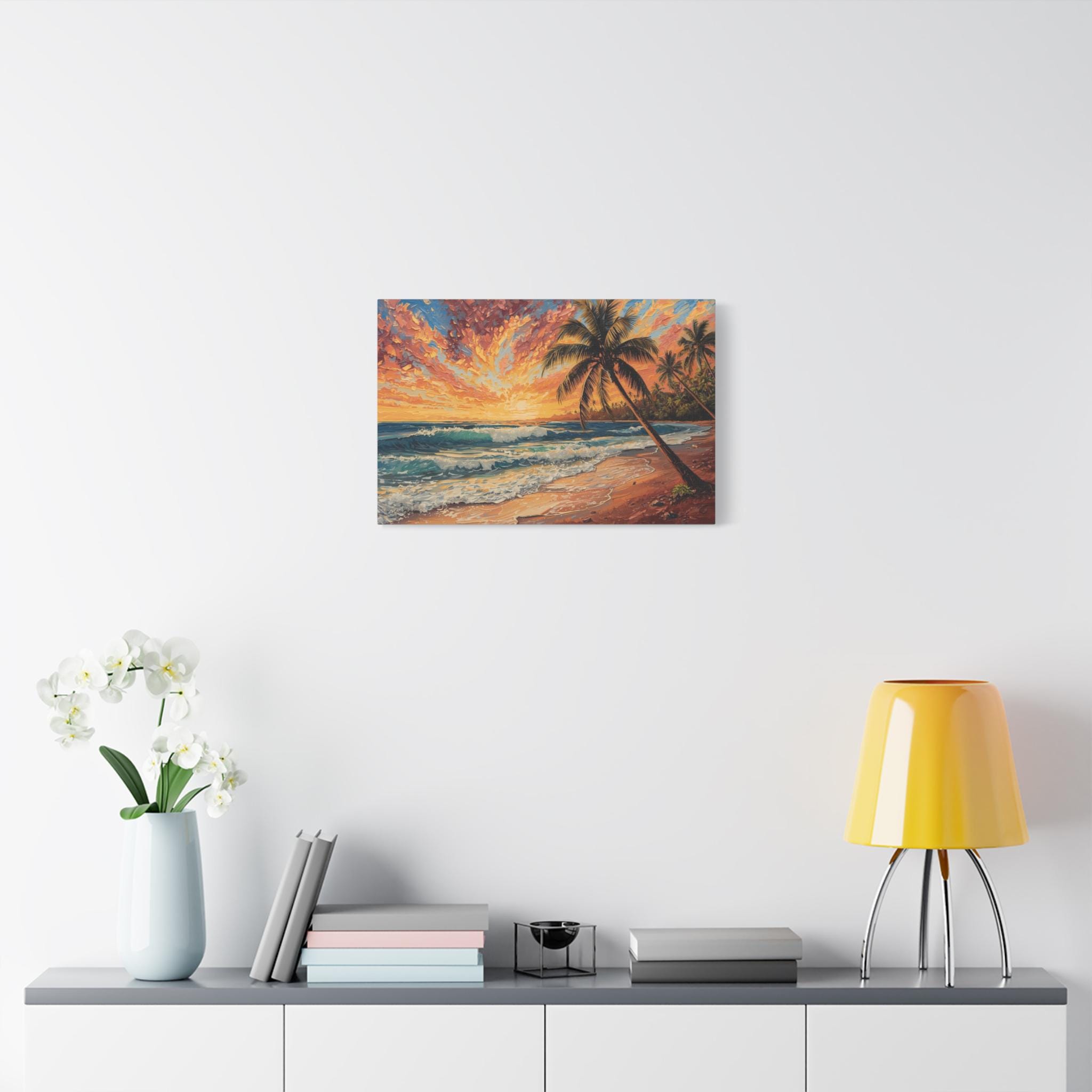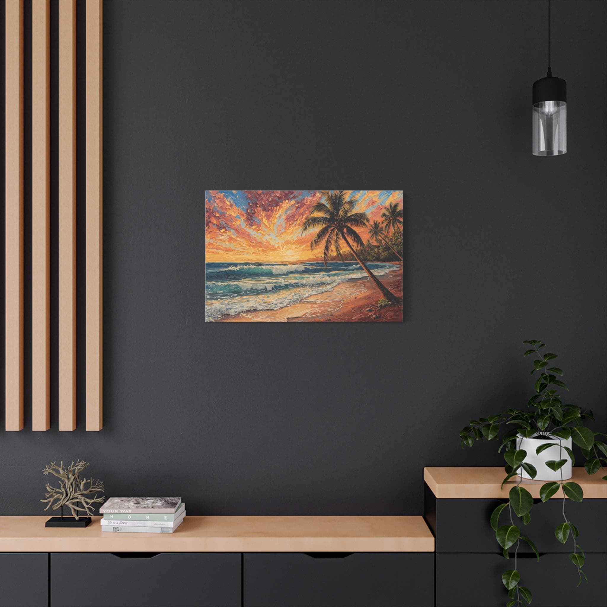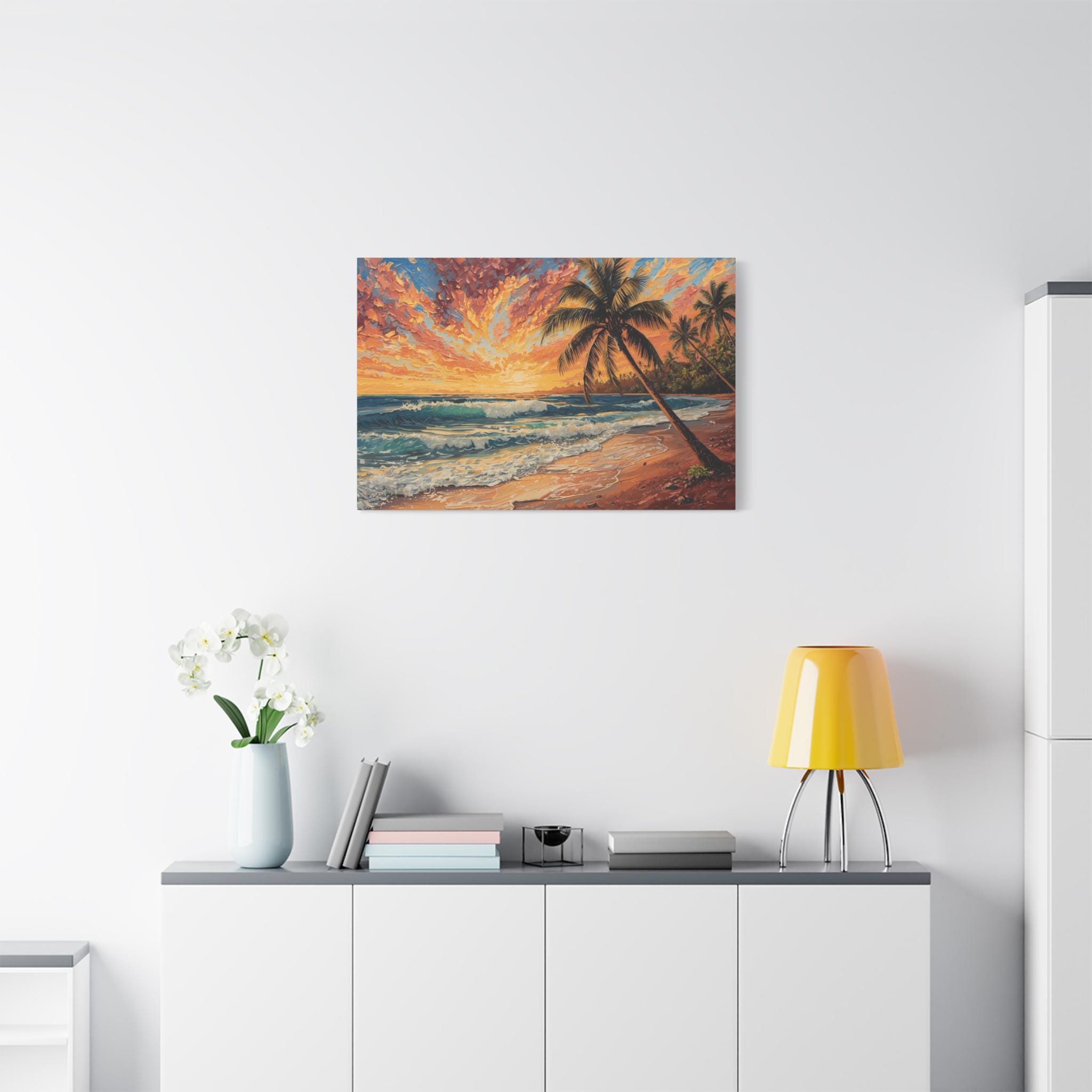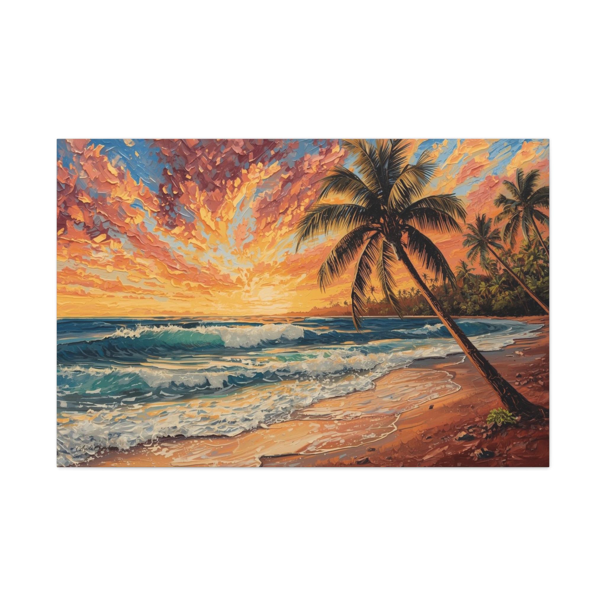 Drift away to paradise with this mesmerizing canvas print of a tropical beach at twilight. This vibrant artwork captures the magic hour where the sky is painted in breathtaking shades of fiery orange, golden yellow, and deep lavender, casting a warm glow over the turquoise ocean waves.